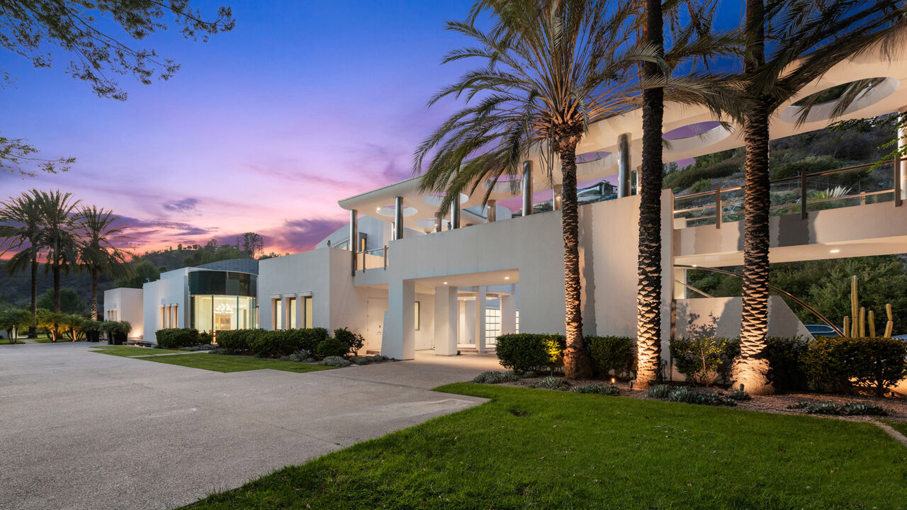 A brilliant, modern achievement situated behind the ultra exclusive gates of Beverly Park North. A flawless contemporary by Richard Landry commissioned by mathematician and entrepreneur Norman Zada, this 20,000 SF compound on an exceptional 6.78-acre lot features a secure compound with an approximately 6,100 SF multi-level guest residence and entertainment pavilion connected to the main house by a futuristic steel-columned bridge. The grounds include a lap pool and pool house, large pool gazebo, separate plunge pool, paddle tennis court, security pavilion, cascading waterfalls and so much more.