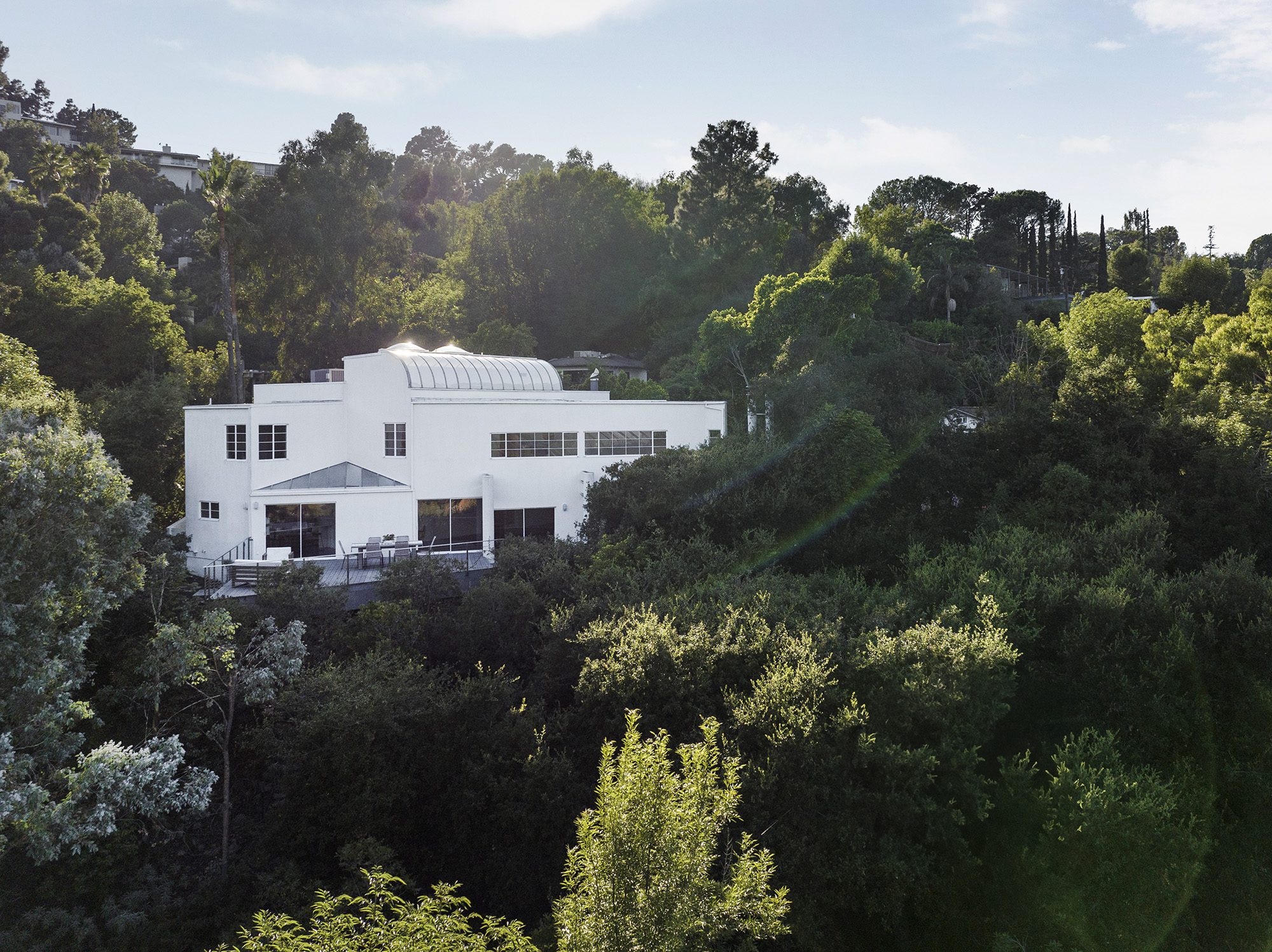 Welcome to this stunning Architectural compound, perched high above in one of the most private pockets in the Hollywood Hills. This property offers a harmonious blend of contemporary design, immersed natural light and views of nature through every window. The 3-bedroom, 3-bathroom property features a thoughtfully designed layout with open and airy living spaces, rich dark wood floors transitioning to polished cement, cozy fireplace moments and enormous skylights flooding the home with sunsets from virtually every corner. The kitchen, equipped with stainless appliances, tons of cabinetry and direct views of Mount Lee, leads out to an expansive front patio deck, creating a seamless indoor-outdoor flow that's perfect for entertaining, dining al fresco or simply stargazing. Enjoy movie nights or entertain guests in the media room with a full luxury bar. Leading up to the second level you're greeted with soaring ceilings, offering an unparalleled sense of space and connection to the surrounding natural beauty. The primary suite features separate office, fireplace and large walk-in closet that guides you to a private patio surrounded by treetop views. The home includes a surround sound speaker system throughout, separate laundry room, two car garage and ample parking for guests. The expansive lot, close to a half acre in size, features serene pathways into nature, with matured eucalyptus and oak trees. It's a private haven where you unwind and connect with the natural beauty of The Hills. While nestled in a secluded enclave, this property is conveniently located to Ventura Blvd, offering a variety of restaurants, shops, and the vibrant nightlife of the famous Sunset Strip. This retreat is a rare find, if you seek a private sanctuary with breathtaking views in the heart of Los Angeles, this exceptional property is the one for you!