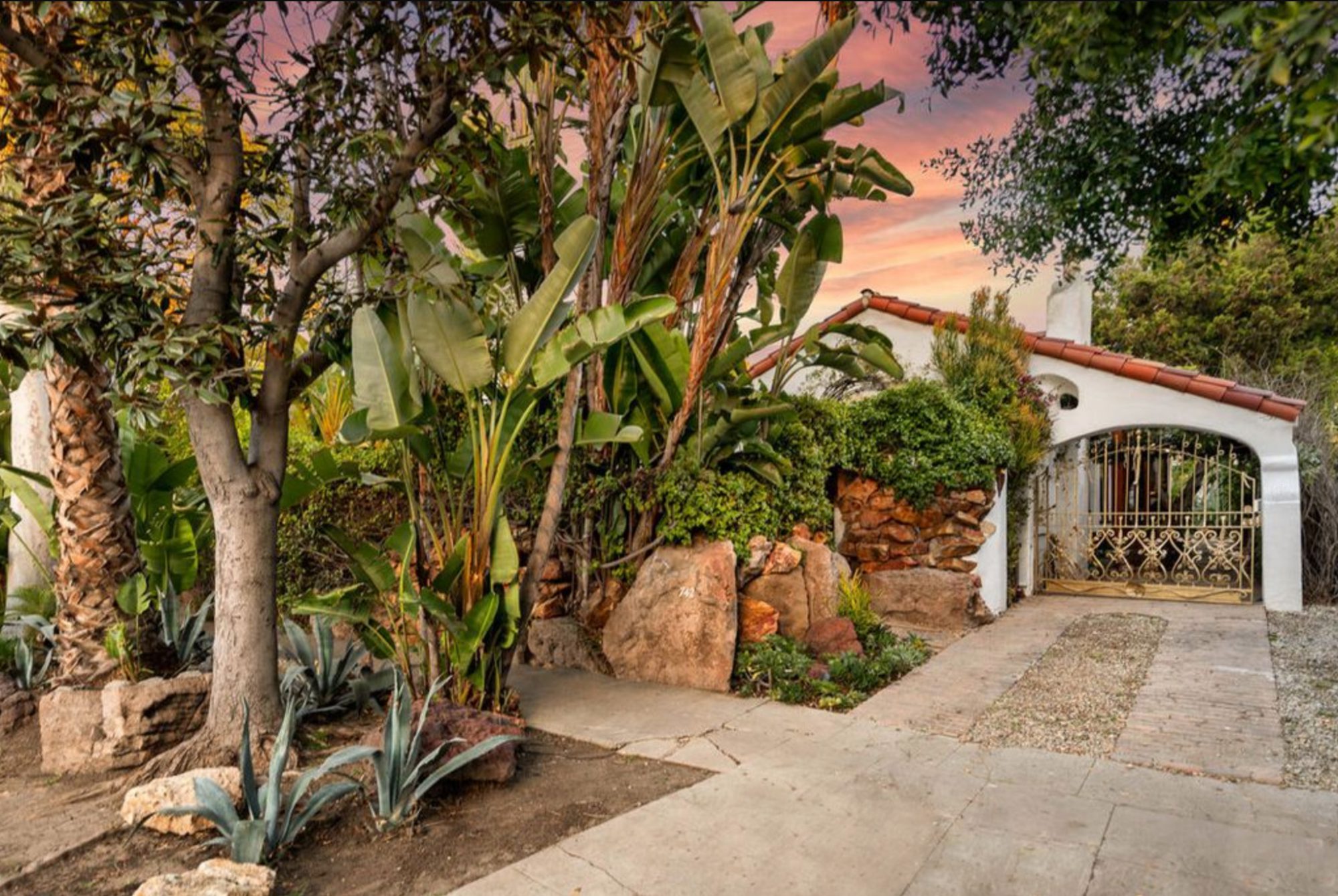 Very rare offering! Former celebrity owned private compound. This whimsical 1920's Spanish style retreat offers an amazing amount of bespoke artistic details throughout including five fireplaces, quarried coral, onyx, teak and a sunroom made of rare Honduras Mahogany woods. Restored and upgraded by famed artist/architect Robert DeYoung, this exotic and private property features a main house (2083 sf) plus a two story detached guest house (1356 sf) with a kitchen and living room on the lower level and bedroom, bathroom and patio with treetop views on the second level. The lush and tropical backyard consists of rare and exotic trees and plants in addition to a custom pool in quarried coral spanned by a bridge. In the main house as well as in the guest house, the bedroom suites and breakfast area feature unexpected Mediterranean and Adobe details. Among them are molded walls, stones, alcoves, and open spaces. This once in a lifetime custom art home is not to be missed!