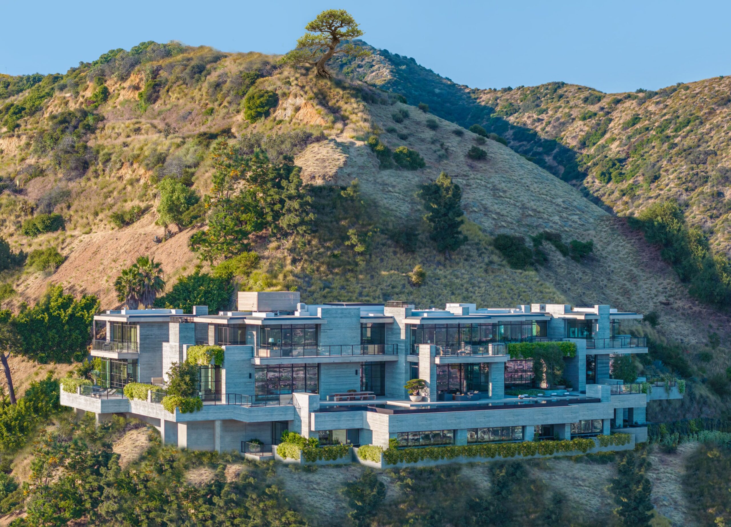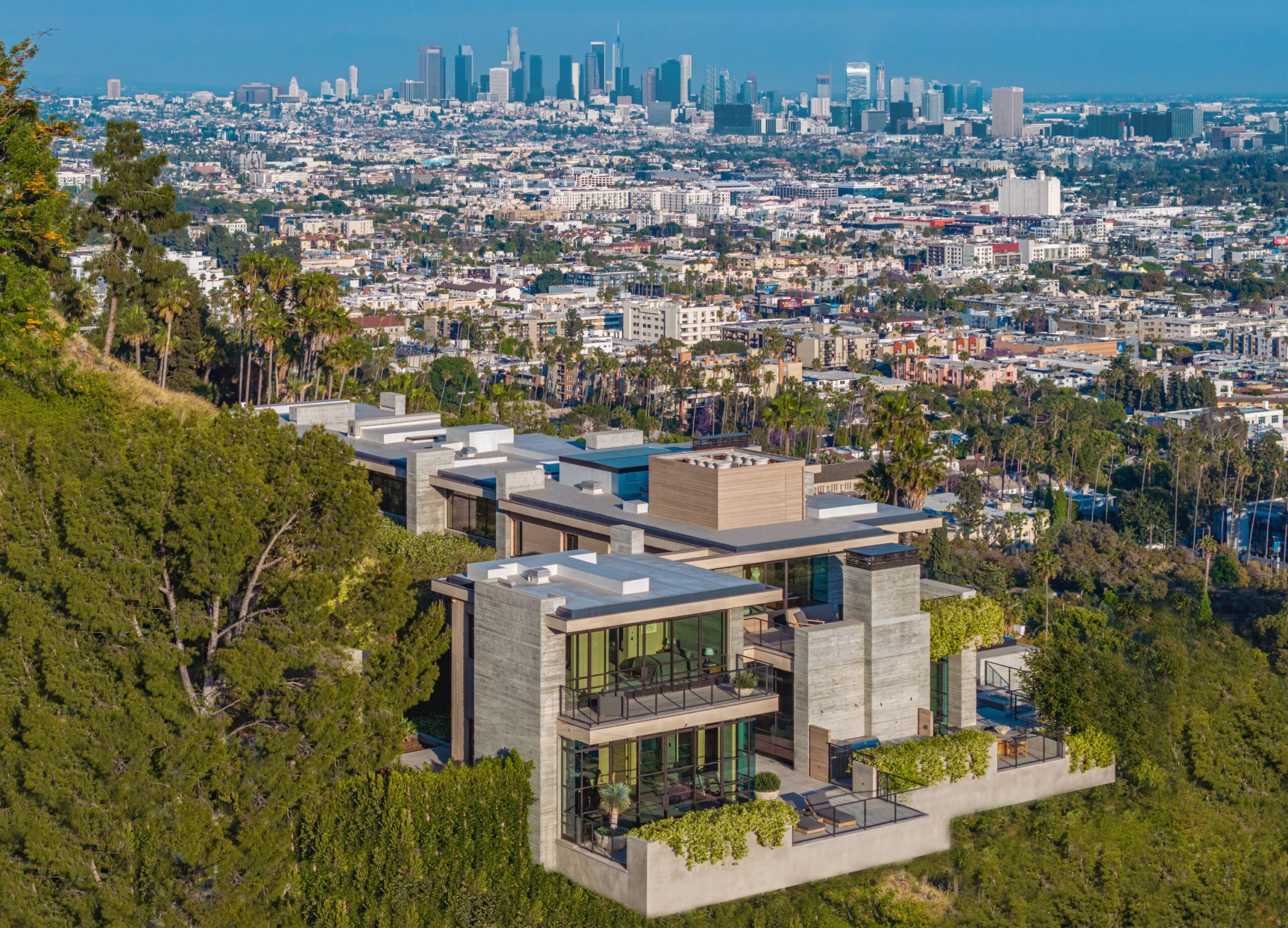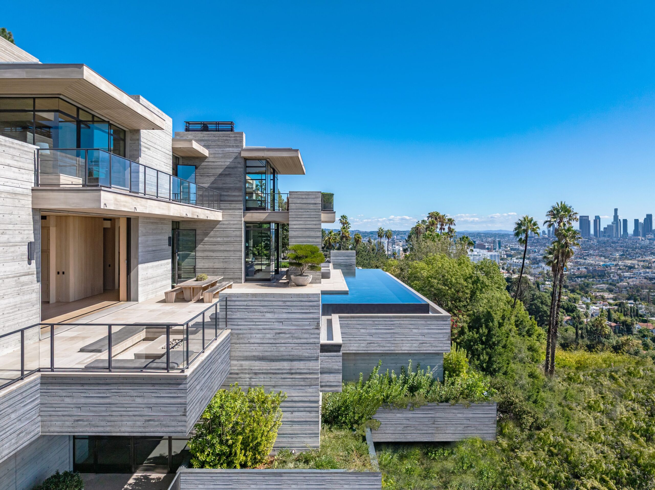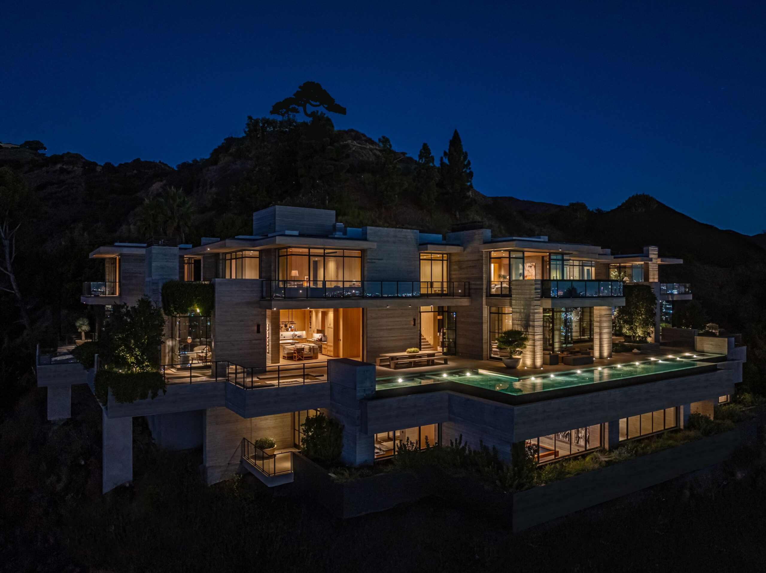 The house was built over a 10-year period, and new codes have been created since its construction, preventing a home of this type ever being built again in the Hollywood Hills. The house is constructed with $30 million of solid poured-in-place board-formed concrete with three feet thick concrete walls, and over 100 caissons that go 100 feet deep. The hard cost of the construction is $3,500 a square foot not including the land. The project engaged JRC Group, Inc., arguably the best builder in the city. The house includes a multi-million-dollar Jada steel door package, custom millwork, and audio/visual.