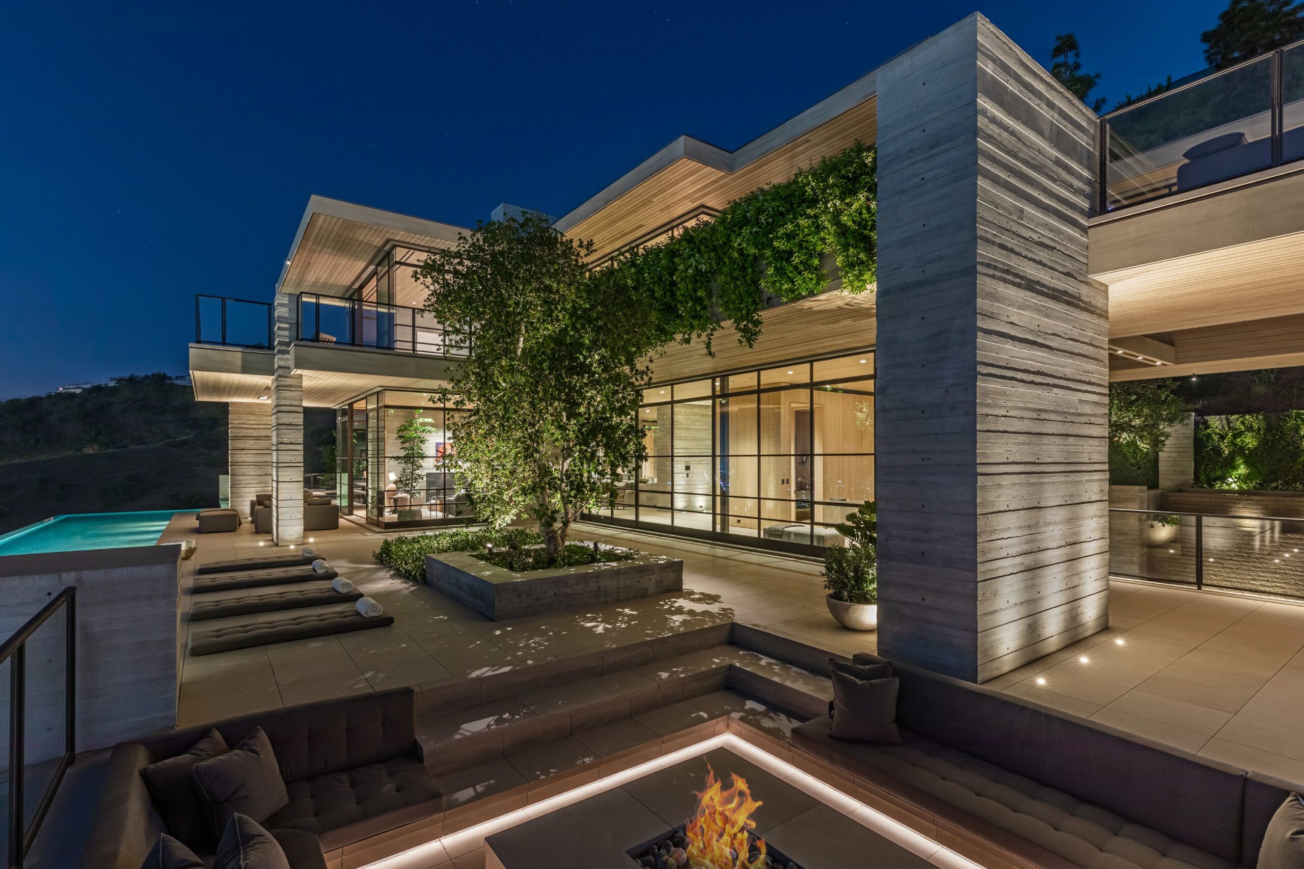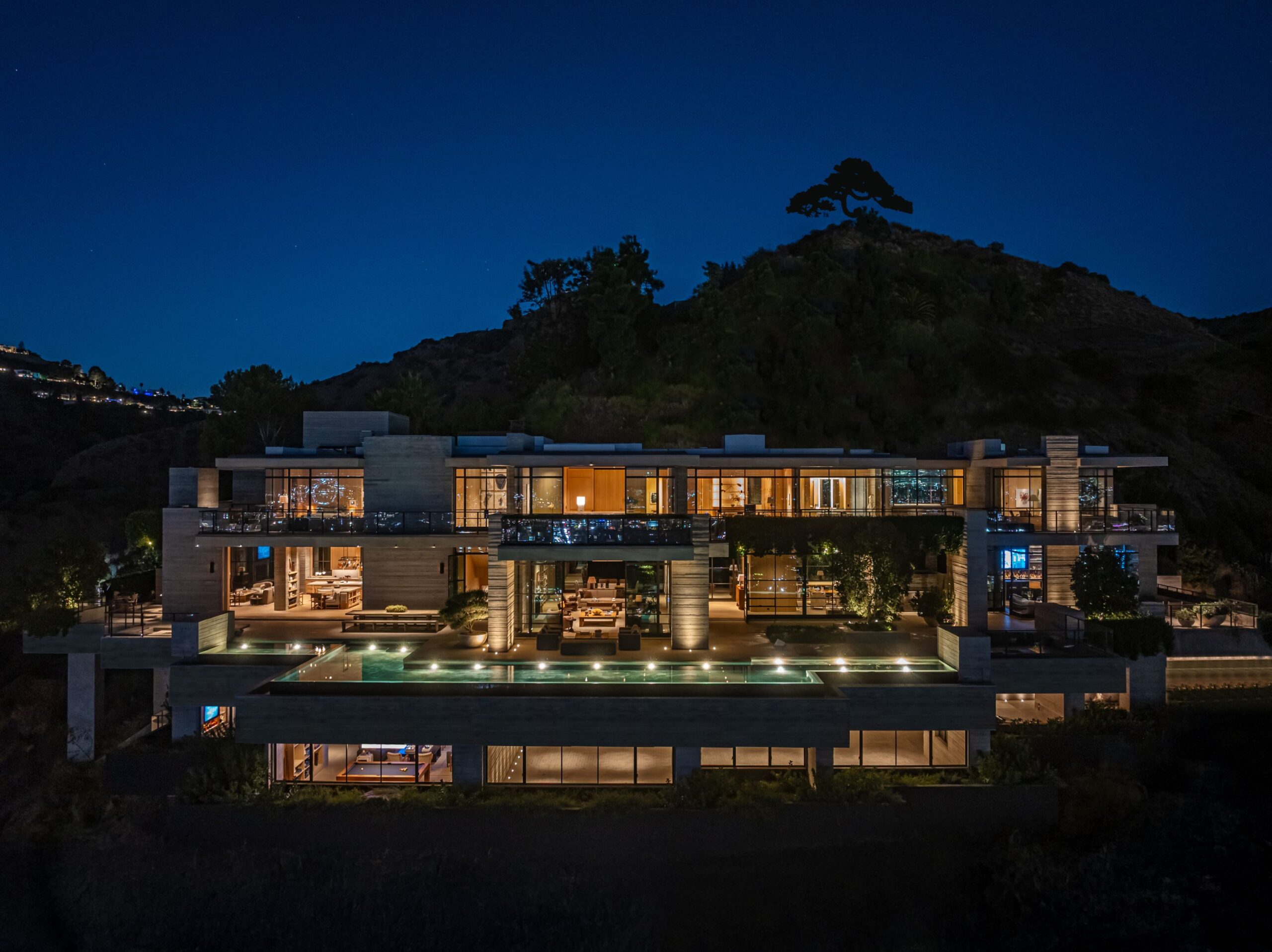 Designed for a multitude of uses, the house is both intimate and open with dedicated spaces for living, dining, reading, working, exercising and entertaining. Centered around a stairwell that ascends through three floors and is bathed in sunlight from a wall-to-wall skylight, are four bedrooms, two studies, the living room, dining room, kitchen, family room, pool bar and lounge, gym, state of the art screening room, billiards room and bar, and staff quarters. Outside the infinity pool, which appears to float on the horizon, is surrounded by dining and lounge areas with sunken seating and fire pits, and a series of outdoor rooms.