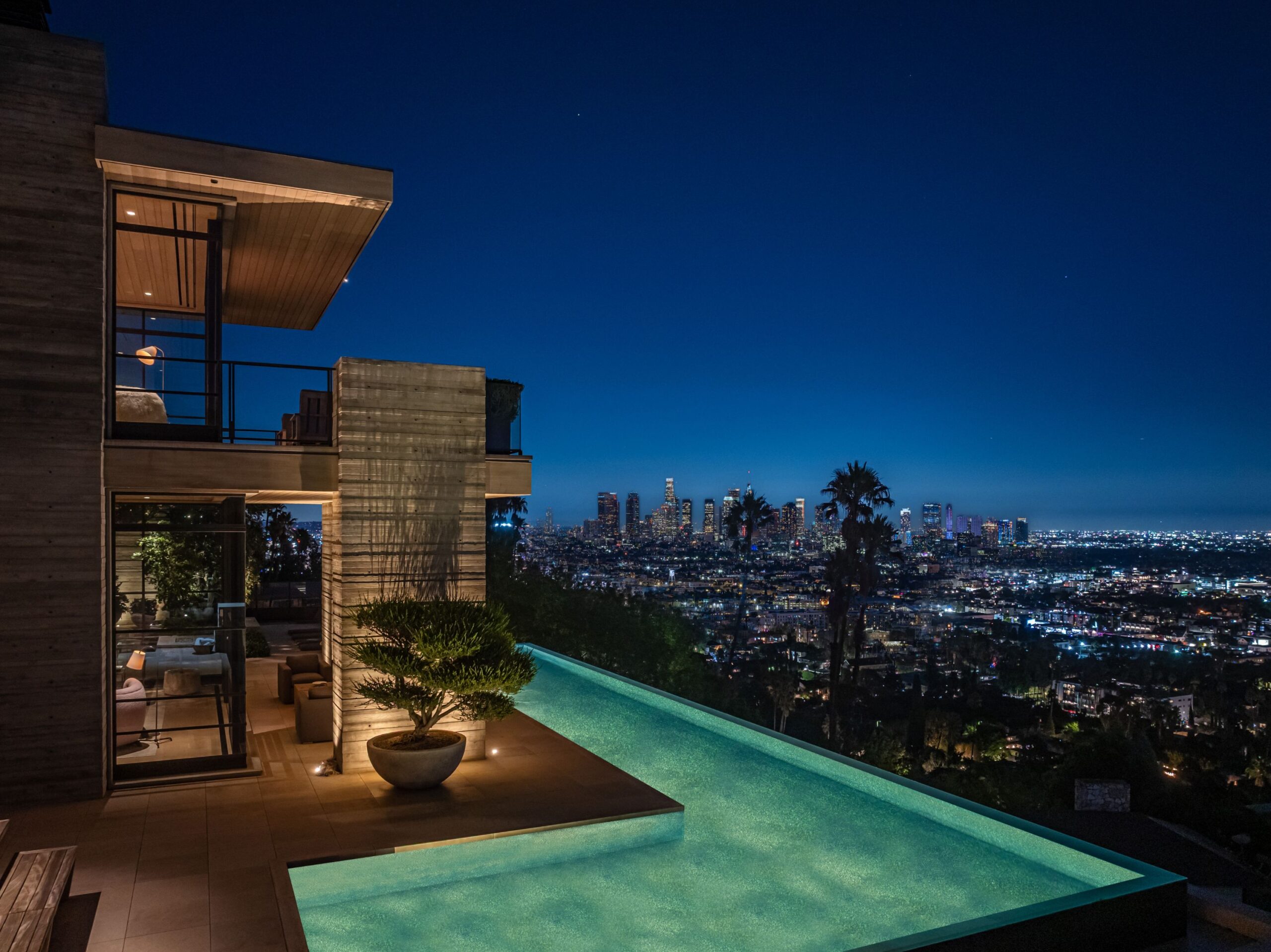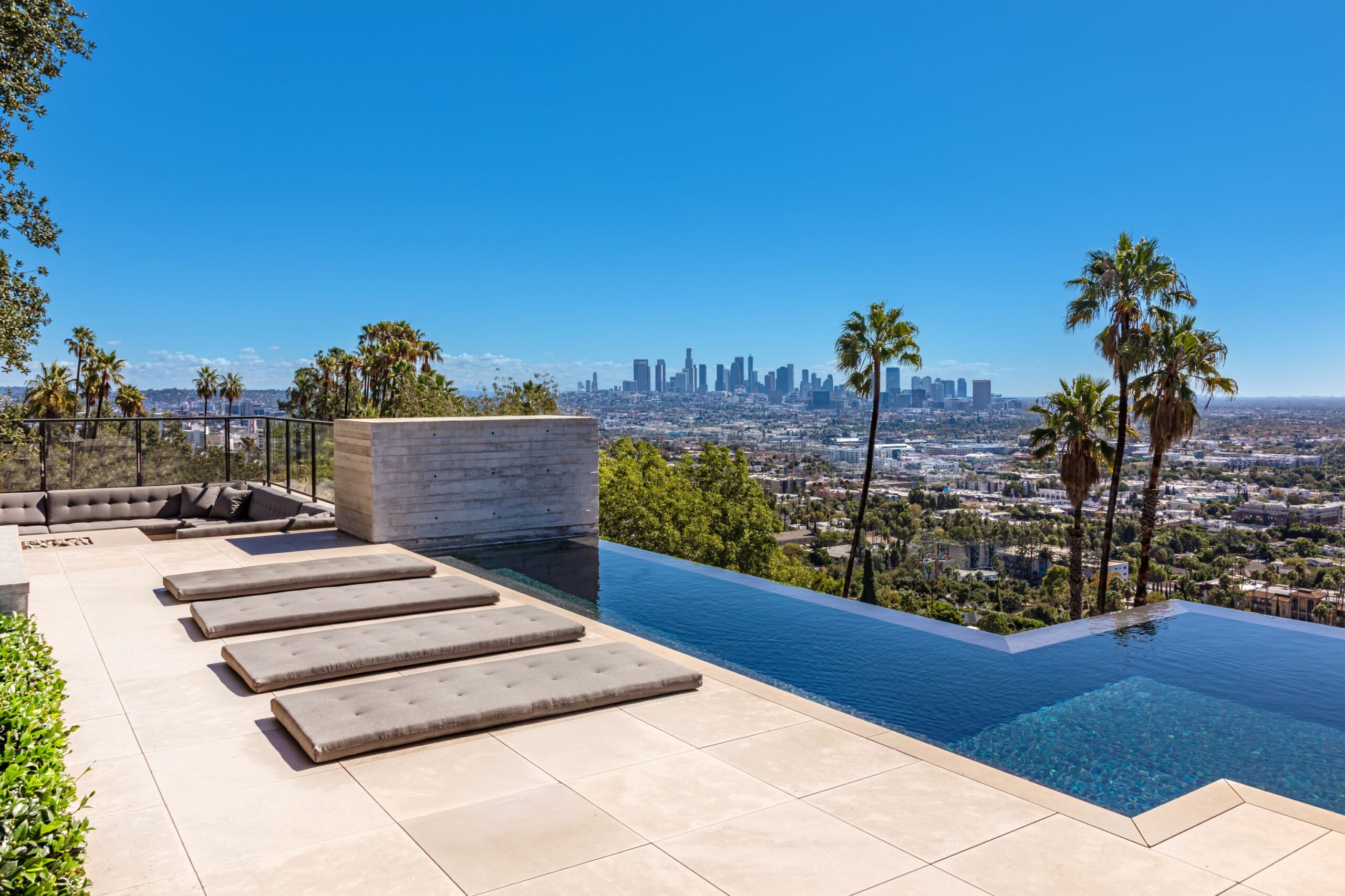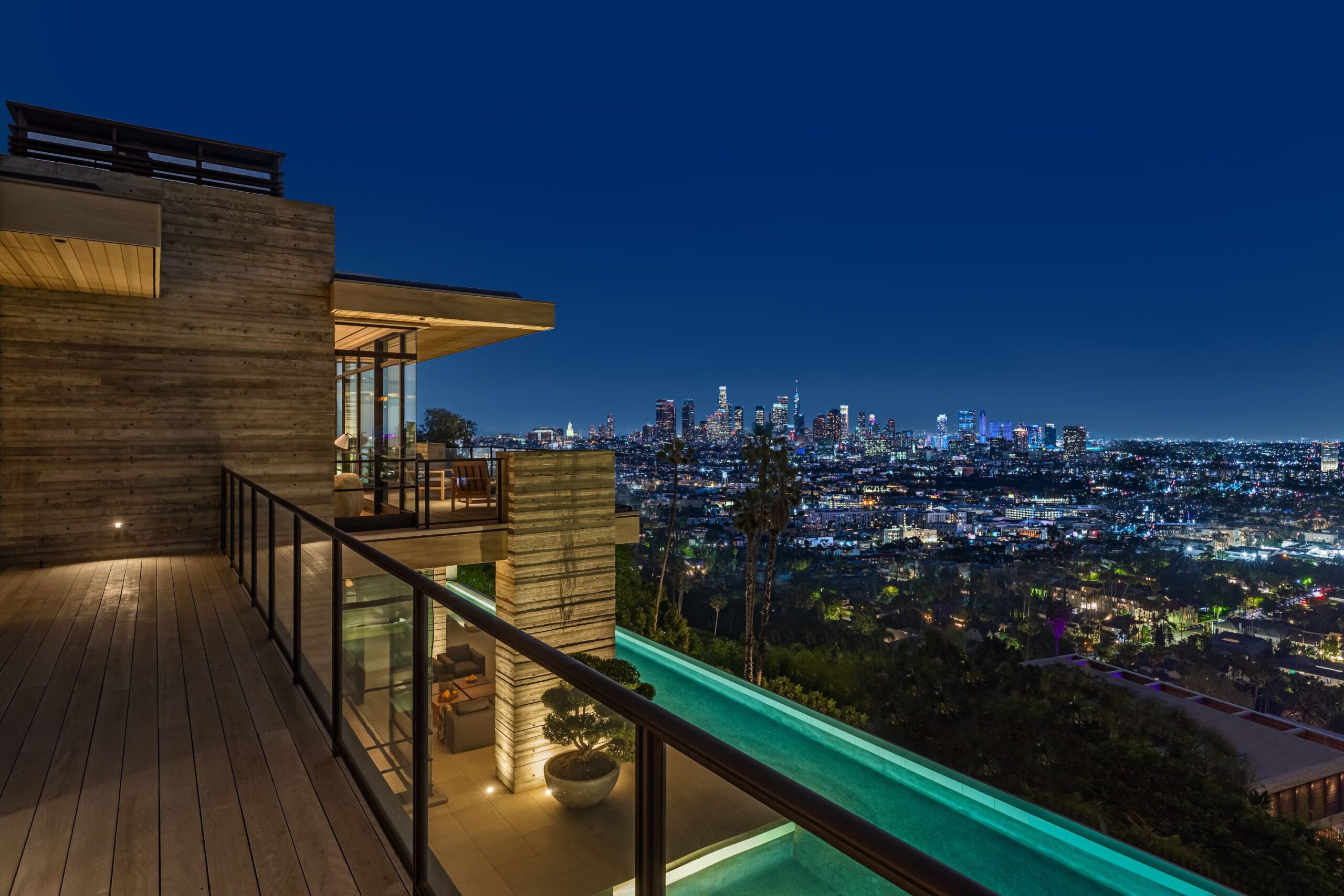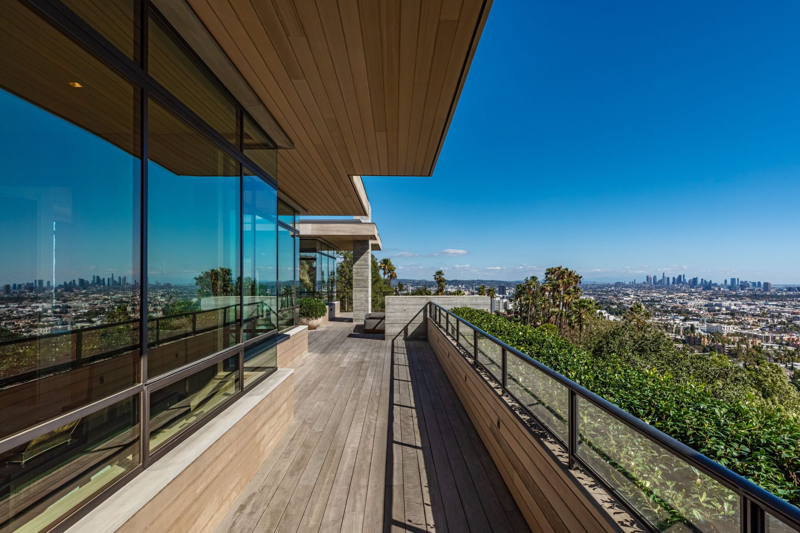 This property is set on Los Angeles's most iconic promontory, formerly owned by Howard Hughes, that extends over one acre with no neighbors on either side and 270 views of the entire city. Set at the 50-yard line of legendary hot spots Chateau Marmont, Tower Bar, and the Hollywood Bowl, the energy of the city can be seen and felt from the estate’s peaceful privacy. Additionally, the property borders state land so no building can be constructed behind it, and it has private access to hiking in the famous Runyon Canyon.