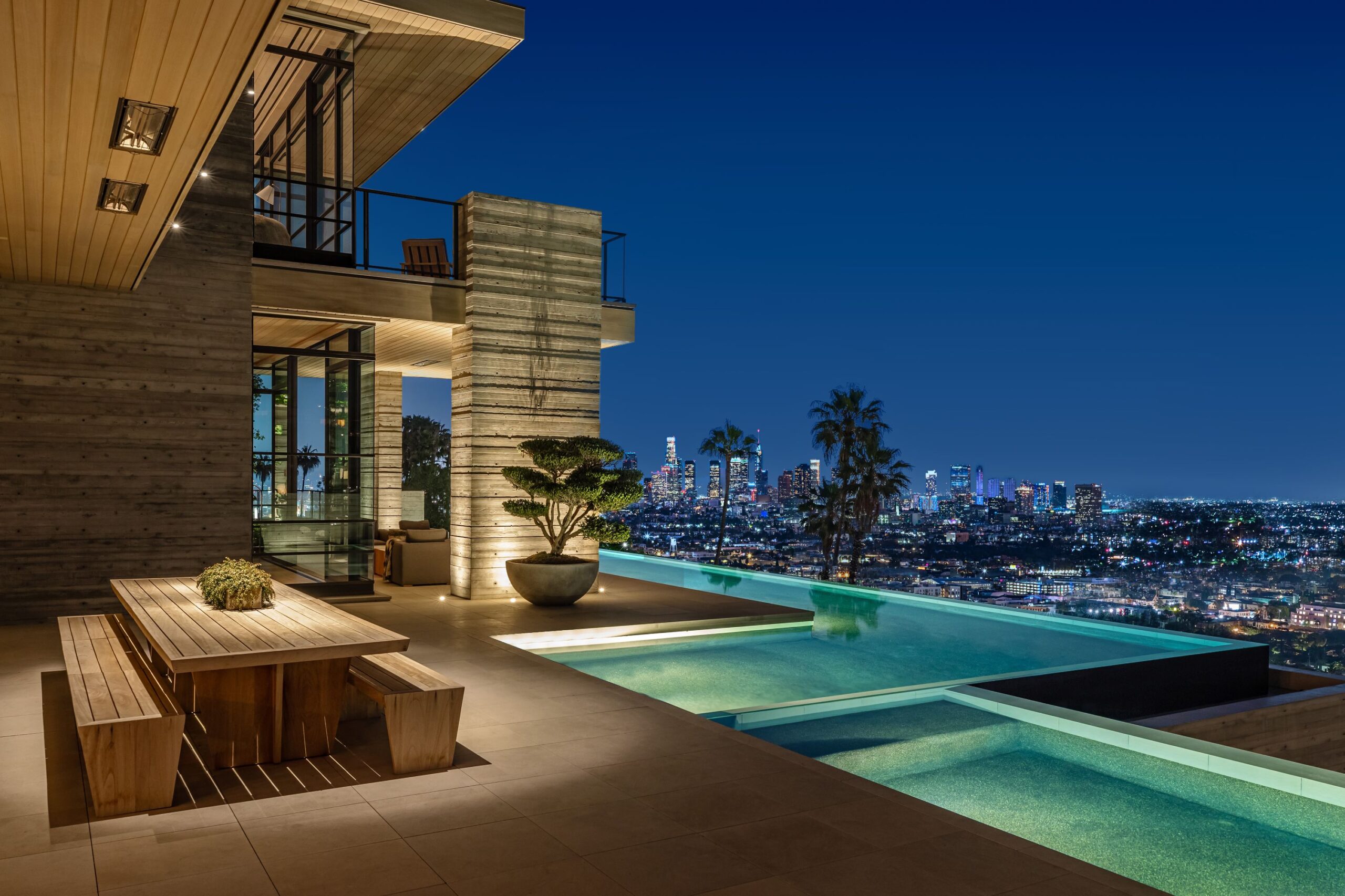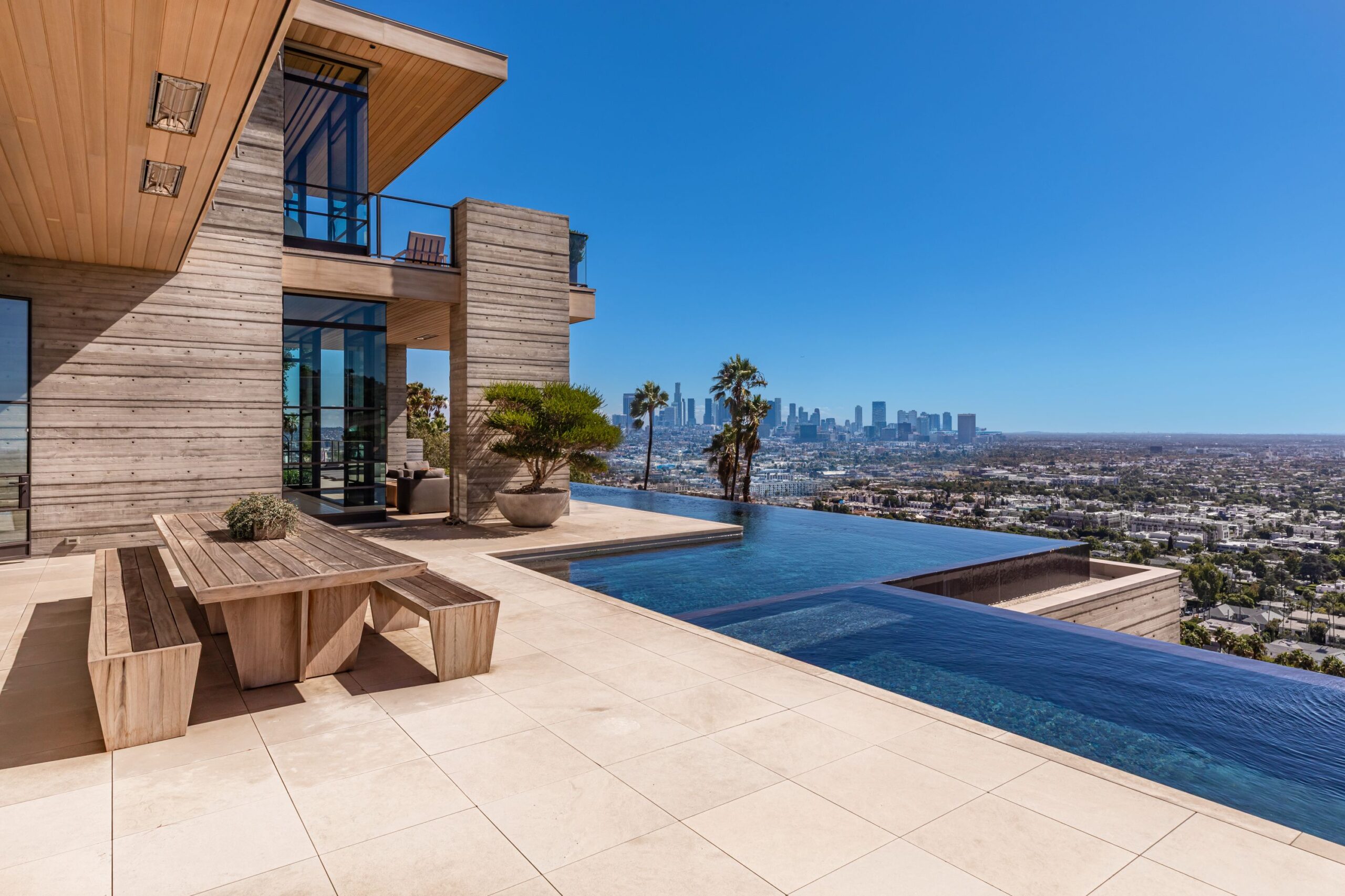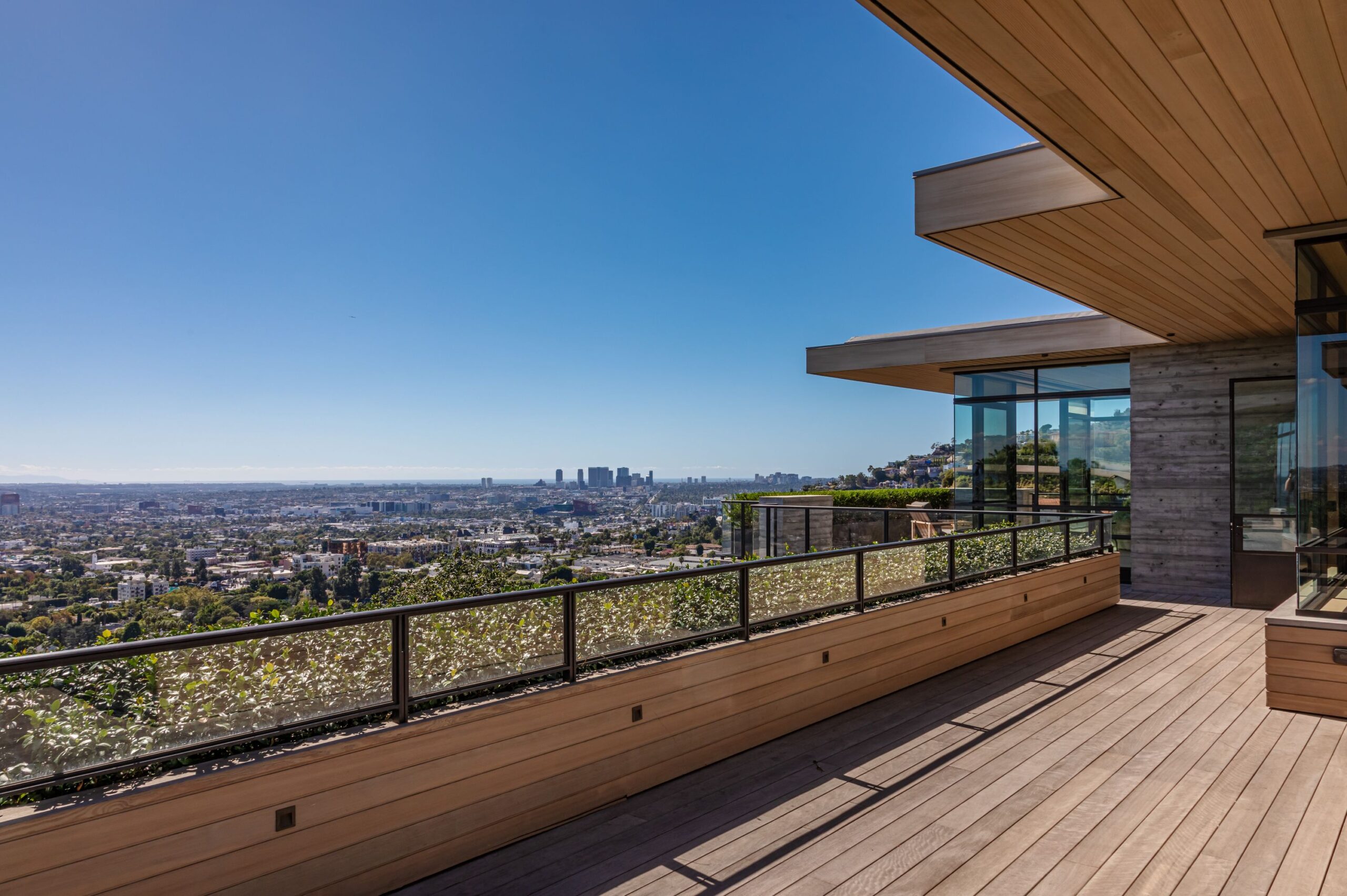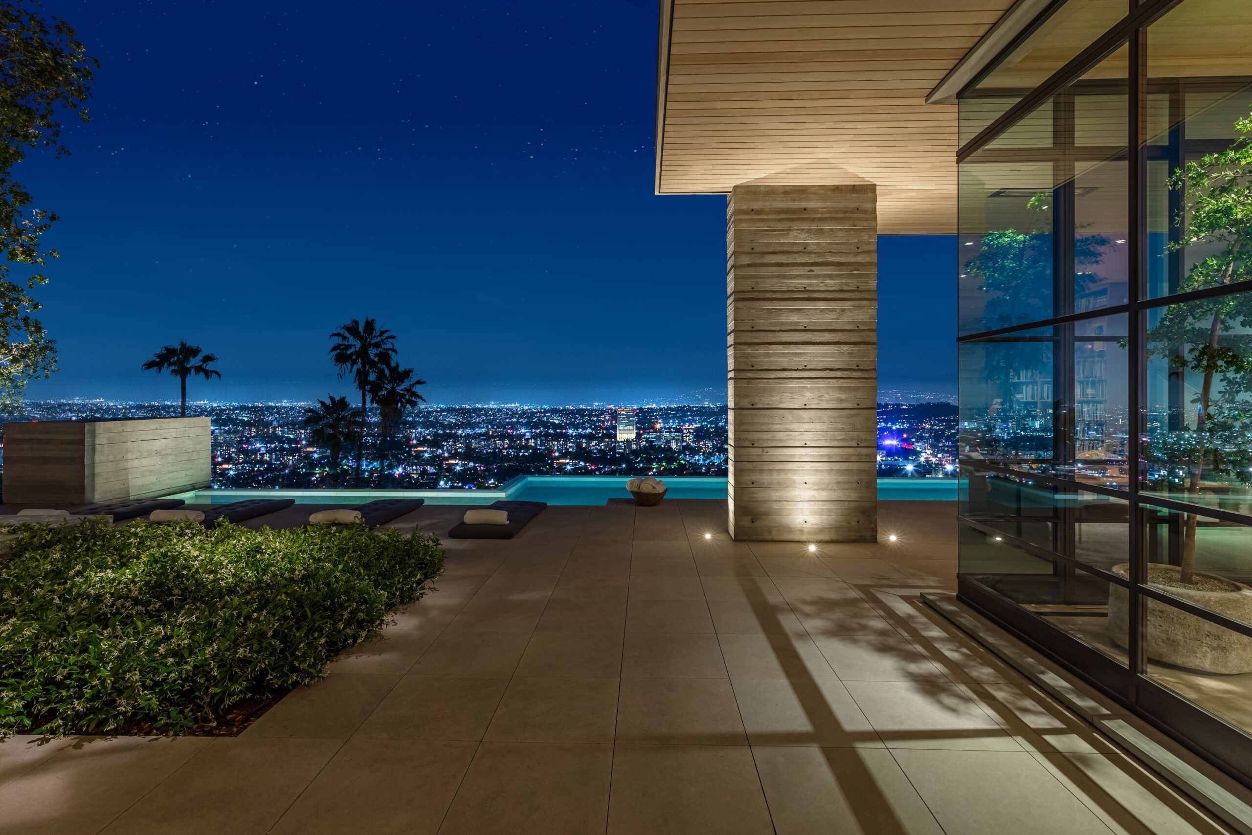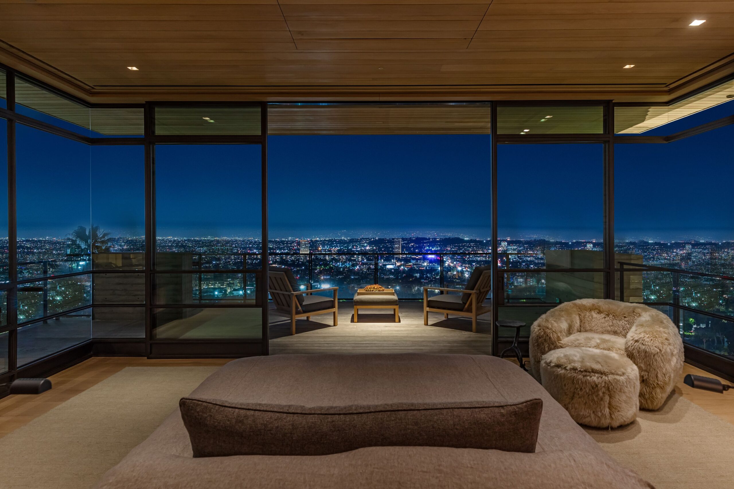 This property is set on Los Angeles's most iconic promontory, formerly owned by Howard Hughes, that extends over one acre with no neighbors on either side and 270 views of the entire city. Set at the 50-yard line of legendary hot spots Chateau Marmont, Tower Bar, and the Hollywood Bowl, the energy of the city can be seen and felt from the estate’s peaceful privacy. Additionally, the property borders state land so no building can be constructed behind it, and it has private access to hiking in the famous Runyon Canyon.