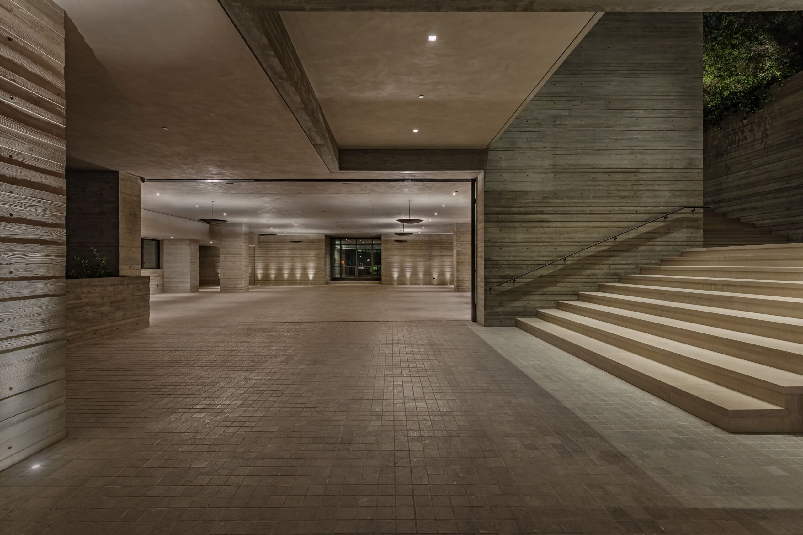 On the lower level is a recreational zone with state-of-the-art screening room, billiards room with lounge area, and a bar. These program elements are organized around a gracious distribution foyer which doubles as a secondary point of entry to the house and leads to the motor court, which can be converted into a conditioned, modern ballroom.