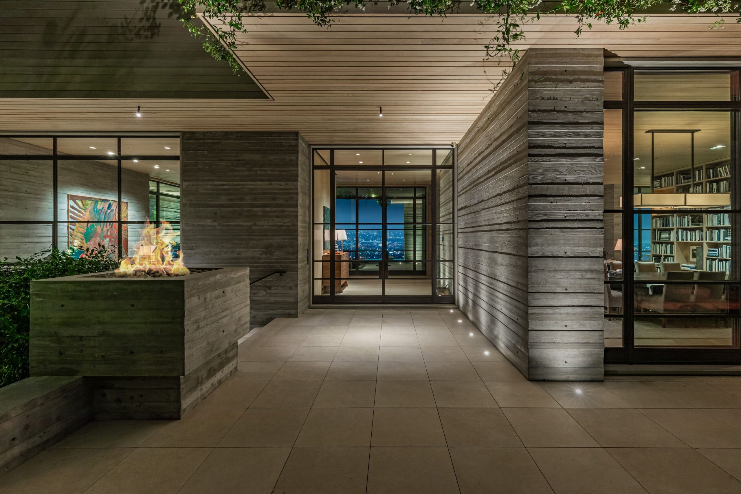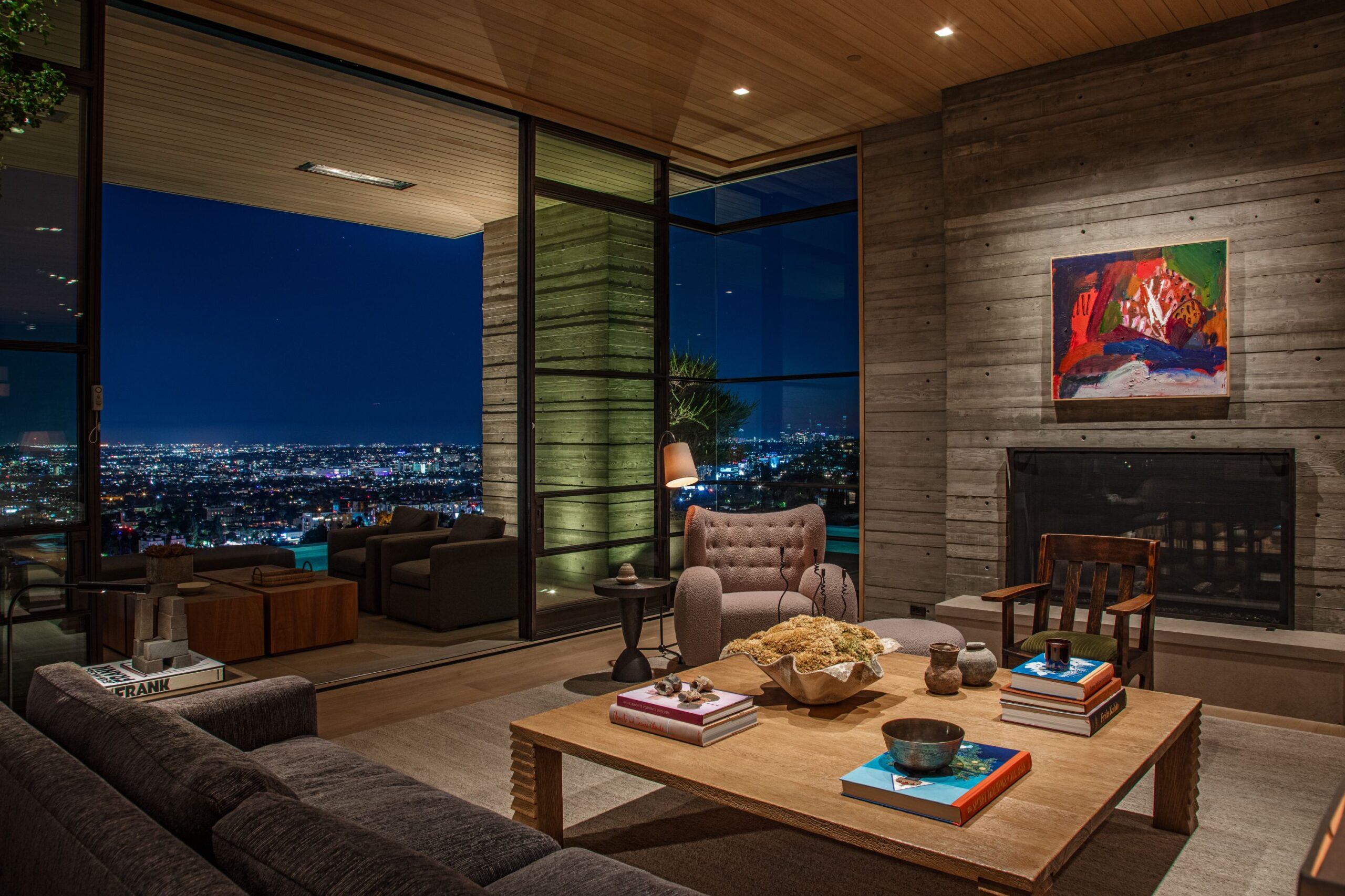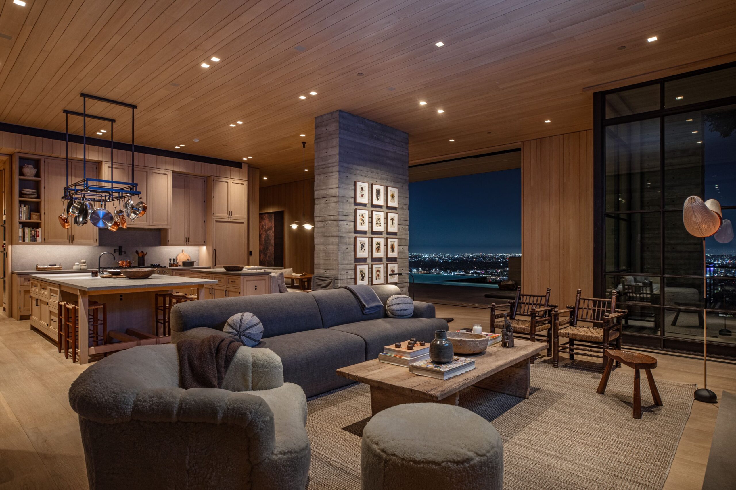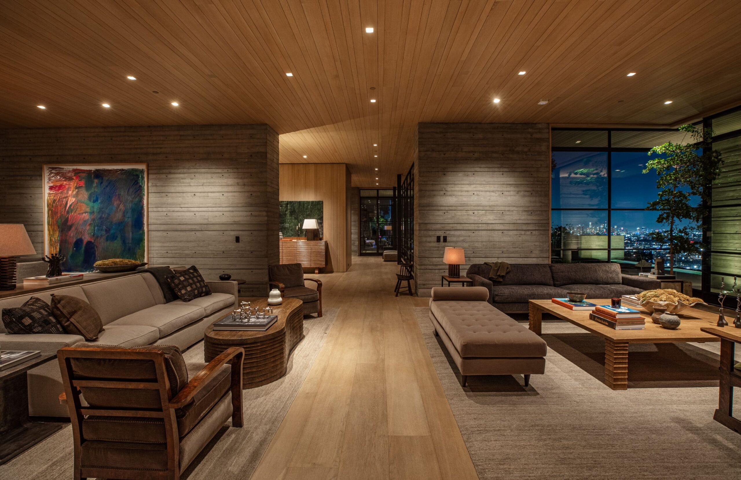Scott Mitchell Studio’s refined use of monolithic board-formed concrete, which has influenced a generation of architects in Southern California and beyond, along with glass and steel curtain walls and cantilevered wood roof planes, are central to the design, anchoring the house into the earth. Wood and natural materials, such as vertical grain white oak, Indiana limestone and a muted color palette add warmth.