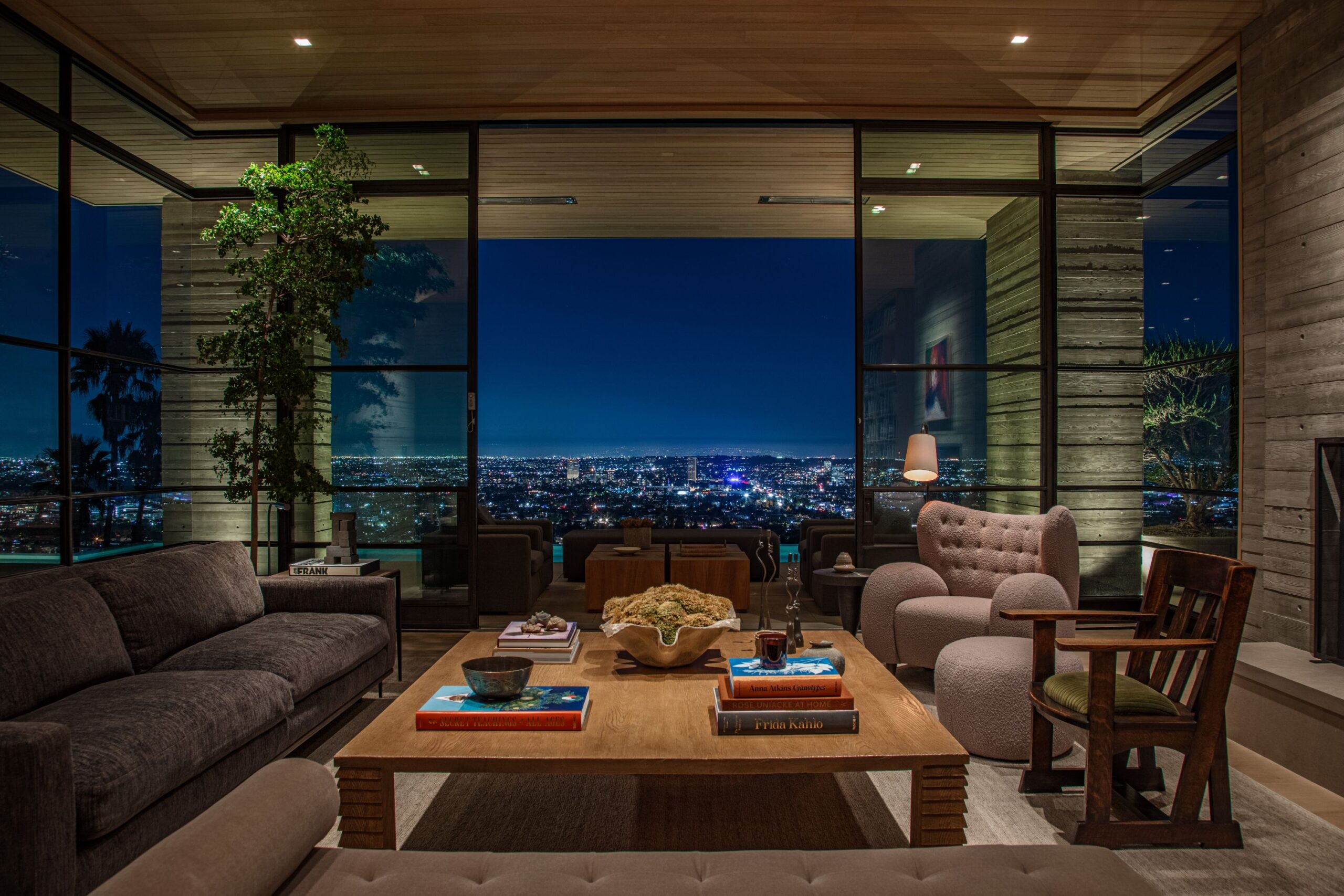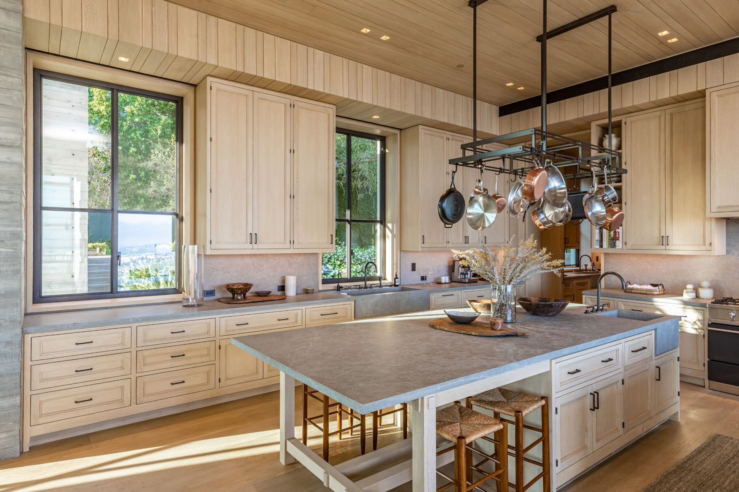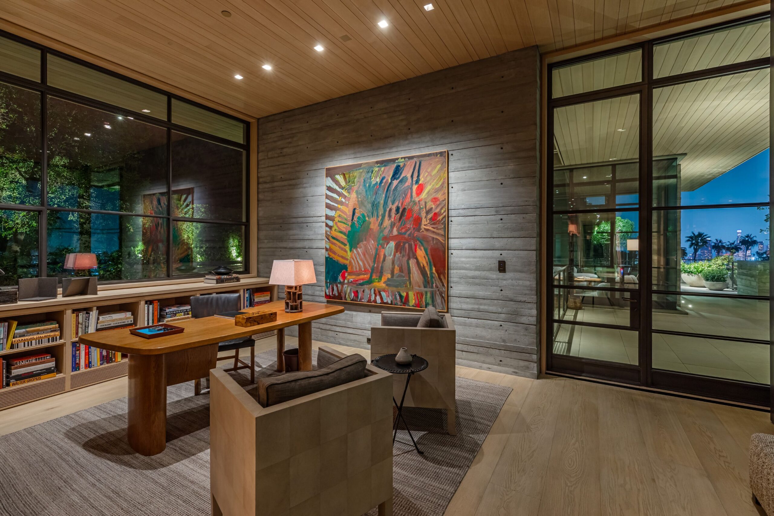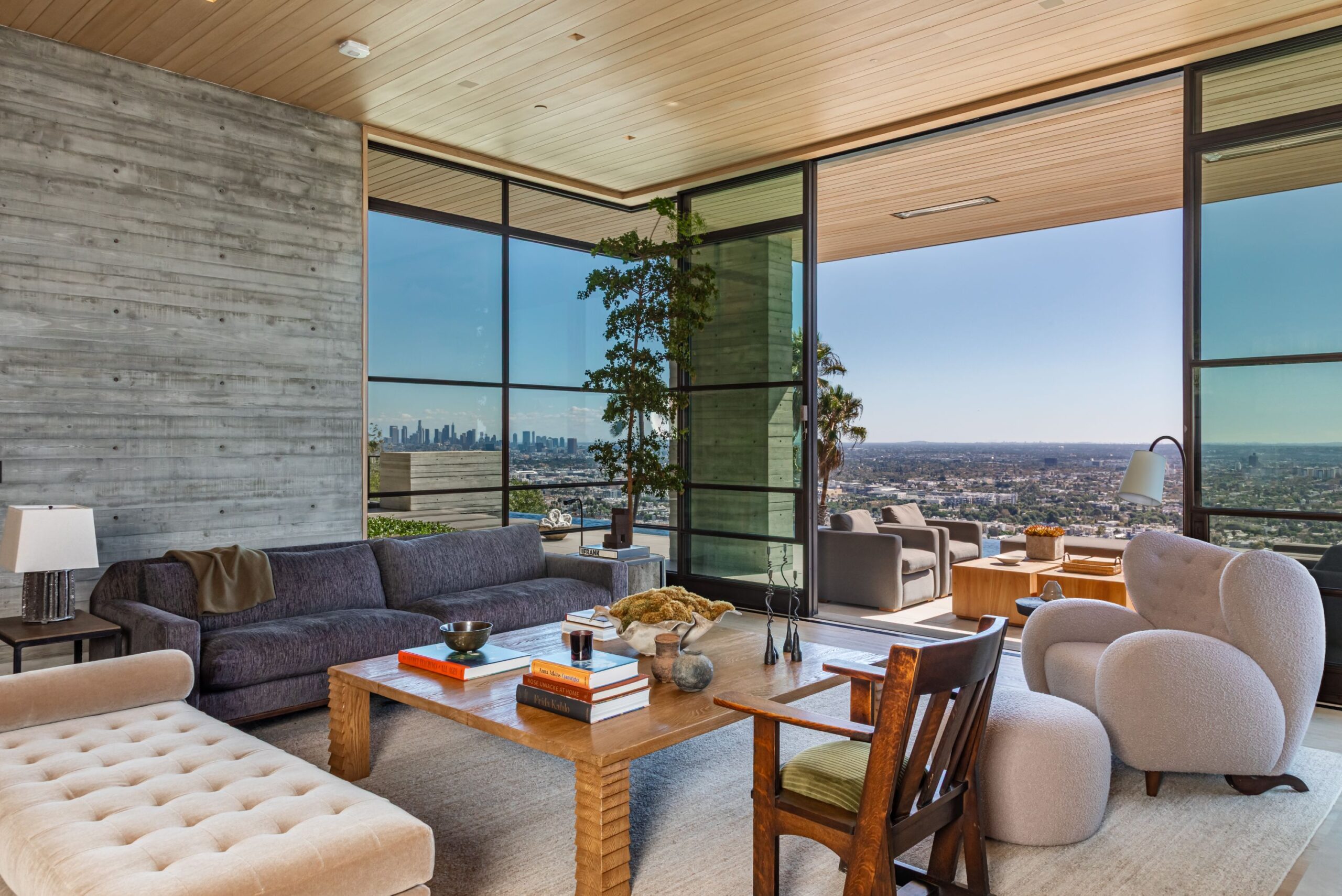 Scott Mitchell Studio’s refined use of monolithic board-formed concrete, which has influenced a generation of architects in Southern California and beyond, along with glass and steel curtain walls and cantilevered wood roof planes, are central to the design, anchoring the house into the earth. Wood and natural materials, such as vertical grain white oak, Indiana limestone and a muted color palette add warmth.