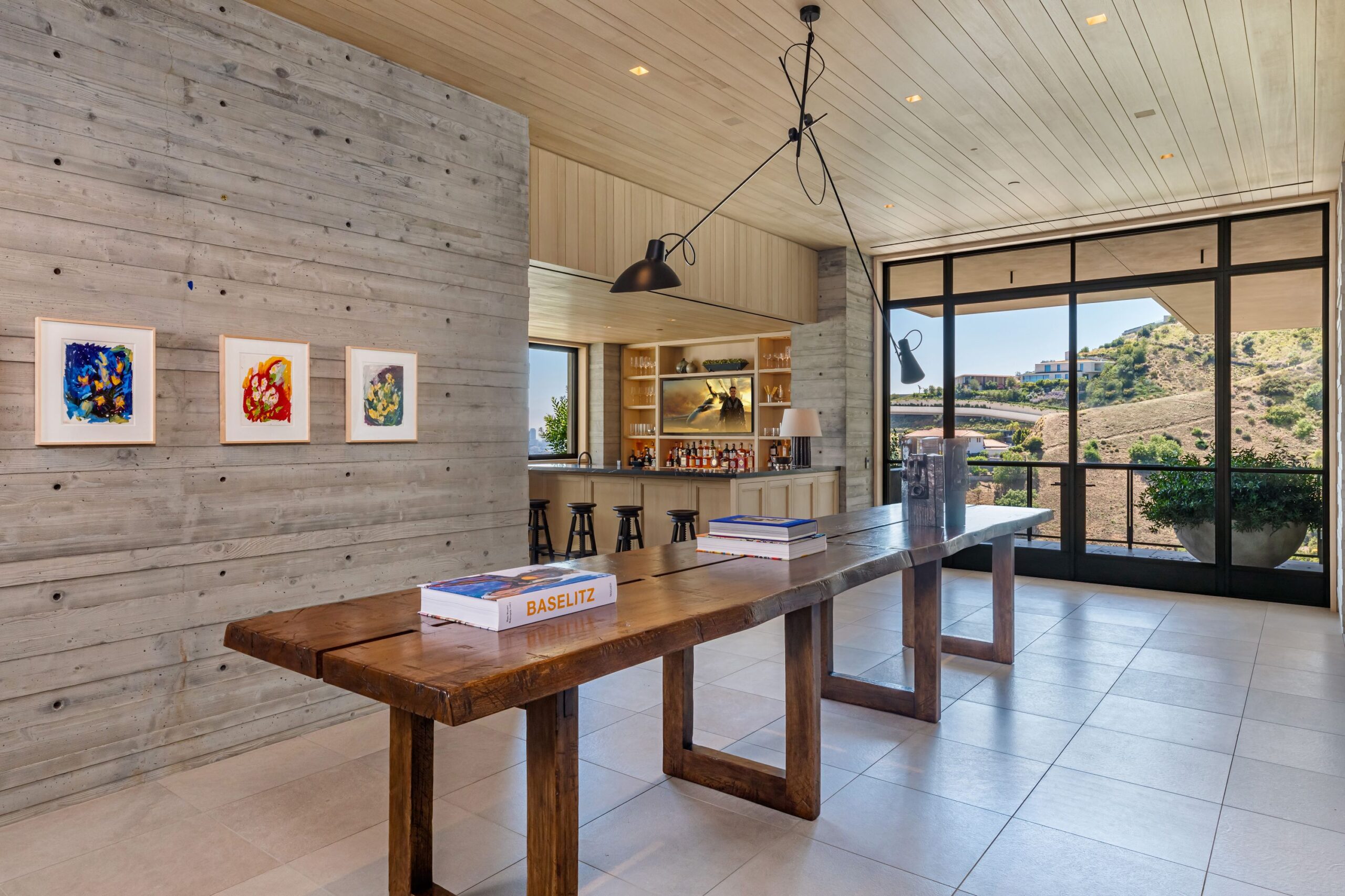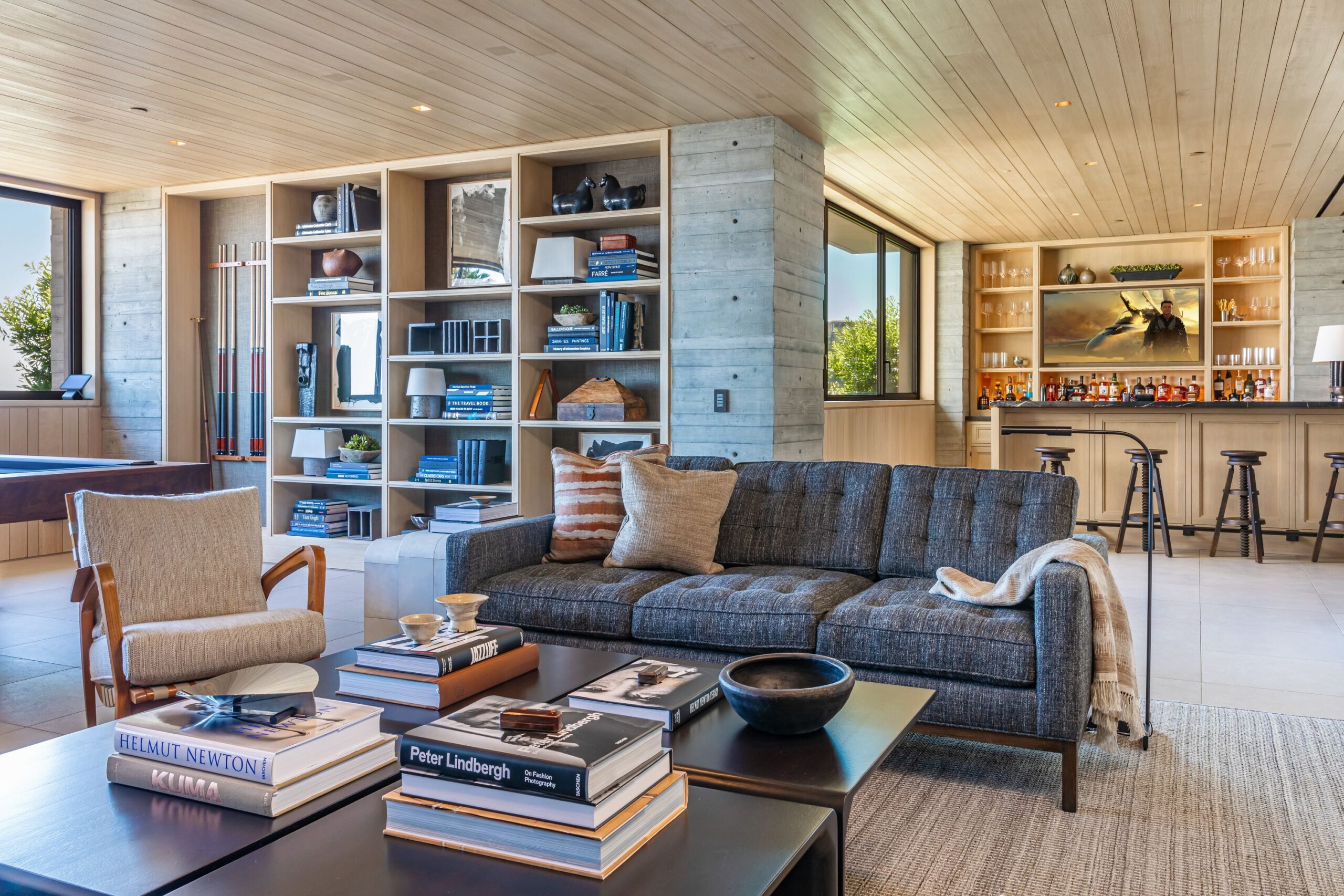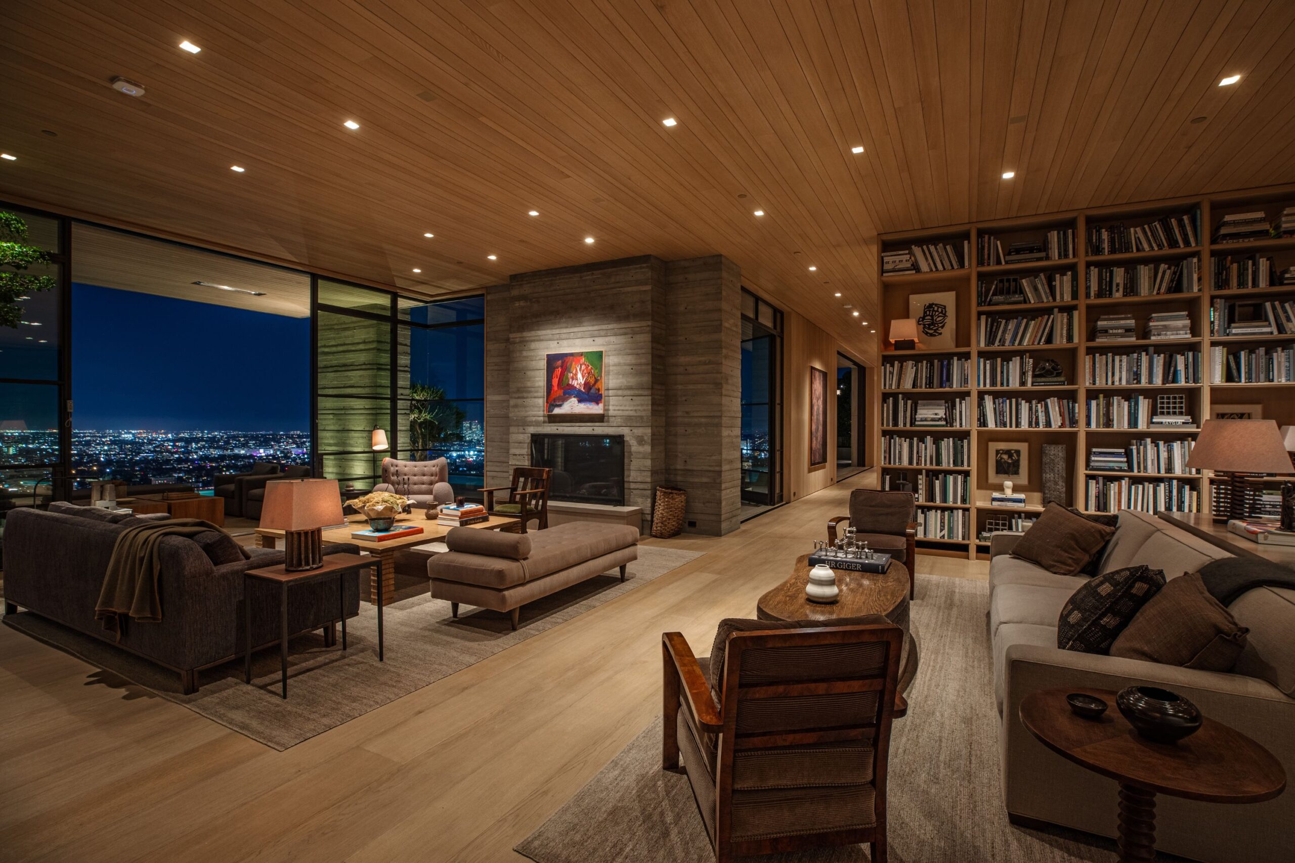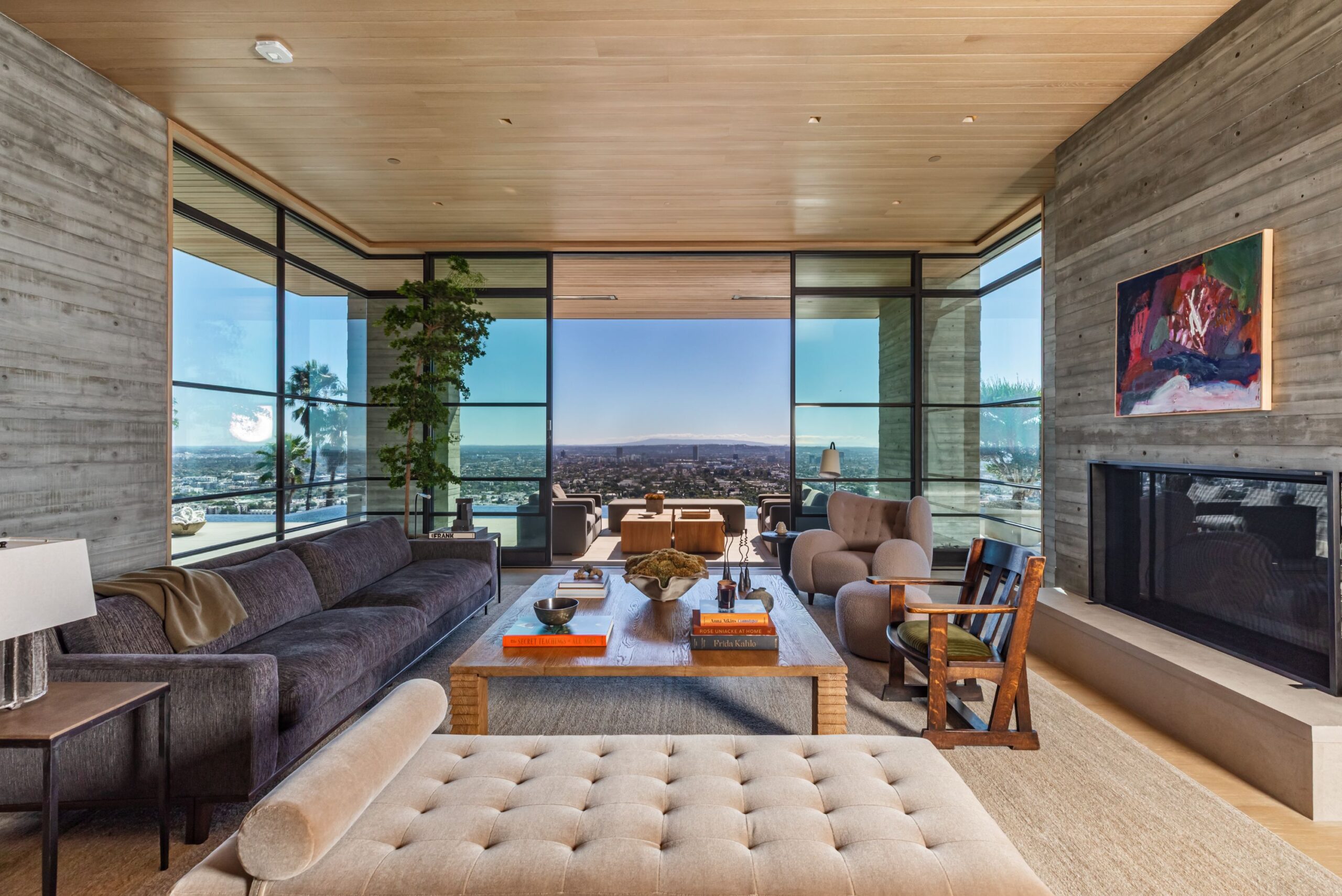Scott Mitchell Studio’s refined use of monolithic board-formed concrete, which has influenced a generation of architects in Southern California and beyond, along with glass and steel curtain walls and cantilevered wood roof planes, are central to the design, anchoring the house into the earth. Wood and natural materials, such as vertical grain white oak, Indiana limestone and a muted color palette add warmth.