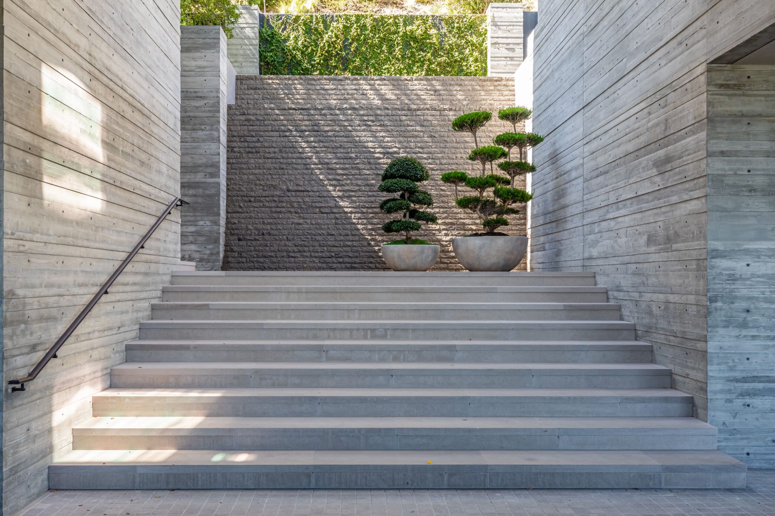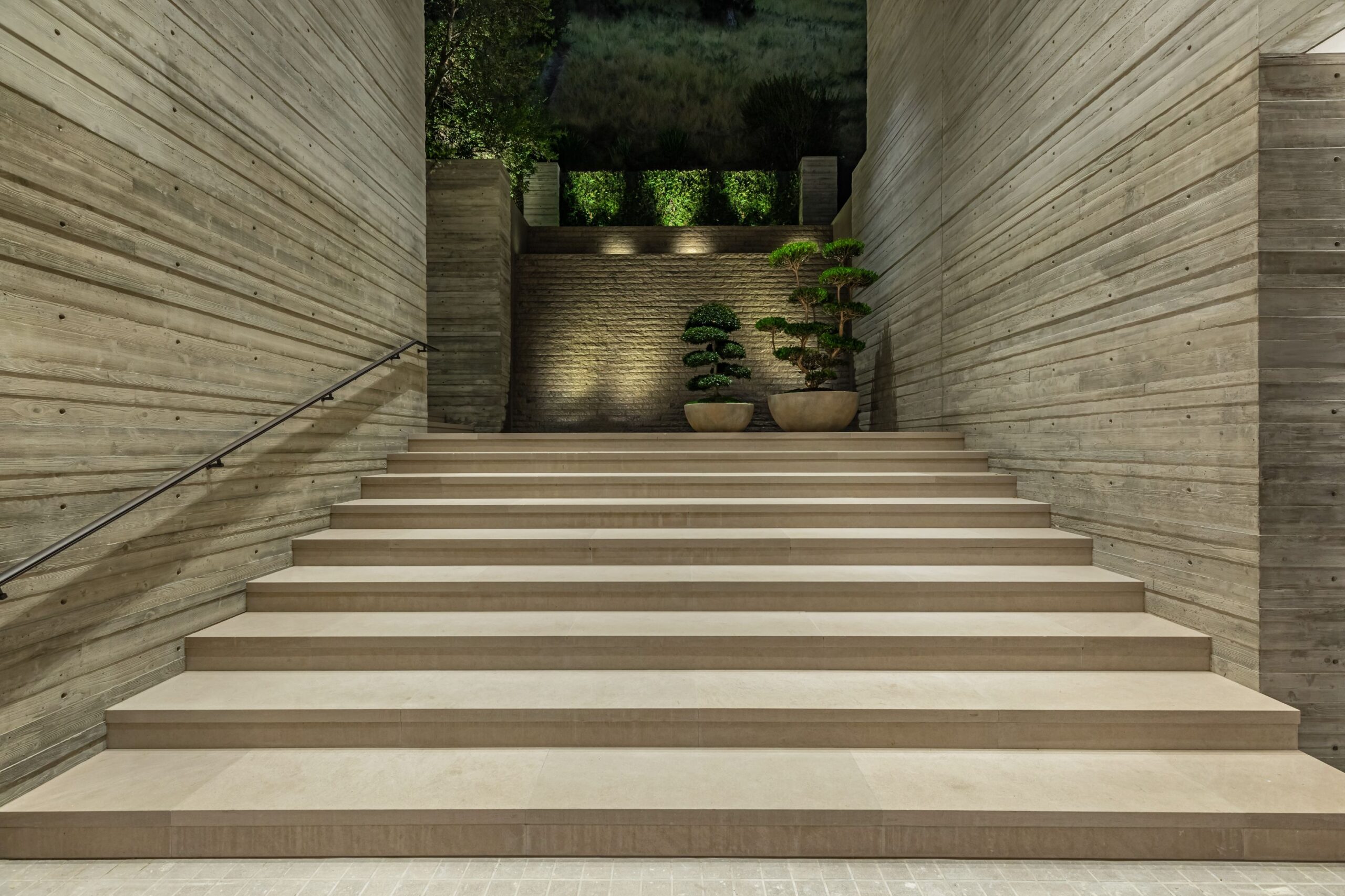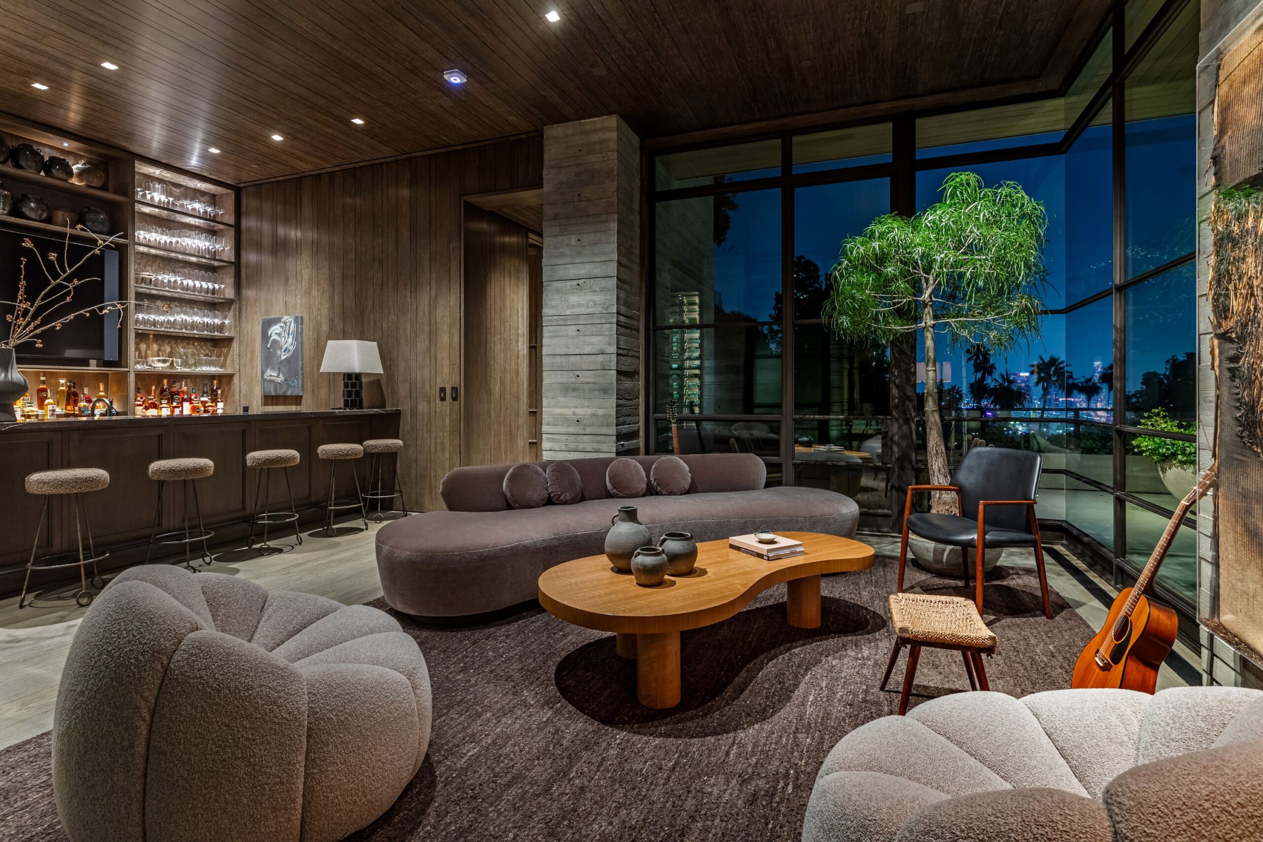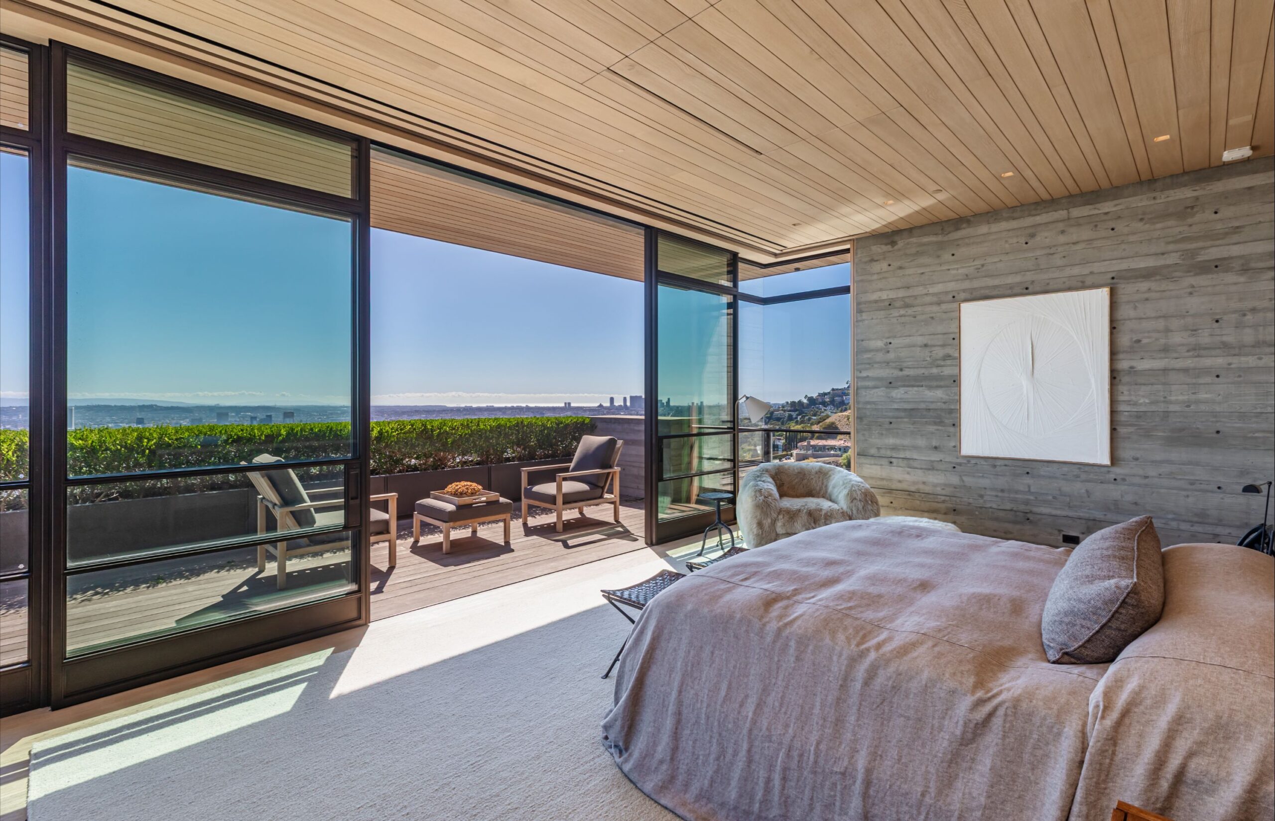 Scott Mitchell Studio’s refined use of monolithic board-formed concrete, which has influenced a generation of architects in Southern California and beyond, along with glass and steel curtain walls and cantilevered wood roof planes, are central to the design, anchoring the house into the earth. Wood and natural materials, such as vertical grain white oak, Indiana limestone and a muted color palette add warmth.