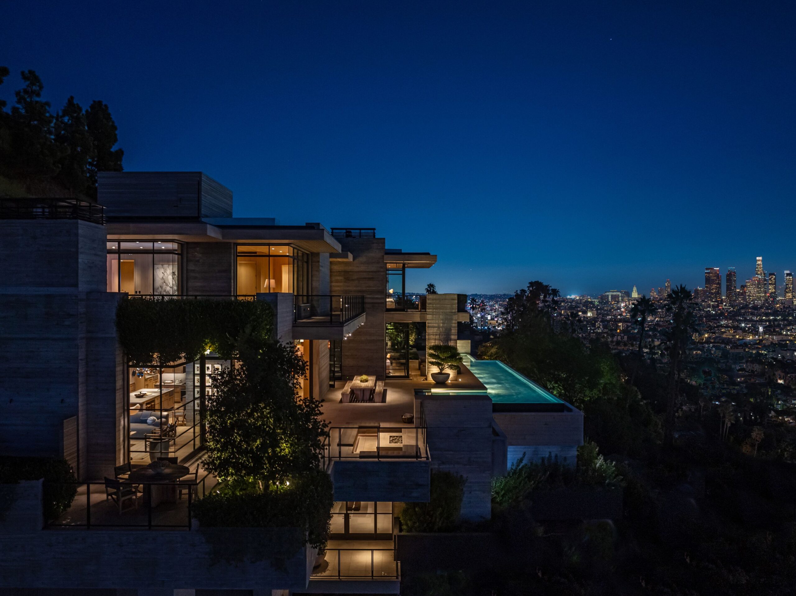 The Hollywood Hills House designed by Scott Mitchell Studio is a monumental and versatile modern villa rising out of the Hollywood Hills. The layered and terraced house - designed for living and entertaining - embraces views that span L.A.’s cityscape from east to west and out to the Pacific Ocean.