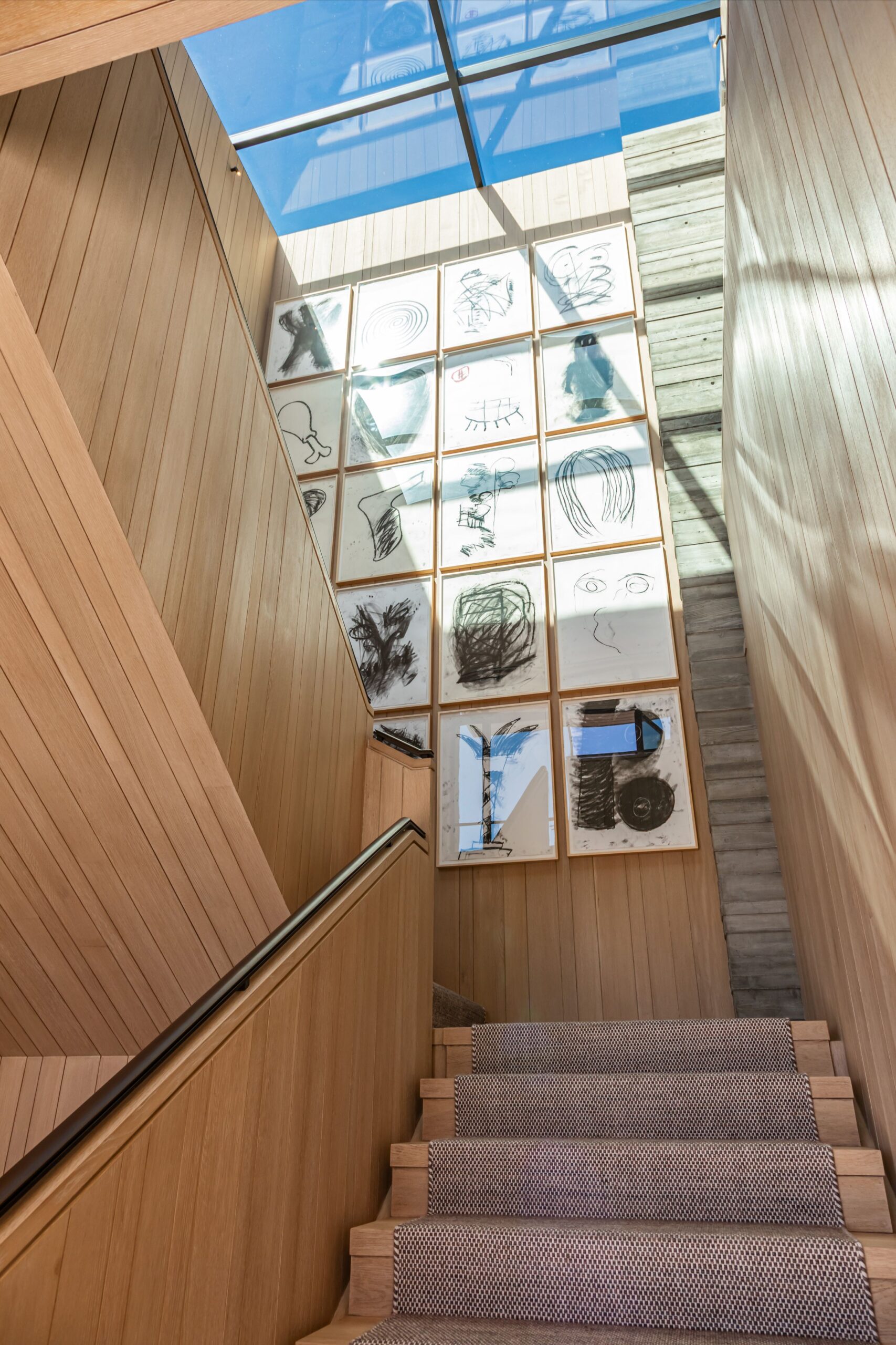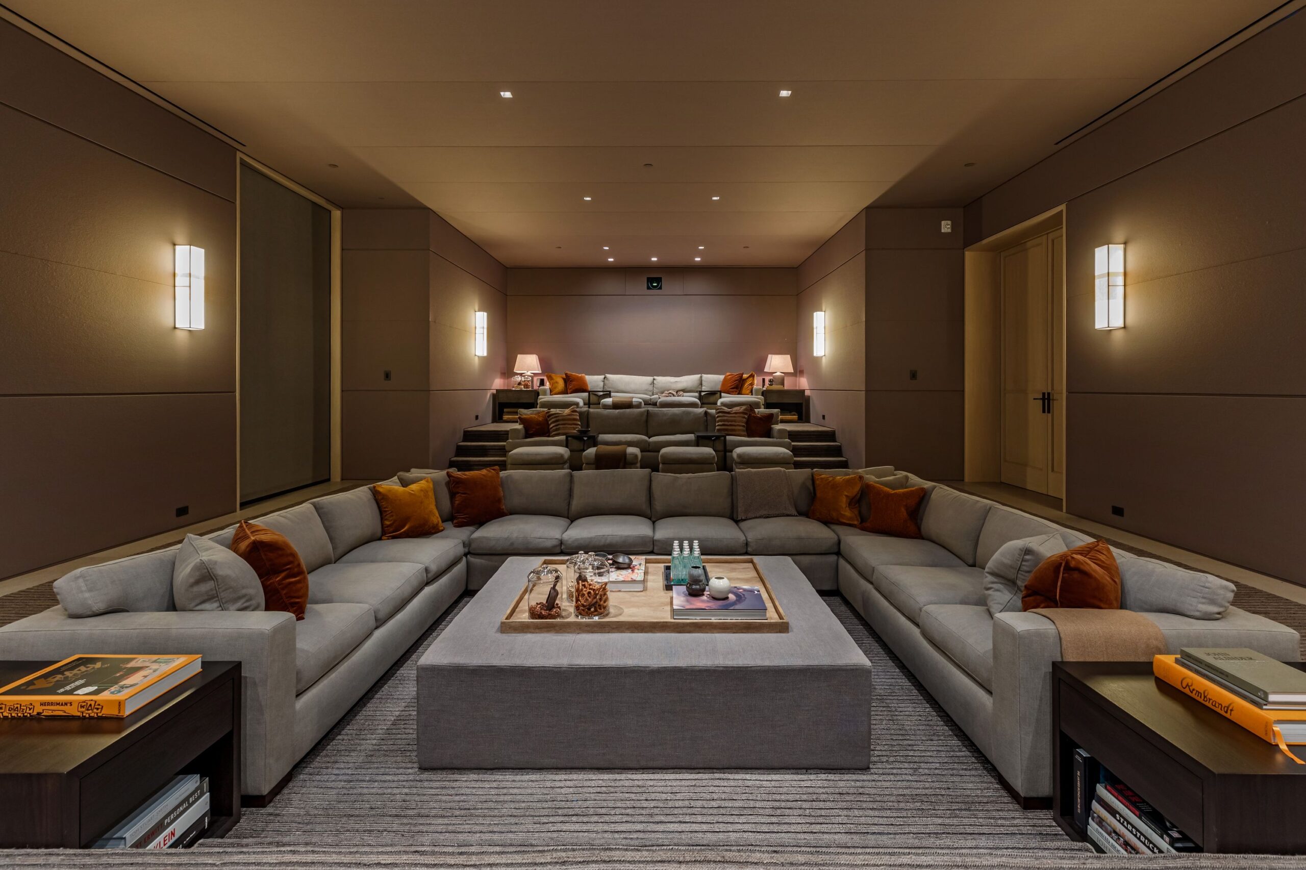 On the upper level, the primary bedroom wing comprises not only the primary bedroom but separate bathrooms and dressing rooms, and a study that can be isolated from the rest of the suite by a discreet pocket door system.