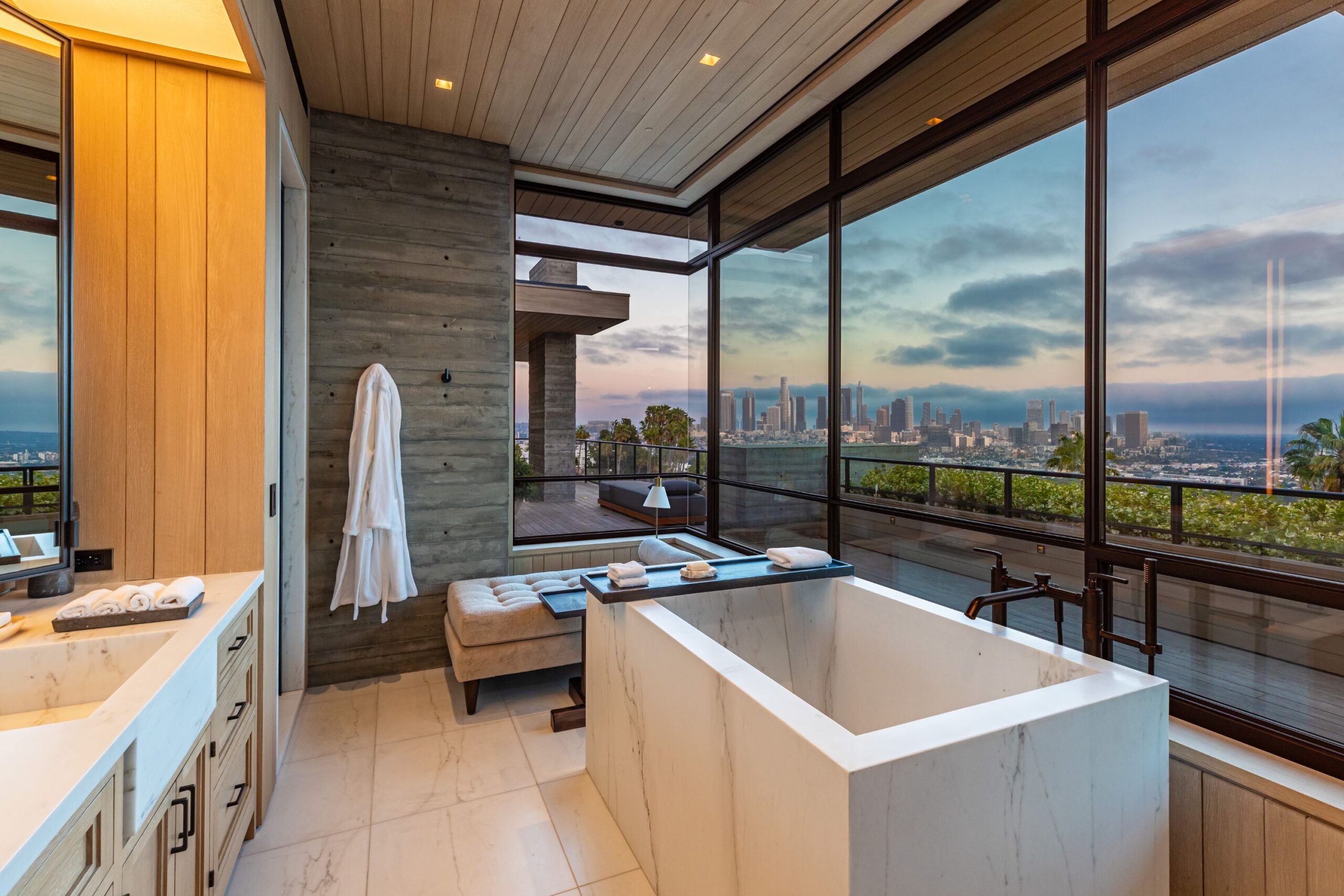 On entering, to the east is a luxurious study and to the west, an open living room with fireplace and views across the city that flows into the dining room and on to the kitchen and family room, where floor to ceiling glass sliding doors open seamlessly connecting indoor and outdoor and framing wide urban vistas.