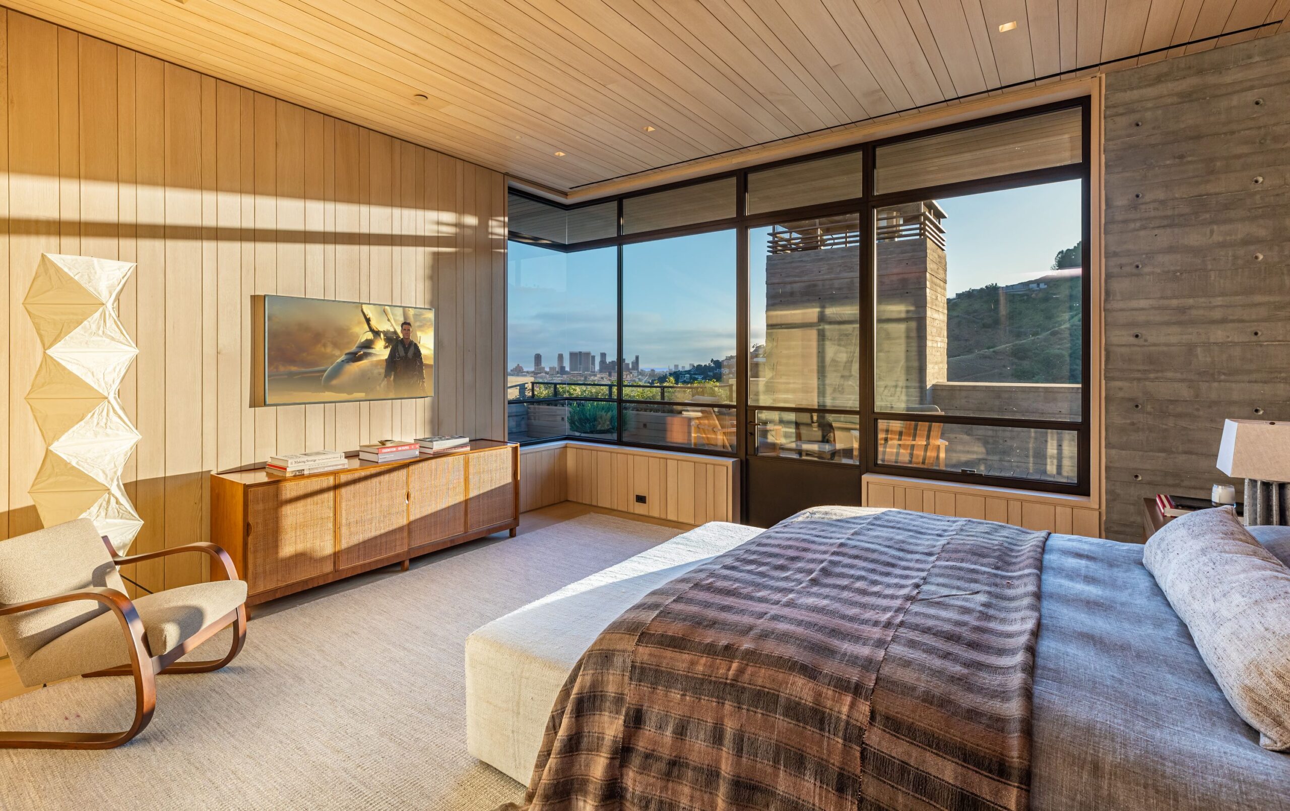 The form of the house follows a rigorous commitment to rich, organic materials and light. Grand outdoor decks provide seamless indoor and outdoor living. With expansive volumes over three floors, the tranquil and rooted hillside haven exudes a sense of balance, repose and a seamless connection to the natural landscape.