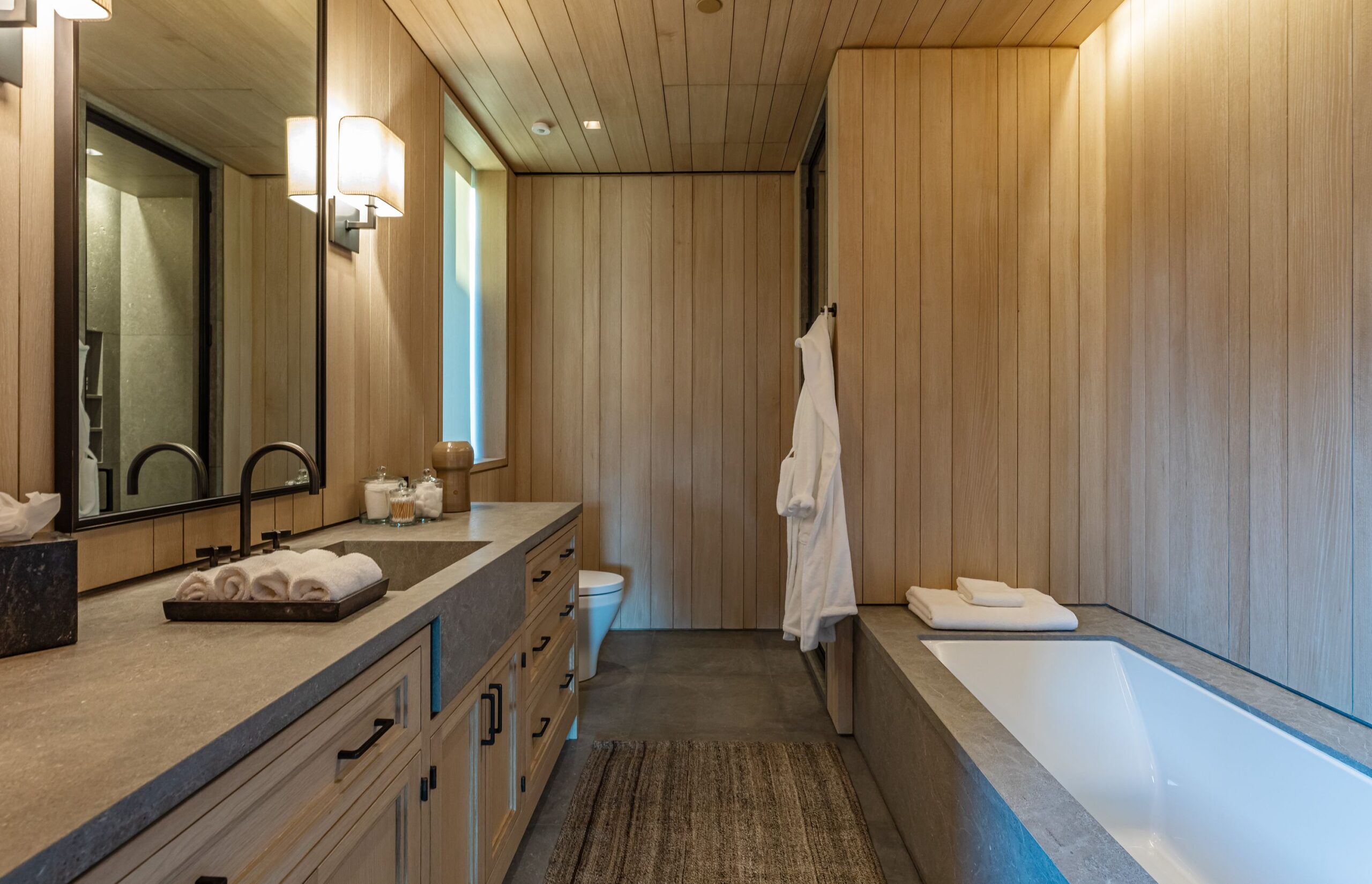 On the exterior, wire-brushed narrow Itauba deck boards and an elegant dark stone clad infinity pool and hot tub are flanked by a sunken fire pit and seating area. A stand-alone pool bar and lounge is connected by a covered breezeway adjacent to an outdoor seating area. Walkways and terraces continue around the house incorporating native oaks and under-storied plantings that are composed with elements of fire and water.