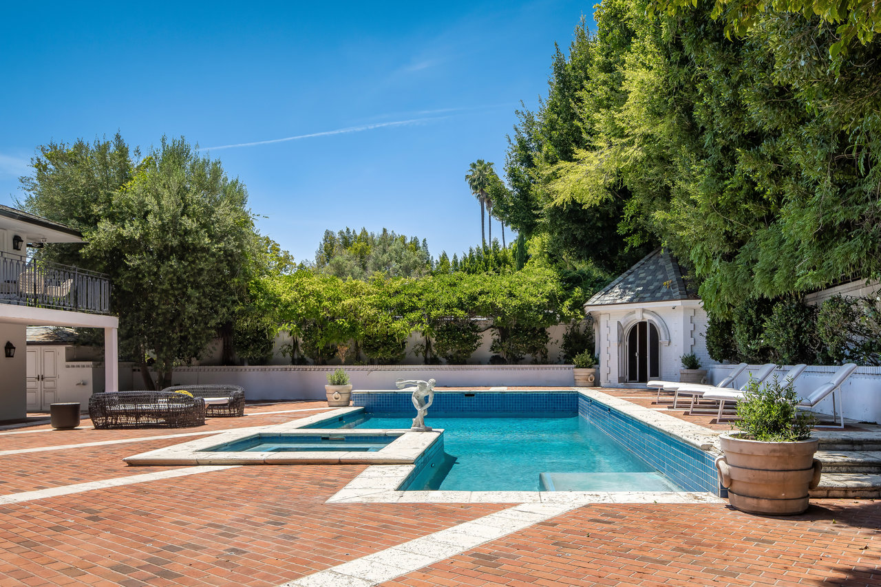 INCREDIBLE VALUE IN PRIME BEVERLY HILLS. North of Sunset, this gorgeous home has been completely remodeled and updated. All principal rooms open to the rear yard with an oversized pool, revival brick pavilion for dining, and stunning grounds for entertaining. The residence has over 8,000 square feet of natural light-filled, large scaled - high ceiling rooms, including a formal living room with a fireplace and a gourmet eat-in kitchen with marble slab counters. There are six spacious bedrooms, including a primary suite with double marble baths and grand and impressive walk-in closets. Positioned on over a half-acre lot, the home is hedged for privacy and includes a large gated motor court for ample off-street parking, an oversized four-car garage, a gym, and ample storage. Completely dialed in and best of Beverly Hills living.