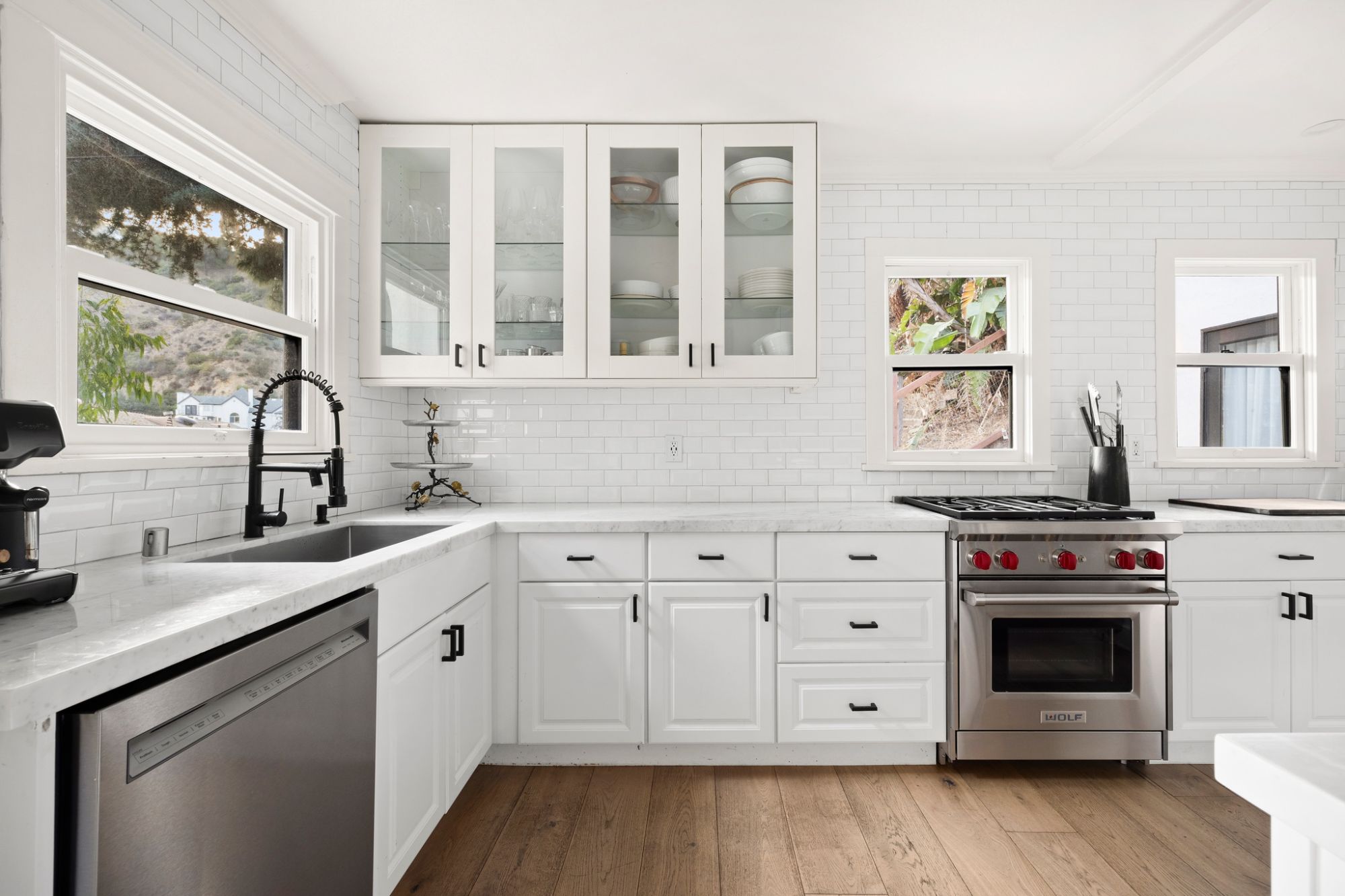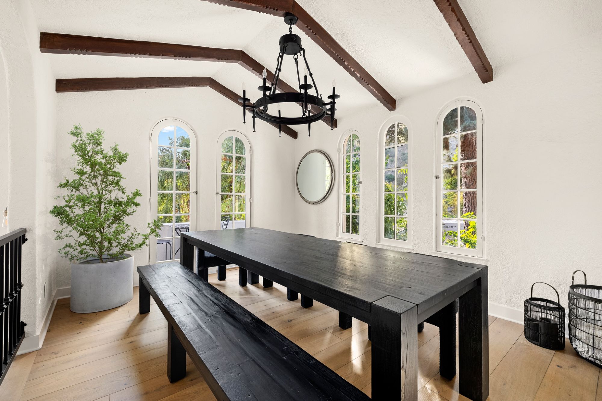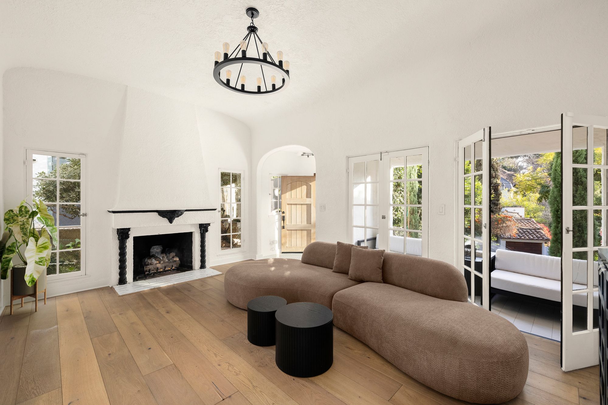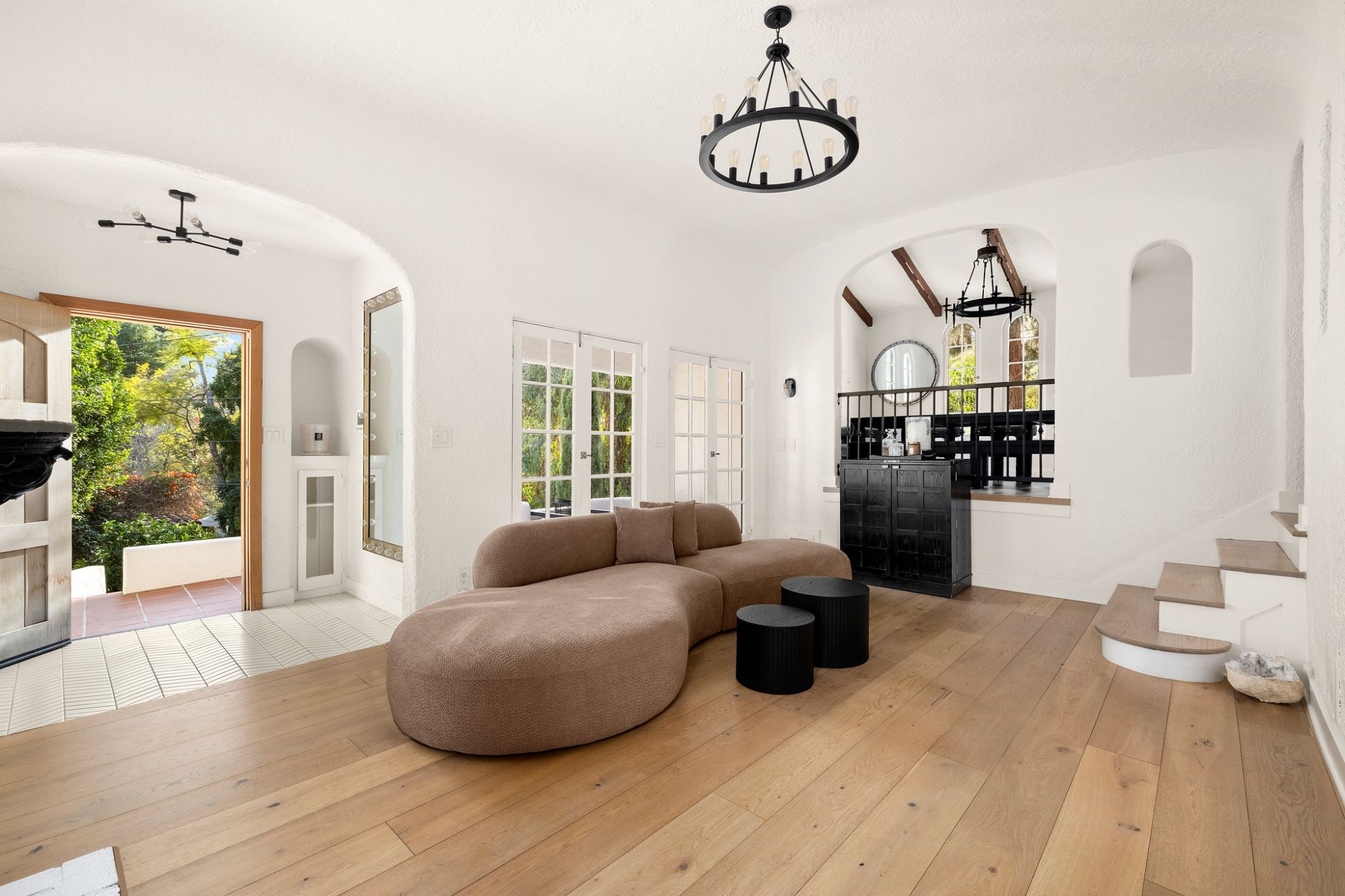 Tucked away on a quiet cul-de-sac, this 1923 Spanish Colonial with a Tuscany Flair blends timeless character with modern comforts, offering the perfect balance of privacy and convenience just moments from the Sunset Strip and iconic Chateau Marmont. Elevated above the street and framed by majestic trees, the home feels like a true retreat while staying connected to the vibrant heart of Los Angeles. Each of the three bedrooms opens directly to its own outdoor space, creating seamless indoor-outdoor living ideal for both quiet relaxation and inspired entertaining. Sunlight fills the interiors, highlighting original architectural details that harmonize beautifully with recent upgrades. Freshly painted inside and out, the home features restored wood floors, tile-accented foyers and terraces, and newly installed mahogany entry and garage doors that add warmth and craftsmanship. The updated kitchen is a chef's delight with marble countertops, a Wolf range, and a Sub-Zero refrigerator. The garage has been thoughtfully converted into a luxury gym, also perfect for a private office or studio. Modern upgrades, enhanced wiring, and a built-in gas grill make everyday living effortless. A terrace and private deck offer serene outdoor escapes with stunning sunset views, surrounded by trees that create a tranquil, retreat-like environment. Just minutes from world-class dining, entertainment, and culture, walking distance to the Sunset Strip. This rare offering captures the essence of Laurel Canyon living, a sanctuary of history, beauty, and comfort in one of Los Angeles's most iconic neighborhoods.