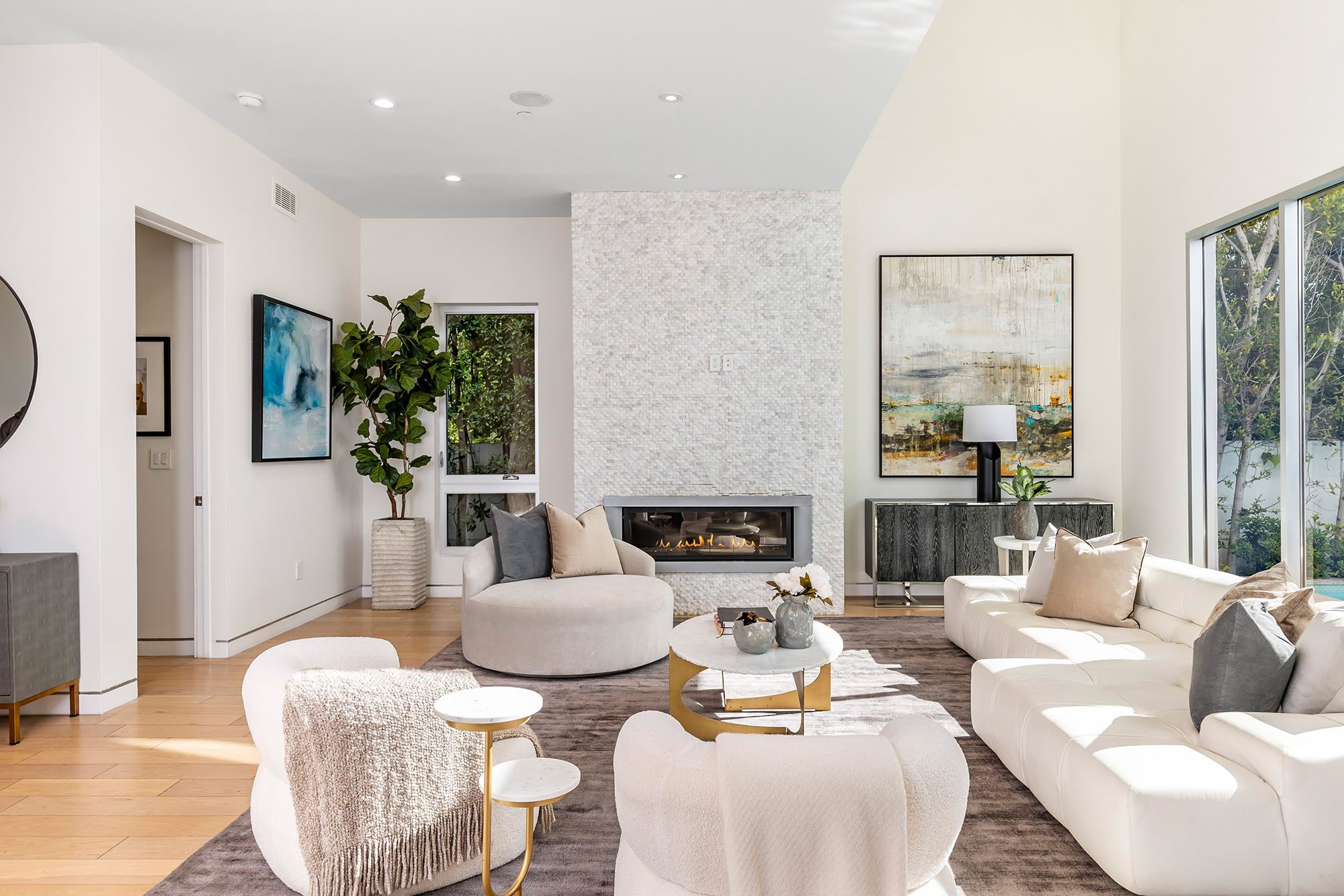 Gated and private architectural masterpiece in the highly sought-after enclave of West Hollywood. Sitting on one of the most desirable streets, beyond the custom gate, you're greeted by a 12 foot front door opening to a grand entry hall. The expansive floor plan offers 5 spacious en-suite bedrooms, 6 bathrooms, 4,062 sqft of living space, on a 6,552 sqft lot. The living room acts as a refreshing conversation area, defined by a cozy fireplace and wall to wall sliding glass doors, showcasing a serene backdrop of the resort like zero edge pool. Chef's kitchen highlighted by a massive center island with complimenting large dining counter, and top of the line Miele appliances, including espresso maker and camouflaged fridge/freezer combo. Seamlessly tying into and completing the dining experience, is an incredible dining area with views of the backyard and courtyard. Adjacent to the dining room are sliding glass doors creating an effortless indoor-outdoor flow. The entertainer's backyard showcases custom teak wood decking spanning the entire yard. Heated zero edge pool and over-sized spa, with water fall and mood lighting make for an entertainers dream. Step away from the pool and further into the backyard to find the grassed and tastefully shaded dining and bbq area, perfect for hosting summer gatherings. 22 foot ceilings lead you to the upper wing, via stunning floating staircase, highlighted by a soaring floor to ceiling skylight window. Primary-retreat is completed with fireplace, 2 private balconies, large walk-in closet, and designer spa-like bathroom with custom tub and large shower. 3 other over sized, en-suite bedrooms, each with private balconies are steps away from the incredible primary suite. Minutes from the famed Design District, The Grove, Original Farmer's Market, Beverly Center, Pacific Design Center, sensational nightlife, abundance of upscale shops and an impressive array of fine dining!