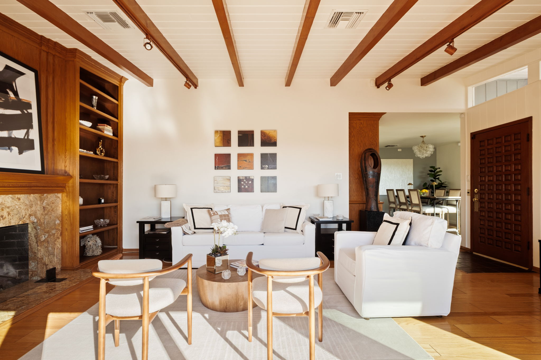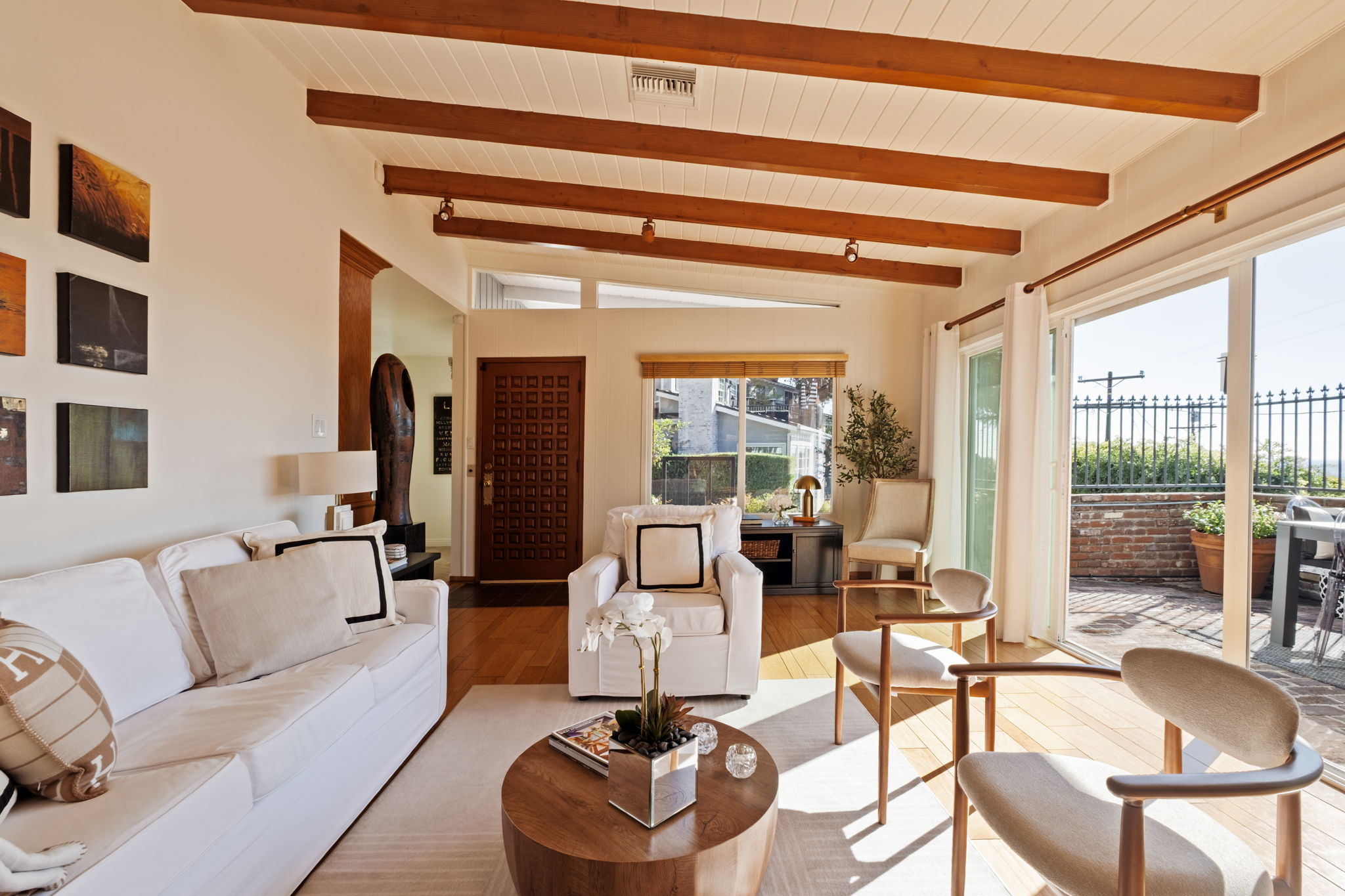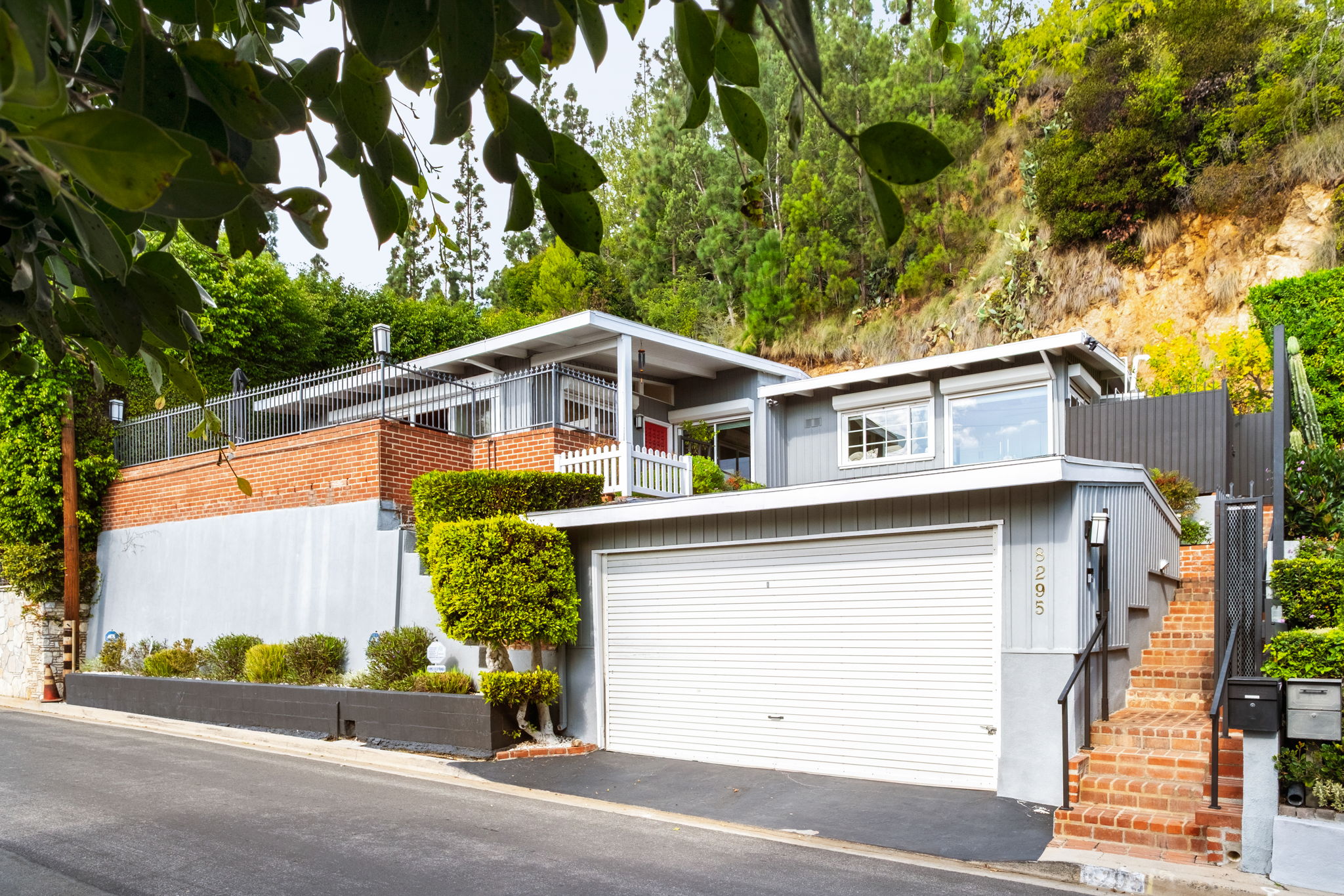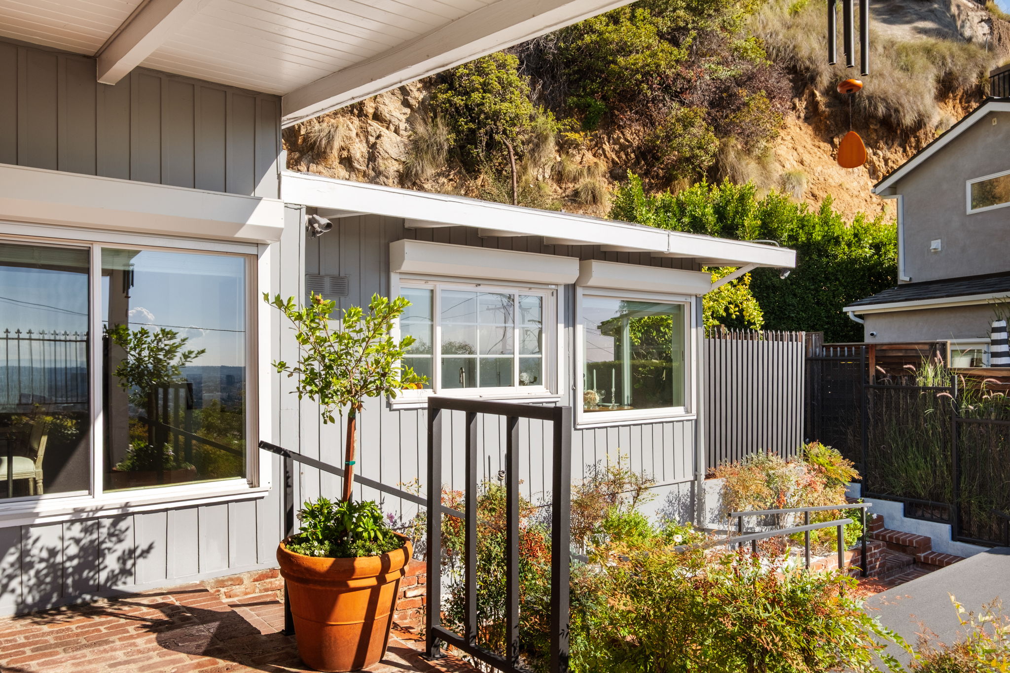 A Mid-Century turnkey gem perched above one of the most desirable blocks in the Hollywood Hills, this residence offers gated entry, elevated privacy, and endless views stretching from Catalina Island to Downtown. Sunlit interiors, timeless design, and a seamless connection to the outdoors create an atmosphere that is both warm and sophisticated. Expansive floor-to-ceiling windows and airy, front-facing brick patios showcase sweeping city vistas and, on clear days, the ocean beyond. Outdoor spaces wrap the property, providing a variety of settings for entertaining. Exterior board-and-batten siding and a hand-carved mid-century front door set an inviting tone. Inside, the effortless floor plan is bright and welcoming, post and beam ceilings enhance its open, airy feel, complemented by rich wood accents. Three generous bedrooms include a primary suite with both walk-in and sliding-door closets; this suite, along with a second bedroom, opens onto private, secluded patios. A two-car garage and ample street parking complete the offering. Just minutes from The Chateau Marmont, The Sunset Tower Hotel and Sunset Plaza, this home delivers an authentic and elevated slice of iconic LA living in the Hollywood Hills.