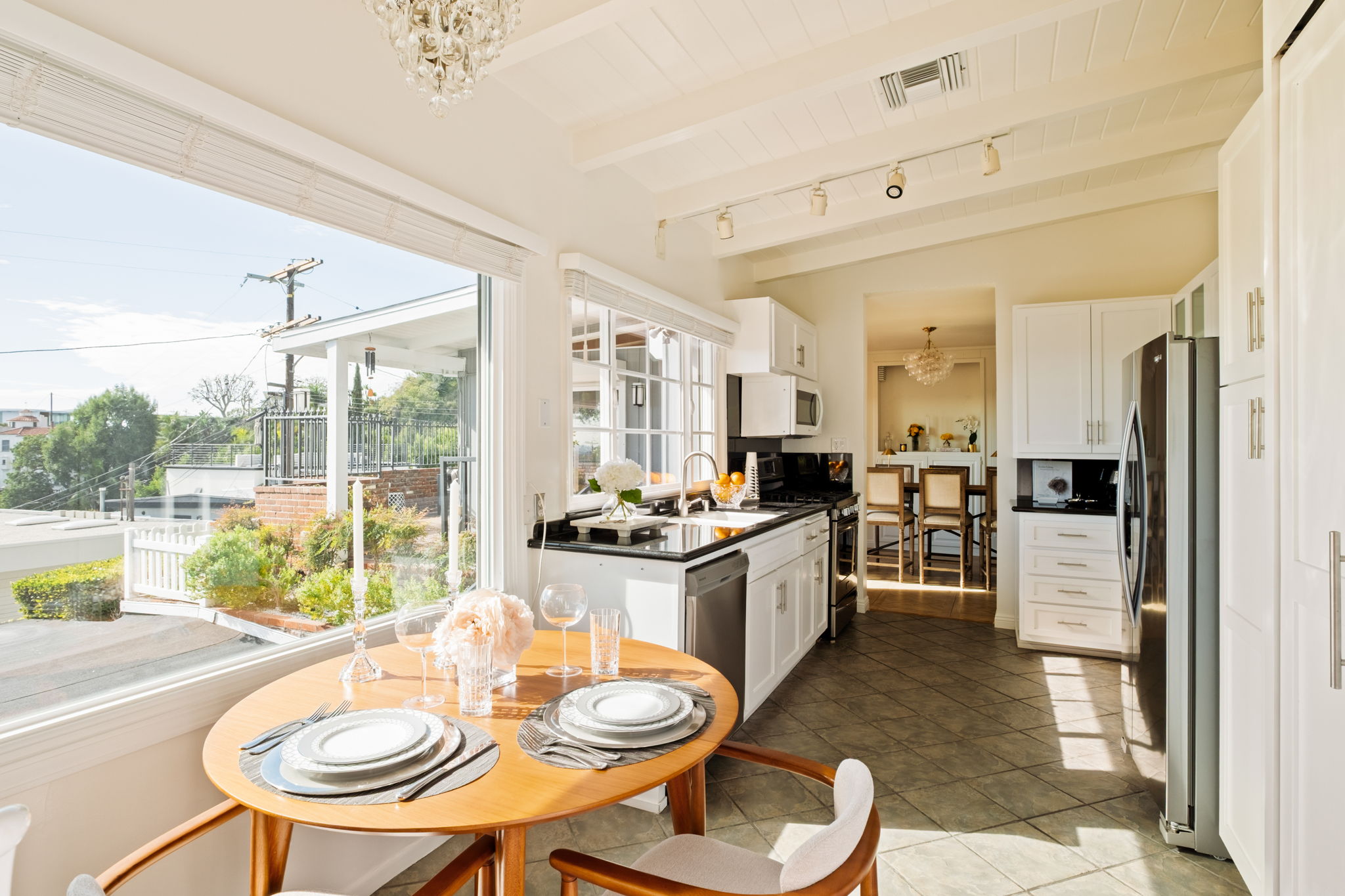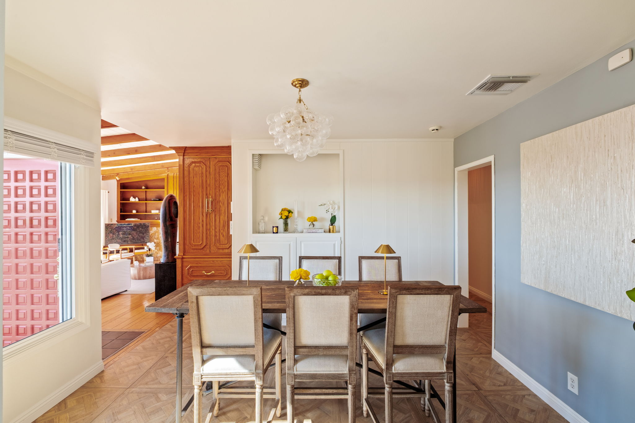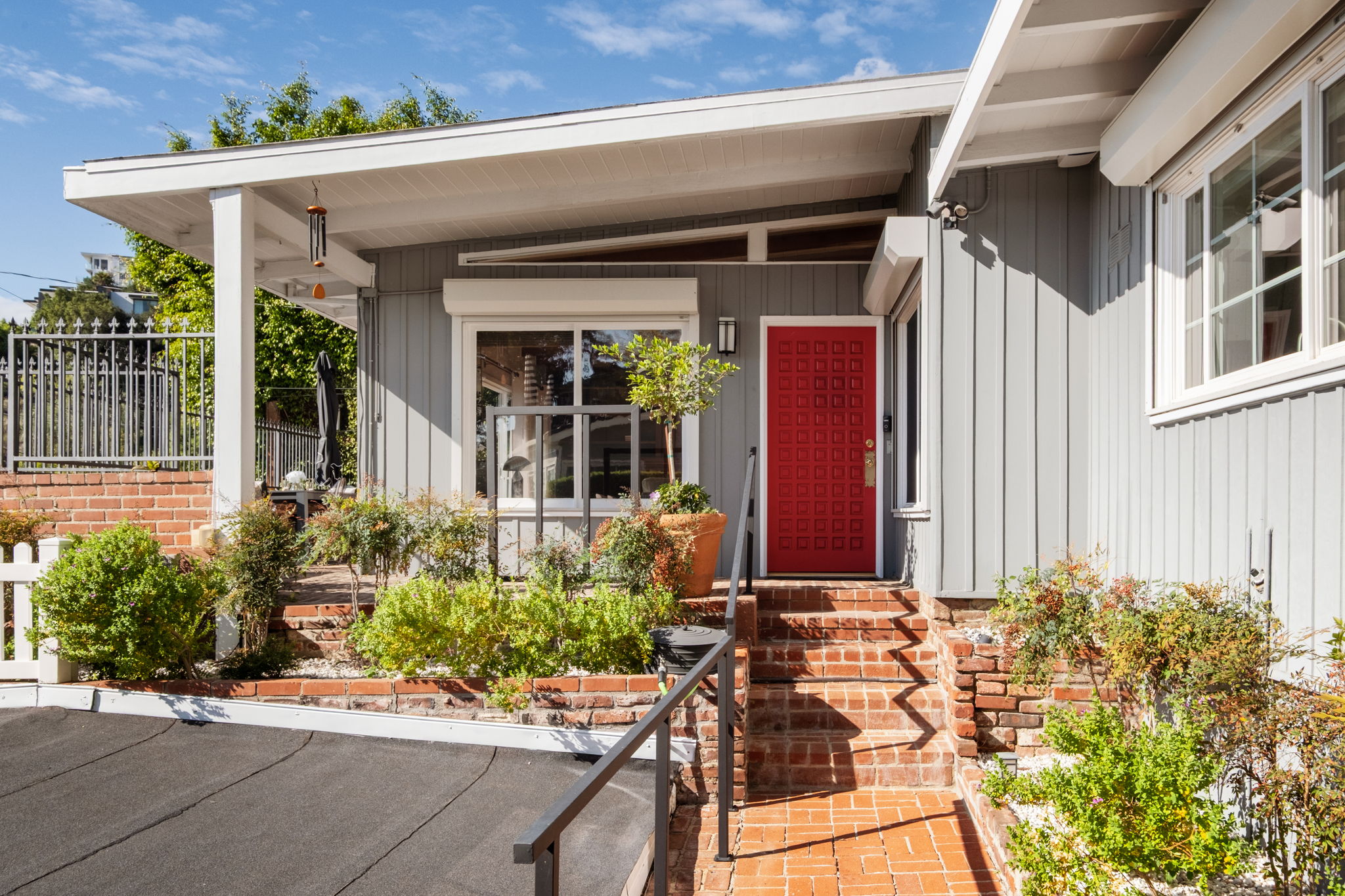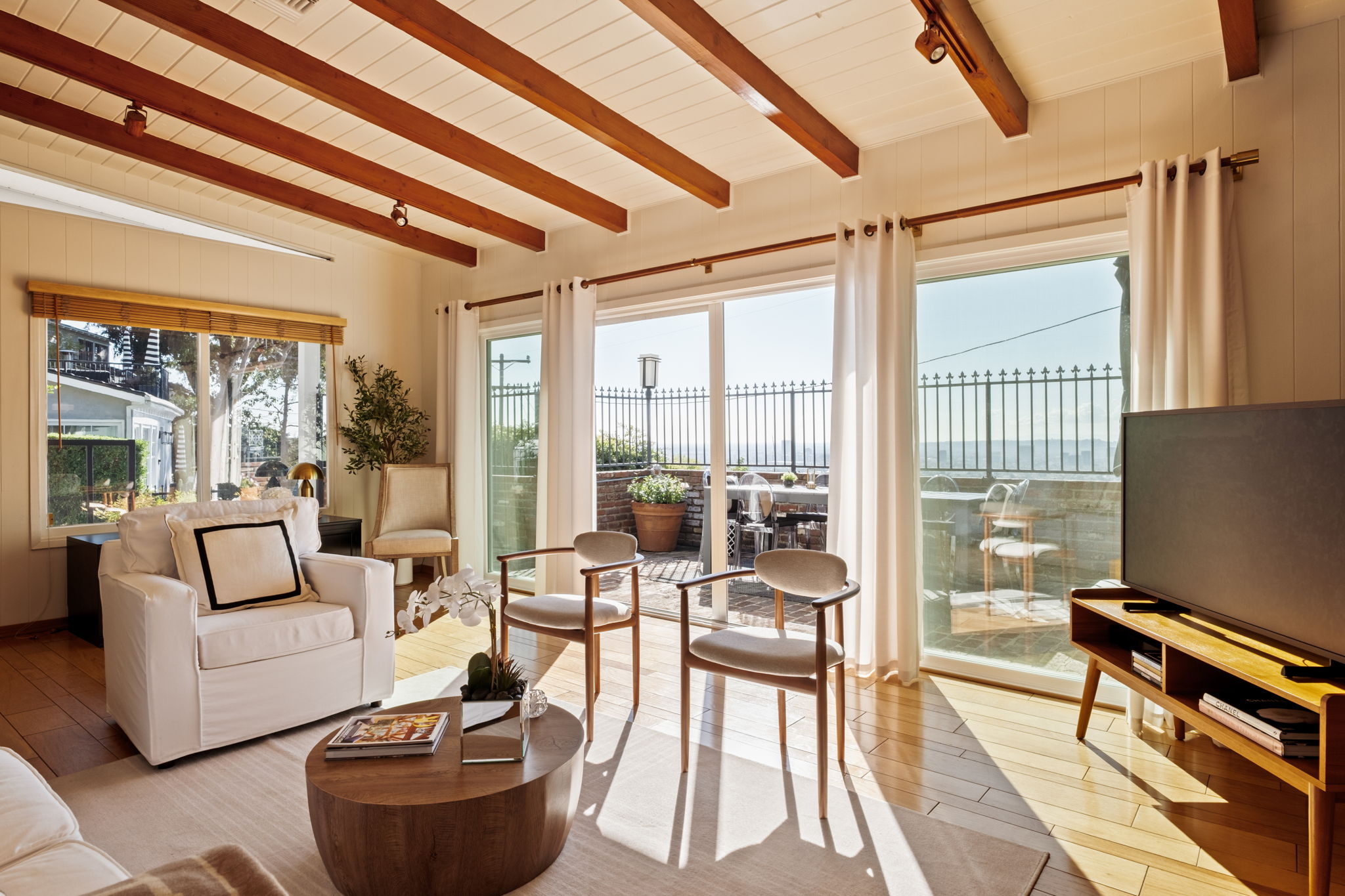 A Mid-Century turnkey gem perched above one of the most desirable blocks in the Hollywood Hills, this residence offers gated entry, elevated privacy, and endless views stretching from Catalina Island to Downtown. Sunlit interiors, timeless design, and a seamless connection to the outdoors create an atmosphere that is both warm and sophisticated. Expansive floor-to-ceiling windows and airy, front-facing brick patios showcase sweeping city vistas and, on clear days, the ocean beyond. Outdoor spaces wrap the property, providing a variety of settings for entertaining. Exterior board-and-batten siding and a hand-carved mid-century front door set an inviting tone. Inside, the effortless floor plan is bright and welcoming, post and beam ceilings enhance its open, airy feel, complemented by rich wood accents. Three generous bedrooms include a primary suite with both walk-in and sliding-door closets; this suite, along with a second bedroom, opens onto private, secluded patios. A two-car garage and ample street parking complete the offering. Just minutes from The Chateau Marmont, The Sunset Tower Hotel and Sunset Plaza, this home delivers an authentic and elevated slice of iconic LA living in the Hollywood Hills.