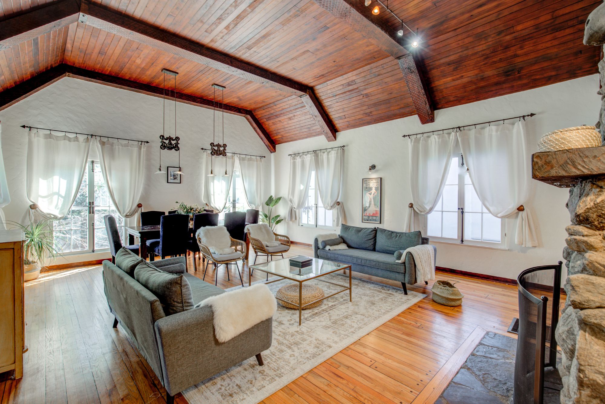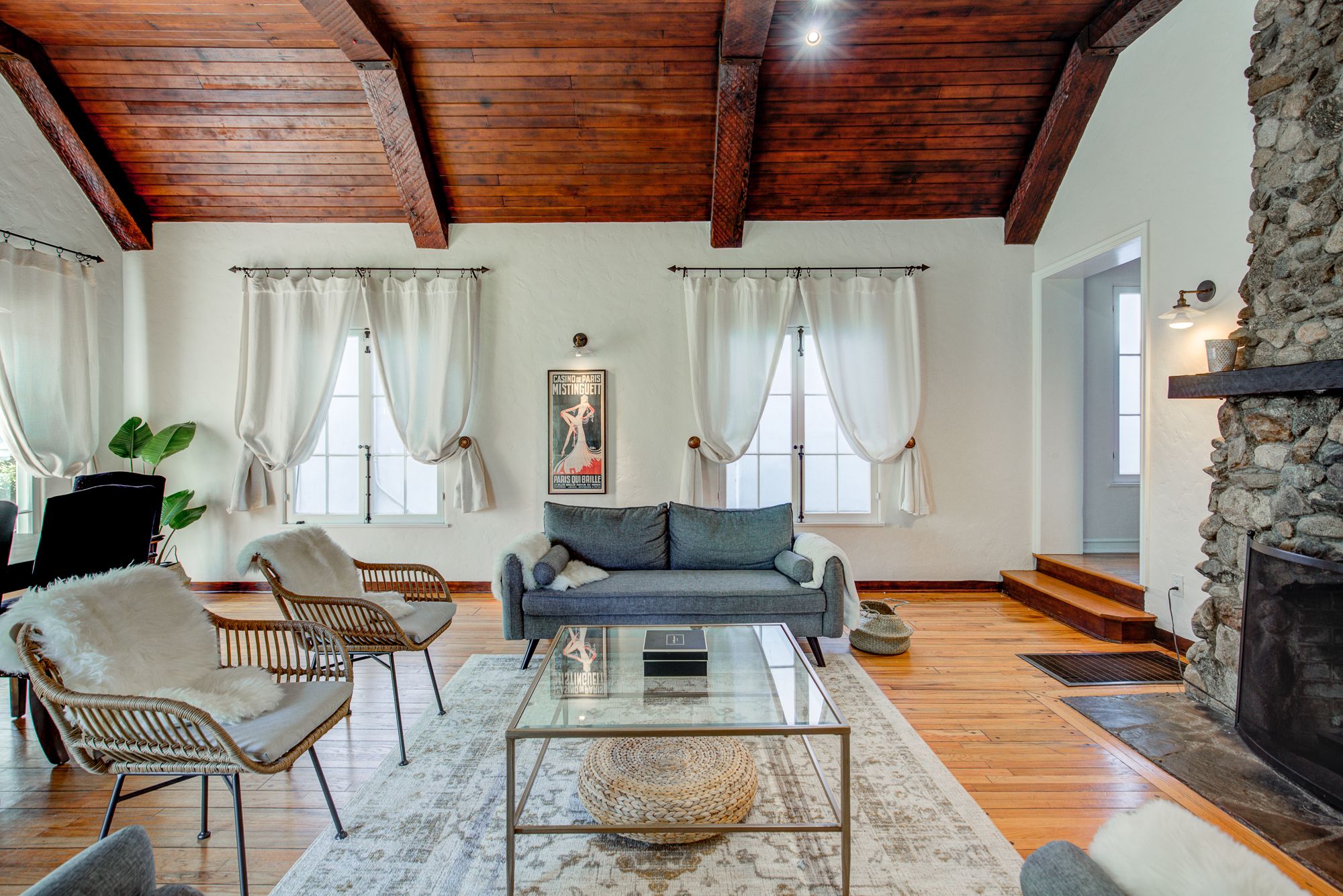 Nestled within the famed Laurel Canyon and the award-winning Wonderland School District, this enchanting storybook home boasts a captivating past as a prohibition-era speakeasy. Prepare to be charmed by the expansive great room, adorned with soaring timber ceilings and a towering dual-sided river rock fireplace serving as the focal points. The fully updated kitchen fitted with high-end stainless steel appliances and heated floors, promises a delightful cooking experience. Descend to the lower level and discover the primary suite with office or studio space complemented by a brick fireplace offering tranquility and warmth. Make your way outside and be embraced by the lush garden dotted with citrus trees and graced by the soothing melody of a fountain. A dedicated al fresco dining area and a rejuvenating hot tub complete this gated outdoor sanctuary.