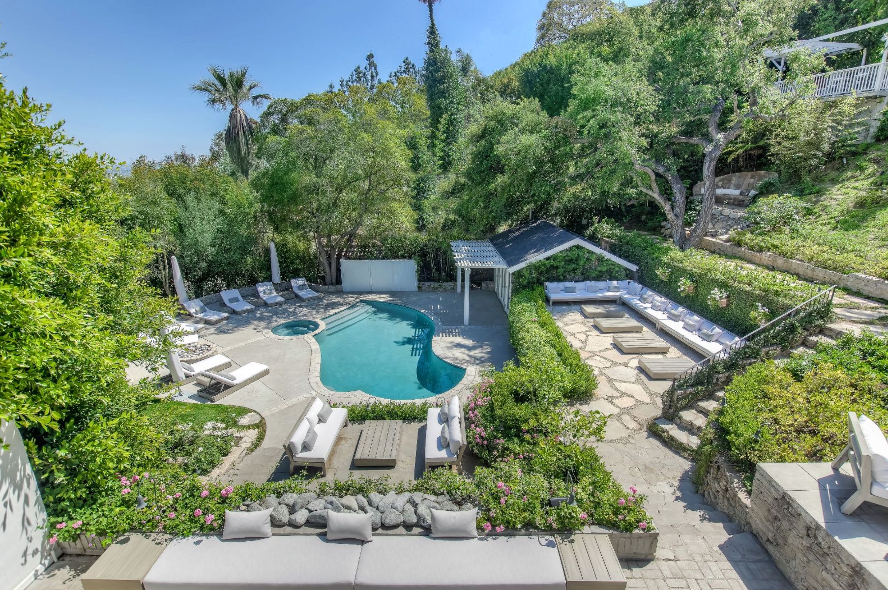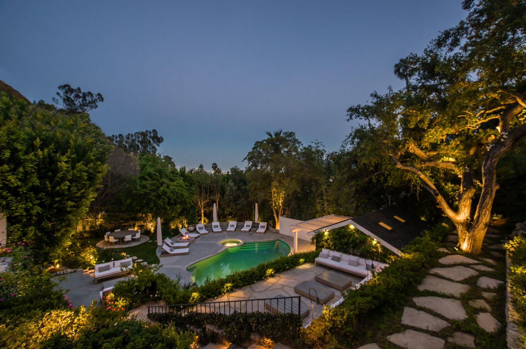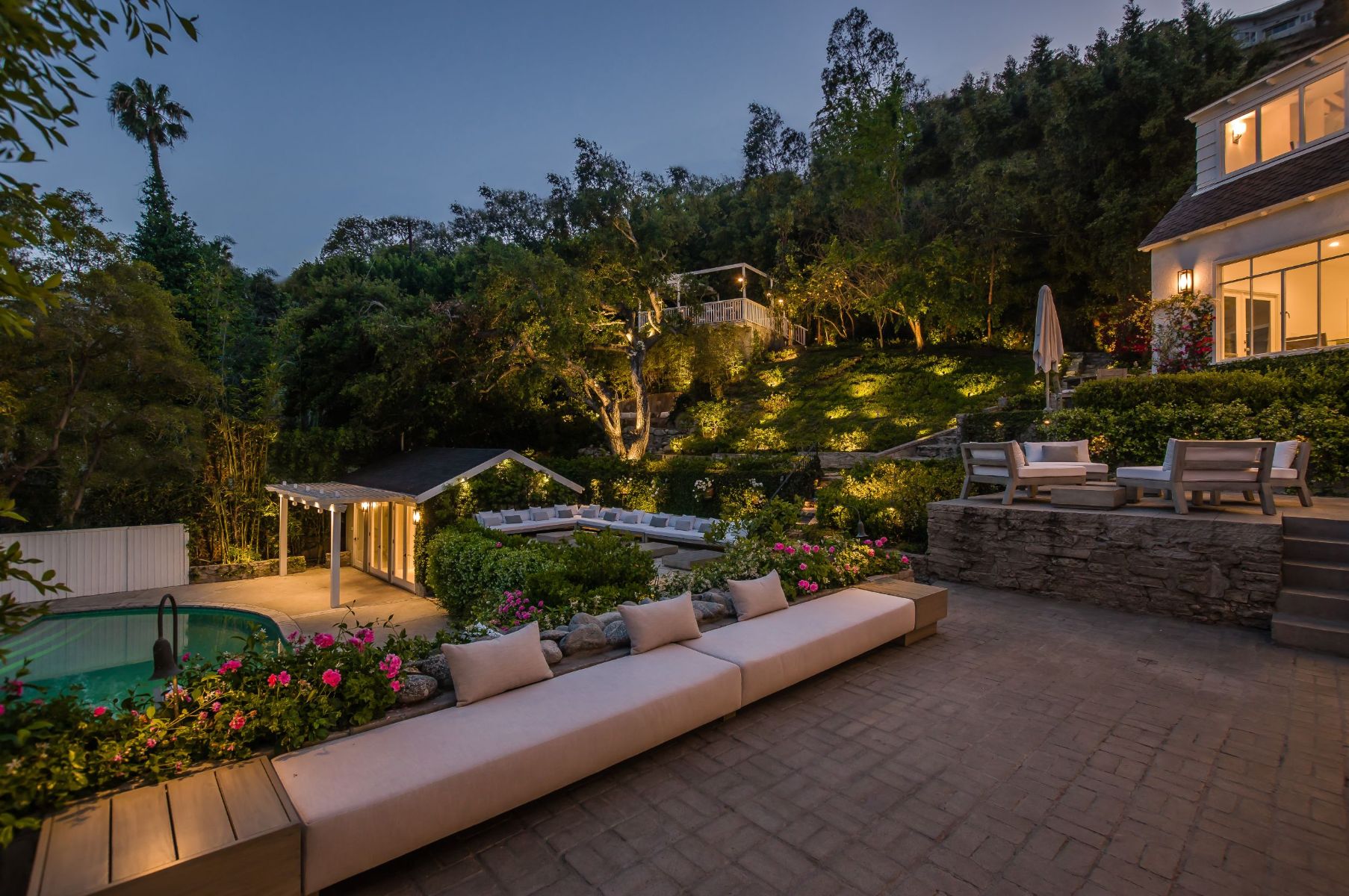 The Kingston Estate is located just above the world famous Sunset Strip, known for the finest entertainment & dining LA has to offer. This once in a lifetime property combines 3 legal lots to form a magical hotel-style residence. You'll feel the magic the second you enter through the gates to an incredible indoor-outdoor floor plan with a rich, fresh vibe that is second to none. Entertain guests with ease in your private backyard paradise, which can seat an excess of 90 people, including pool, spa, BBQ and upper deck view dining. Surrounded by lush landscaping, the guesthouse includes bedroom, kitchenette & full bath. Designed for a fun, relaxed, sophisticated lifestyle; this park-like setting is out of a movie. Complete with its own wine tasting/bar room lounge to service the estate in grand fashion. Features a double-height living room, office, 8+ car motor court/garage and spectacular master suite with views stretching across Downtown LA.