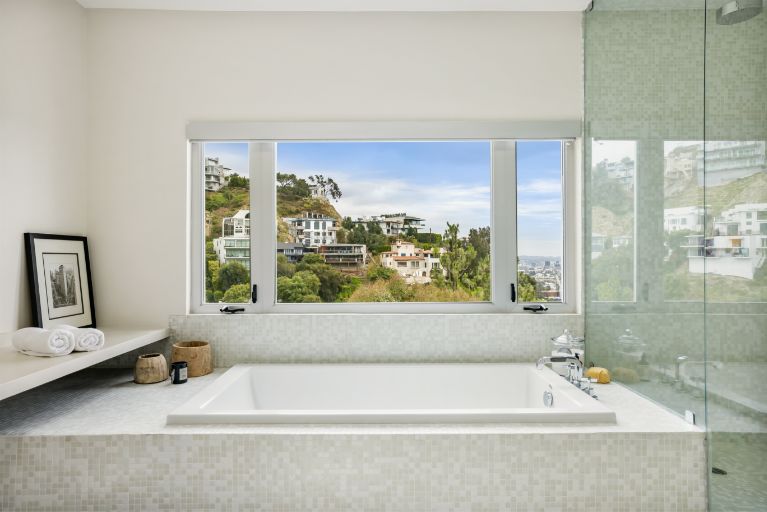 Set behind a gated driveway in the Hollywood Hills, this completely move-in home offers panoramic views from DTLA to Century City, sleek modern finishes, and a swimming pool surrounded by lush greenery for ultimate privacy. The approximately 2,761 sqft 3 bed and 4 bath home features a primary suite with floor-to-ceiling windows, a wood-burning fireplace, and an expansive deck. The kitchen is adorned with Viking and Sub-Zero appliances and a separate wine-storage. The lower level includes a secondary living room with sliding doors that open to the outdoor space and 2 en-suite guest bedrooms. Additional amenities include Lutron lights, multiple exterior security cameras, 3 fireplaces, and a 2-car garage with driveway parking for another 2.