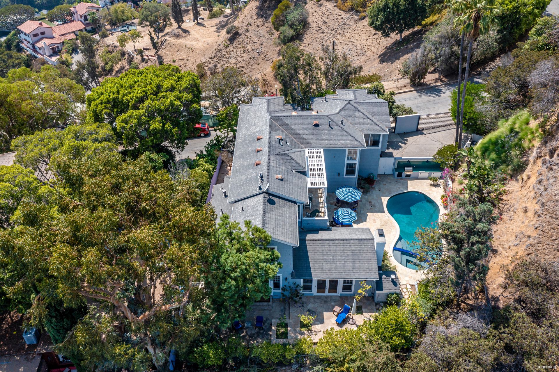 Behind gates on a flat pad sits a little bit of the Hamptons in the Hollywood Hills designed by award-winning architect Steven Ehrlich. This 4000 sq ft plus home is four bedroom and three-and-a-half baths. The first floor a living room with a beamed cathedral ceiling and fireplace, an eat in kitchen, family room, dining room and large private bedroom and bath with separate entrance. Upstairs a huge main bedroom and bath are complimented by an additional 2 bedrooms, a full bath and laundry room. All with great privacy above the Sunset Strip.