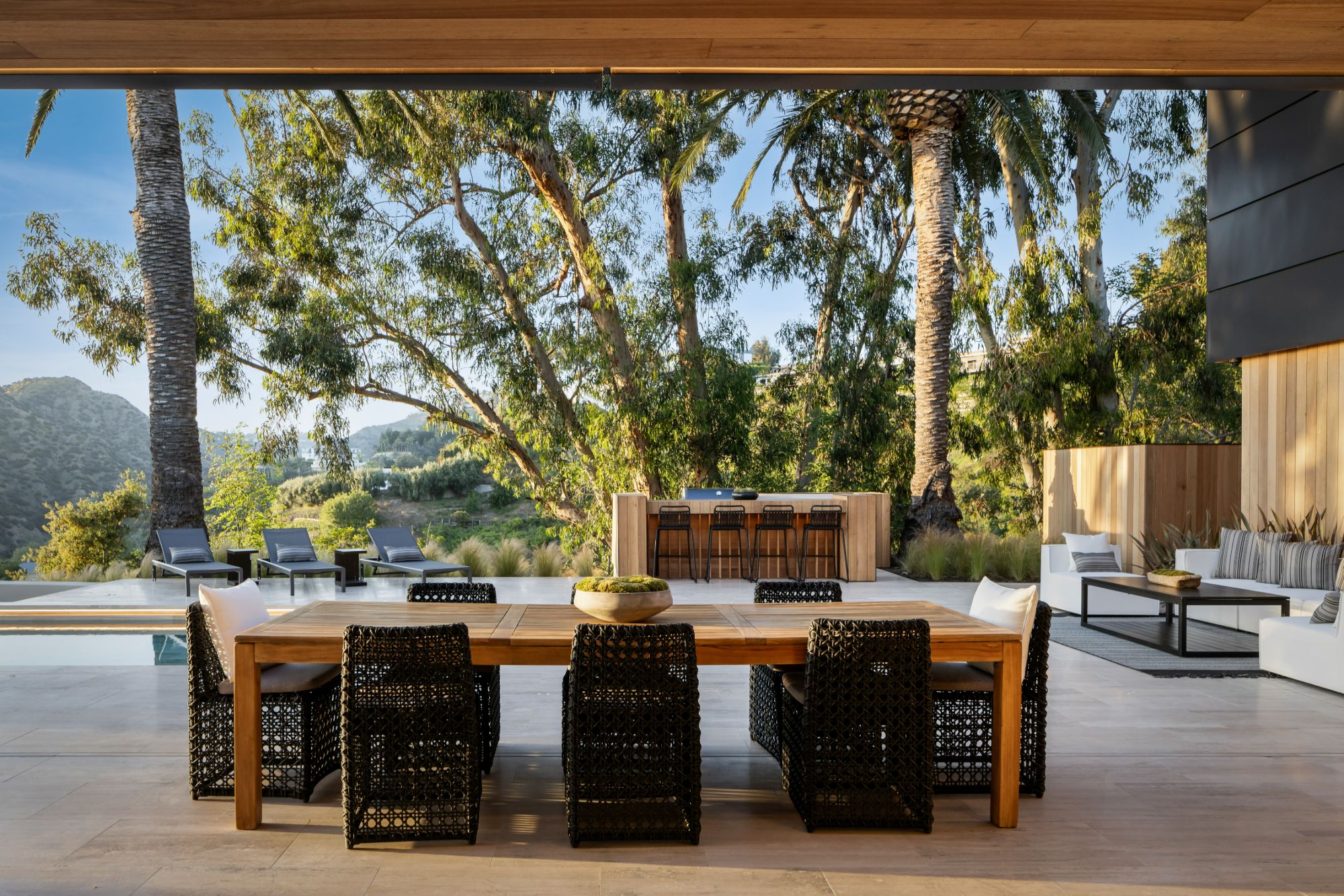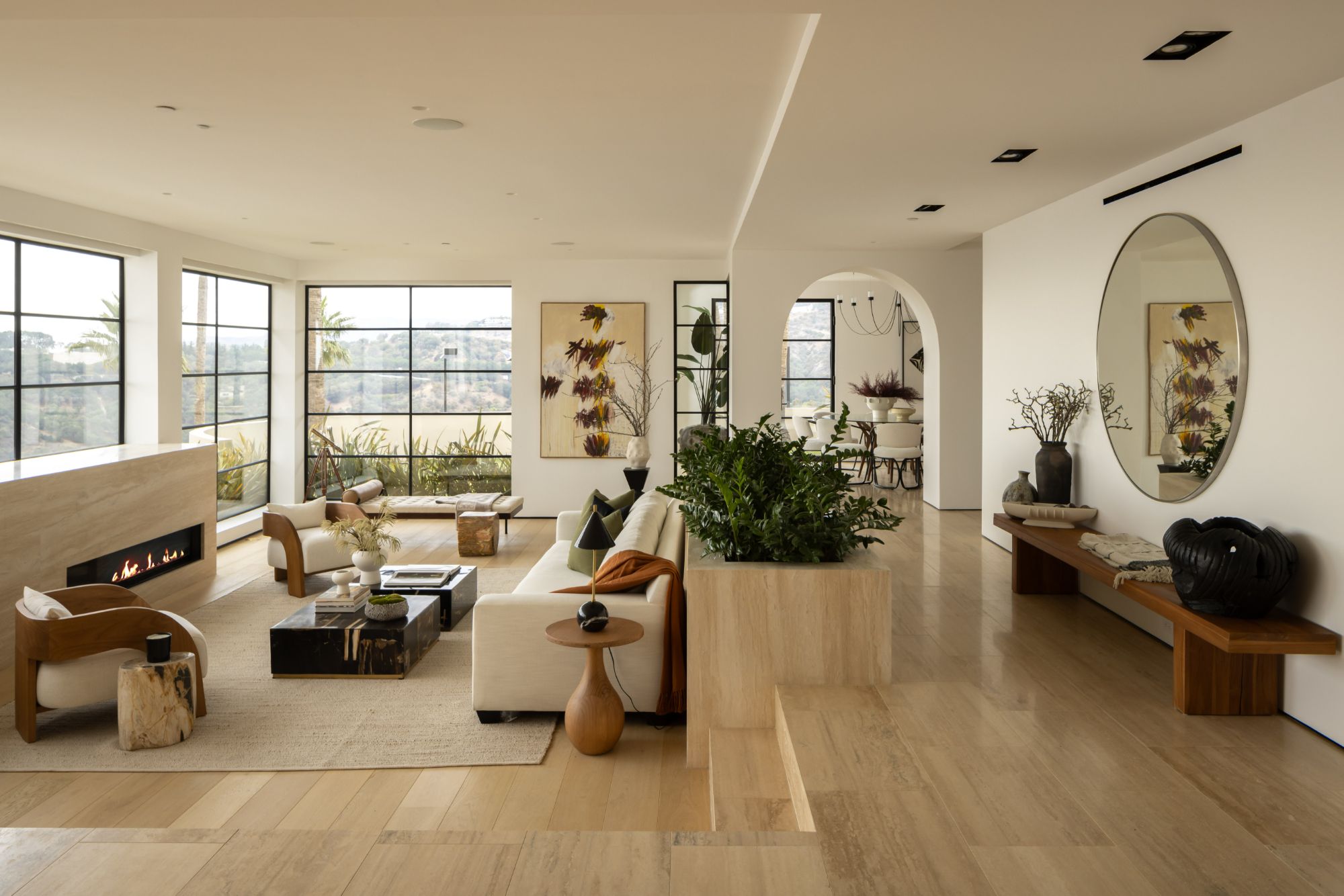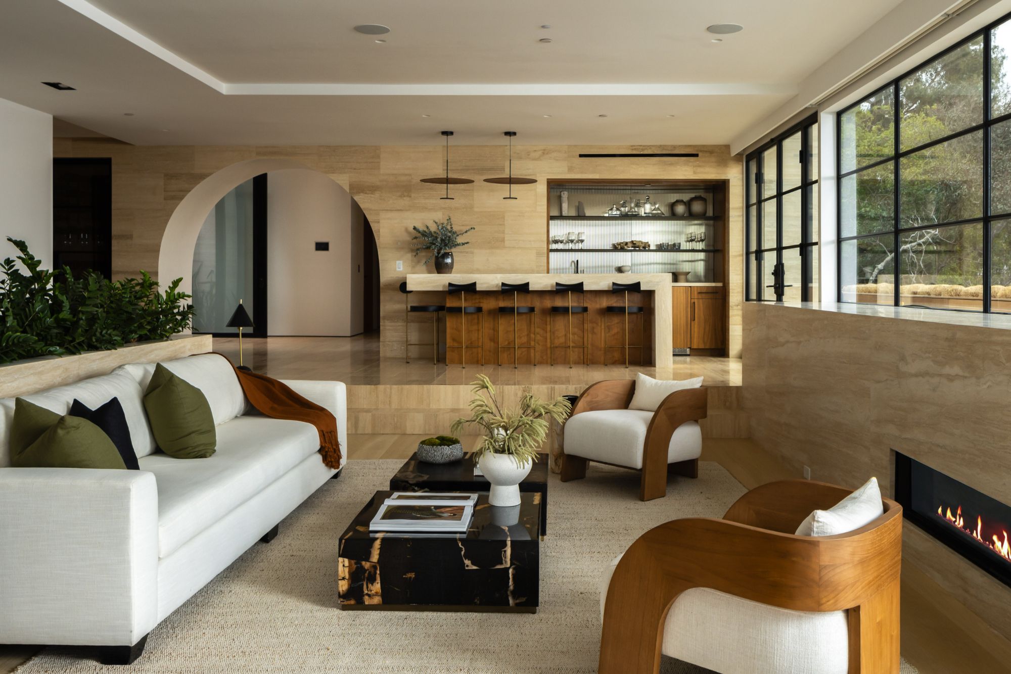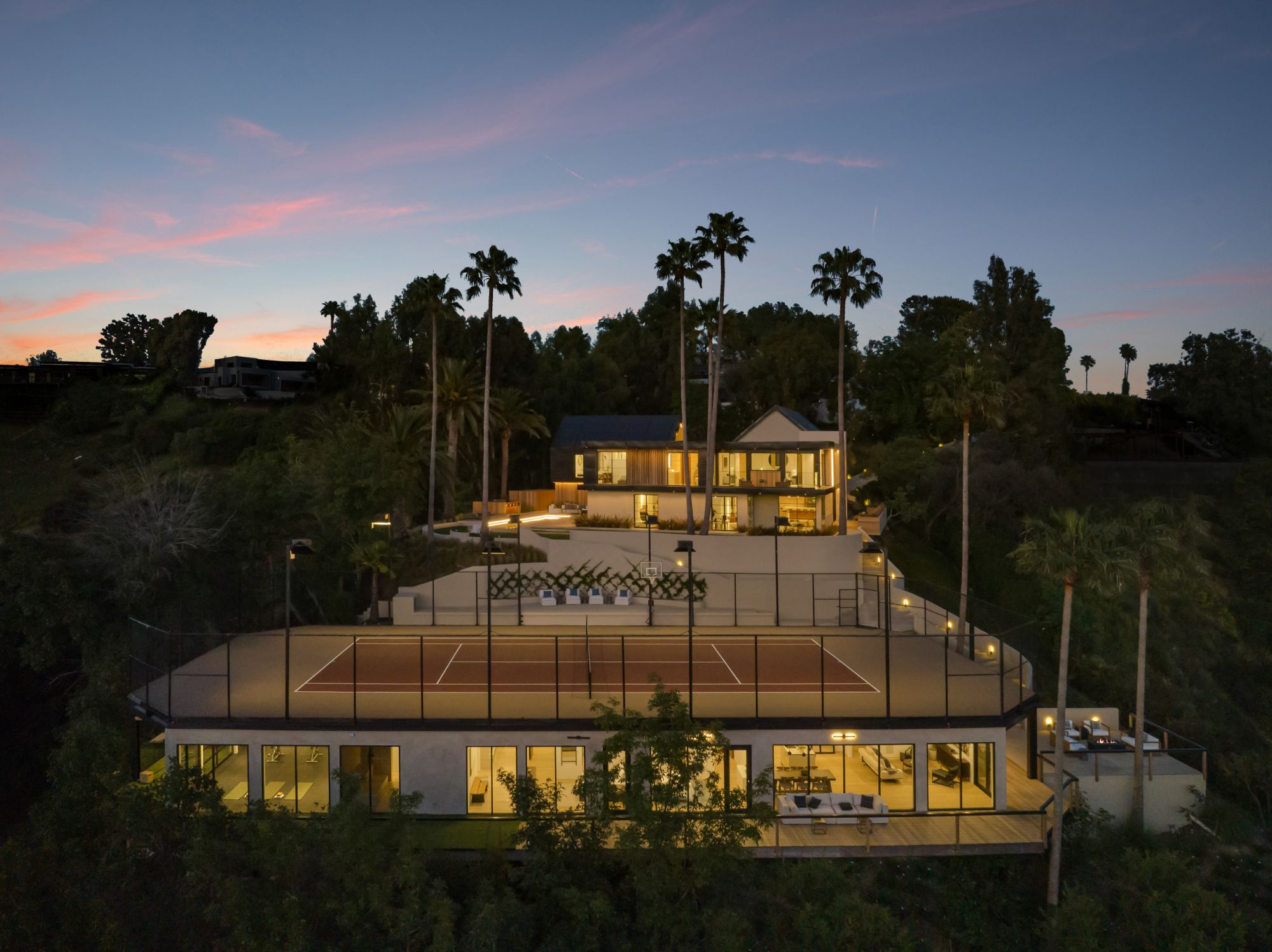 Introducing FRAME, an architectural compound by AADS, sited on over 3.5 lush acres in lower Bel Air with 270-degree Ocean, City, and Getty views. Gated and private, a 250-foot driveway leads to an oversized motor court, revealing a dramatic Scandinavian-inspired gabled roofline and exterior with resort-like grounds. A procession of pepper trees forms a natural colonnade, creating a moment of transition. Inside, a soaring 30-foot atrium introduces volume, crowned by a custom concentric Bover chandelier. Double arches present a deliberate pause before leading to the sunken living room, where wood floors seamlessly meet a sculptural travertine fireplace with a discreet built-in motorized TV. The effect is one of intimacy within expansiveness, a rare and studied composition in a home of this scale. A custom planter brimming with ZZ flora acts as an organic partition and softens the division between inside and out, a subtle nod to the estate's biophilic design. The Molteni & C Dada kitchen, a triumph of Italian craftsmanship, features book-matched Calacatta marble, a PITT stovetop, double islands offset rather than stacked, breaking convention for a more sculptural form, and multiple seating areas. Beyond, a fully appointed chef's pantry awaits, a complement ideal for dinner parties and events. The bar area pairs travertine surfaces with open shelving framed by smoked ribbed mirrored glass, recessed walnut panels, and LED-lit shelving designed to reveal rather than display. Adjacent lies a temperature-controlled wine closet, a quiet ode to oenophiles, with space for 190 bottles to age gracefully. Upstairs, tranquility reigns. Each of the home's en-suite bedrooms was designed to experience a symphony of natural light and the surrounding landscaping. The primary suite, with its center-pivot windows and private balcony, feels like a gallery to the skyline. Dual bathrooms, clad in floor-to-ceiling travertine slabs, evoke the monolithic beauty of the Getty; their floating vanities, designed as seamless extensions, elevate everyday rituals into luxurious indulgences.The detached guest house, spanning over 3,400 square feet, is a dedicated wellness sanctuary. Two south-facing en-suite bedrooms capture uninterrupted sunlight, while private access leads to a glass-enclosed fitness pavilion with a gym, sauna, steam room, and massage suite, all opening to a wraparound terrace overlooking the storied Moraga vineyards. Outdoors, the landscape is composed with the same precision as the interiorsa travertine infinity pool extends toward the horizon, while a private tennis/basketball court, large grass lawn, BBQ, and fireplace complete the grounds. At the estate's edge, a 40-foot mahogany hangar garage door, engineered with a moment frame structure, creates a seamless, uninterrupted facade. FRAME, located at 879 Linda Flora Drive, offers an incomparable blend of thoughtful design, organic elements, and architectural innovation. Every detail has been meticulously composed, creating a legacy of design and aspiration in the hills of Bel Air.