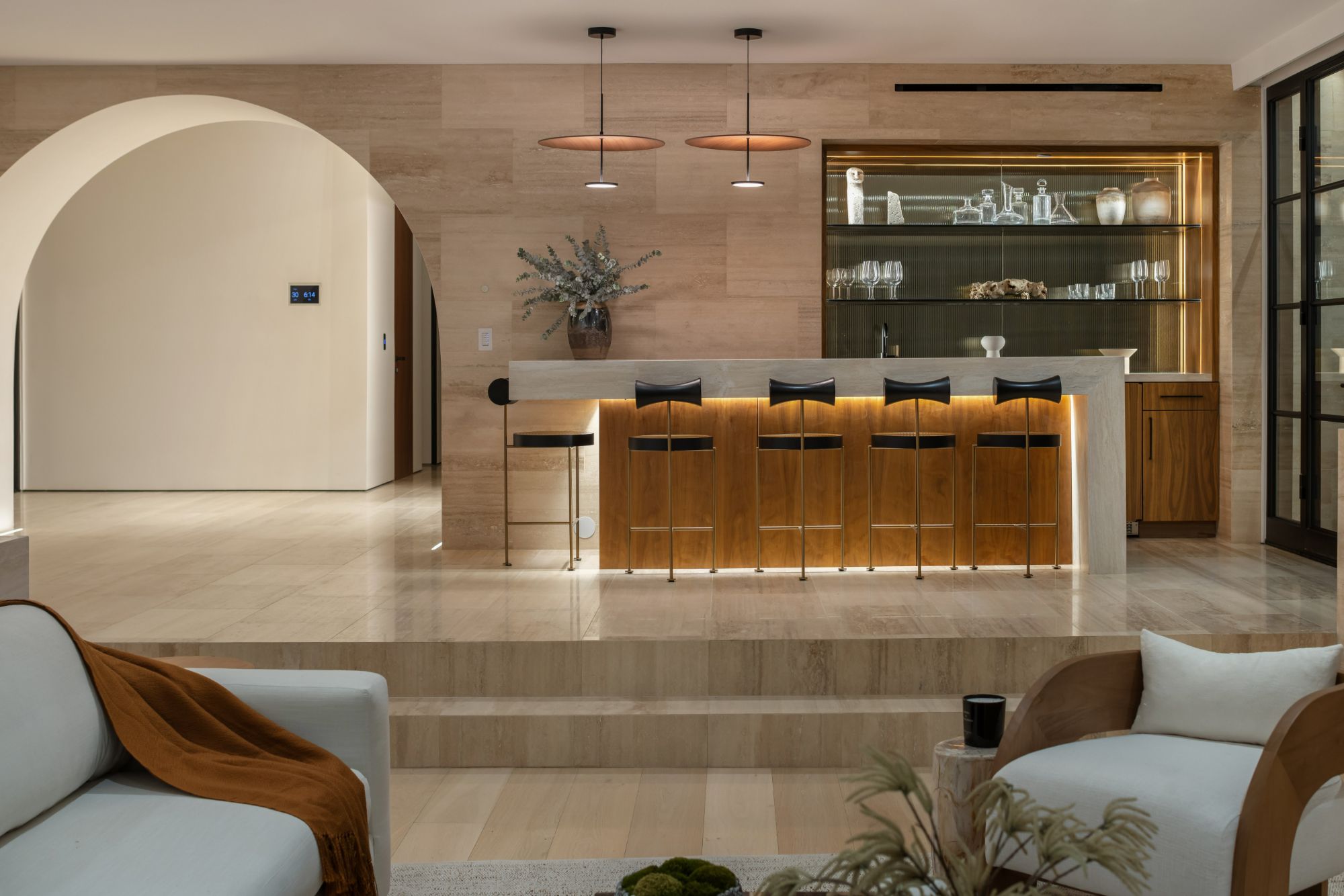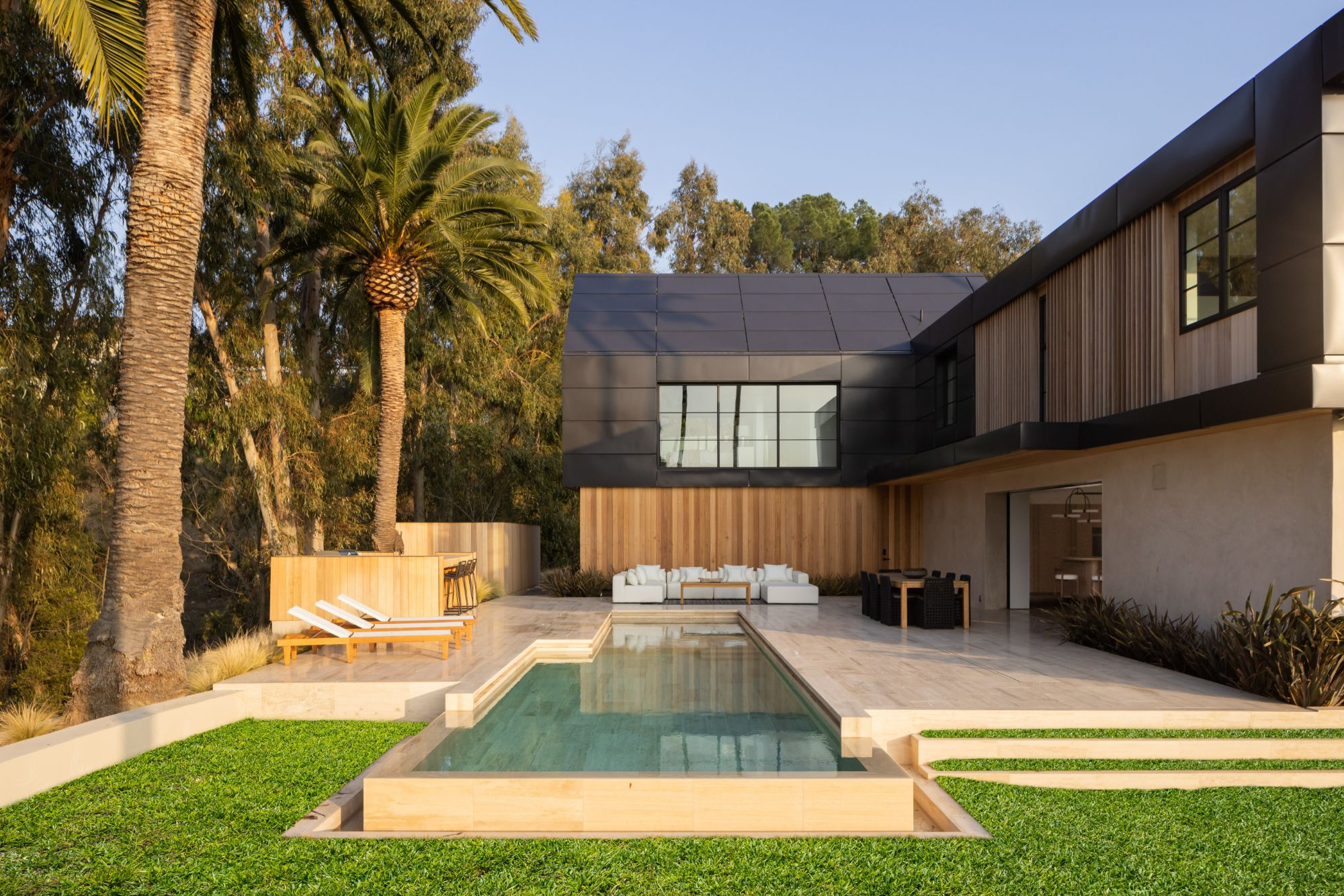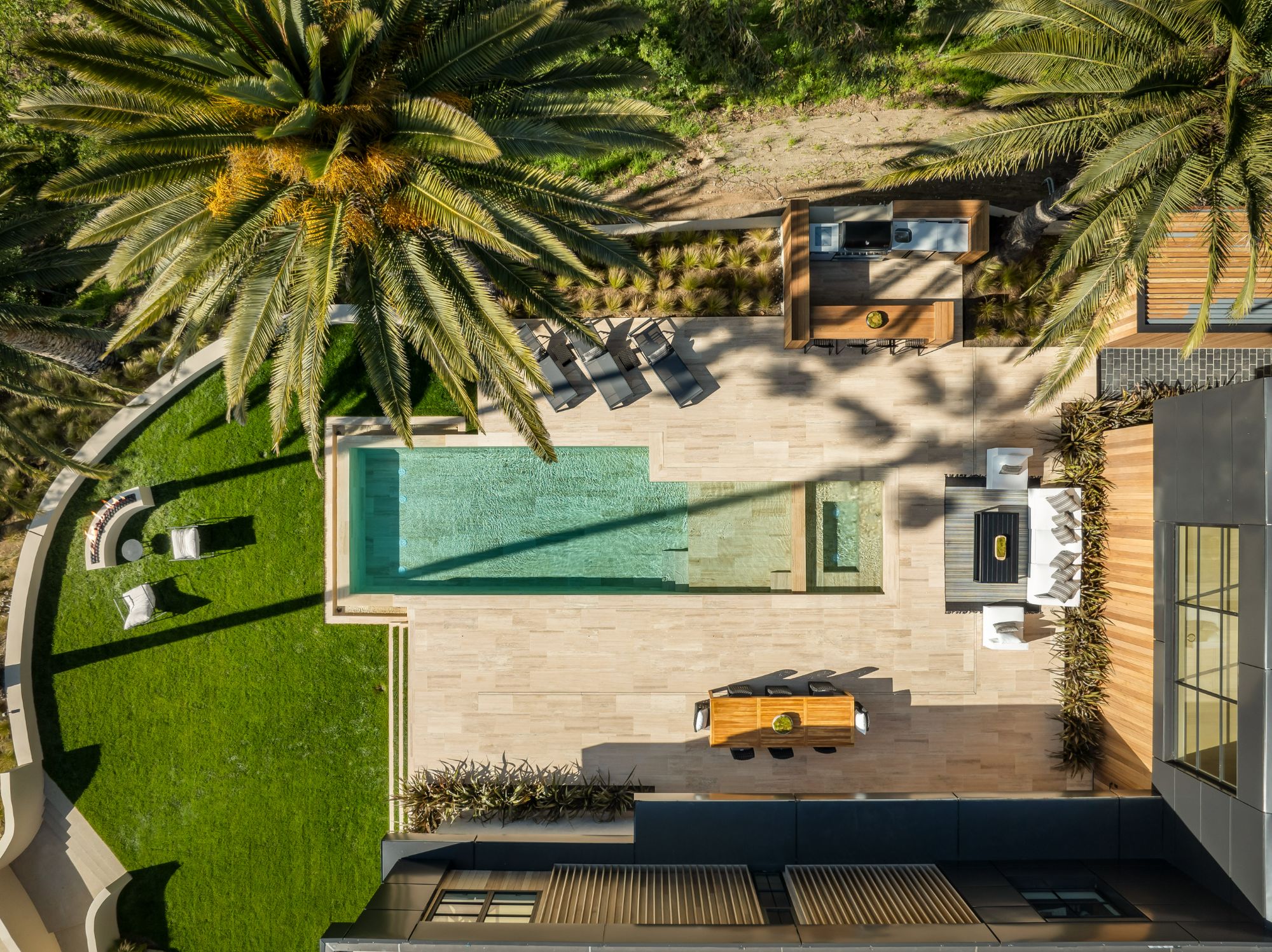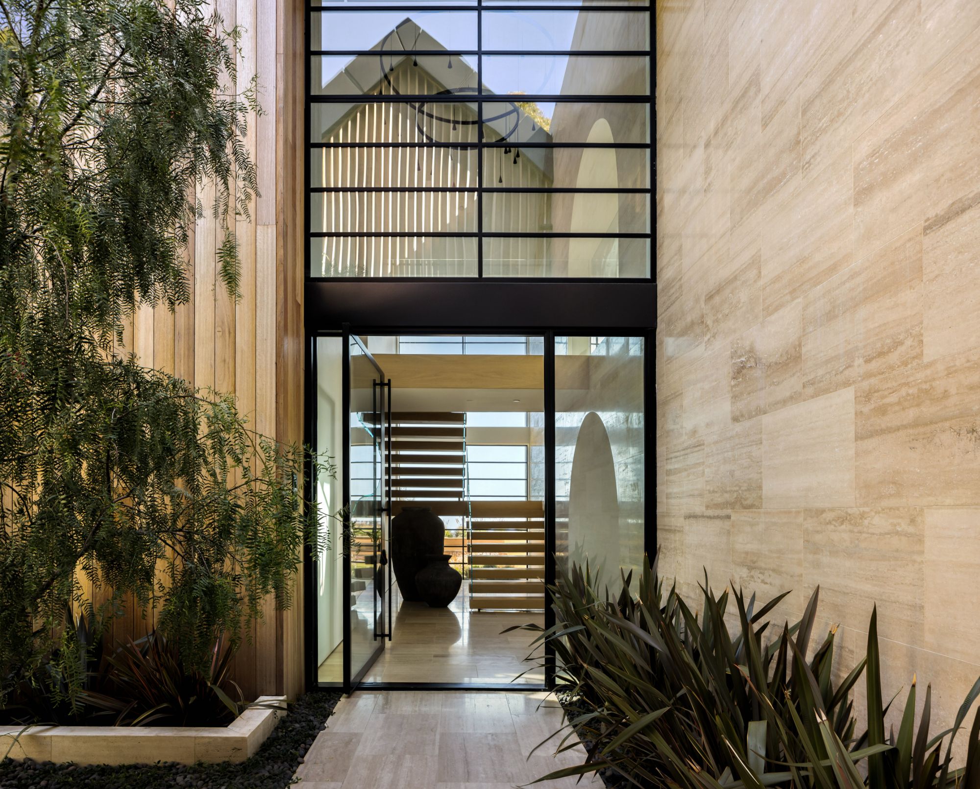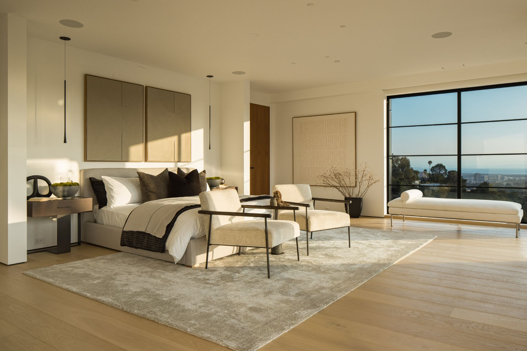 Introducing FRAME, an architectural compound by AADS, sited on over 3.5 lush acres in lower Bel Air with 270-degree Ocean, City, and Getty views. Gated and private, a 250-foot driveway leads to an oversized motor court, revealing a dramatic Scandinavian-inspired gabled roofline and exterior with resort-like grounds. A procession of pepper trees forms a natural colonnade, creating a moment of transition. Inside, a soaring 30-foot atrium introduces volume, crowned by a custom concentric Bover chandelier. Double arches present a deliberate pause before leading to the sunken living room, where wood floors seamlessly meet a sculptural travertine fireplace with a discreet built-in motorized TV. The effect is one of intimacy within expansiveness, a rare and studied composition in a home of this scale. A custom planter brimming with ZZ flora acts as an organic partition and softens the division between inside and out, a subtle nod to the estate's biophilic design. The Molteni & C Dada kitchen, a triumph of Italian craftsmanship, features book-matched Calacatta marble, a PITT stovetop, double islands offset rather than stacked, breaking convention for a more sculptural form, and multiple seating areas. Beyond, a fully appointed chef's pantry awaits, a complement ideal for dinner parties and events. The bar area pairs travertine surfaces with open shelving framed by smoked ribbed mirrored glass, recessed walnut panels, and LED-lit shelving designed to reveal rather than display. Adjacent lies a temperature-controlled wine closet, a quiet ode to oenophiles, with space for 190 bottles to age gracefully. Upstairs, tranquility reigns. Each of the home's en-suite bedrooms was designed to experience a symphony of natural light and the surrounding landscaping. The primary suite, with its center-pivot windows and private balcony, feels like a gallery to the skyline. Dual bathrooms, clad in floor-to-ceiling travertine slabs, evoke the monolithic beauty of the Getty; their floating vanities, designed as seamless extensions, elevate everyday rituals into luxurious indulgences.The detached guest house, spanning over 3,400 square feet, is a dedicated wellness sanctuary. Two south-facing en-suite bedrooms capture uninterrupted sunlight, while private access leads to a glass-enclosed fitness pavilion with a gym, sauna, steam room, and massage suite, all opening to a wraparound terrace overlooking the storied Moraga vineyards. Outdoors, the landscape is composed with the same precision as the interiorsa travertine infinity pool extends toward the horizon, while a private tennis/basketball court, large grass lawn, BBQ, and fireplace complete the grounds. At the estate's edge, a 40-foot mahogany hangar garage door, engineered with a moment frame structure, creates a seamless, uninterrupted facade. FRAME, located at 879 Linda Flora Drive, offers an incomparable blend of thoughtful design, organic elements, and architectural innovation. Every detail has been meticulously composed, creating a legacy of design and aspiration in the hills of Bel Air.