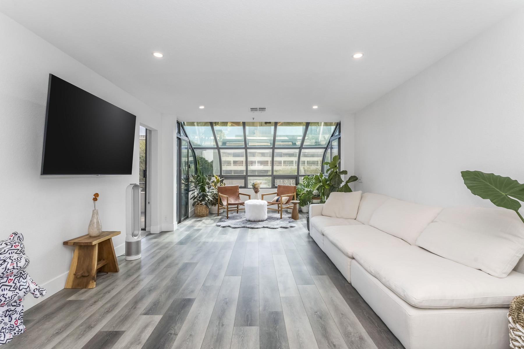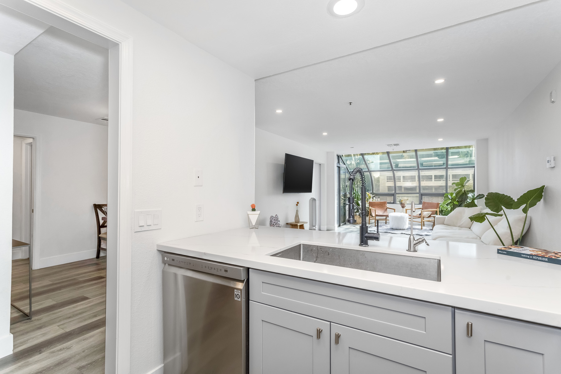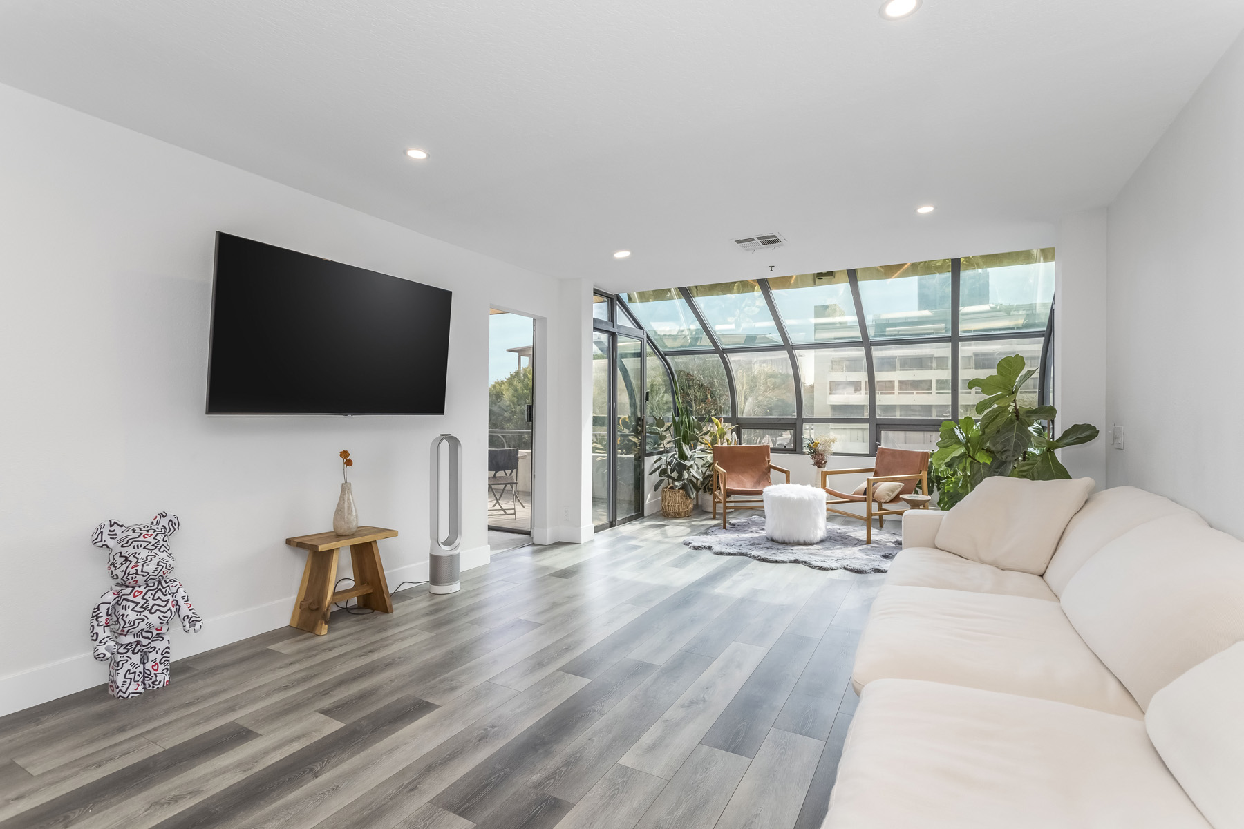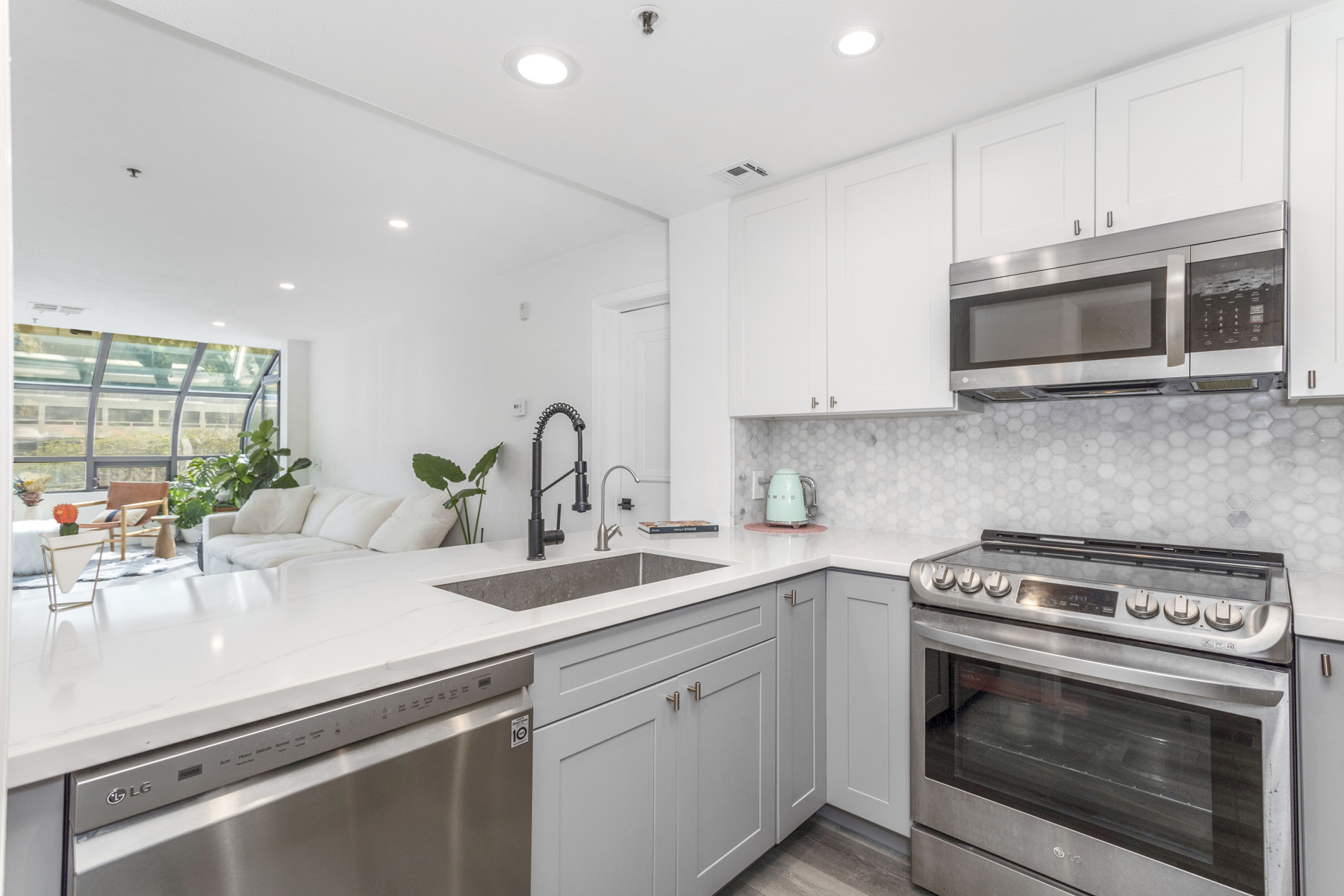Presenting a rare and fully remodeled two-bedroom, two-bathroom condo at Promenade West in the heart of Bunker Hill. This residence features an open floor plan with waterproof and scratch resistant stone flooring throughout the entry, living, and dining areas, along with beautiful tile floors in the bathrooms. The master bath boasts a double vanity, adding a touch of luxury. The unit showcases a large private balcony emitting abundant sunlight with new retractable awnings, creating a solarium-like space to enjoy the outdoors. Building amenities include 24-hour concierge, heated pool, spa, sauna, fitness area, private dog park, and dry cleaning service. With its attractive pricing per square foot, this condo offers a captivating opportunity for urban living in a vibrant setting. Conveniently located near Downtown LA's Cultural Center, MOCA, Walt Disney Concert Hall, The Broad, and more.