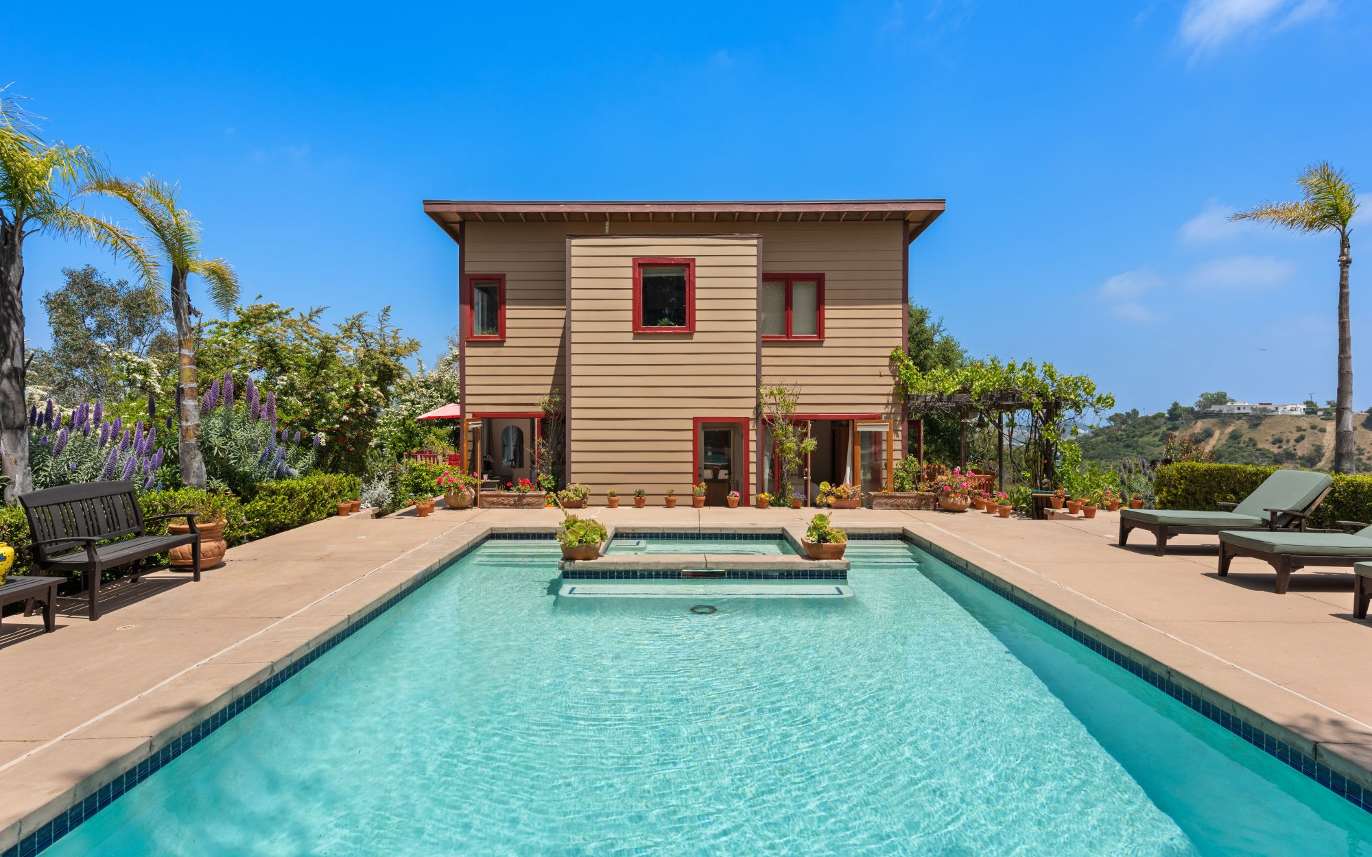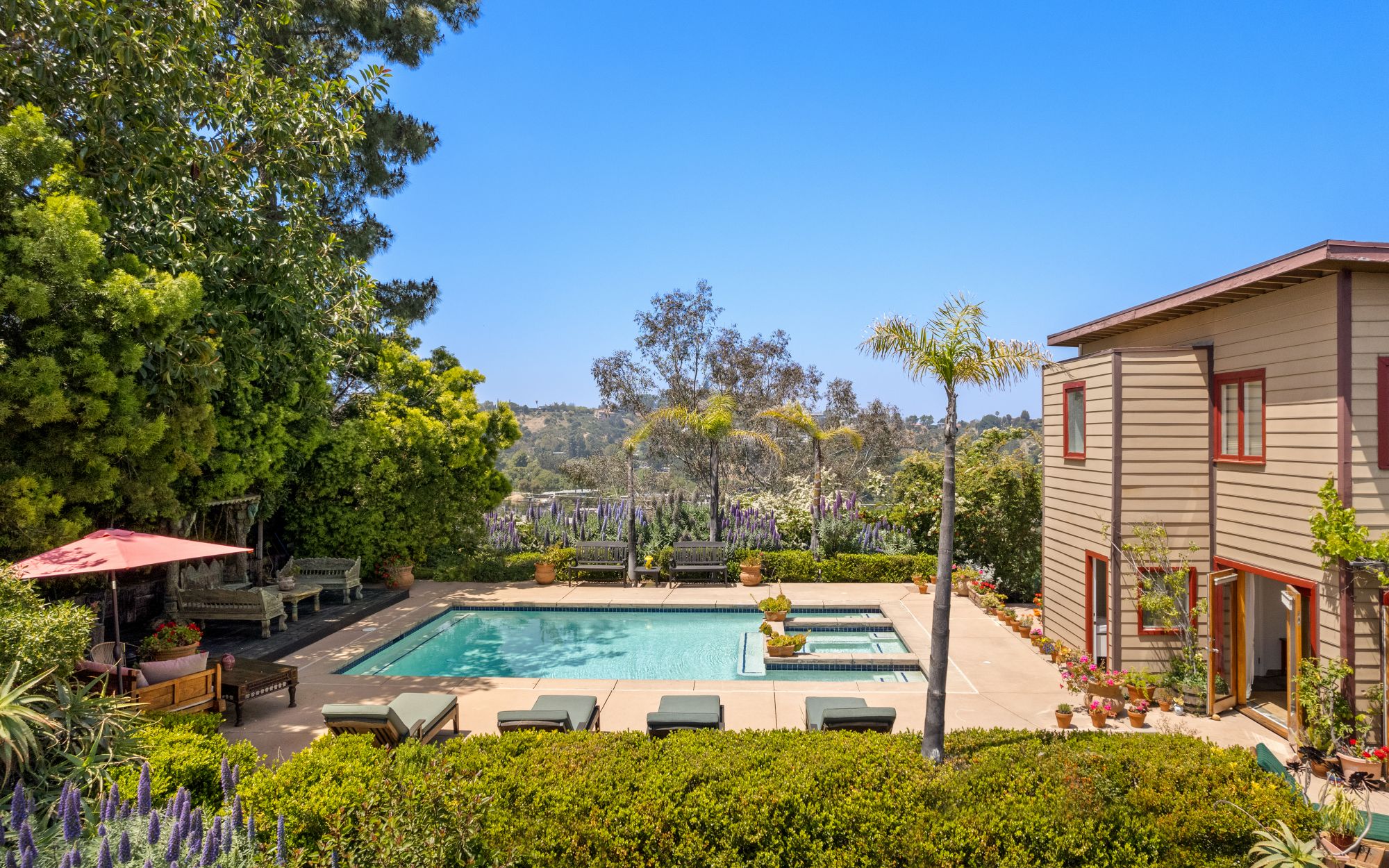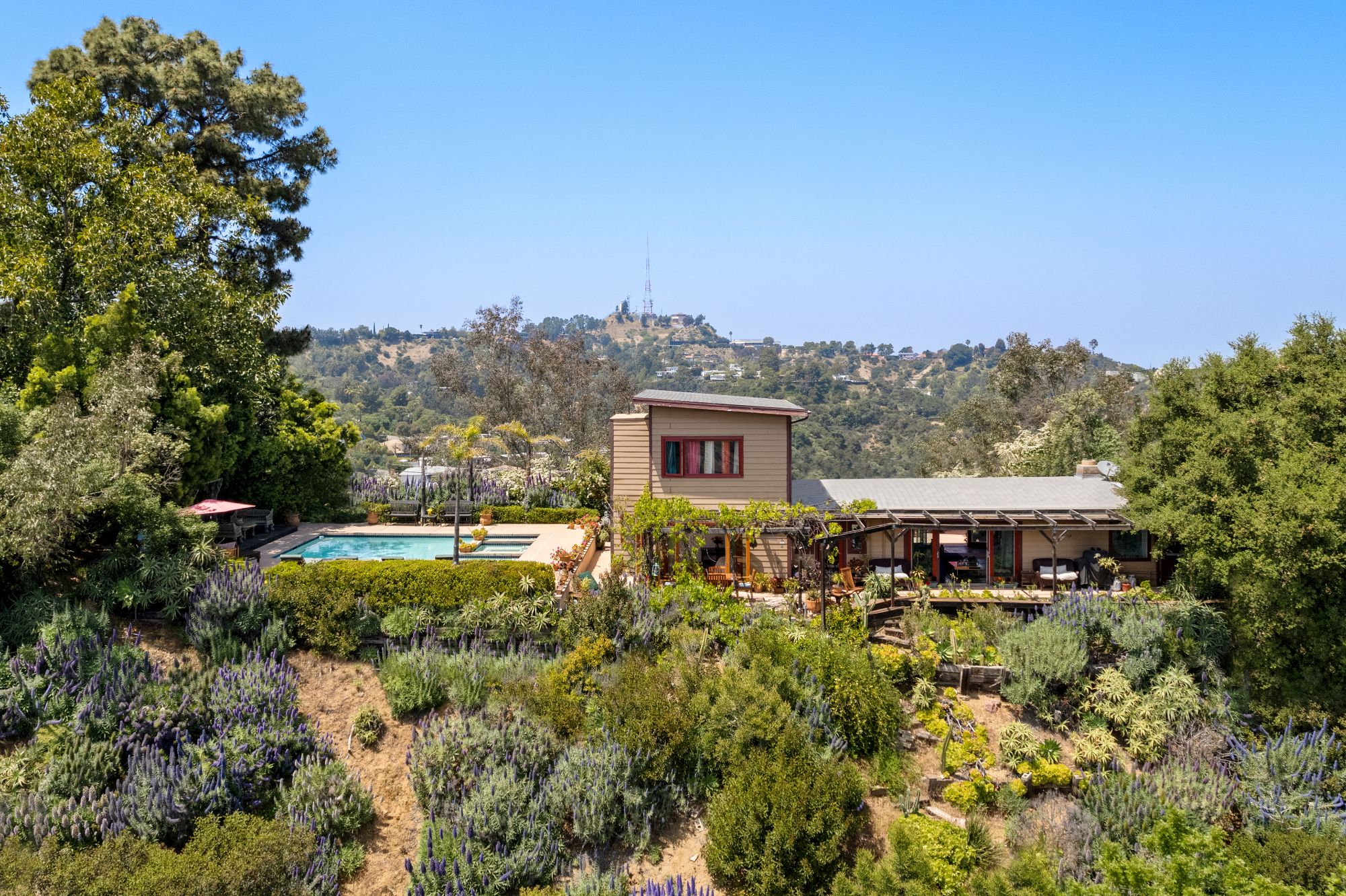 Welcome to this Shangri-La Estate, on top of the world, above the clouds where stars and legends of Laurel Canyon gather. It is situated minutes away from the renowned Sunset Strip, where Sunset Plaza kisses Wonderland Avenue, in the heart and soul of the Hollywood Hills. This canyon is where music, art, and dance have been created for the world. Nestled on a massive double lot, this mid-century ranch offers quintessential seamless indoor/outdoor living and your own private pool and spa with cinematic views on both sides of the property. This is not just a house but a sanctuary, where you can be at peace with your spirit animal and reconnect with nature. Hear the sounds of wind rustling through the trees, hawks dancing above, owls whispering at night, and deer lounging nearby. The home boasts 3 beds, 3 baths, and a newly remodeled kitchen featuring a top-of-the-line Viking stove and appliances. Entertain outdoors under the grapevine-adorned dining pergola, providing delicious red grapes to savor on a hot summer day. The spacious upstairs primary suite offers ample closets, and every room and every bathroom have epic views of either the city lights or the canyons. Parking for 4 vehicles is available, and the home is just steps away from the desirable Wonderland Elementary School and two of LA's hidden gems: Pace restaurant and the historic Canyon Country Store, where the iconic rock stars of the 1960s met daily and inspired Jim Morrison's "Love Street: The Store Where the Creatures Meet." That tradition continues to this day. Here's your chance to become one of the legendary local creatures of the Laurel Canyon community and manifest your destiny with Lily's coffee and the best French pastries in town. "There are things known and things unknown, and in between are the doors." Don't let this private Shangri-La with its magical vibe on top of the world get away.