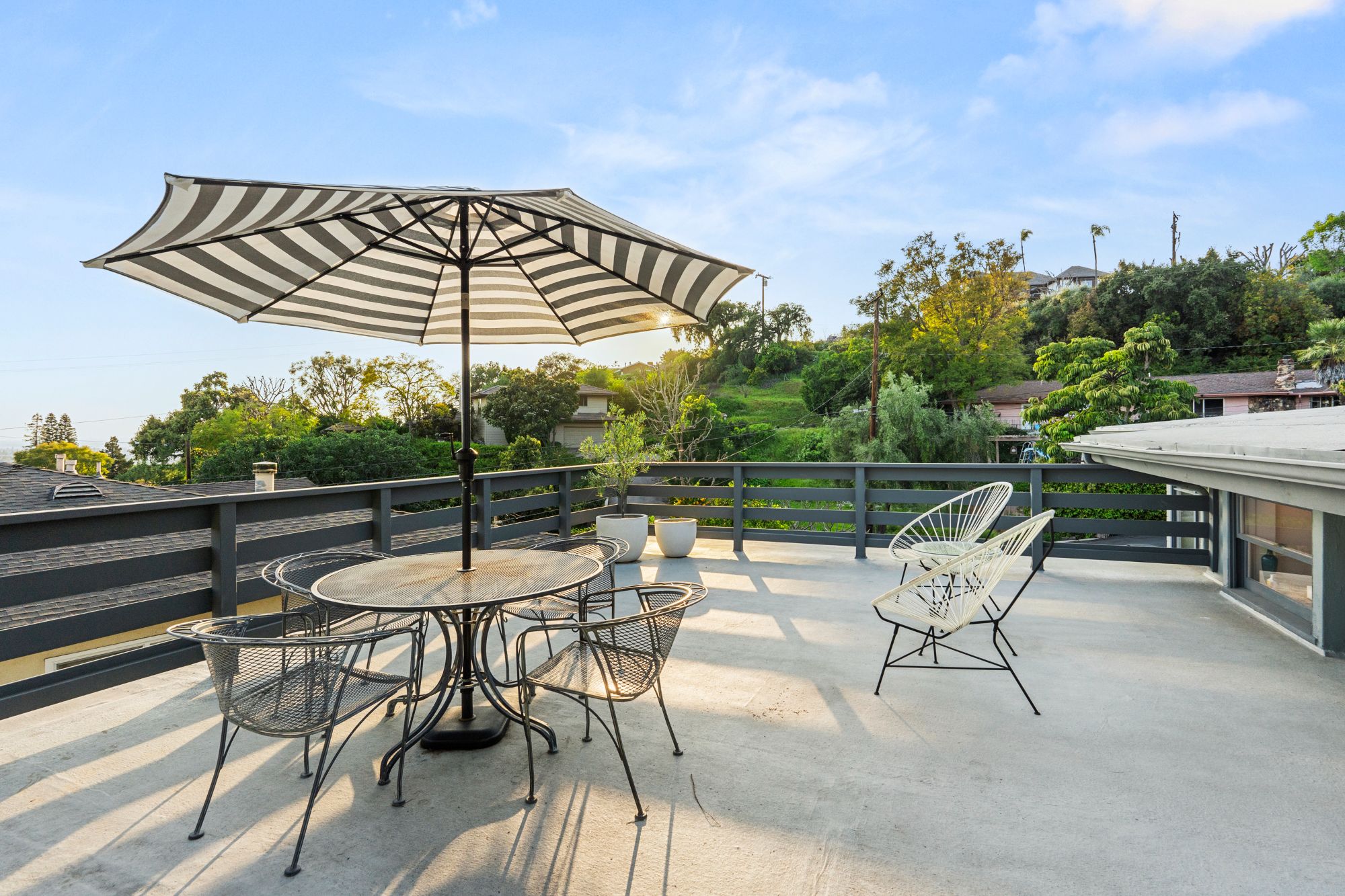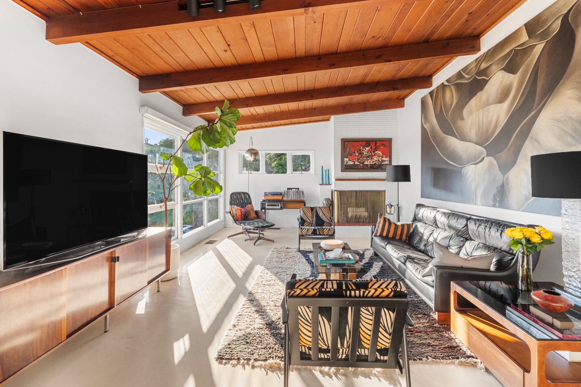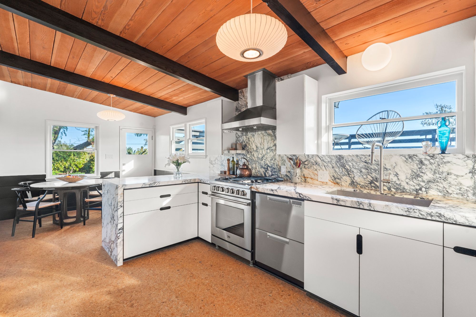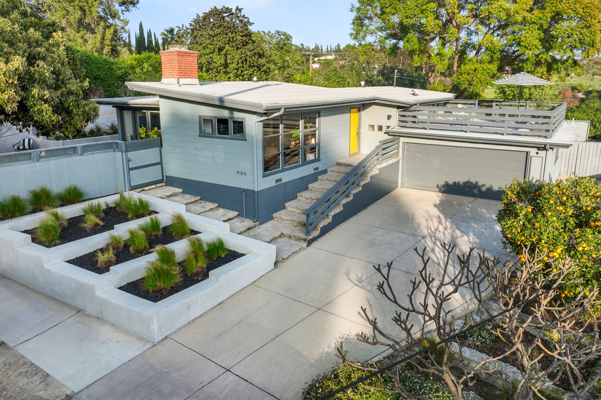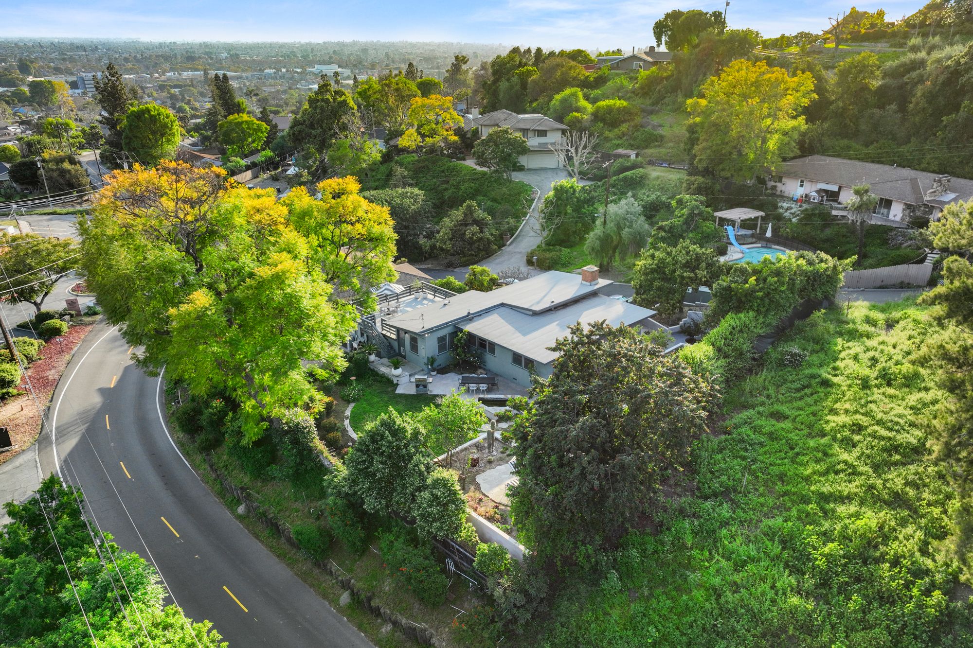 Nestled amidst the tranquil hills of La Habra Heights, this serene Mid-Century home boasts a sprawling street-to-street lot offering breathtaking city light views extending to Catalina Island. With meticulously landscaped outdoor spaces perfect for entertaining, this single-story residence exudes period charm and thoughtful details throughout. The sunlit living room features a cozy fireplace, exposed wood beams, and sleek polished concrete floors. A recently updated kitchen showcases Calacatta Paonazzo marble countertops and backsplash, Fisher & Paykel appliances and custom cabinetry, complemented by cork flooring. The primary bedroom includes a private outdoor seating area overlooking a peaceful koi pond, while two additional bedrooms offer ample storage and garden views. The expansive yard is adorned with mature avocado and citrus trees, native succulents, and a lush grassy pad, outdoor dining area, and soothing water features. Relax and soak in the sunset and ocean vistas from the spacious patio deck. Completing this exceptional property is an additional bathroom and laundry area within the spacious garage. With its idyllic ambiance reminiscent of Ojai, yet conveniently located just 30 minutes from downtown LA, this home offers a rare blend of tranquility and accessibility.