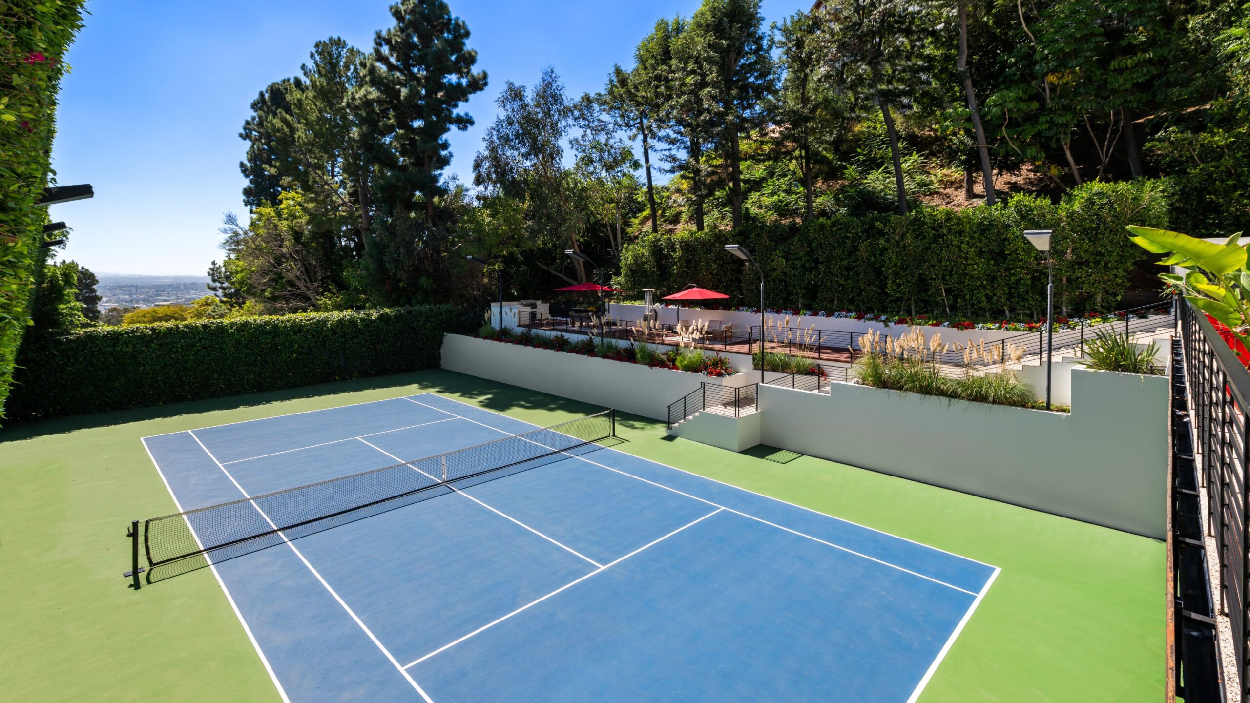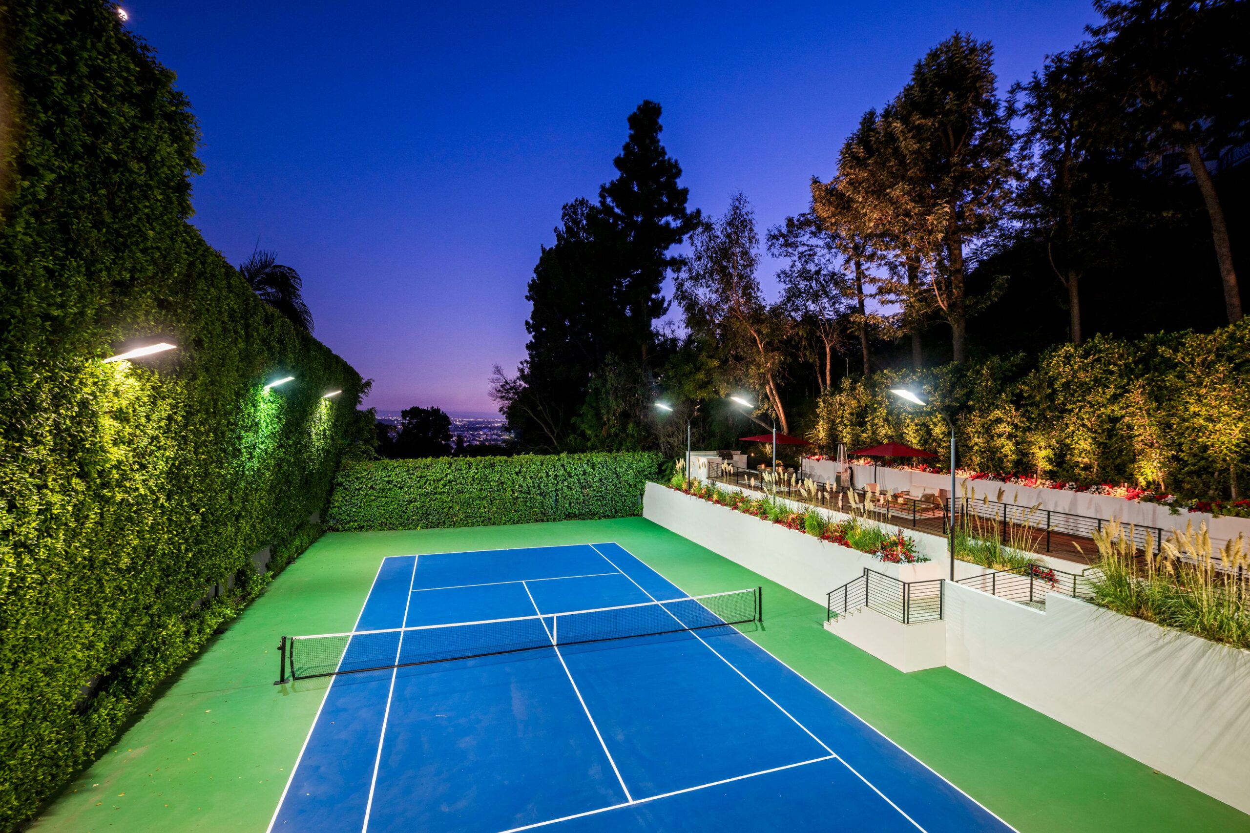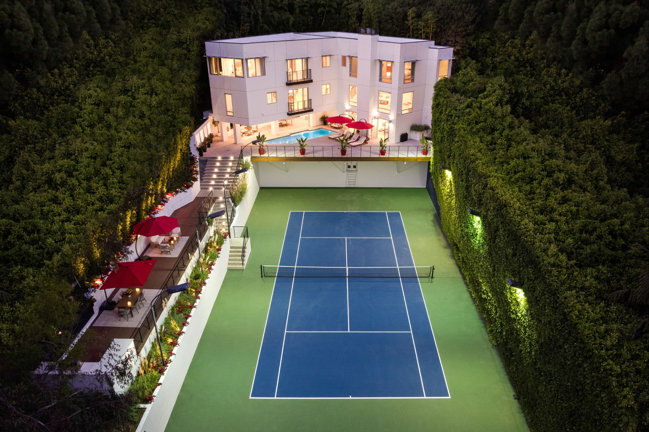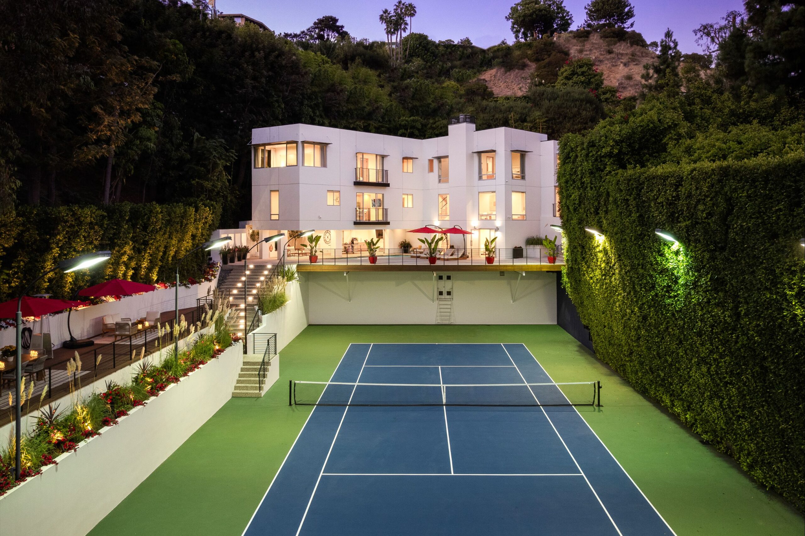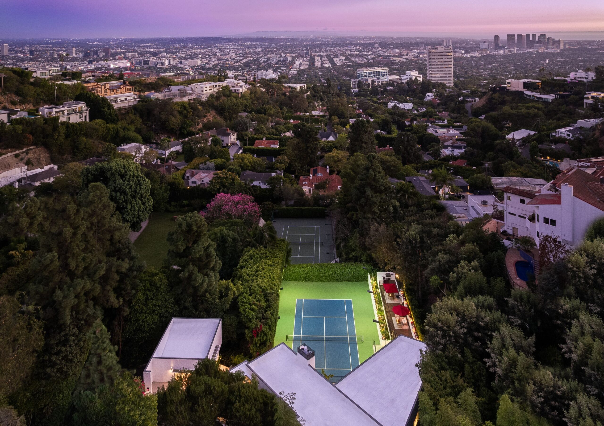 Set behind gates in the exclusive Bird Streets, Warbler Way is a .57-acre tennis court compound where architectural sophistication meets resort-style living. Bold and timeless, this modern masterpiece blends luxurious comfort with sleek design and total privacy. Walls of glass frame sweeping views of the hills and city skyline, while natural light floods the open interiors finished in new organic modern wood floors and curated details throughout. The 4-bedroom residence spans 6,200 square feet with an open-concept layout that includes a gourmet kitchen with Sub-Zero and Viking appliances and an elegant center island, a dining area, and an expansive living room. Amenities include a 12-seat movie theater, full gym, game room with locker and steam, office, maid's quarters, and an additional lower-level family room. A detached guesthouse features a private entrance, walls of glass showcasing sweeping views, and a kitchen and bath perfect for visitors, extended stays, or a serene retreat. The grounds are designed for effortless entertaining, showcasing lush new landscaping, dramatic lighting, a resort-style pool with streaming fountains, BBQ deck, outdoor fireplace, and a newly resurfaced tennis court with lights for night play. Parking includes a 3-car garage plus ample room for 5 additional cars, and 2 guest parking spots above. Just off Doheny and the Sunset Strip, and moments from Beverly Hills, this gated estate is a rare offering an architectural sanctuary where design, luxury, and location converge at the height of Los Angeles living.