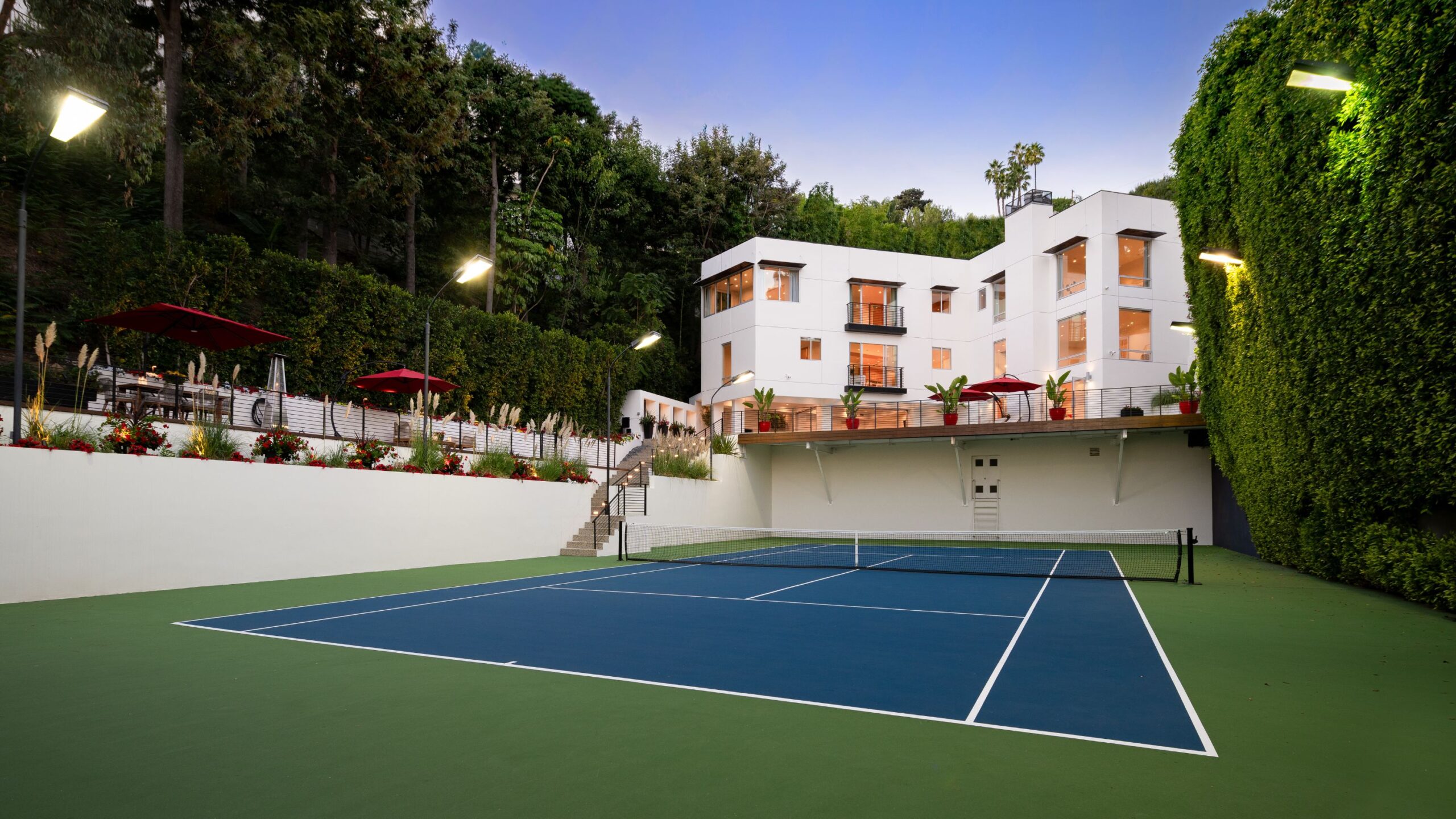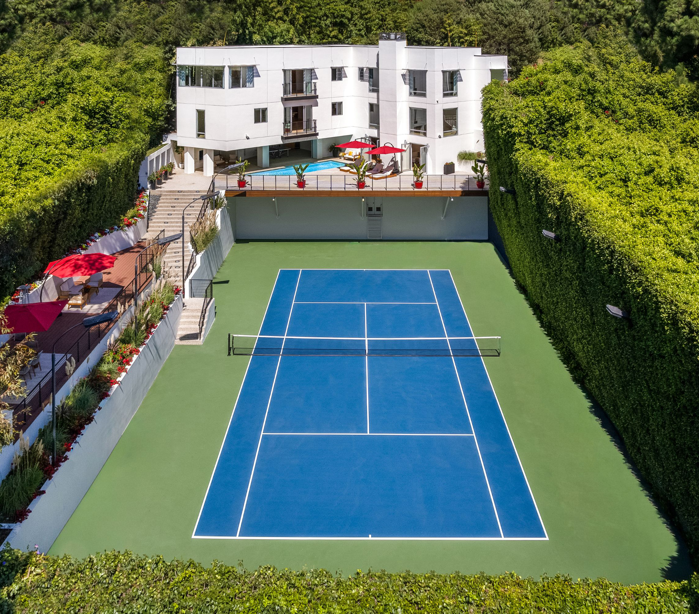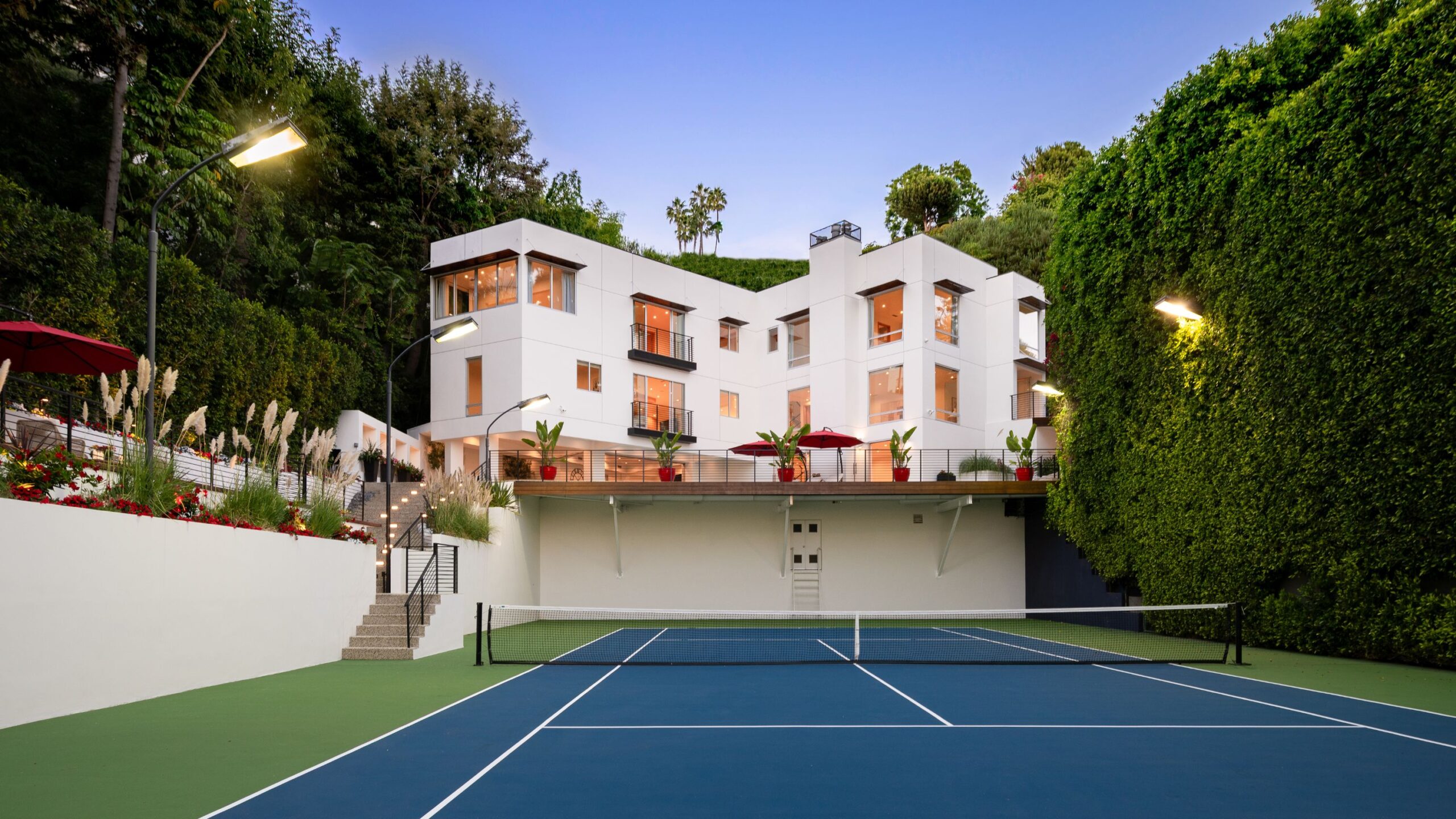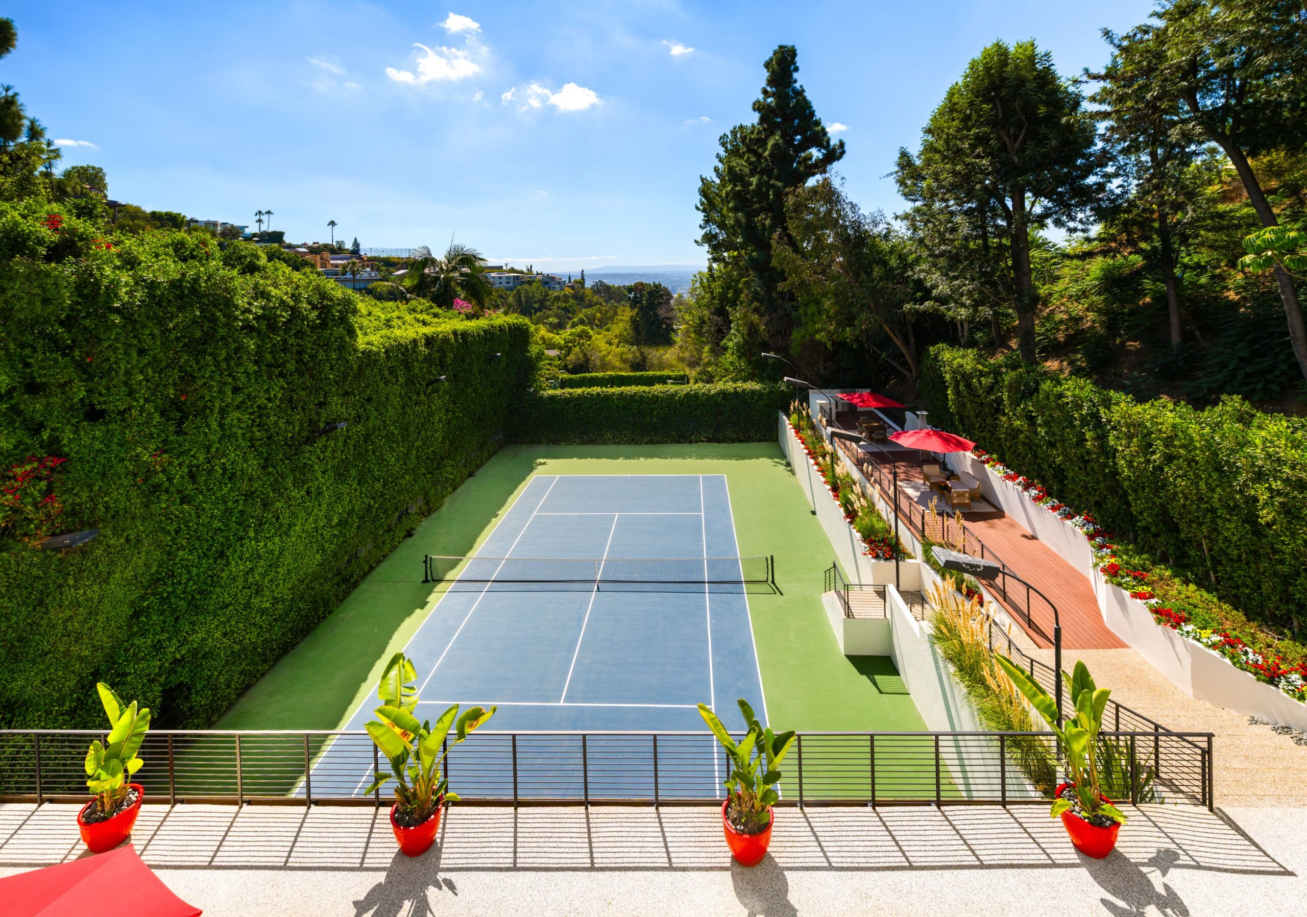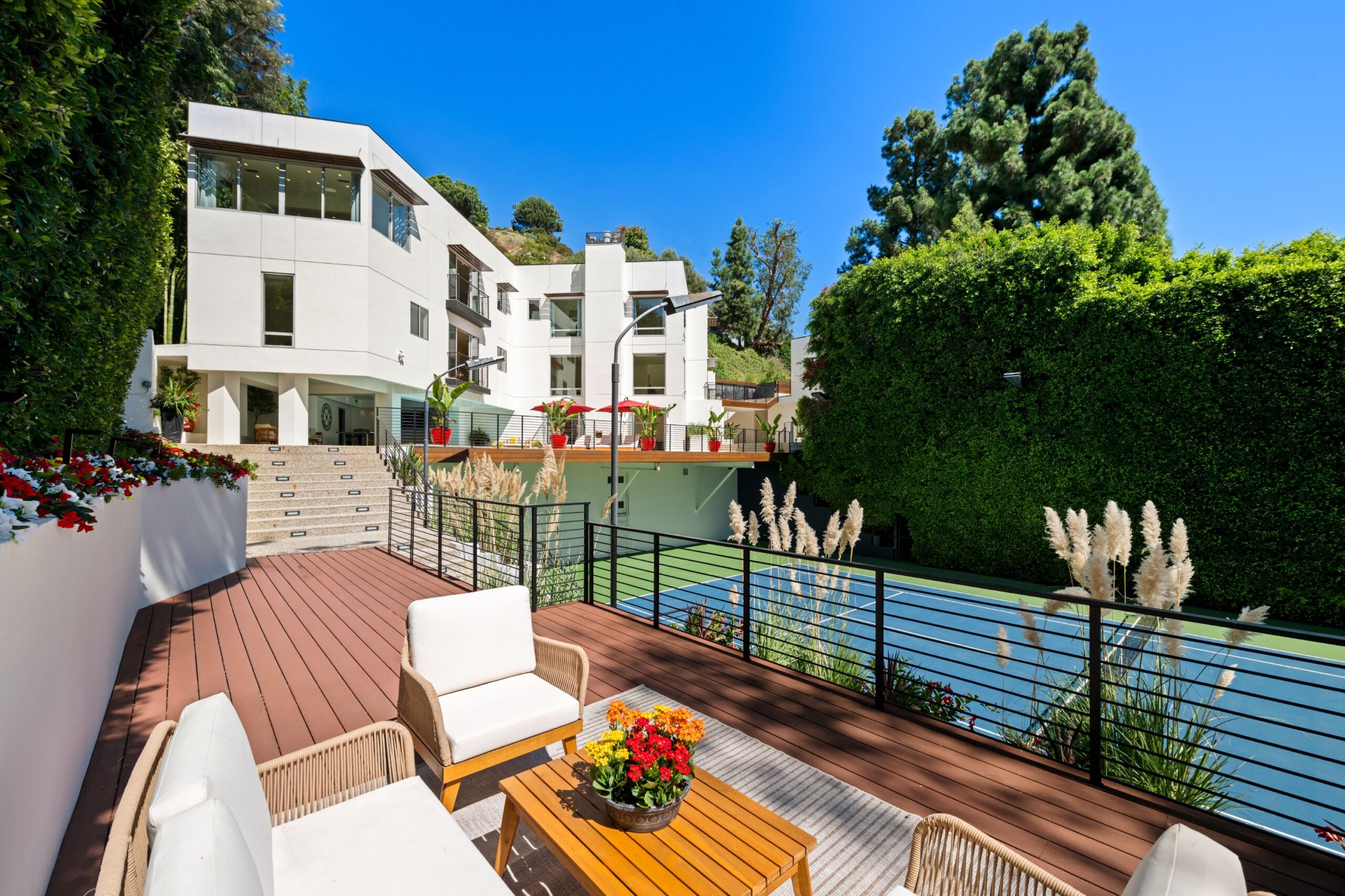 Set behind gates in the exclusive Bird Streets, Warbler Way is a .57-acre tennis court compound where architectural sophistication meets resort-style living. Bold and timeless, this modern masterpiece blends luxurious comfort with sleek design and total privacy. Walls of glass frame sweeping views of the hills and city skyline, while natural light floods the open interiors finished in new organic modern wood floors and curated details throughout. The 4-bedroom residence spans 6,200 square feet with an open-concept layout that includes a gourmet kitchen with Sub-Zero and Viking appliances and an elegant center island, a dining area, and an expansive living room. Amenities include a 12-seat movie theater, full gym, game room with locker and steam, office, maid's quarters, and an additional lower-level family room. A detached guesthouse features a private entrance, walls of glass showcasing sweeping views, and a kitchen and bath perfect for visitors, extended stays, or a serene retreat. The grounds are designed for effortless entertaining, showcasing lush new landscaping, dramatic lighting, a resort-style pool with streaming fountains, BBQ deck, outdoor fireplace, and a newly resurfaced tennis court with lights for night play. Parking includes a 3-car garage plus ample room for 5 additional cars, and 2 guest parking spots above. Just off Doheny and the Sunset Strip, and moments from Beverly Hills, this gated estate is a rare offering an architectural sanctuary where design, luxury, and location converge at the height of Los Angeles living.