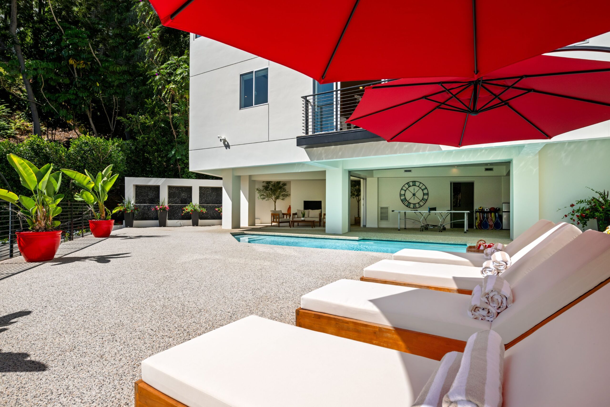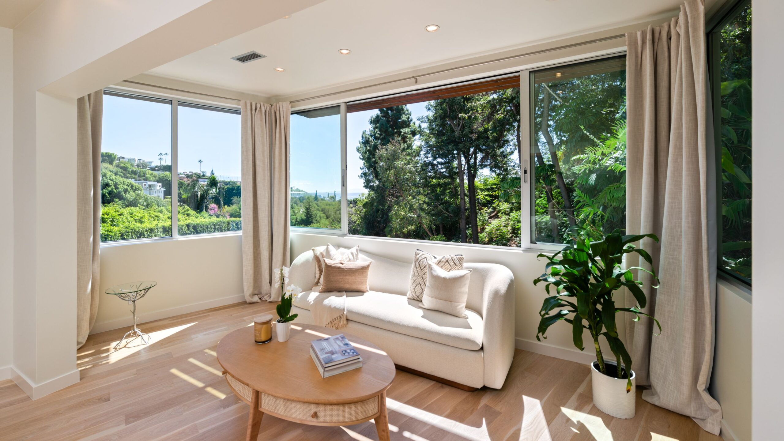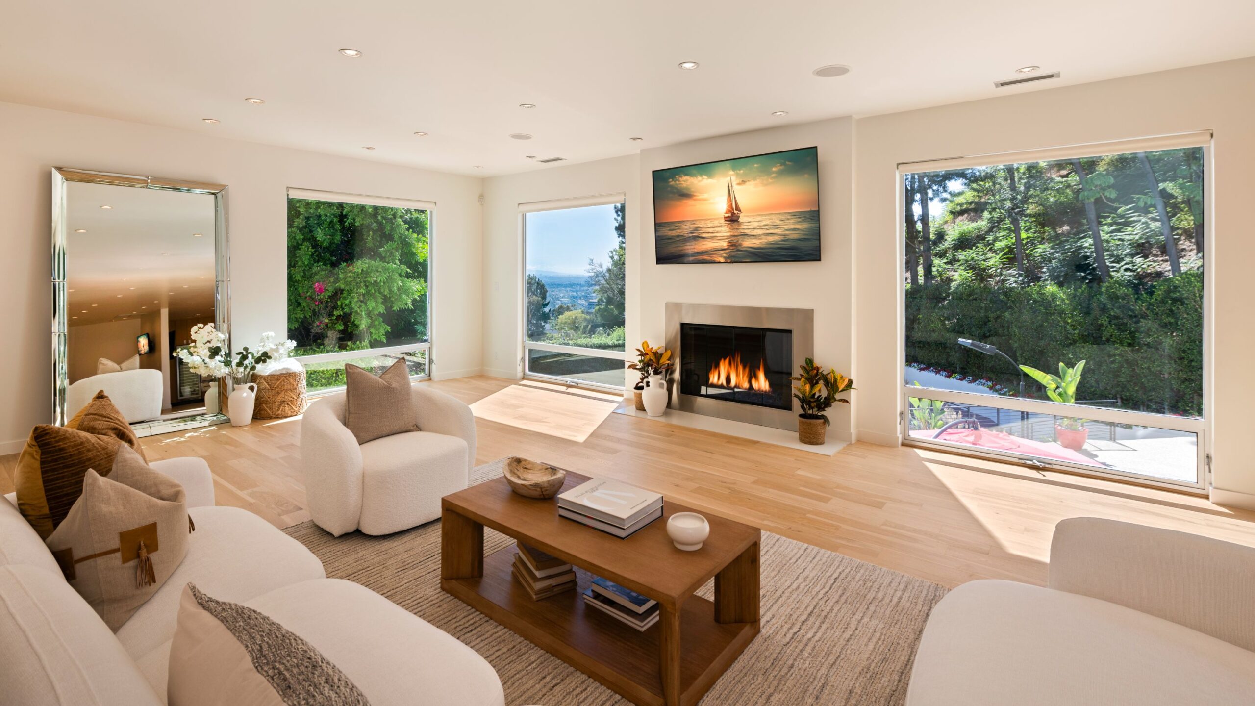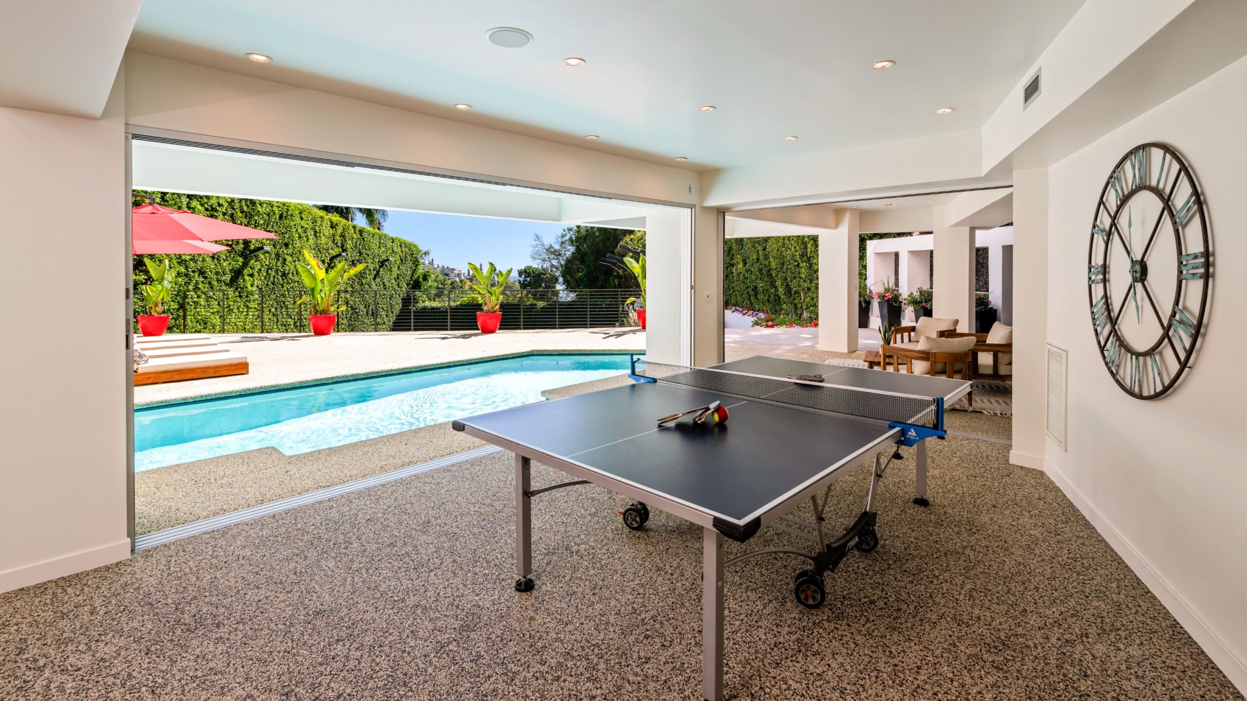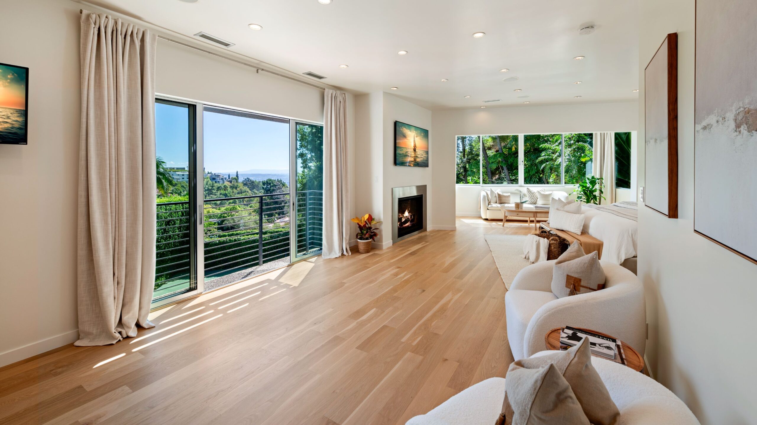 Set behind gates in the exclusive Bird Streets, Warbler Way is a .57-acre tennis court compound where architectural sophistication meets resort-style living. Bold and timeless, this modern masterpiece blends luxurious comfort with sleek design and total privacy. Walls of glass frame sweeping views of the hills and city skyline, while natural light floods the open interiors finished in new organic modern wood floors and curated details throughout. The 4-bedroom residence spans 6,200 square feet with an open-concept layout that includes a gourmet kitchen with Sub-Zero and Viking appliances and an elegant center island, a dining area, and an expansive living room. Amenities include a 12-seat movie theater, full gym, game room with locker and steam, office, maid's quarters, and an additional lower-level family room. A detached guesthouse features a private entrance, walls of glass showcasing sweeping views, and a kitchen and bath perfect for visitors, extended stays, or a serene retreat. The grounds are designed for effortless entertaining, showcasing lush new landscaping, dramatic lighting, a resort-style pool with streaming fountains, BBQ deck, outdoor fireplace, and a newly resurfaced tennis court with lights for night play. Parking includes a 3-car garage plus ample room for 5 additional cars, and 2 guest parking spots above. Just off Doheny and the Sunset Strip, and moments from Beverly Hills, this gated estate is a rare offering an architectural sanctuary where design, luxury, and location converge at the height of Los Angeles living.
