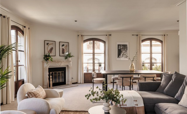 Elegant and spacious 2 bedroom, 2.5 bathroom condo a short stroll from the best restaurants and shops of Beverly Hills. Luxuriously furnished and designed with plentiful natural lighting, the spacious open floor plan features a kitchen, dining room, European-style fireplace and living room with classic (and fully openable) arch-top French doors. Enter from tree-lined Burton Way through a stately marble-floored entry foyer, reminiscent of European glamour, where you can enjoy full-time Concierge service and 24 hour security features. Inside the unit, the recently updated kitchen has limestone floors, all-new $15,000 luxury chef kitchen appliances: Wolf cooktop, Wolf cooktop hood, Wolf oven, Wolf speed oven, Bosch dishwasher, recessed ceilings, and chefs pass through to the dining room. The master bedroom offers a sizable walk-in closet and French doors leading to a personal stone-floor terrace, and an opulent primary bathroom with separate marble shower and tub. The guest bedroom has two double casement windows, a walk-in closet, and an en-suite bathroom. Quiet, cozy, spacious, the building includes a gym, rooftop area, side-by-side parking for two cars, and a private locked storage area. All within close walking distance to restaurants and shops on Rodeo Drive and The Golden Triangle.