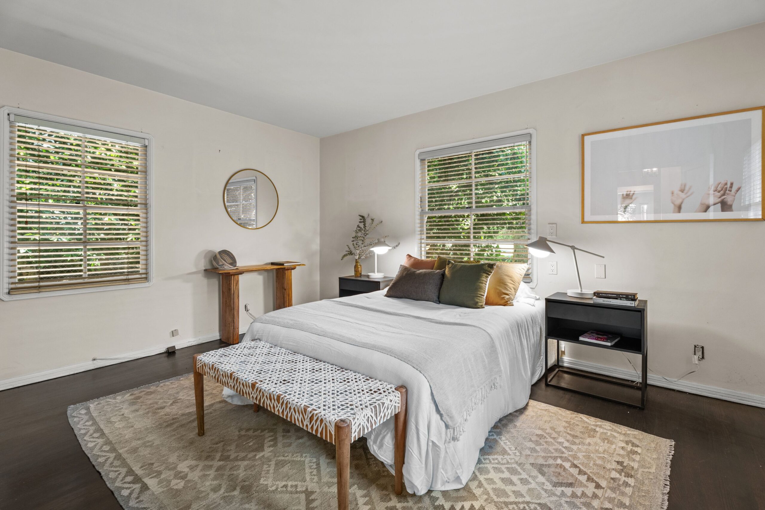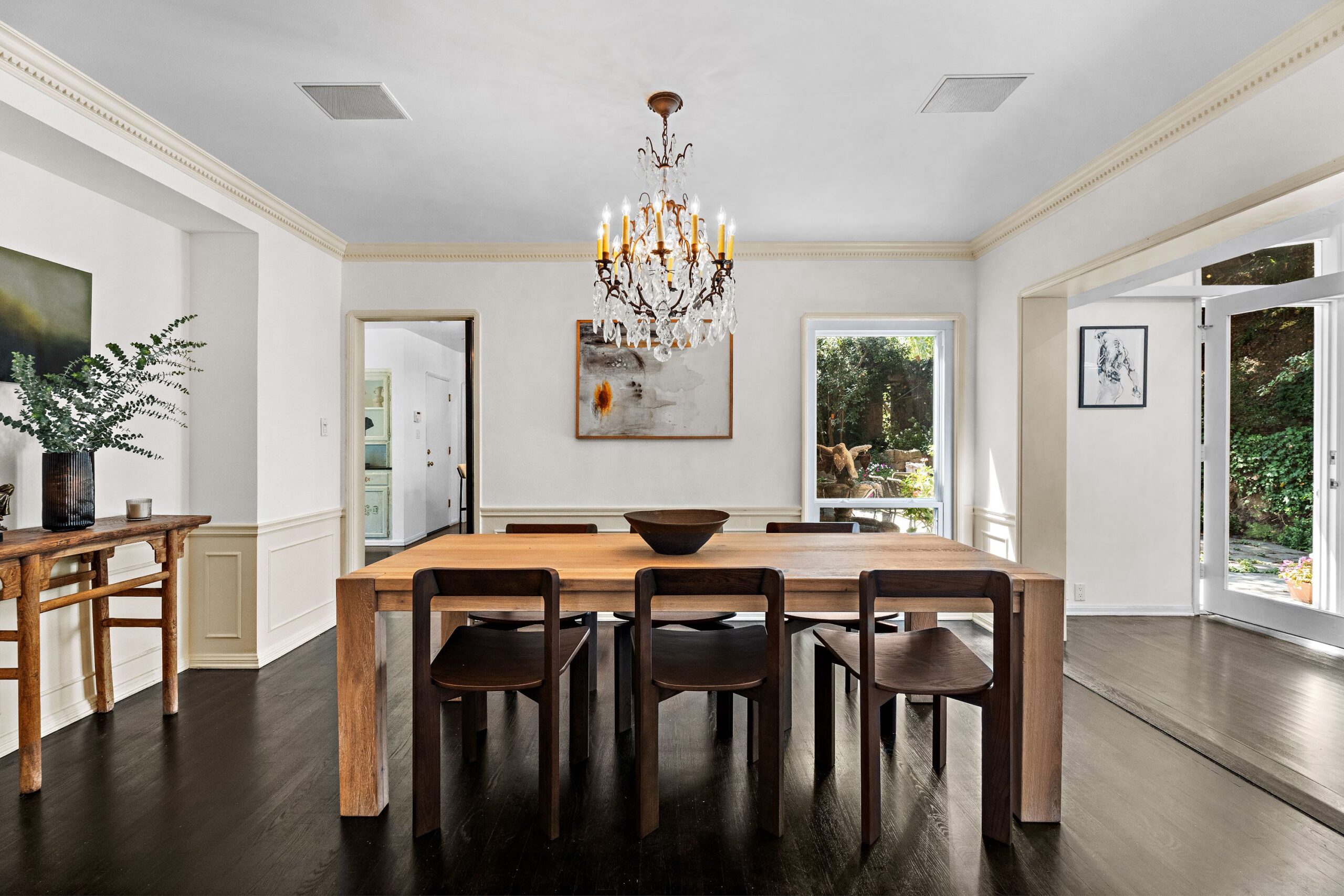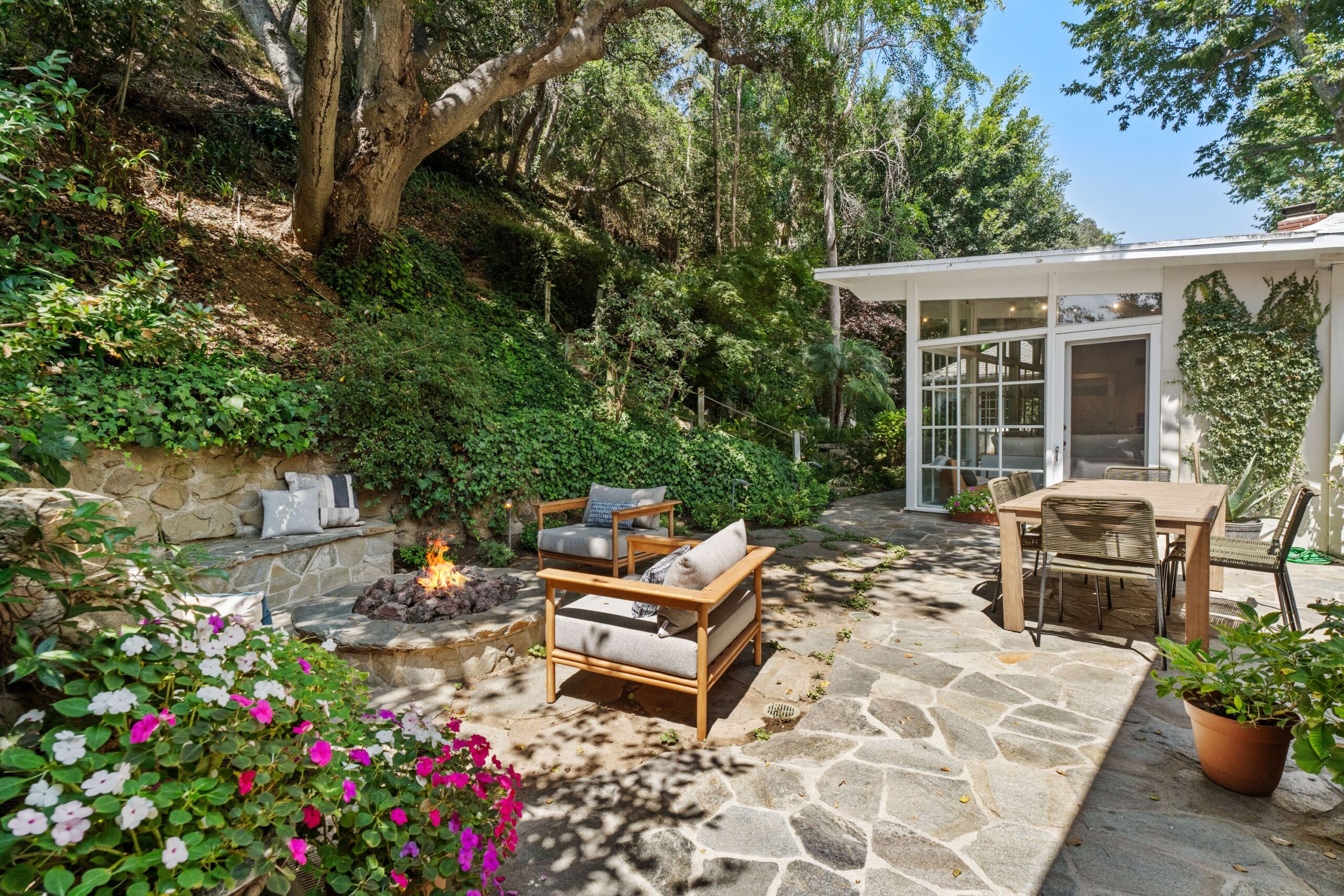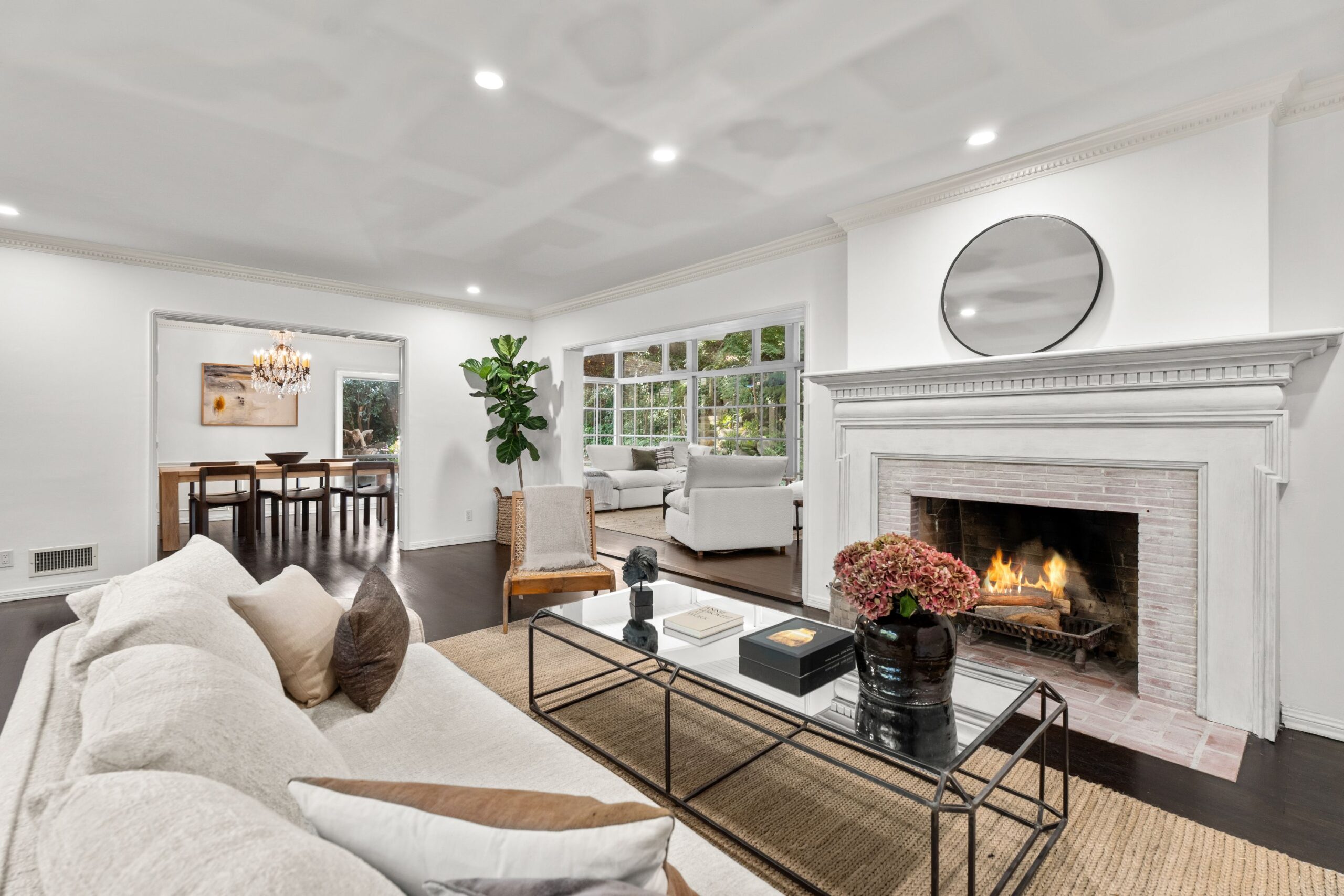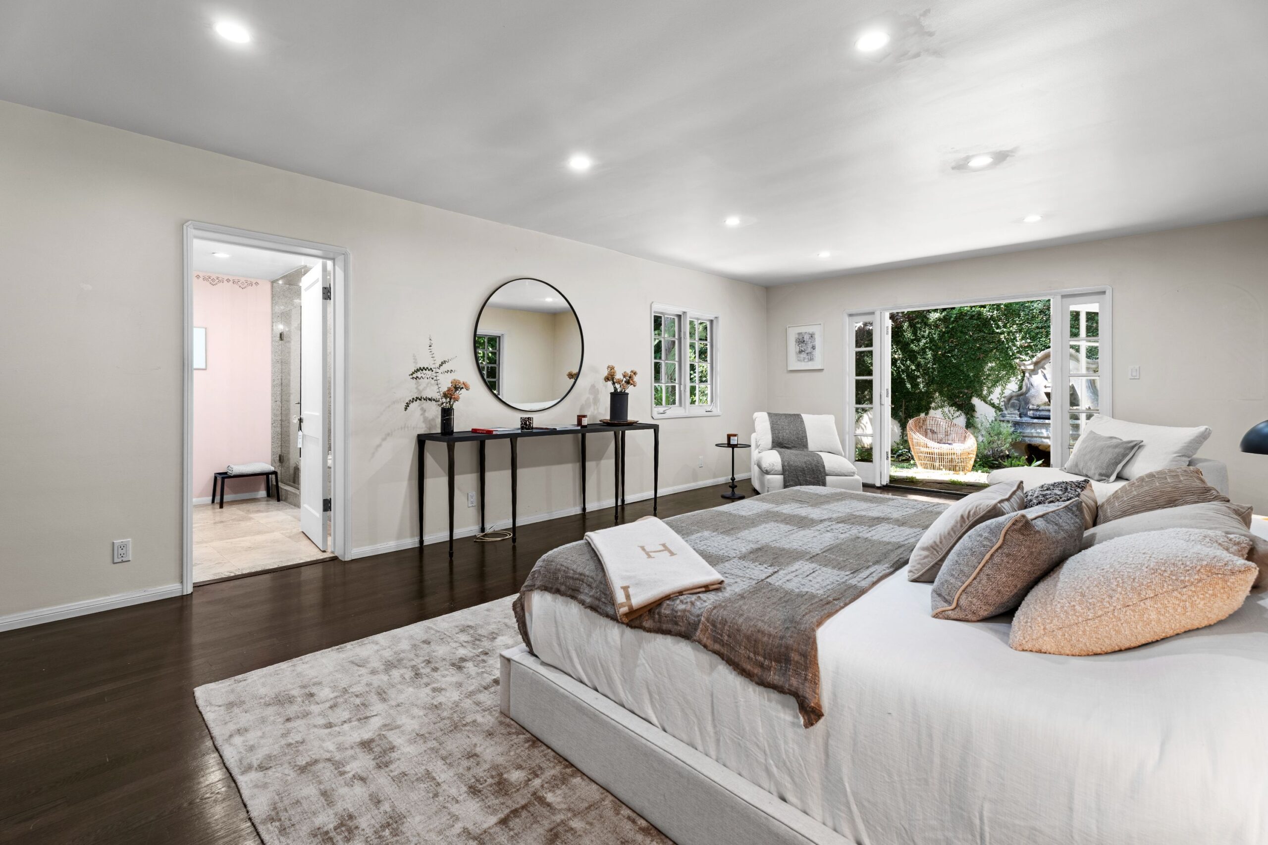 Tucked away in the prestigious enclave of lower Bel Air, this classic residence radiates old-world charm and understated sophistication. Sun-drenched interiors and graceful traditional details create a peaceful escape from the city's pace-offering the ideal turnkey retreat or a stunning canvas for your dream transformation. The home features four spacious bedrooms and a dramatic family room with exposed beams and soaring floor-to-ceiling windows. Rich wood floors flow throughout, enhancing the warm and inviting atmosphere. Outside, the lush, secluded grounds are a true sanctuary-complete with a serene rock waterfall, fire pit, and majestic trees anchoring the landscape. They simply don't build homes like this anymore-this is the Bel Air that defined glamour and gave the neighborhood its iconic status. Don't miss your chance to own a piece of Hollywood history and live like the legends.