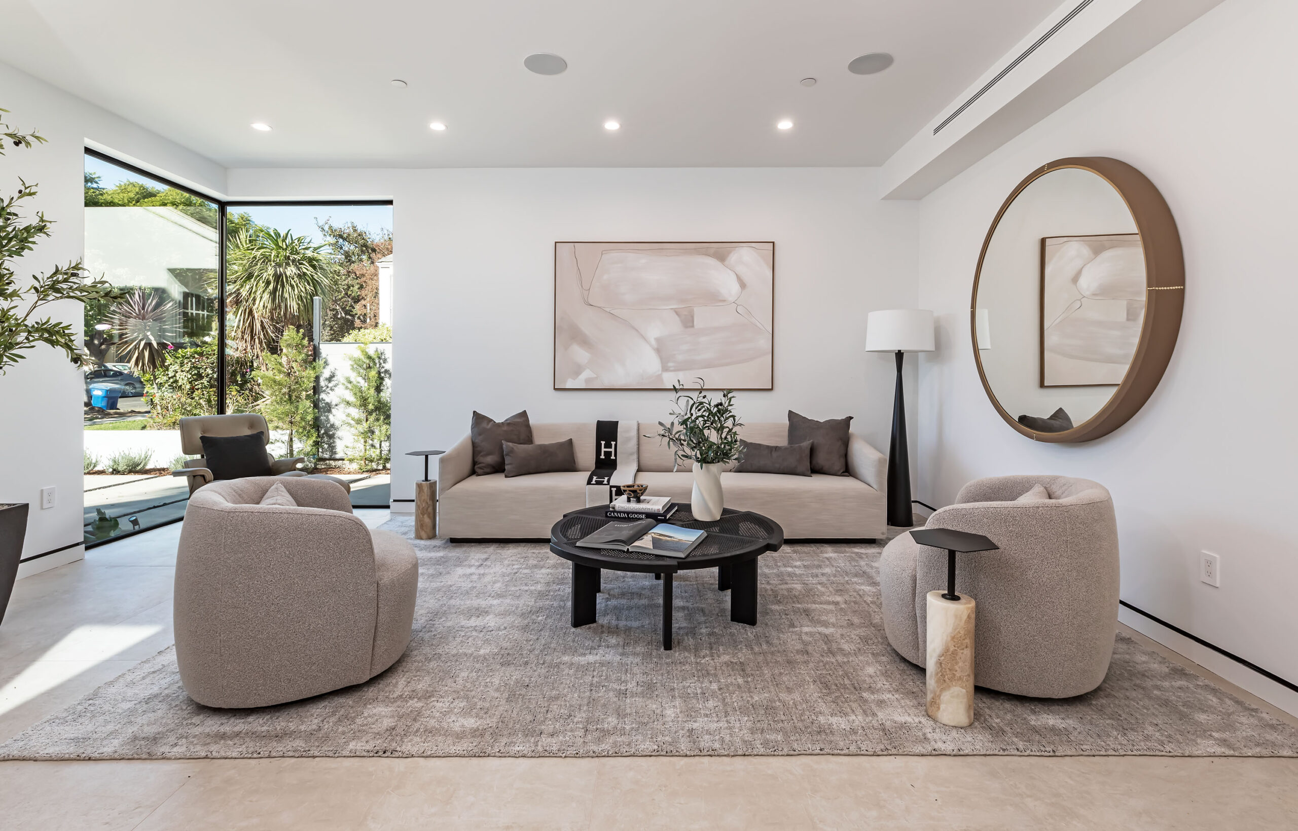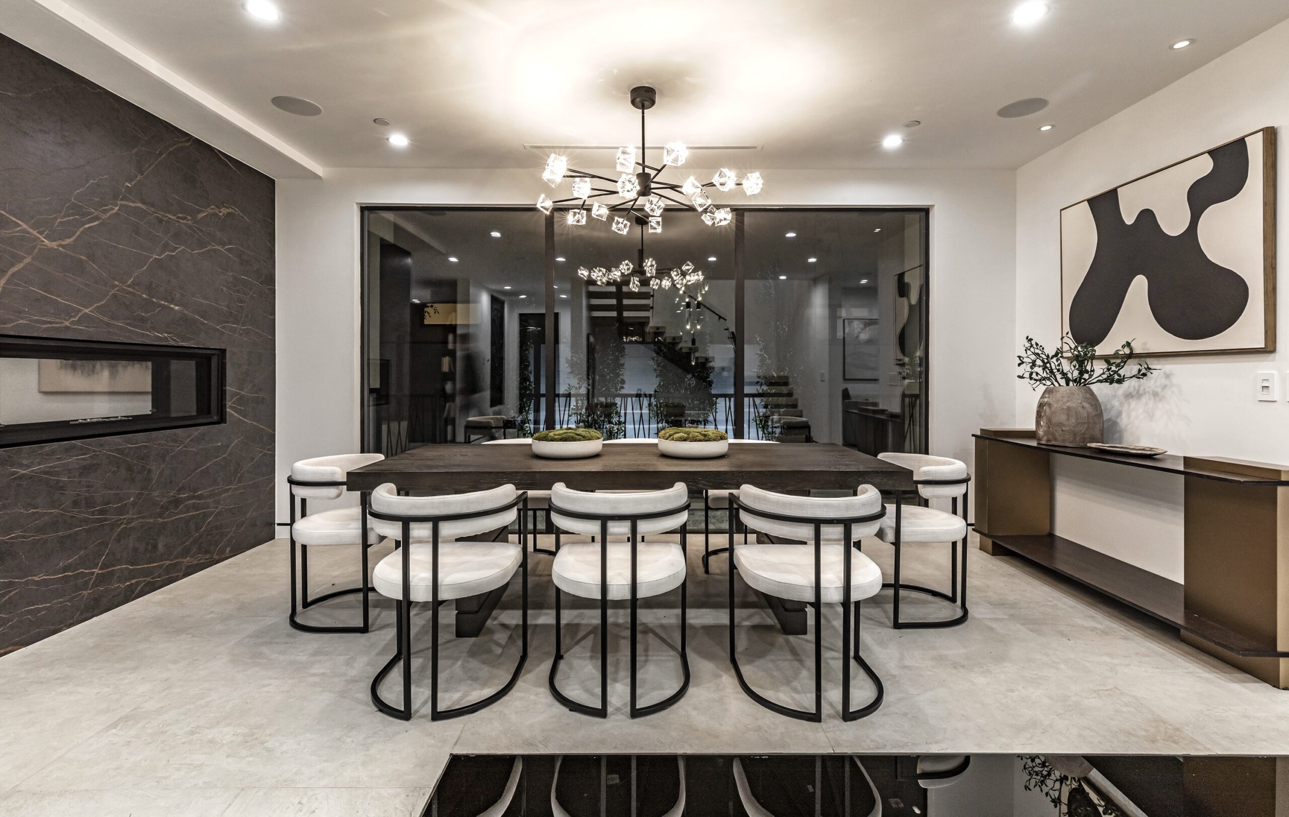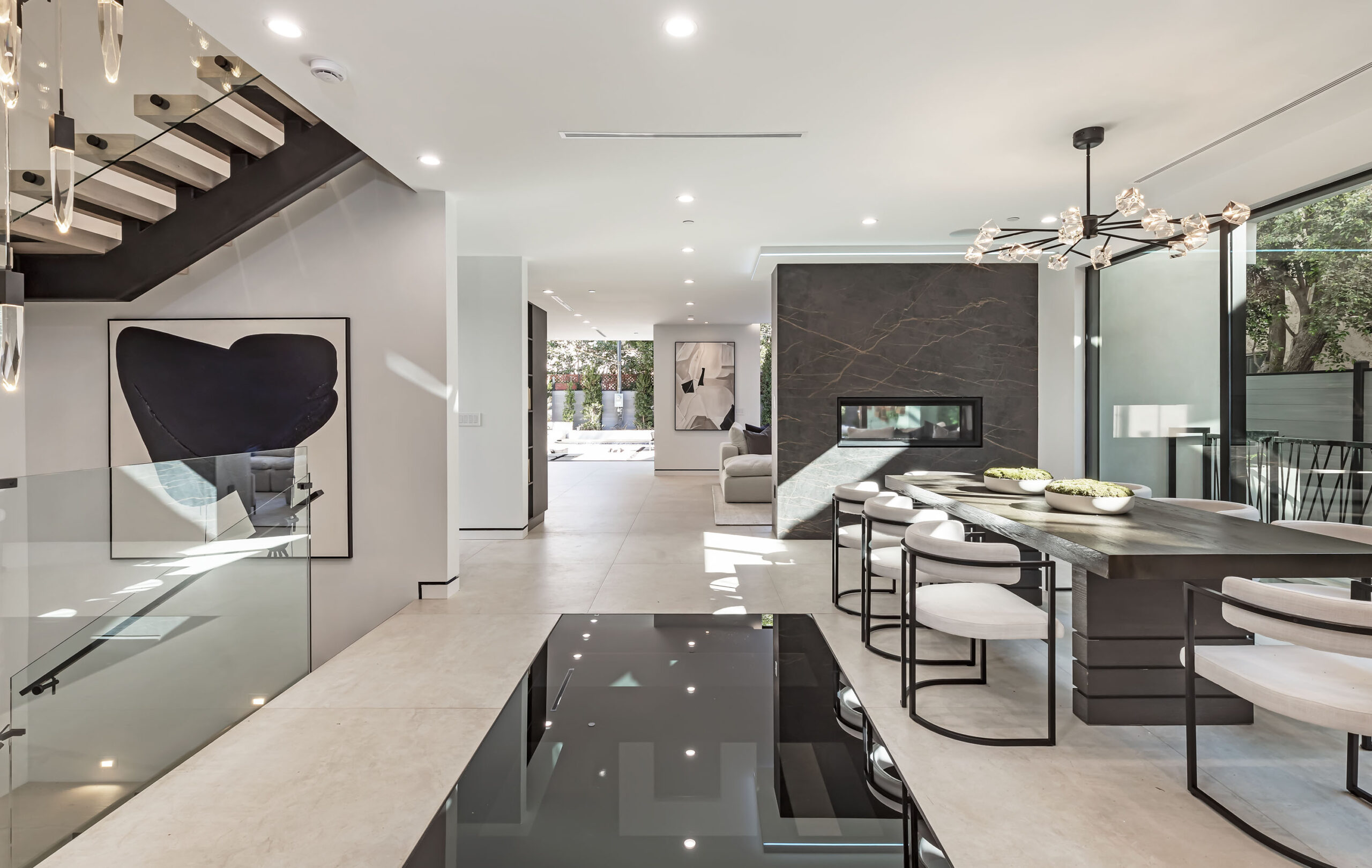 Designed by the renowned firm Amit Apel Design, 930 N La Jolla Avenue is the jewel of the street, a newly built modern architectural masterpiece. Set in the heart of West Hollywood, this stunning home offers unparalleled access to world-class shopping, dining, and entertainment. Enter to an expansive open floor plan that seamlessly blends indoor and outdoor living. Be guided to the formal dining room by a thoughtfully designed black glass floor accent that looks down to the lower level. The dining room features a dramatic chandelier, a fireplace, and a floor-to-ceiling glass wall, creating a perfect atmosphere for both intimate gatherings and grand entertaining. The sleek living room effortlessly flows into the contemporary kitchen, complete with an oversized eat-in waterfall island, German cabinetry, top-of-the-line Miele appliances, and striking Dekton countertops. Disappearing walls of glass open to the entertainer's dream backyard, where you'll find a sunken fire pit seating area, a smart home-ready pool and spa with micro-LED lighting, a built-in pool cover, and ample outdoor space for al fresco living. Upstairs, the second floor boasts an opulent primary suite, highlighted by vaulted ceilings reaching up to 14 feet, a private balcony with views of the yard, and a luxurious ensuite bath featuring a soaker tub, glass shower, dual-sink floating vanity, and two spacious walk-in closets. The guest bedrooms include en suite baths, plus two feature private balconies, each with captivating treetop and Hollywood Hills views. Below awaits the sprawling 2,000 sqft basement, which boasts a large soundproof home theater (can also be converted into a music studio), multiple living spaces, bonus rooms for bedrooms and/or a gym, and a Clear Canadian cedar sauna with a Himalayan salt insert, as well as IPE flooring. This one-of-a-kind property is equipped with cutting-edge technology and finishes, including three HVAC systems, Fleetwood windows and doors, a 'Zoeller' pump system, low-water consumption toilets, central audio, and Wi-Fi extenders. This unique home is the ultimate in luxury living, offering unmatched sophistication and style in one of the most coveted neighborhoods of Los Angeles.