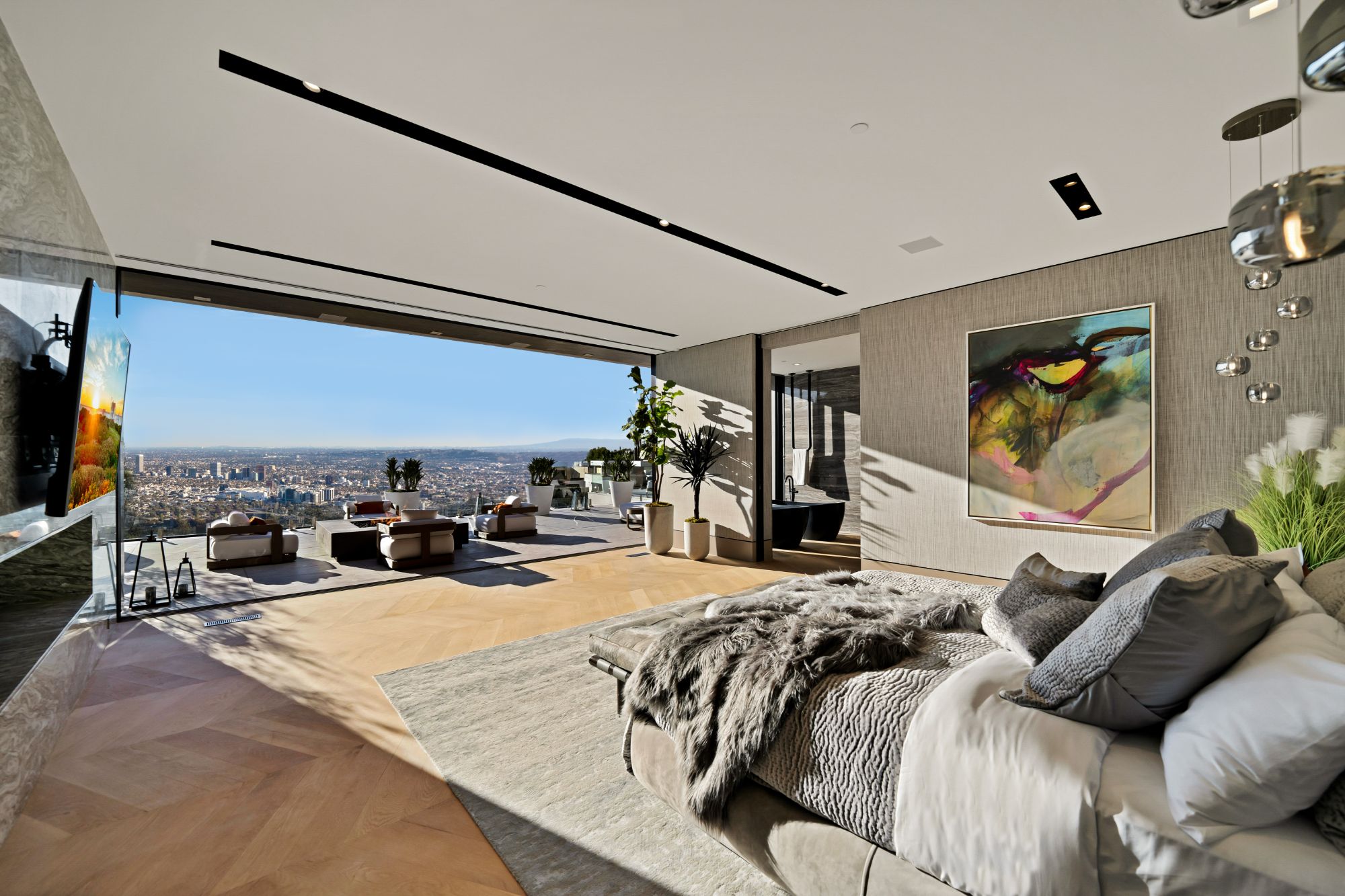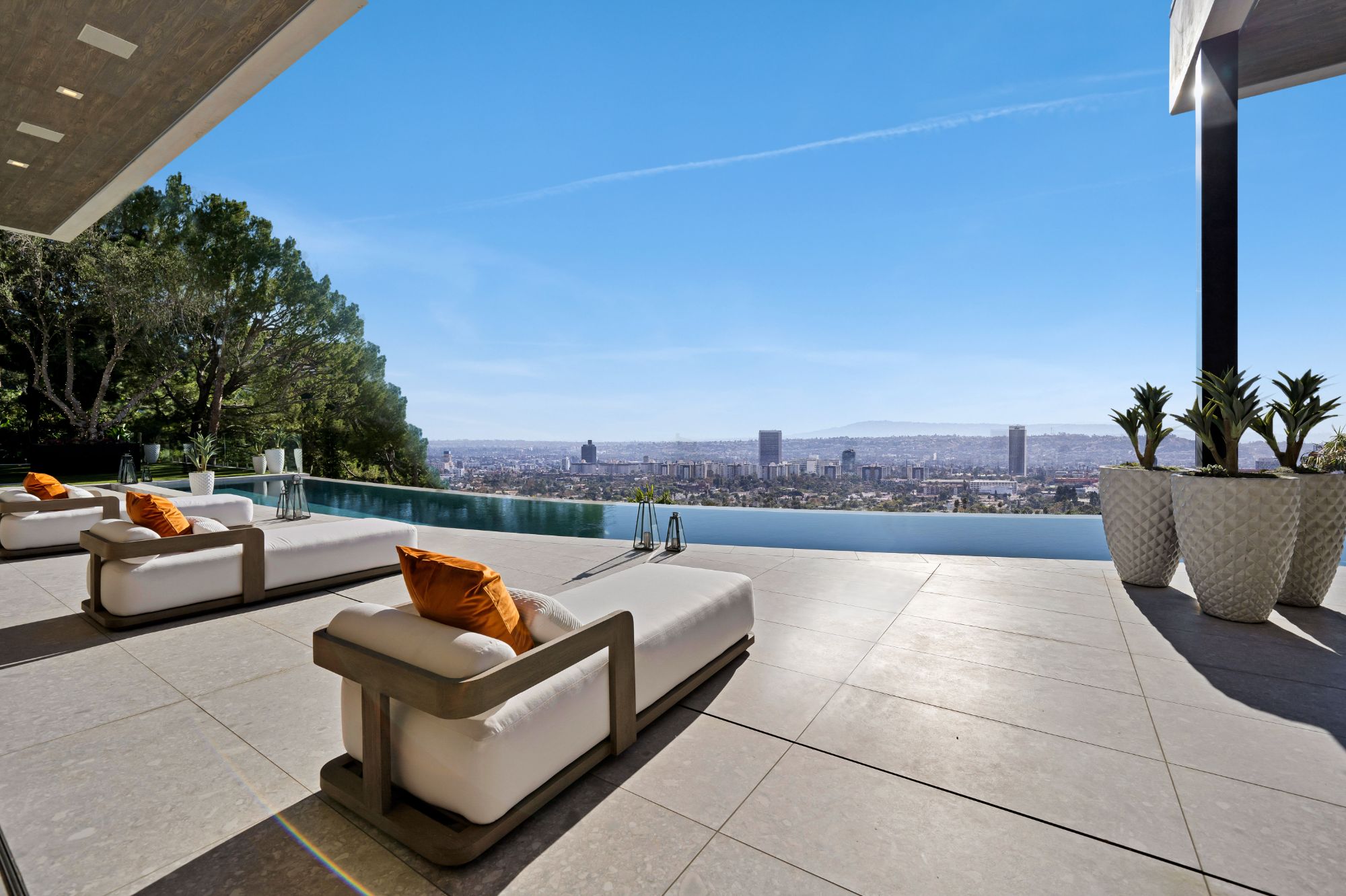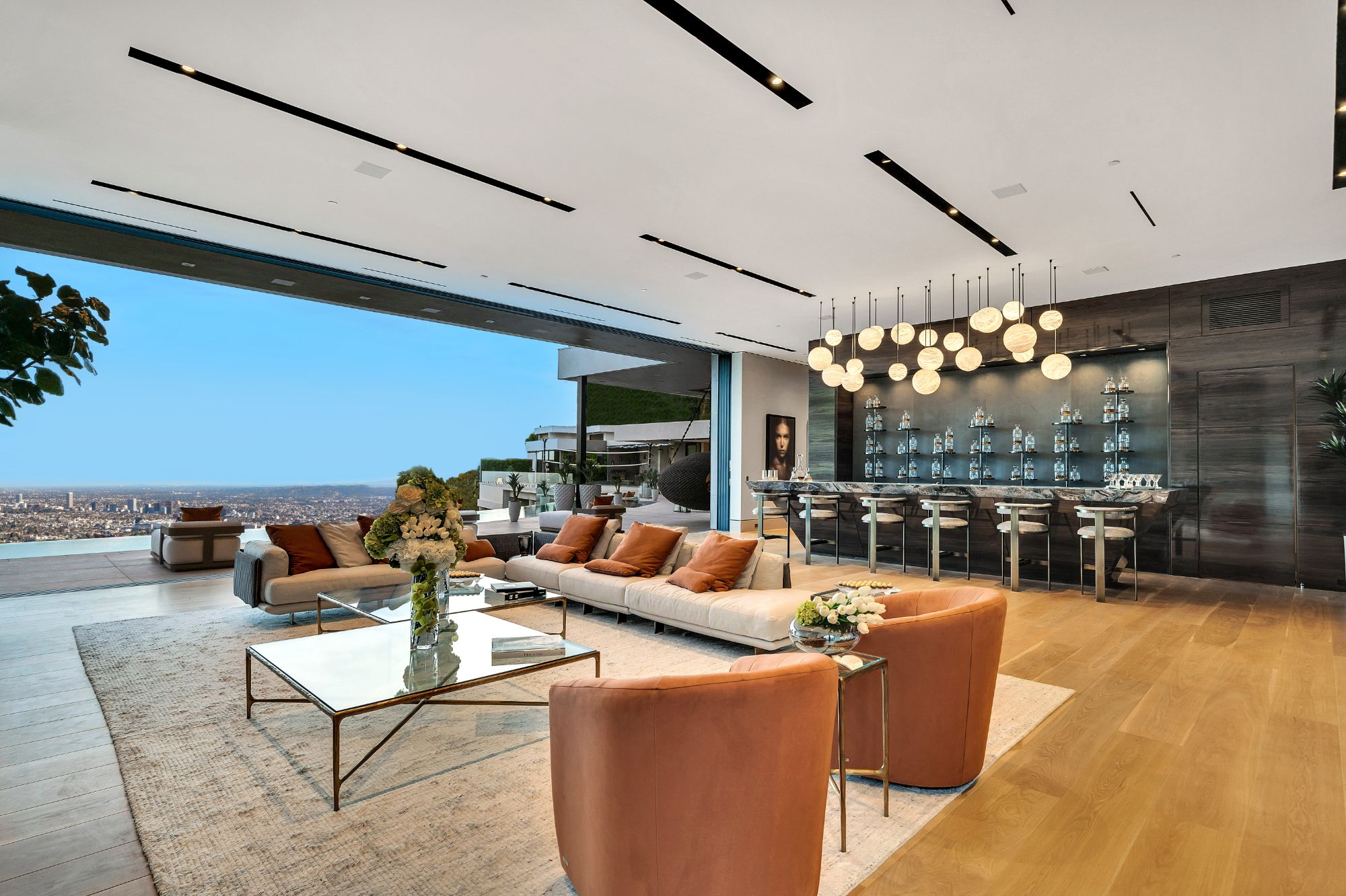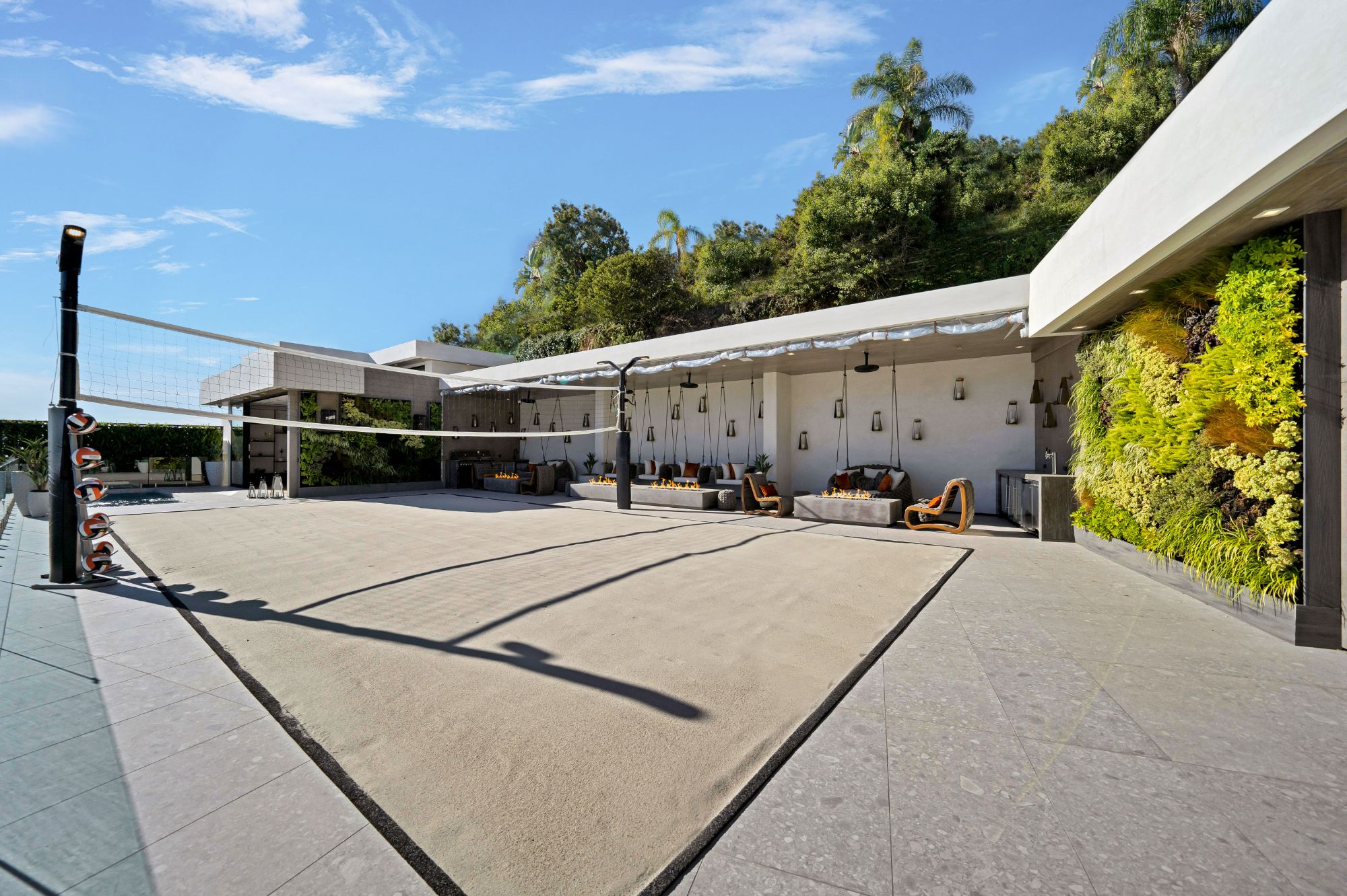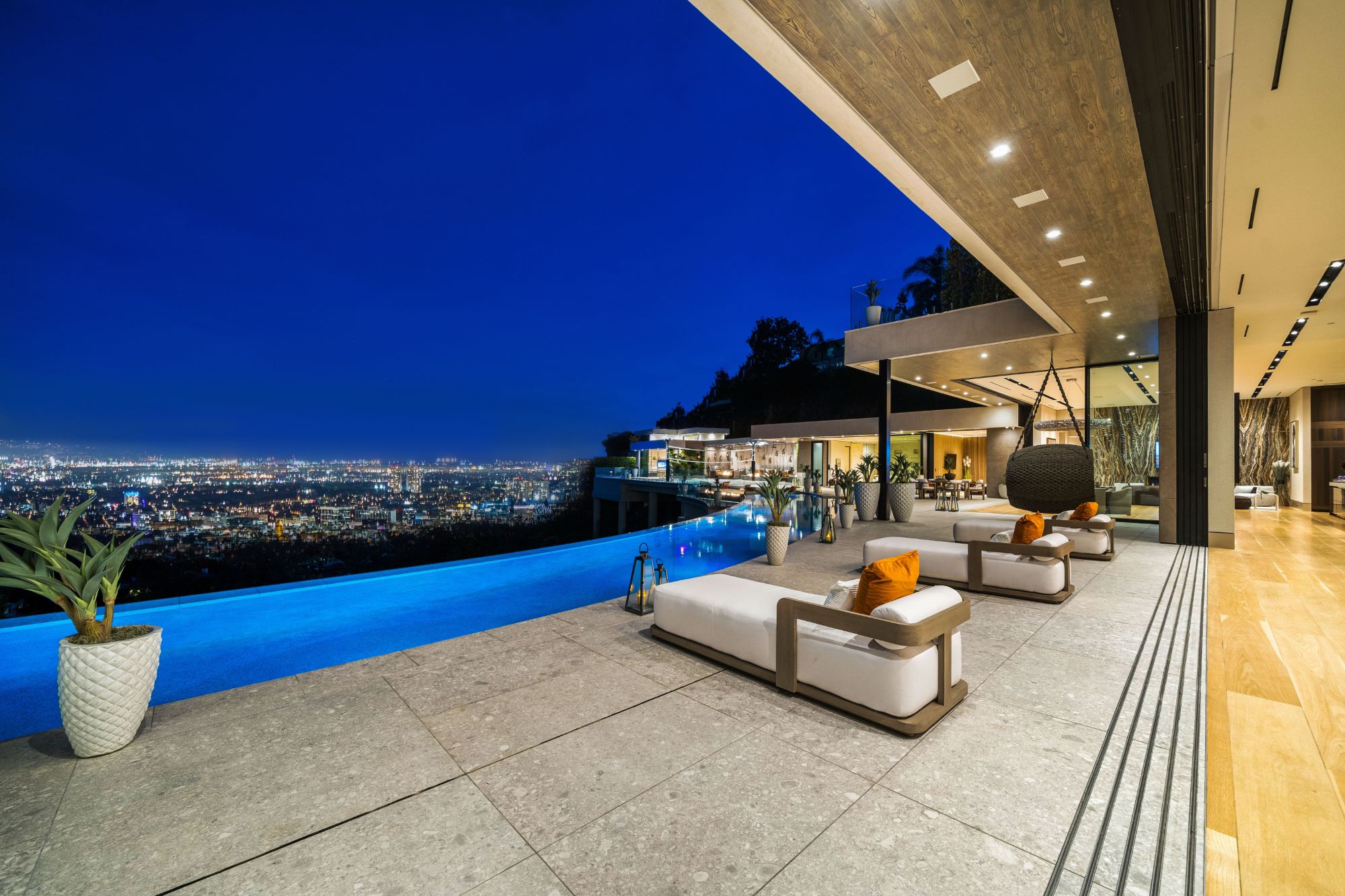 Seller accepts crypto! Conceived and executed with the modern mogul's ambition top of mind, this newly constructed palace offers sweeping, uninterrupted views of the canyon and Los Angeles skyline, spanning 500 feet of frontage in a coveted Bird Streets enclave. Enter beneath a bespoke chandelier and cascading fountains into a 13-foot living room anchored by layered stone fireplaces. The Arclinea kitchen opens to a European-inspired wine room illuminated by a sculptural pendant. Floor-to-ceiling glass panels dissolve the line between indoors and outdoors, revealing expansive terraces with an 18-foot sunken fire pit, a 100-foot infinity pool, a 30-person spa, and a sand volleyball court, each set against sweeping vistas. The primary suite serves as a private retreat, featuring a reading vestibule, a 1,500-square-foot balcony with Jacuzzi and fire features, dual dressing rooms, and a travertine-clad bath with twin soaking tubs and panoramic views. Tailored for both comfort and spectacle, the home also includes a command center-style office, a full screening room, a gym, hookah and meditation lounges, a panic room, a shoeshine station, and more. Designed with intent, the residence is as functional as it is striking. Revel in the pinnacle of modern elegance, all while being enveloped by some of Southern California's most breathtaking views.