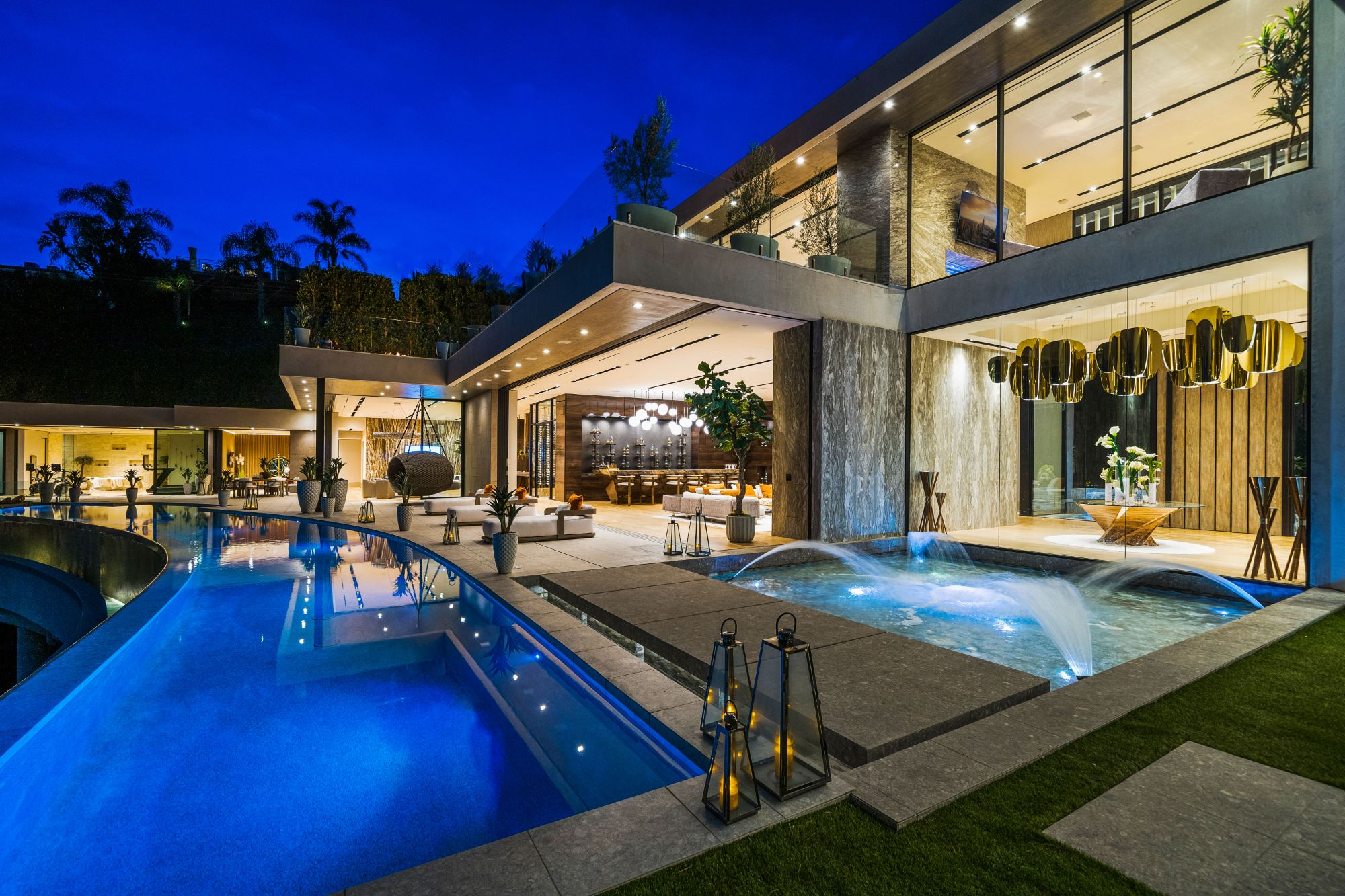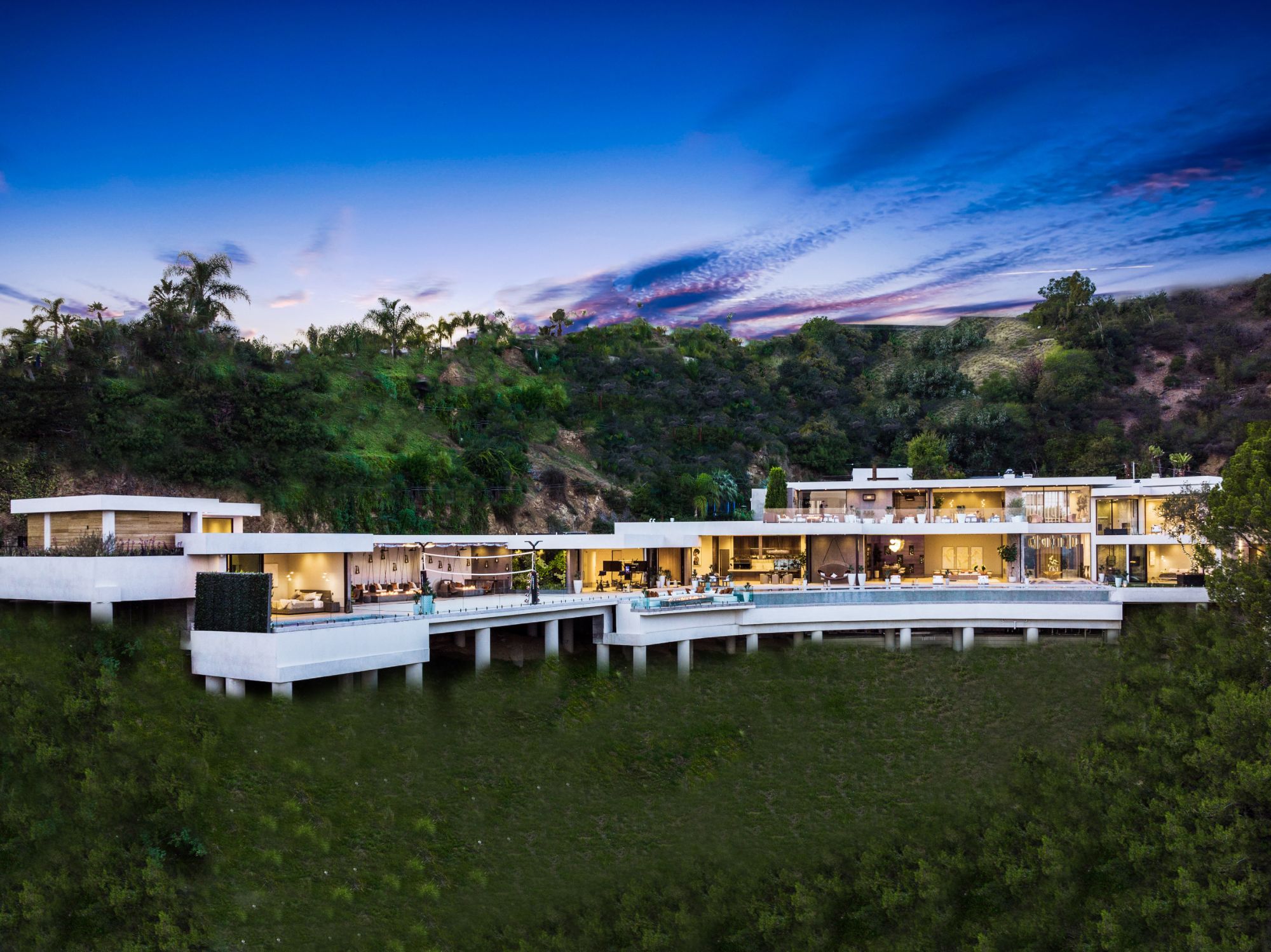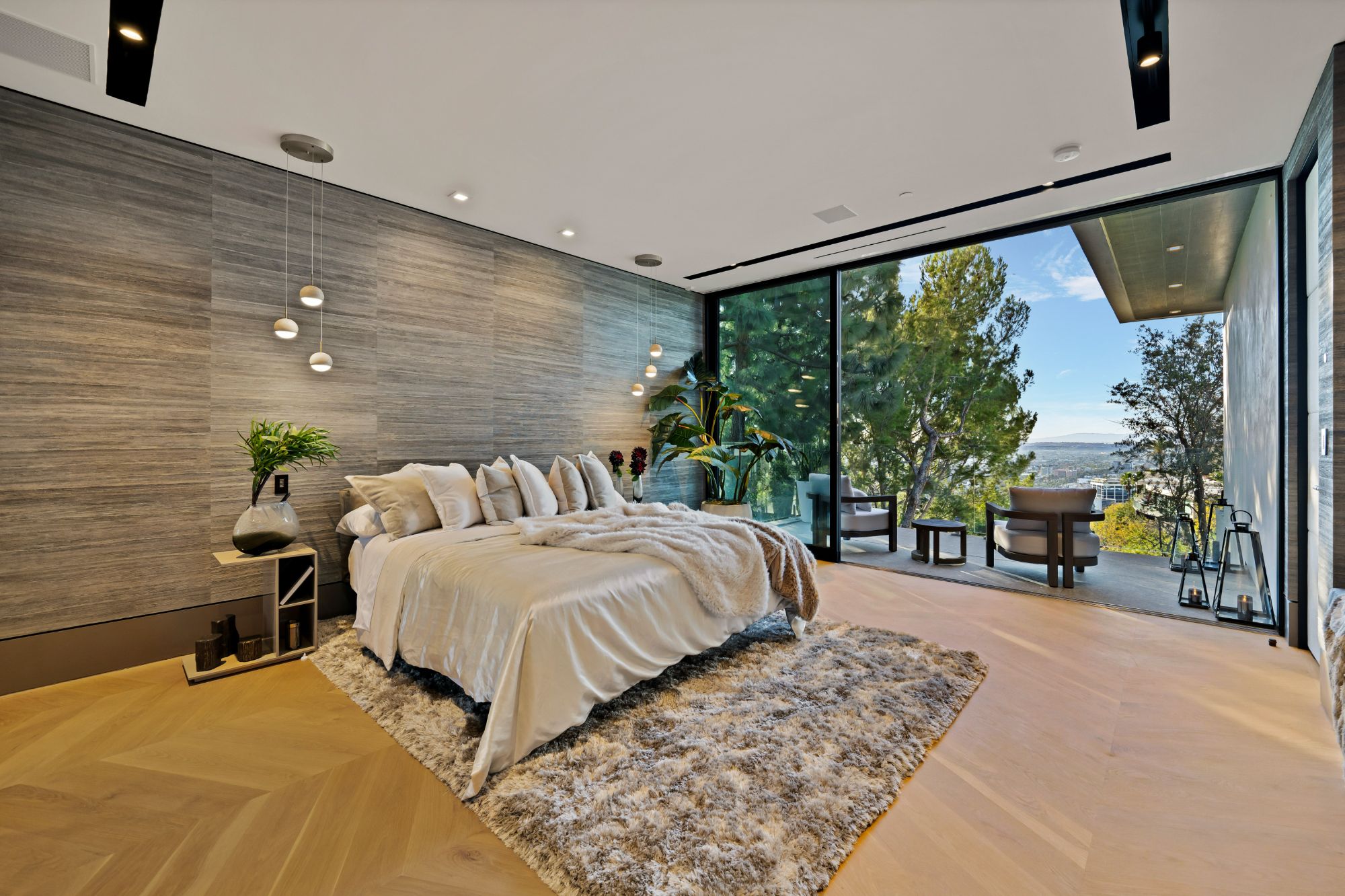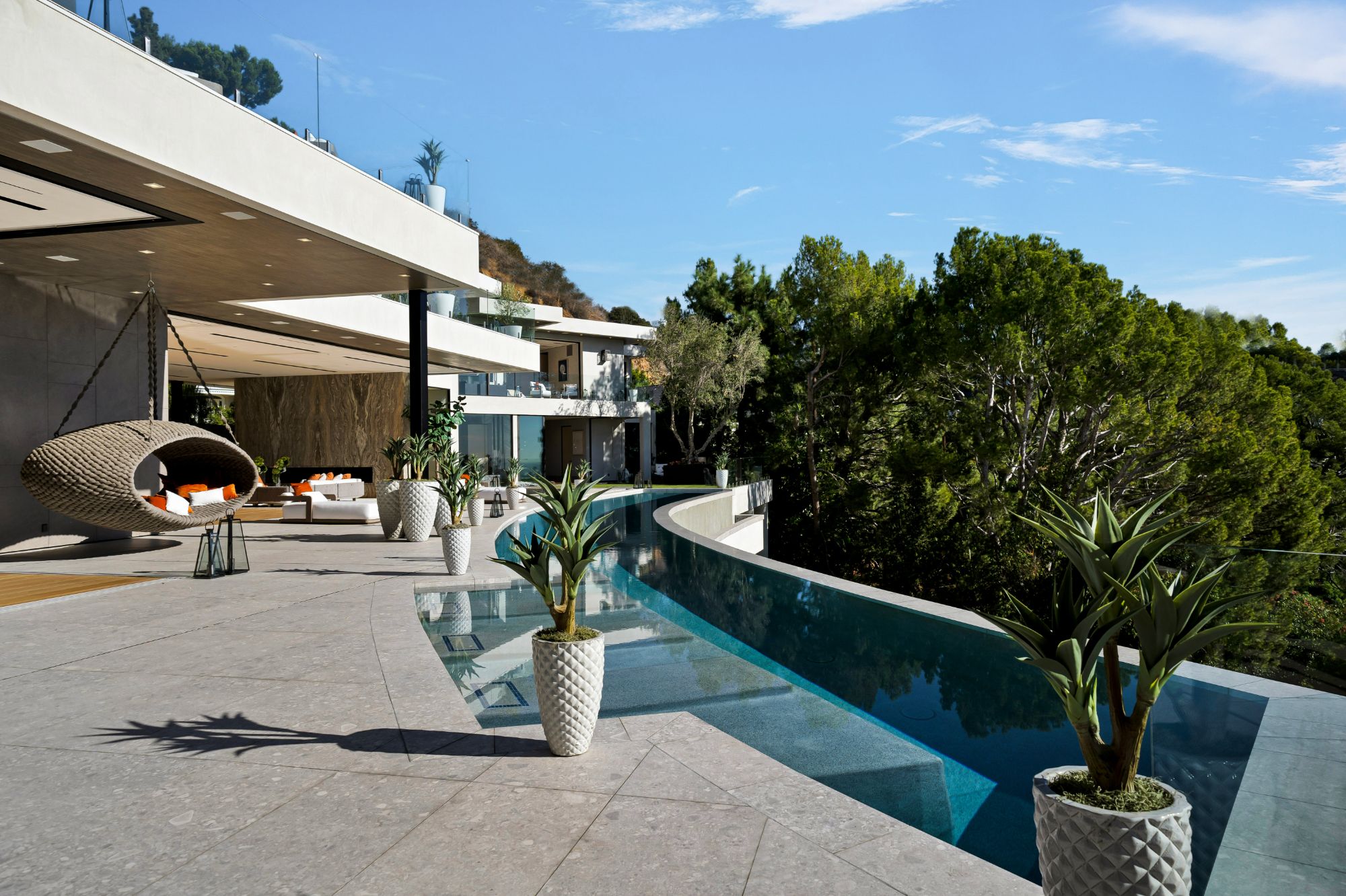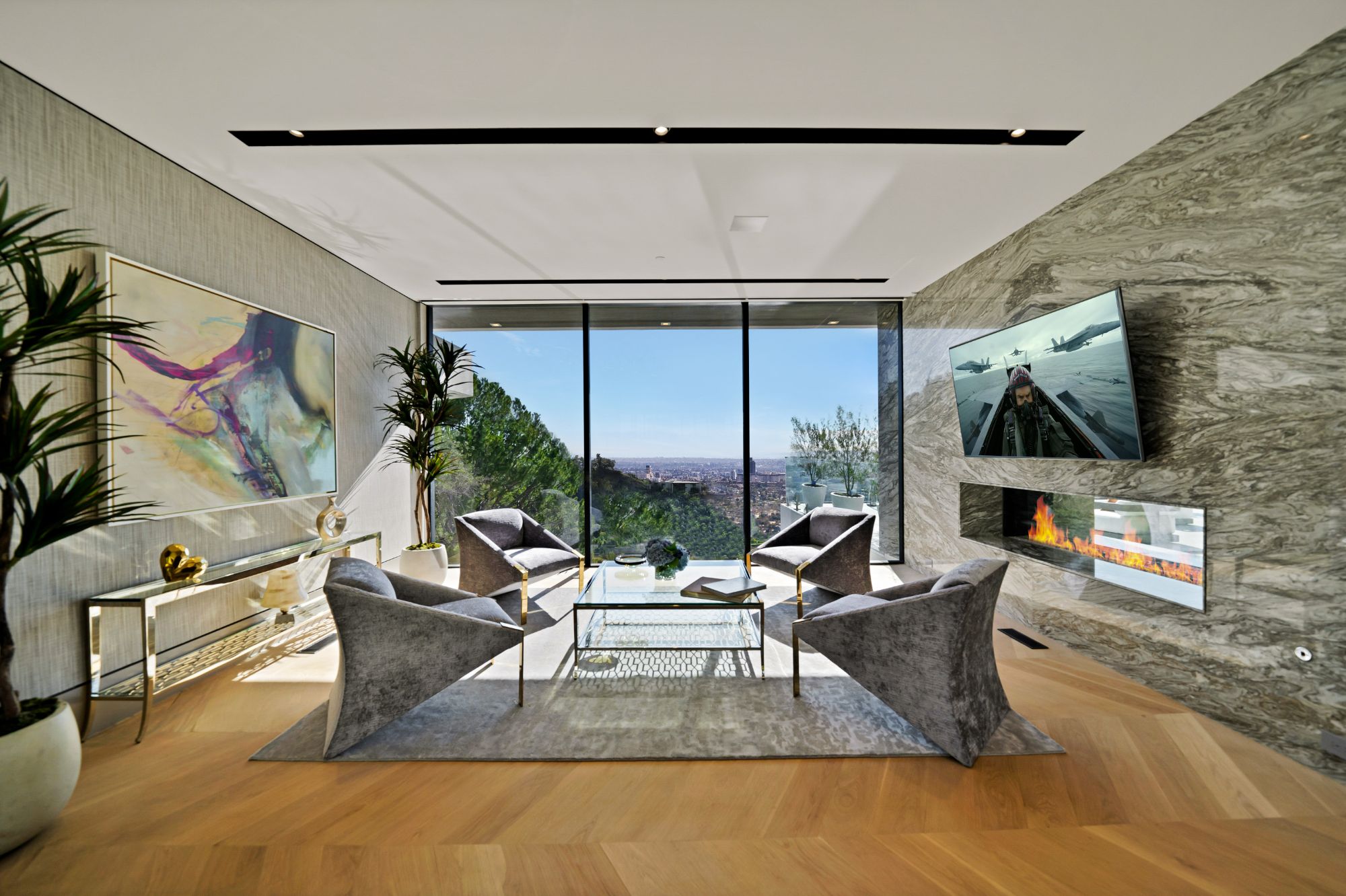 Seller accepts crypto! Conceived and executed with the modern mogul's ambition top of mind, this newly constructed palace offers sweeping, uninterrupted views of the canyon and Los Angeles skyline, spanning 500 feet of frontage in a coveted Bird Streets enclave. Enter beneath a bespoke chandelier and cascading fountains into a 13-foot living room anchored by layered stone fireplaces. The Arclinea kitchen opens to a European-inspired wine room illuminated by a sculptural pendant. Floor-to-ceiling glass panels dissolve the line between indoors and outdoors, revealing expansive terraces with an 18-foot sunken fire pit, a 100-foot infinity pool, a 30-person spa, and a sand volleyball court, each set against sweeping vistas. The primary suite serves as a private retreat, featuring a reading vestibule, a 1,500-square-foot balcony with Jacuzzi and fire features, dual dressing rooms, and a travertine-clad bath with twin soaking tubs and panoramic views. Tailored for both comfort and spectacle, the home also includes a command center-style office, a full screening room, a gym, hookah and meditation lounges, a panic room, a shoeshine station, and more. Designed with intent, the residence is as functional as it is striking. Revel in the pinnacle of modern elegance, all while being enveloped by some of Southern California's most breathtaking views.