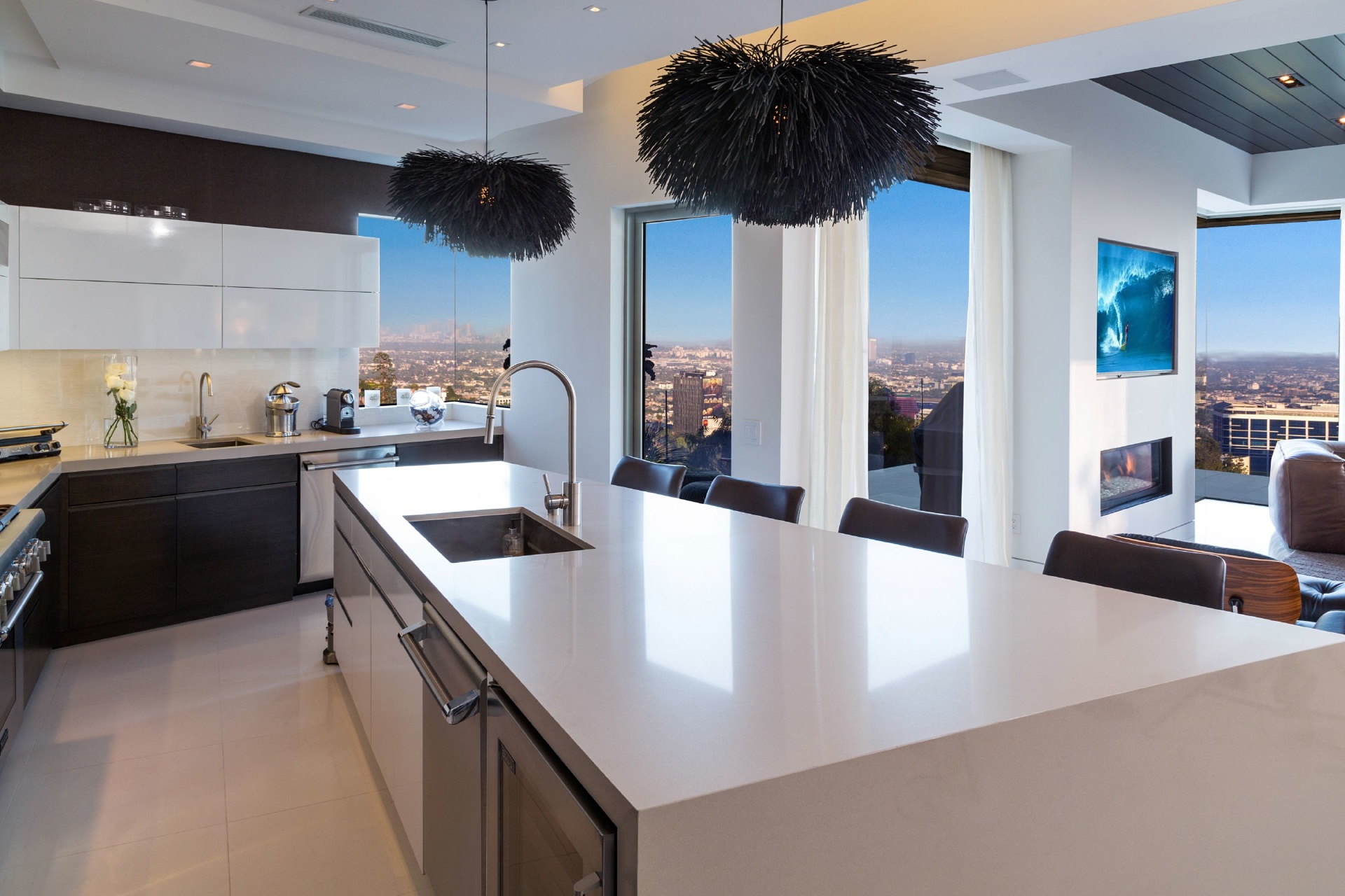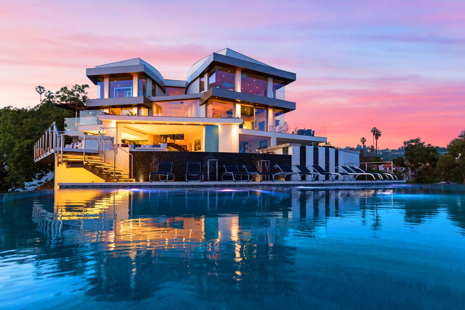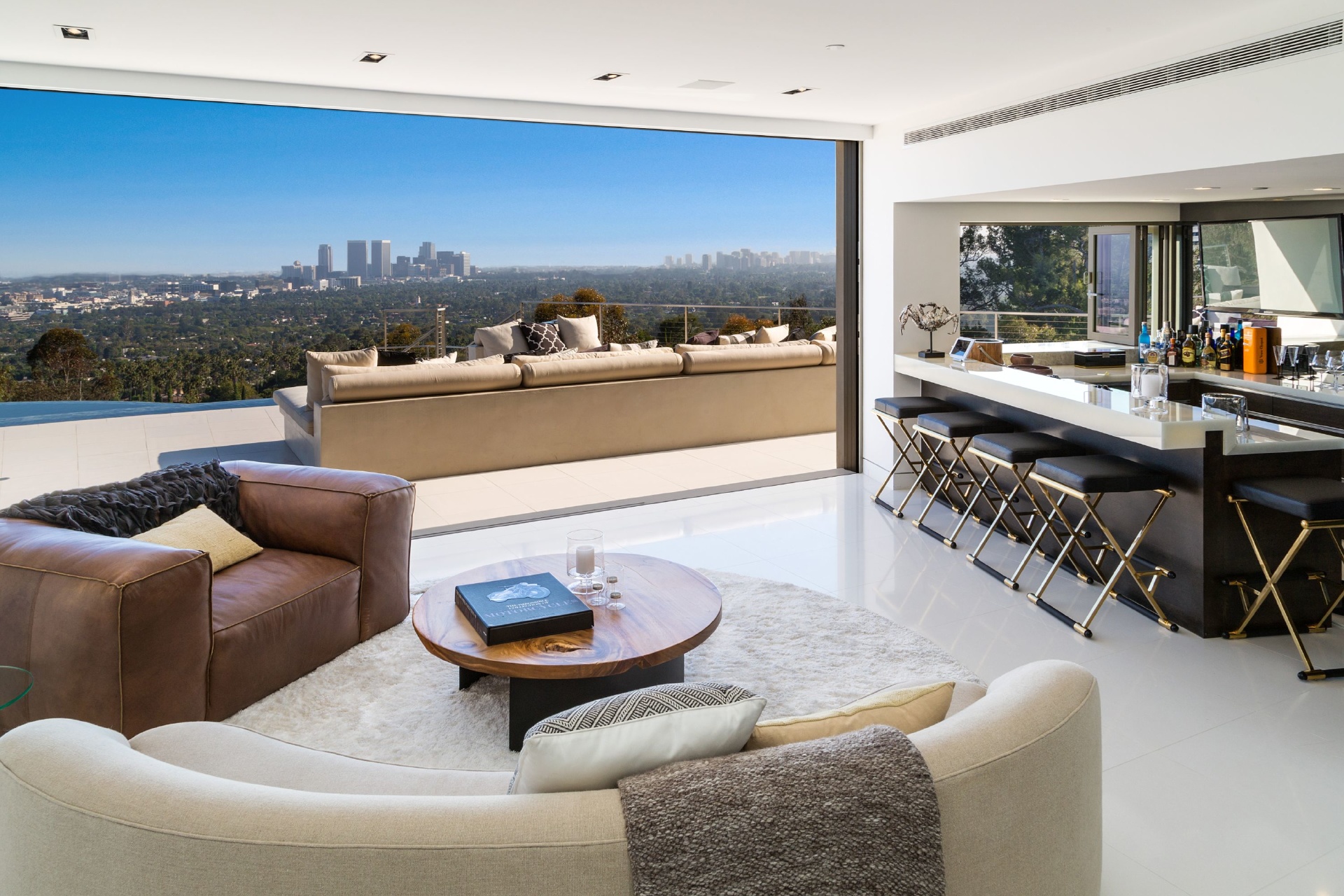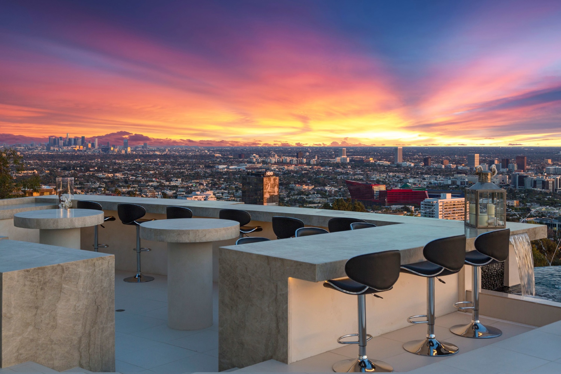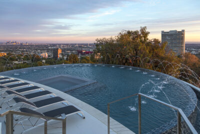 Modern architecture with all the latest & greatest amenities, built on one of the Bird Streets finest promontories with explosive views from downtown to the ocean & everything in between. This luxury residence is a true modern work of art located on a quiet cul-de-sac above the Sunset Strip. A spacious, luxurious master suite includes skylights, large closets, separate handbag & shoe rooms and American walnut flooring throughout. A top-of-the-line Italian kitchen with amenities that include Thermador appliances, Caesarstone countertops, two ovens & two dishwashers. Dining area includes Tiffany dining table & Delfin swivel chairs. Outdoor entertainment deck boasts an 1,800 SF infinity pool, 8-ft. fire pit, alfresco dining areas & more. Complete w/ every modern amenity imaginable including a home theater w/ seating for ten in plush reclining sofas, LED lighting, home automation system & a home gym. Live among the stars & titans of industry in the iconic trophy estate.