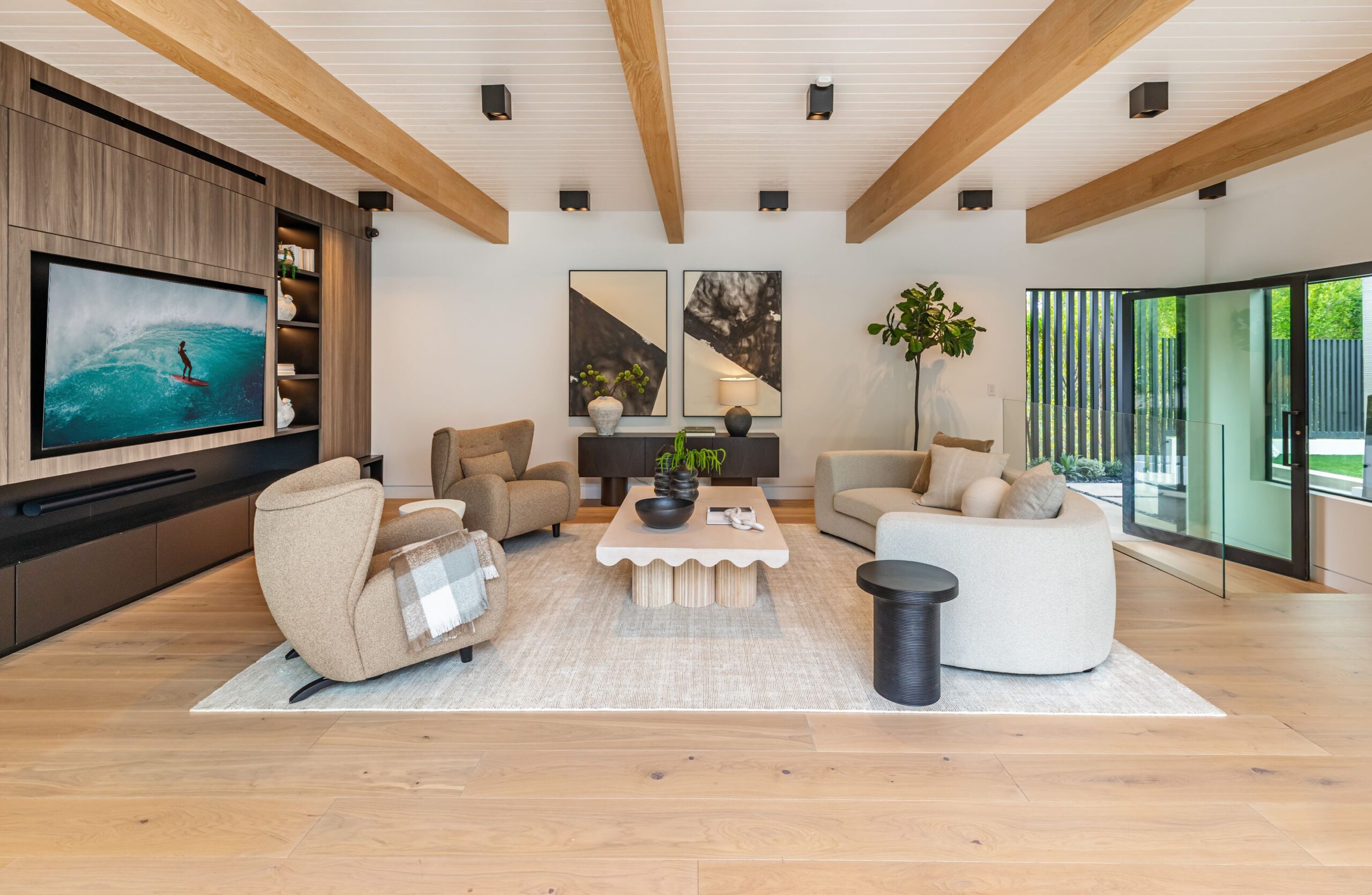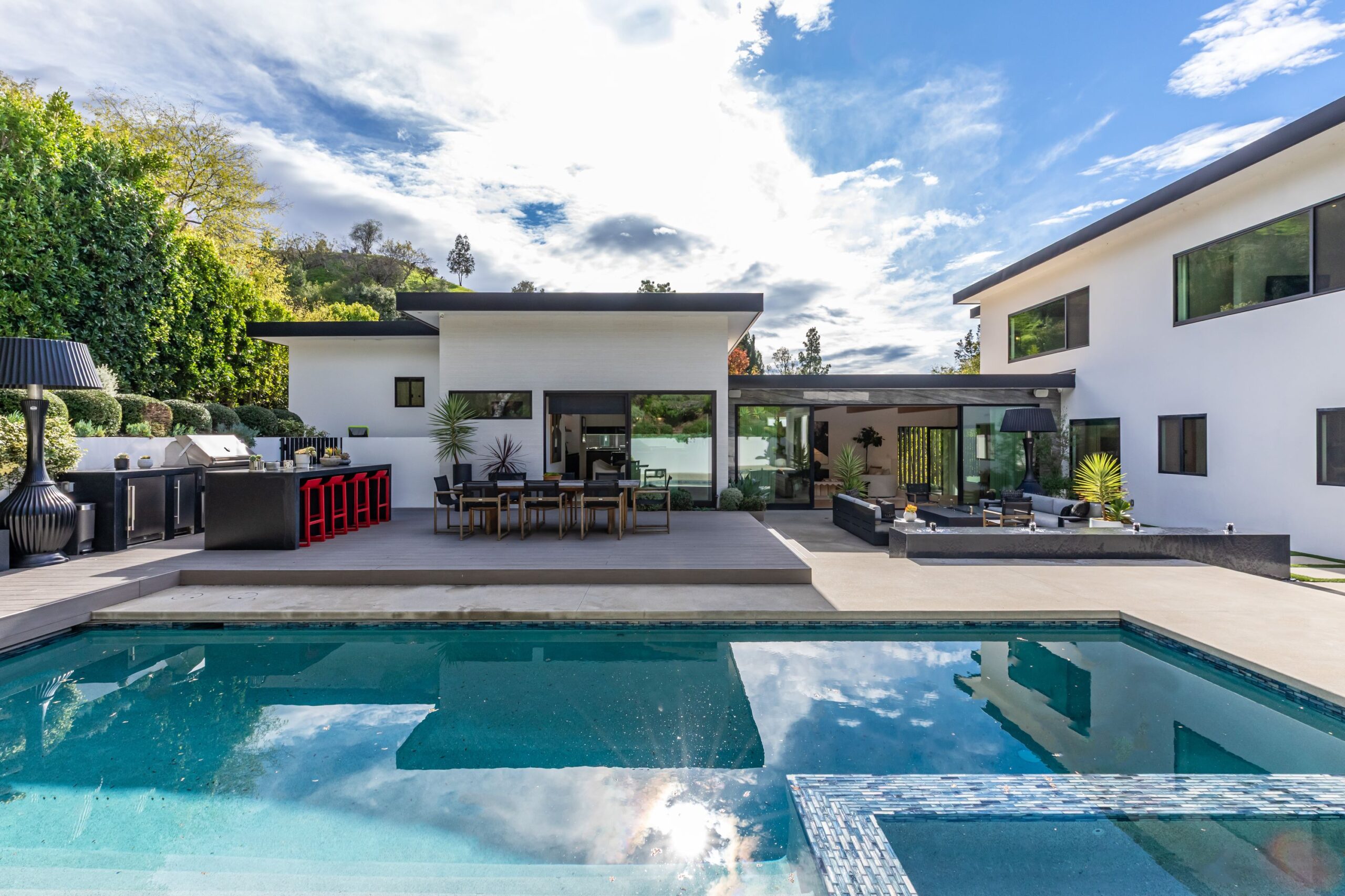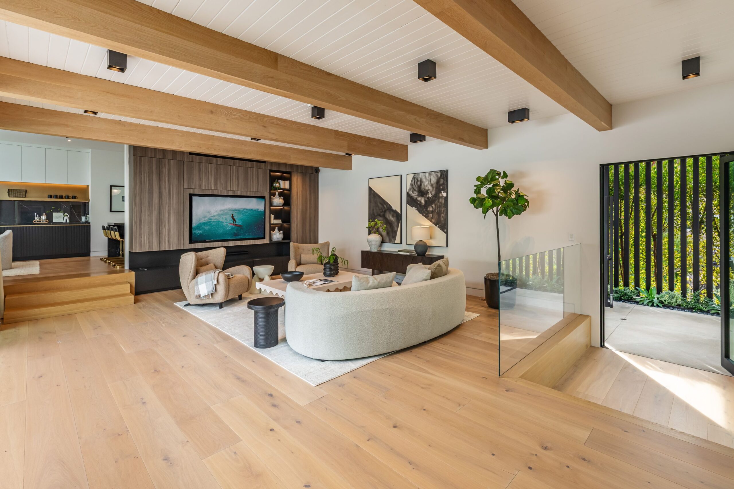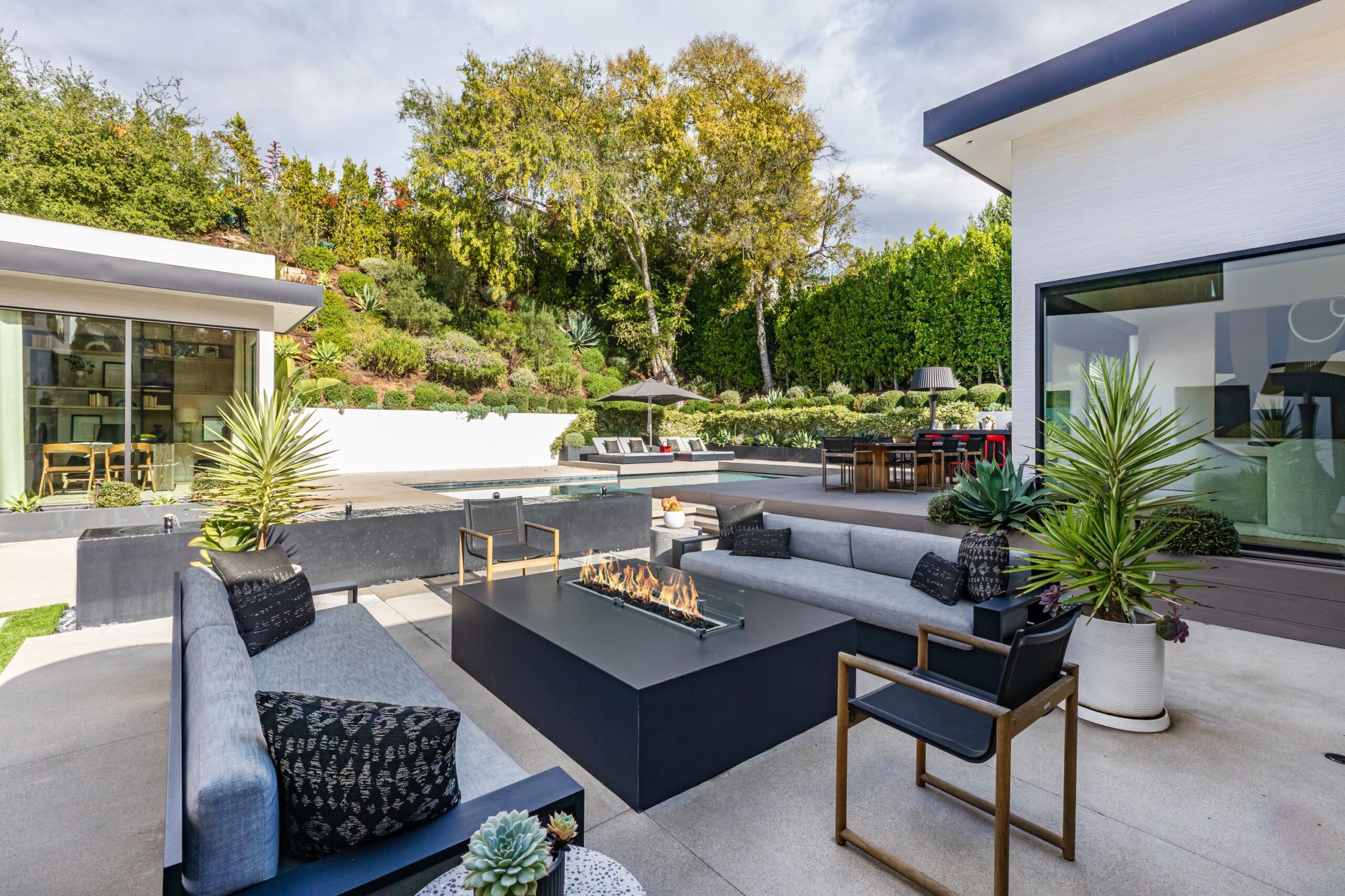 Fully renovated modern home in BHPO on a quiet street in Coldwater Canyon. Just beyond the front door, the formal living room has beamed ceilings and looks out to the spacious backyard. The dining room conveniently blends into the kitchen which features gorgeous black porcelain counters and high-end appliances, including double Sub-Zero refrigerators and 48-inch Wolf range. Glass walls allow natural light to fill the space and highlight the beautiful finishes and textures of the home, Fleetwood windows and doors throughout. The spacious primary suite features build projector and drop-down 130-inch screen, and offers a tranquil spa-like bathroom. Oversized sliding doors open for seamless indoor/outdoor living and entertaining featuring six-zone audio system. The sparkling pool with oversized spa is surrounded by areas for lounging, a built-in fire pit with seating, room for dining al fresco, and lush landscaping. This exquisite home flawlessly combines luxury and tranquility, making it the perfect retreat for sophisticated living and entertaining.