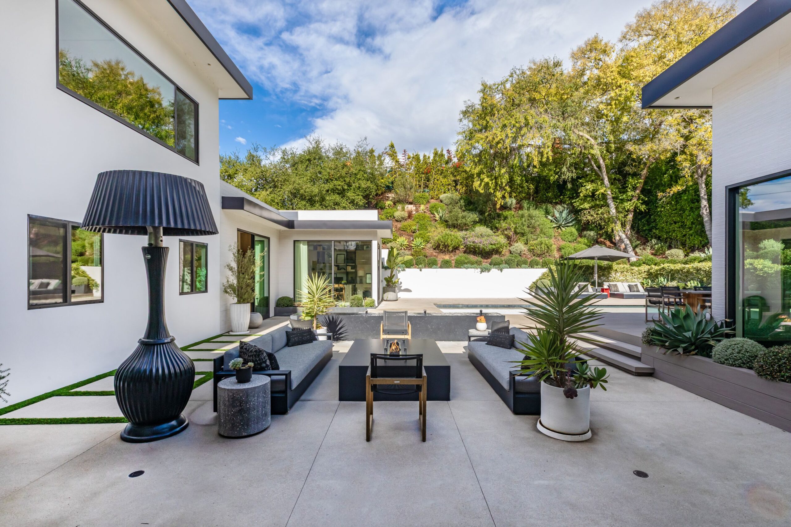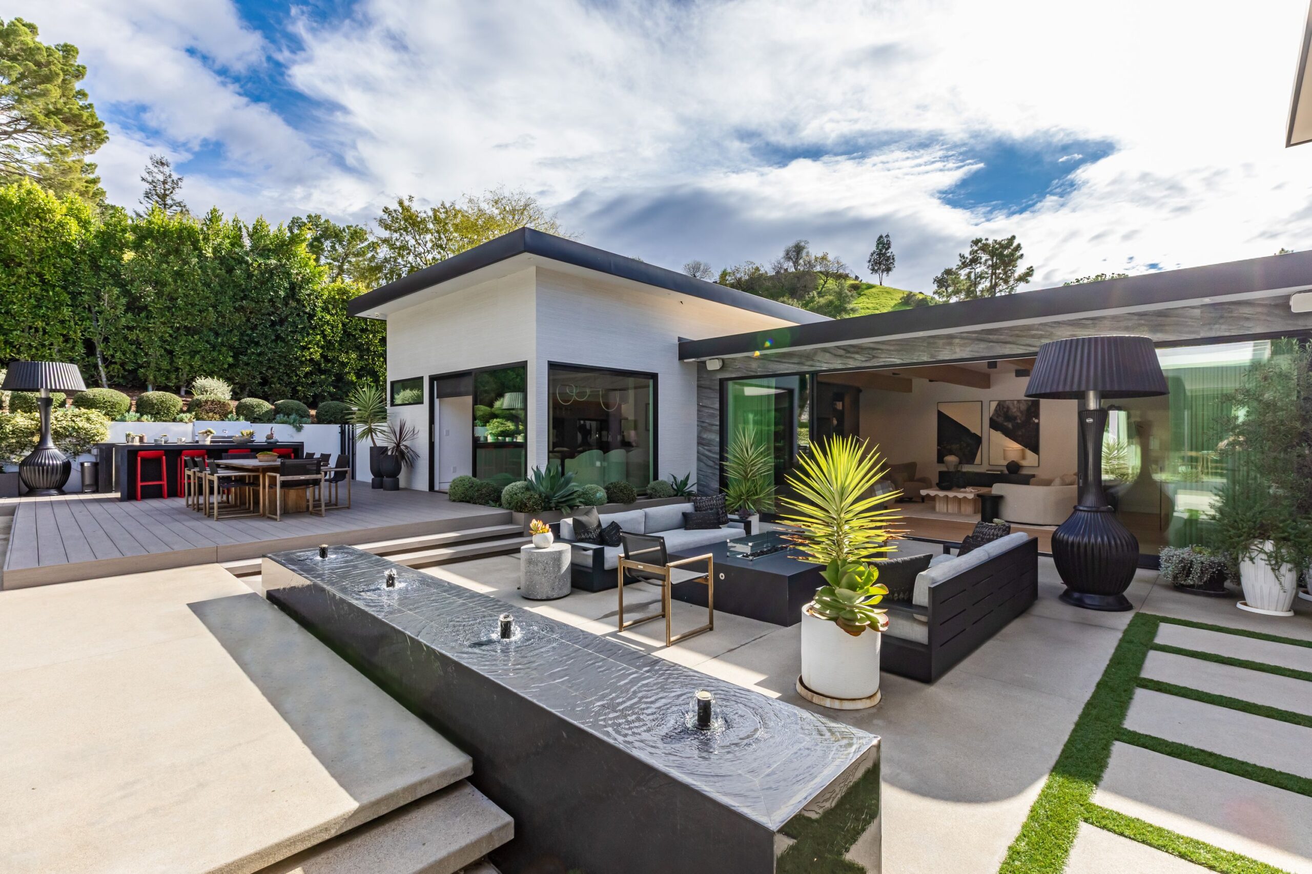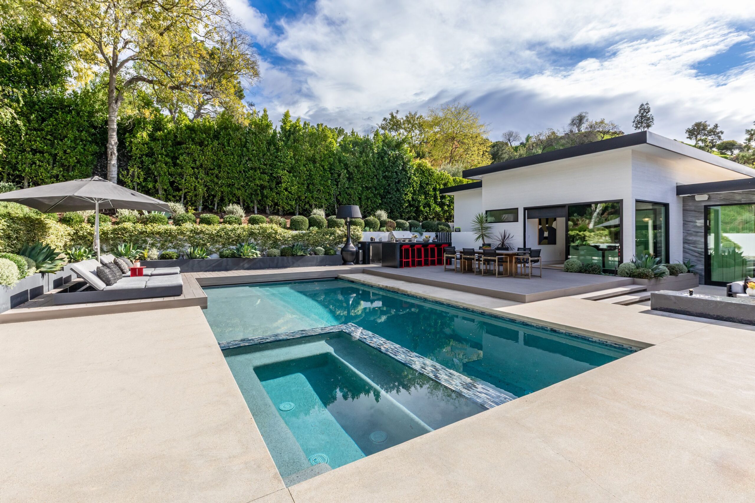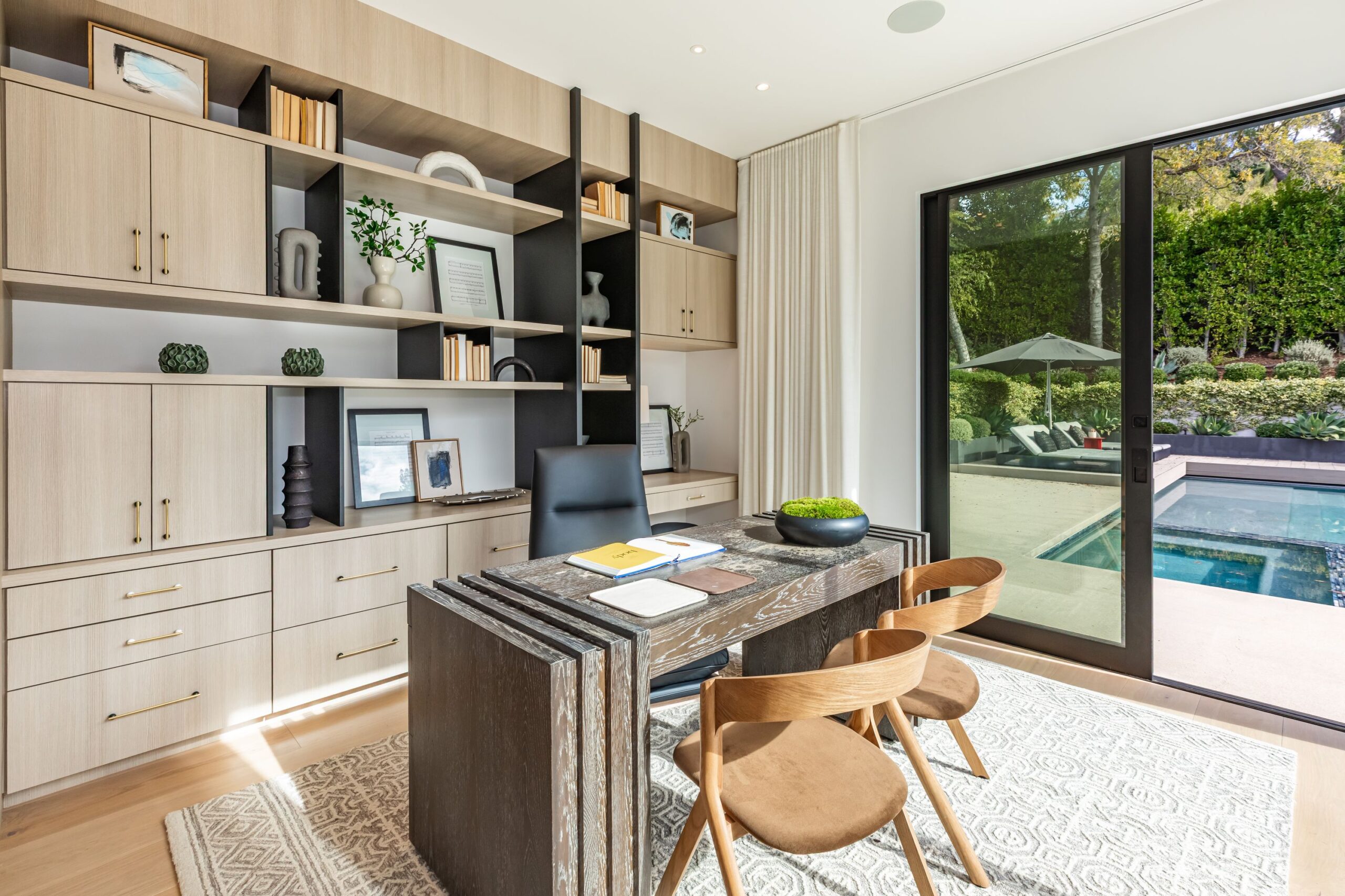 Fully renovated modern home in BHPO on a quiet street in Coldwater Canyon. Just beyond the front door, the formal living room has beamed ceilings and looks out to the spacious backyard. The dining room conveniently blends into the kitchen which features gorgeous black porcelain counters and high-end appliances, including double Sub-Zero refrigerators and 48-inch Wolf range. Glass walls allow natural light to fill the space and highlight the beautiful finishes and textures of the home, Fleetwood windows and doors throughout. The spacious primary suite features build projector and drop-down 130-inch screen, and offers a tranquil spa-like bathroom. Oversized sliding doors open for seamless indoor/outdoor living and entertaining featuring six-zone audio system. The sparkling pool with oversized spa is surrounded by areas for lounging, a built-in fire pit with seating, room for dining al fresco, and lush landscaping. This exquisite home flawlessly combines luxury and tranquility, making it the perfect retreat for sophisticated living and entertaining.