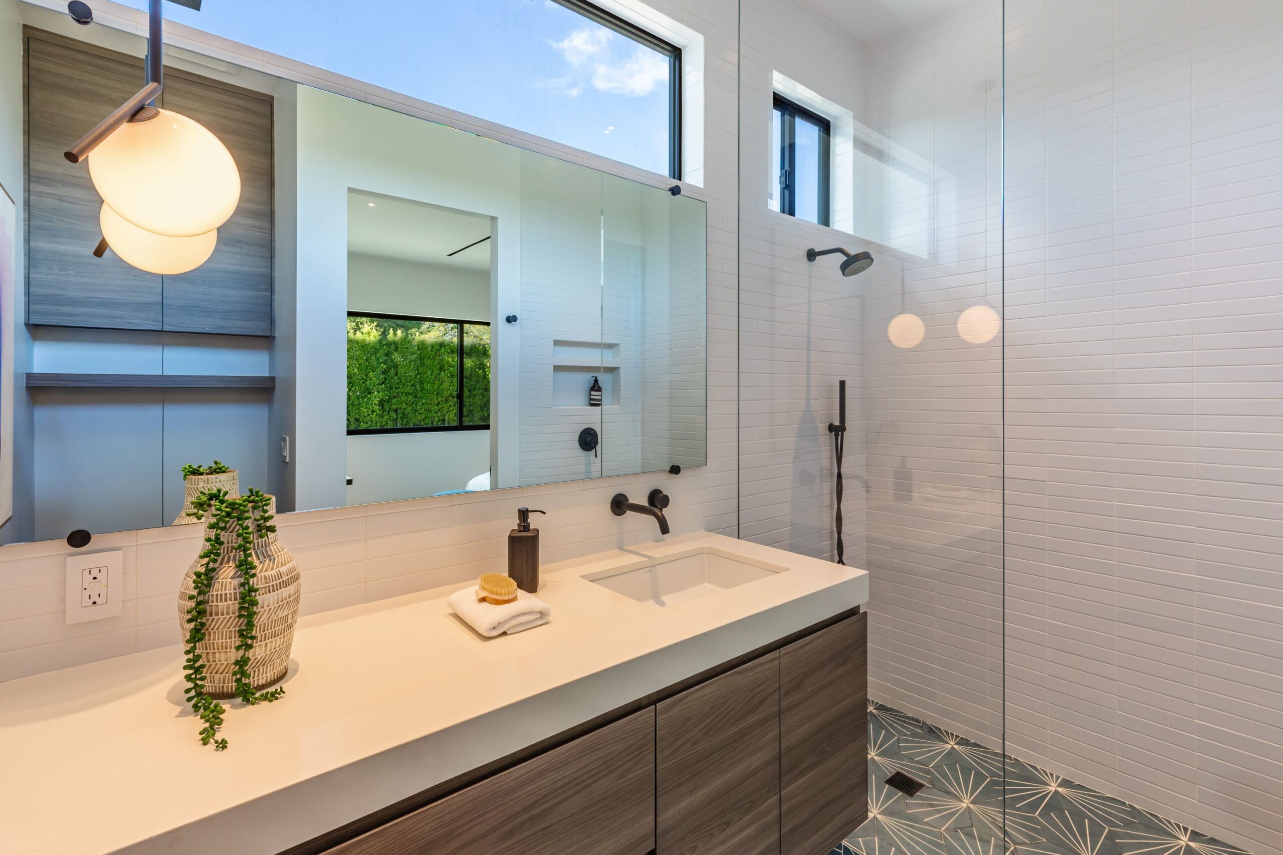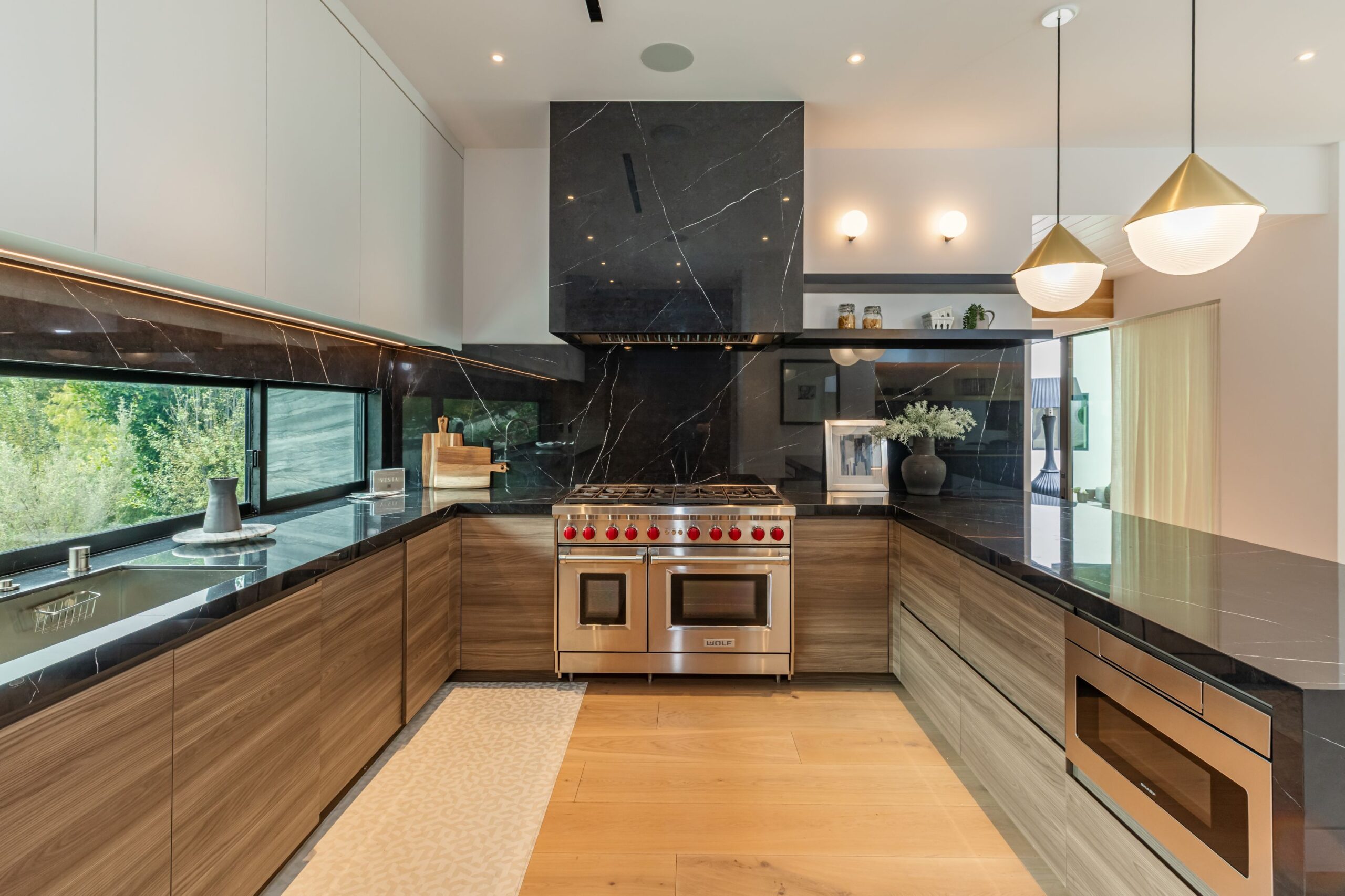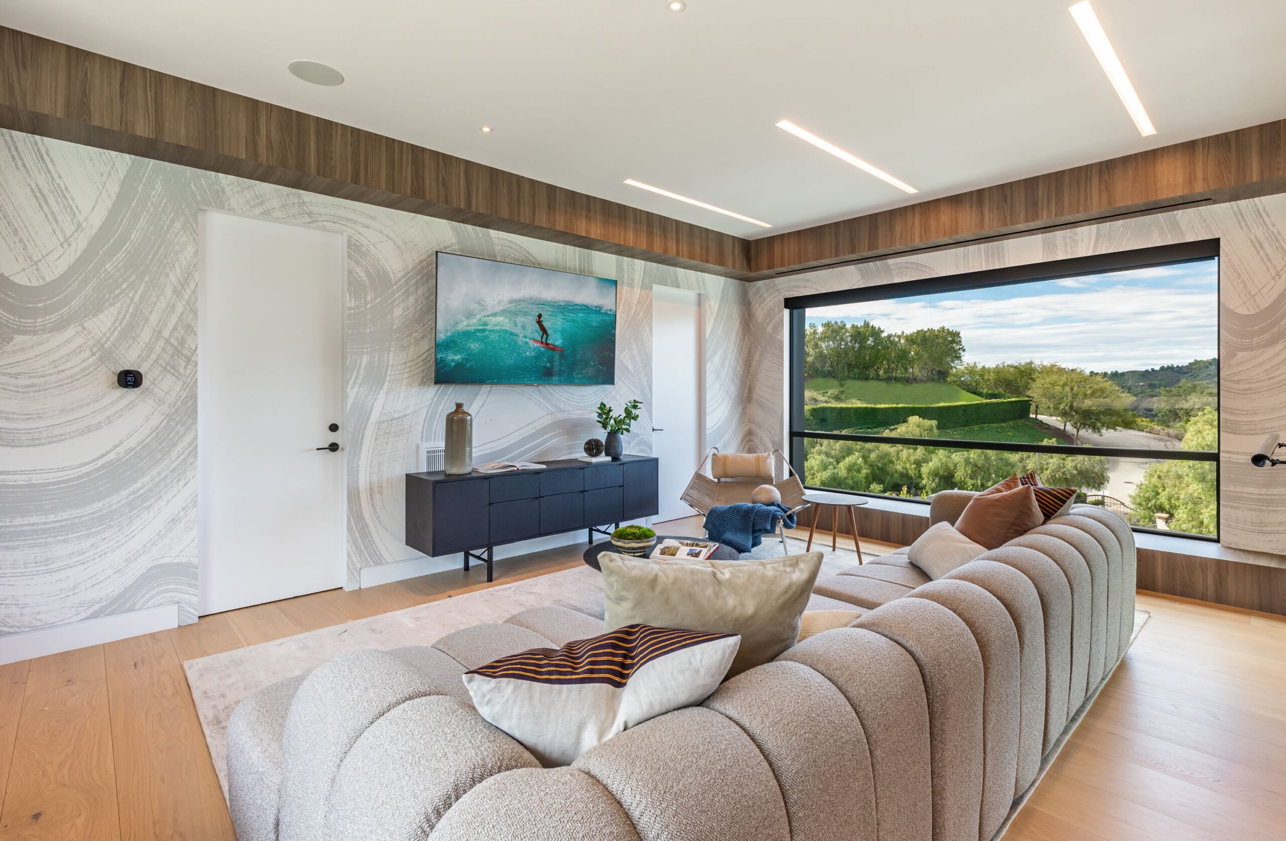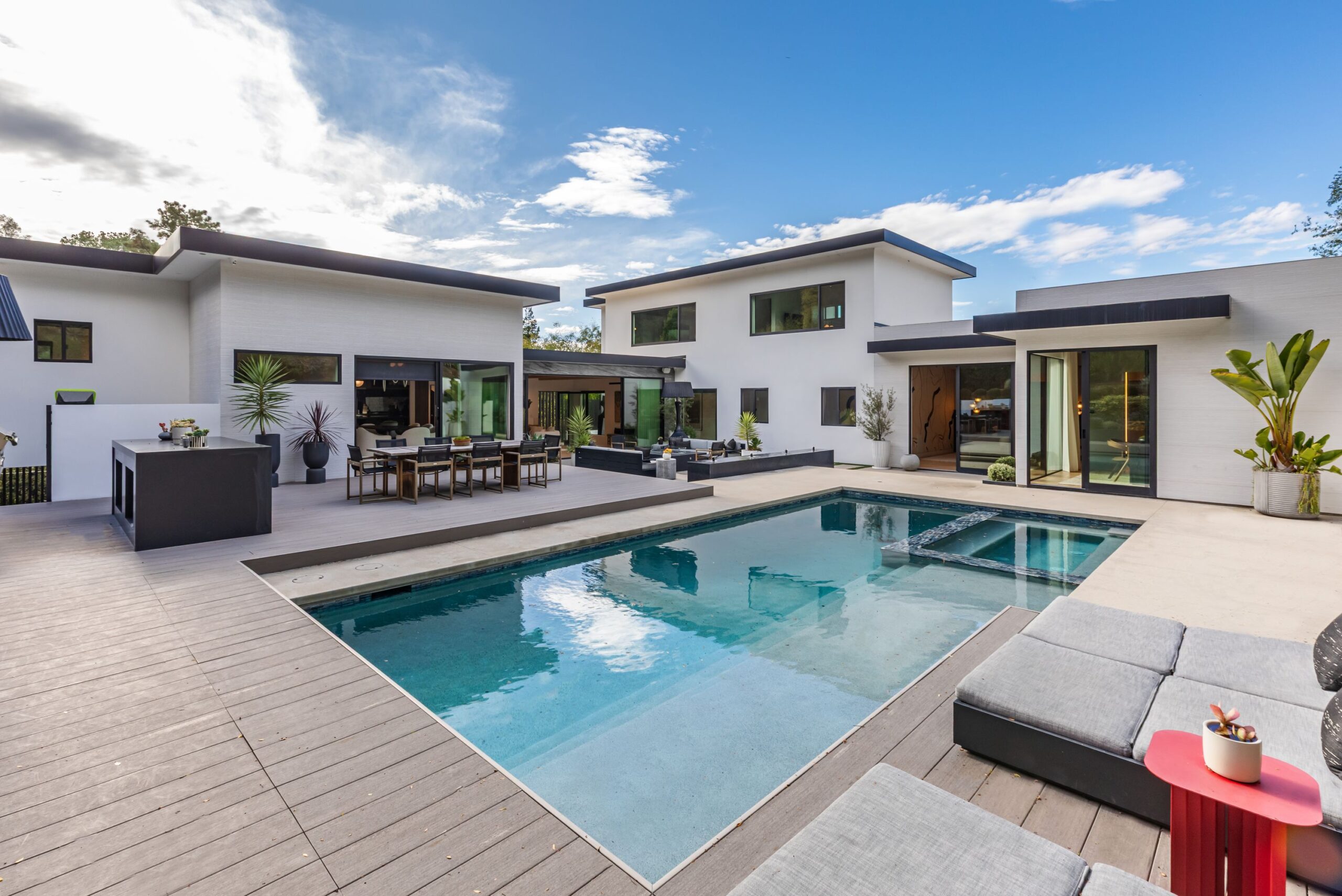 Fully renovated modern home in BHPO on a quiet street in Coldwater Canyon. Just beyond the front door, the formal living room has beamed ceilings and looks out to the spacious backyard. The dining room conveniently blends into the kitchen which features gorgeous black porcelain counters and high-end appliances, including double Sub-Zero refrigerators and 48-inch Wolf range. Glass walls allow natural light to fill the space and highlight the beautiful finishes and textures of the home, Fleetwood windows and doors throughout. The spacious primary suite features build projector and drop-down 130-inch screen, and offers a tranquil spa-like bathroom. Oversized sliding doors open for seamless indoor/outdoor living and entertaining featuring six-zone audio system. The sparkling pool with oversized spa is surrounded by areas for lounging, a built-in fire pit with seating, room for dining al fresco, and lush landscaping. This exquisite home flawlessly combines luxury and tranquility, making it the perfect retreat for sophisticated living and entertaining.