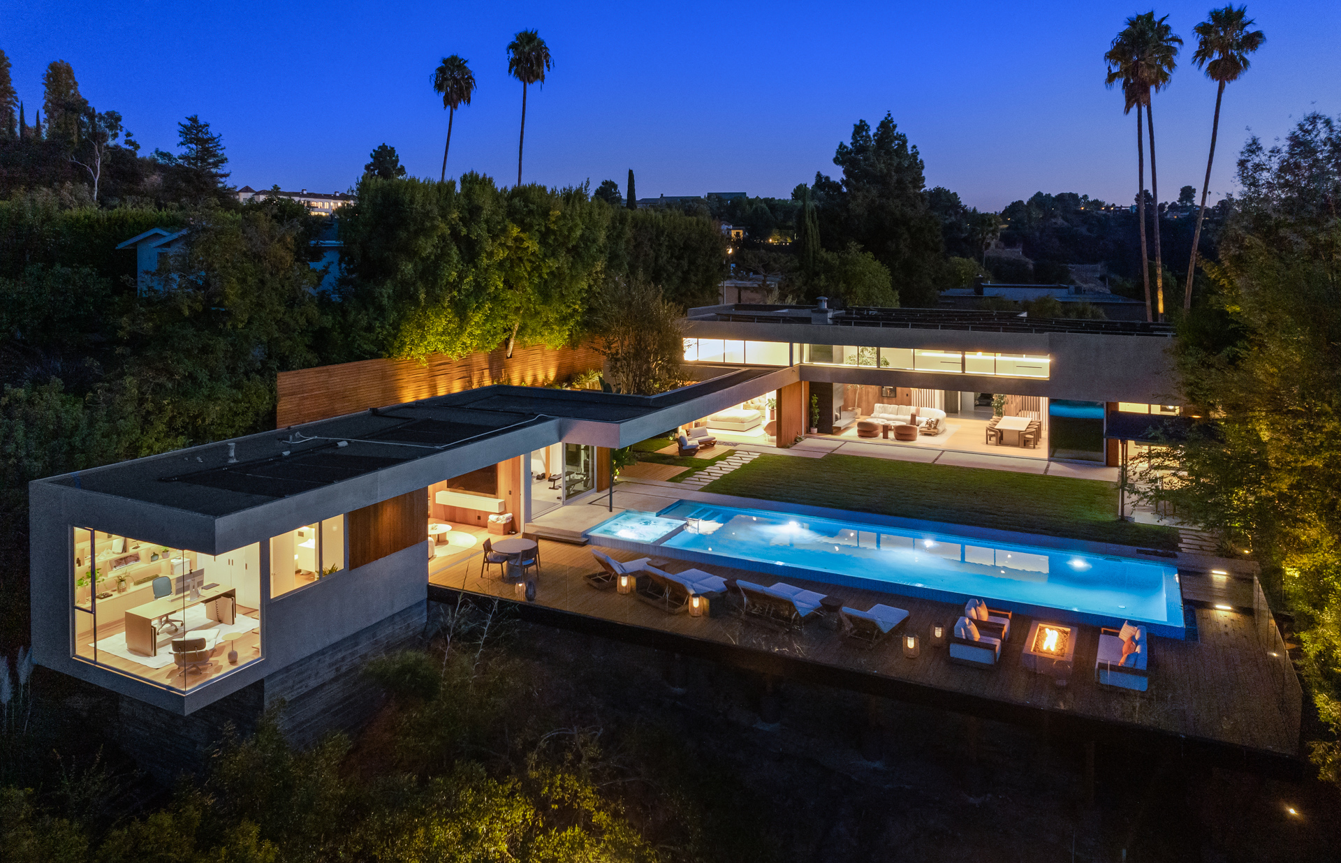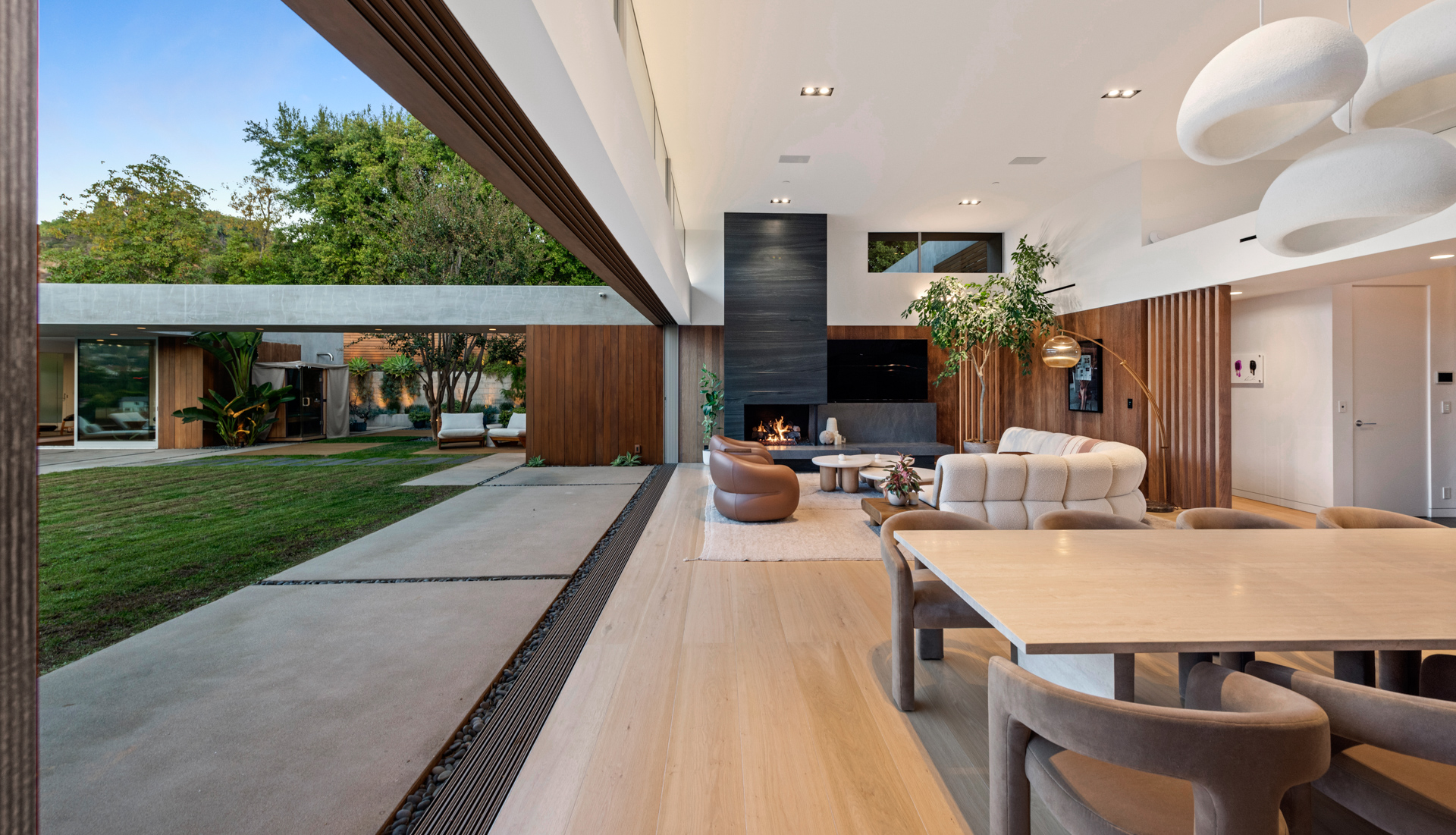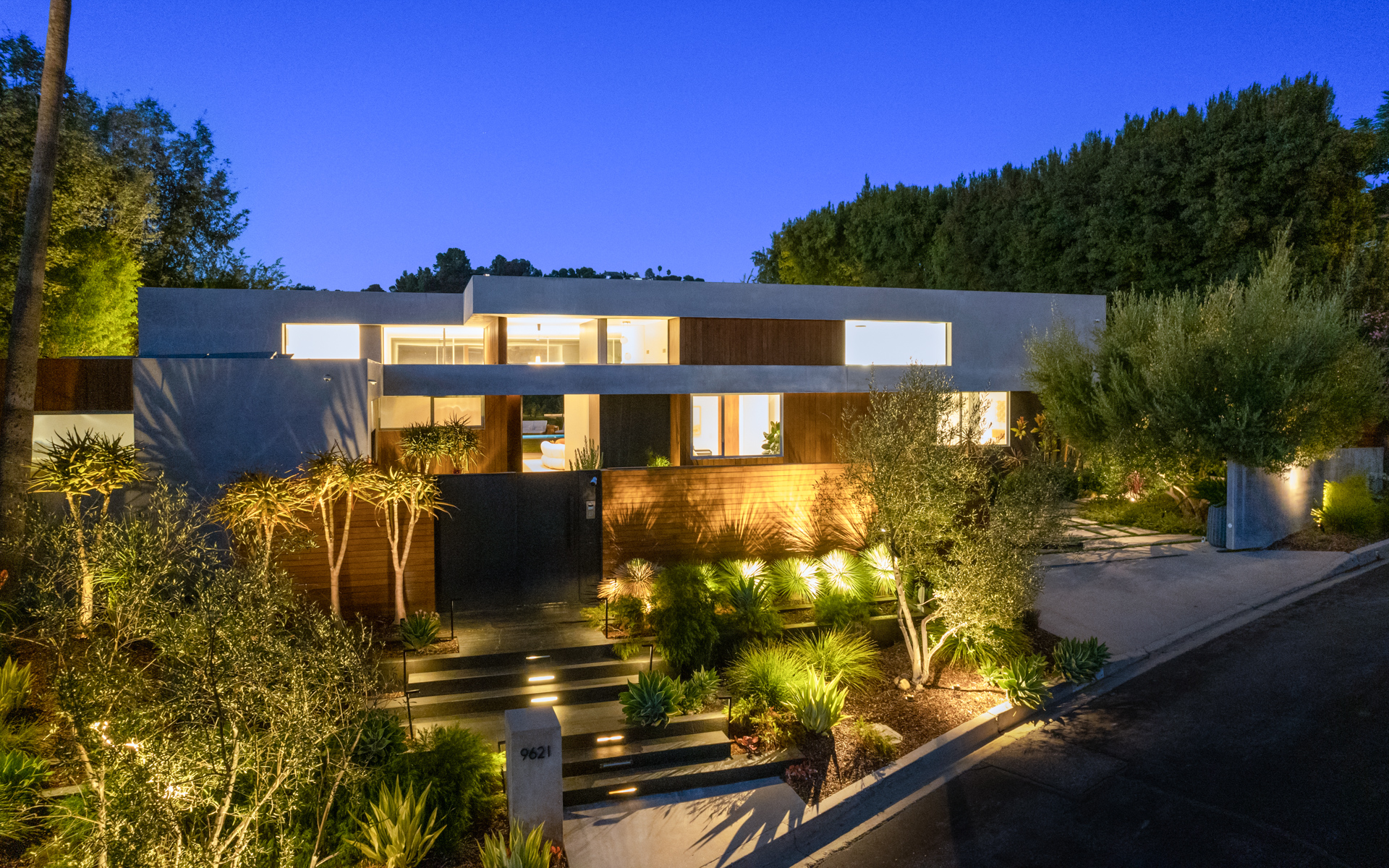 This modern architectural retreat in the heart of Beverly Hills offers a seamless blend of resort-style luxury, premier amenities, and ultimate privacy. Situated on a quiet cul-de-sac and secured behind private gates, the home welcomes you with a striking pivot door, unveiling a sunlit open-concept layout framed by stunning canyon views. Expansive living areas flow effortlessly between indoor and outdoor spaces, creating a harmonious and inviting atmosphere.Every detail has been thoughtfully designed, featuring a formal living room with a fireplace, an elegant dining area, five impeccably appointed bedrooms, five bathrooms, a media room/library, and a sophisticated kitchen complete with a spacious pantry and laundry room.The primary suite is a serene sanctuary with seamless outdoor access, a spa-inspired bathroom with a soaking tub, standalone shower, dual vanities, and a motion-sensor walk-in closet.At the heart of the property, a floating guest house serves as a tranquil retreat, offering a yoga studio/gym, an infrared sauna, and a refined office overlooking breathtaking canyon views.The backyard sanctuary is an entertainer's dream, with multiple lounging areas, a zero-edge pool and spa, outdoor dining, a BBQ, and a pizza oven, all set against panoramic canyon vistas. Combining cutting-edge design and technology, luxurious amenities, and unparalleled tranquility, this home is a true masterpiece in one of Beverly Hills' most coveted neighborhoods.