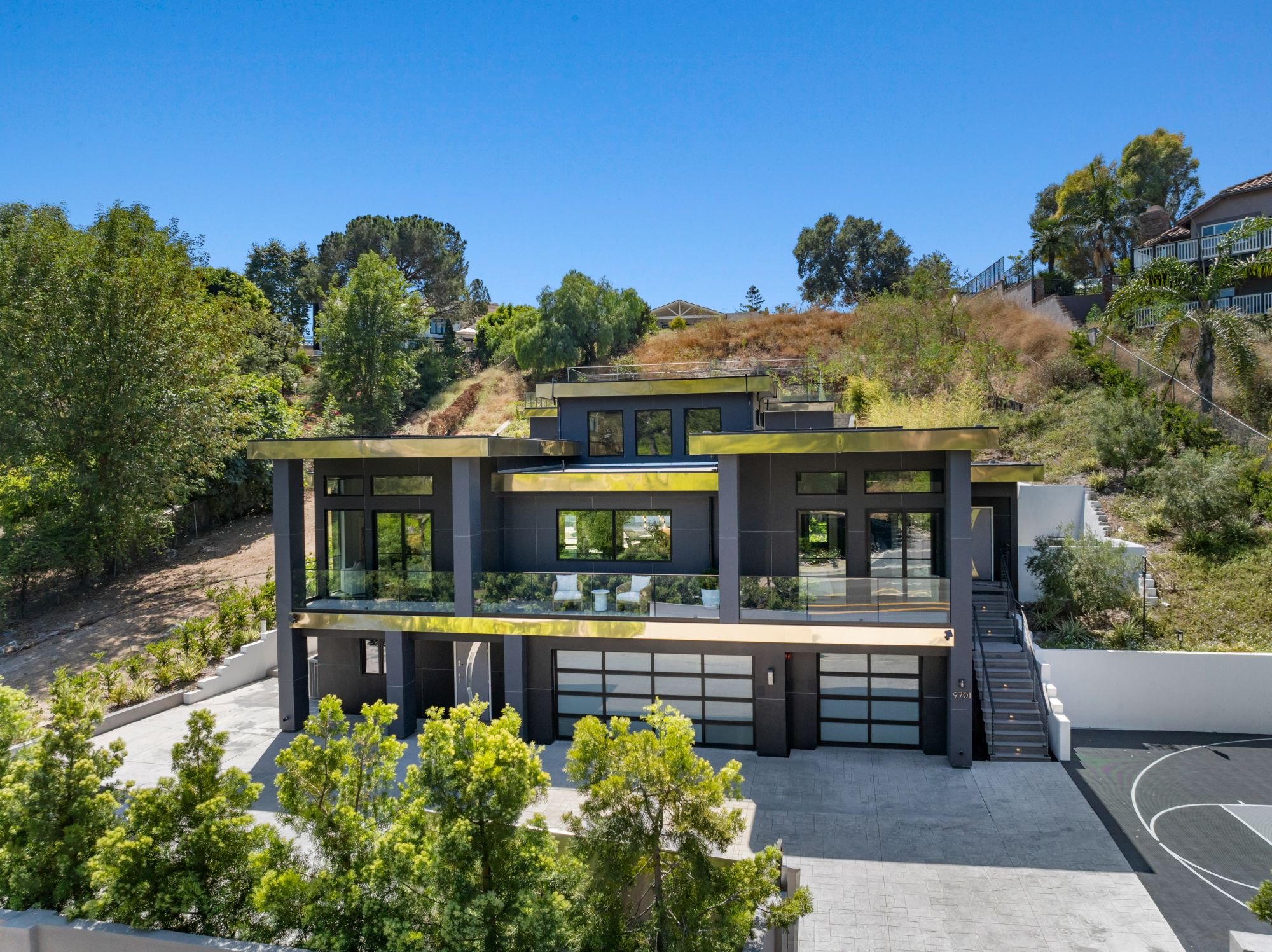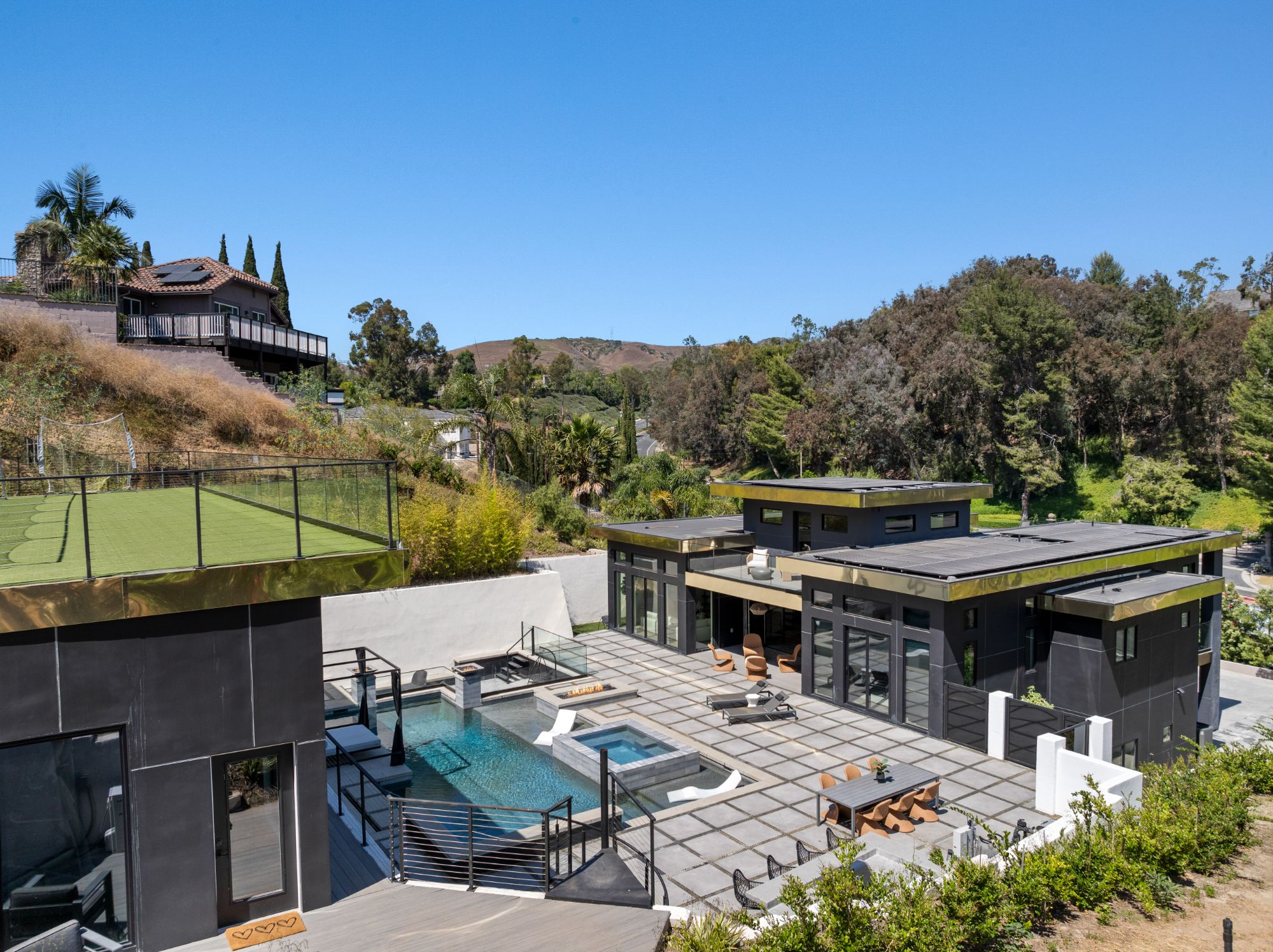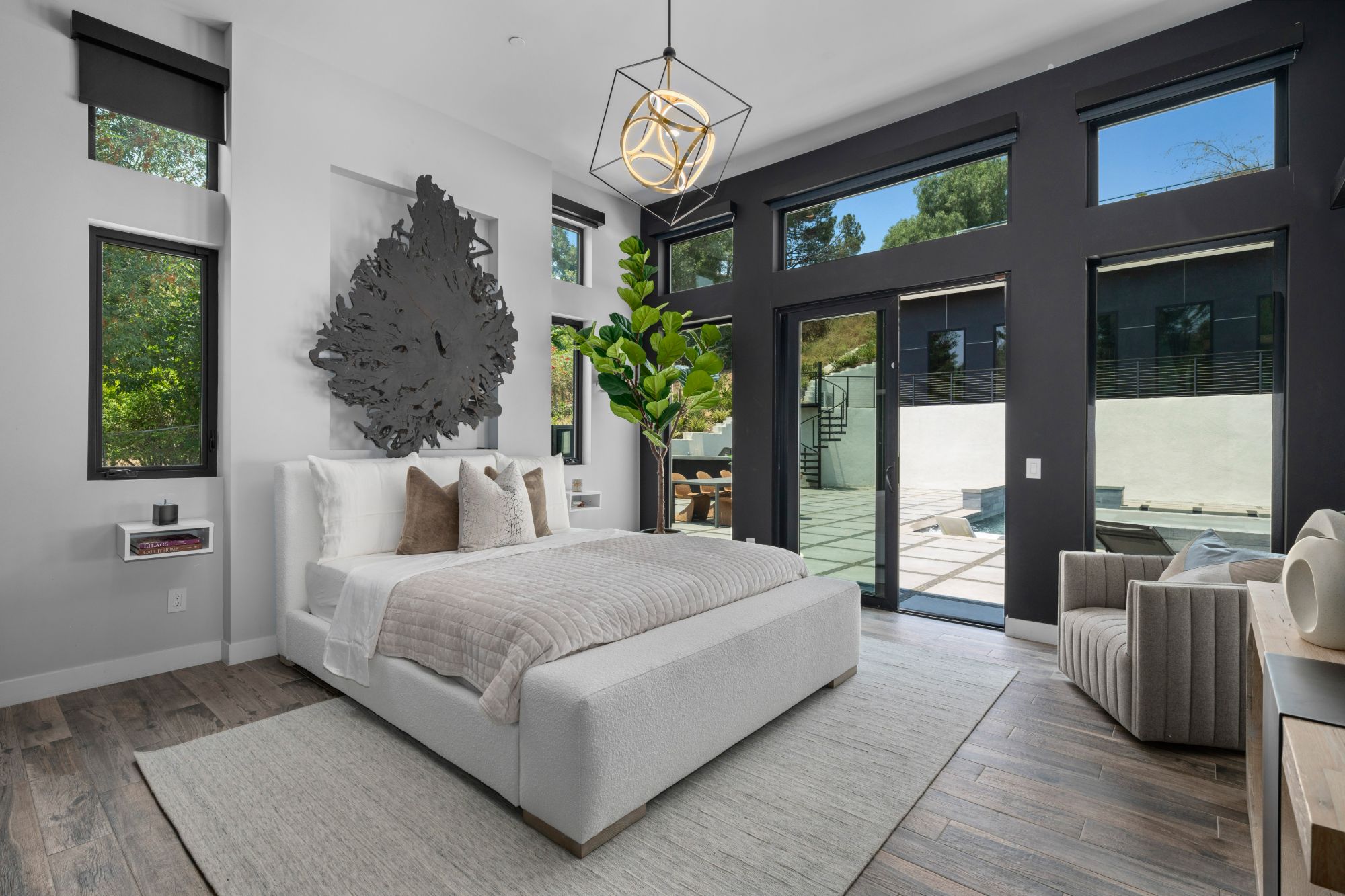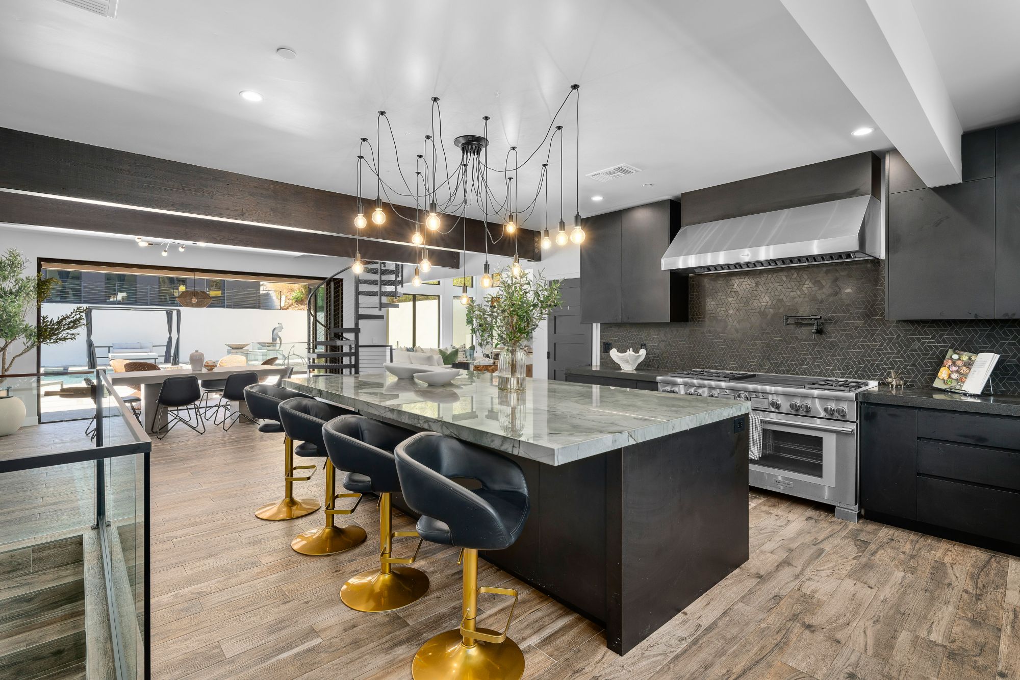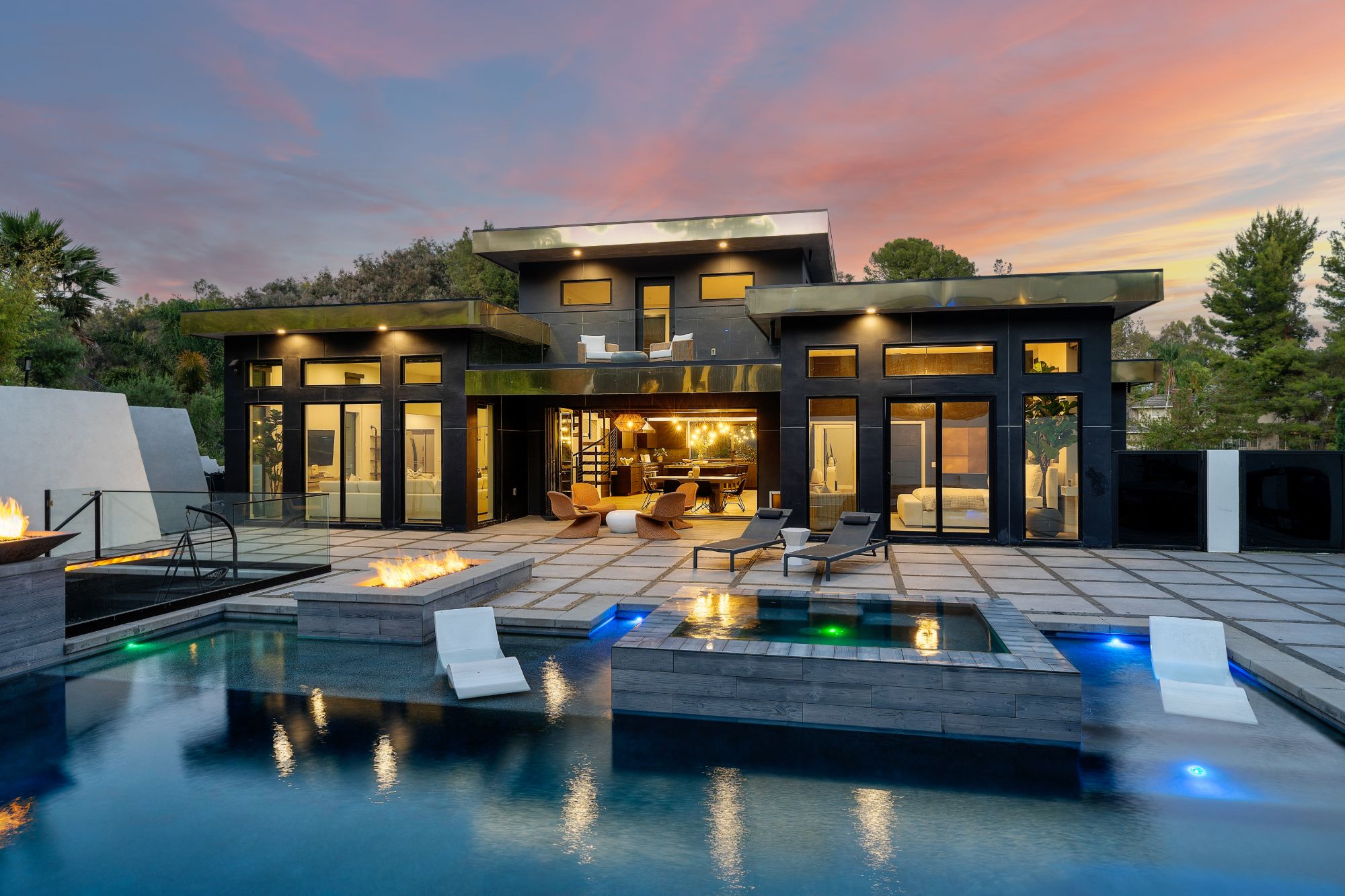 Welcome to 9701 Cannon Street, a stunning contemporary masterpiece nestled in the heart of Villa Park, a city celebrated for its small-town charm, top-rated schools, and exceptional quality of life. Spanning nearly 5,000 square feet, this meticulously designed two-story residence offers 4 bedrooms, 6 bathrooms, and an additional detached structure featuring a fully equipped gym. Designed for quintessential California indoor-outdoor living, the main living space seamlessly blends luxury and functionality. The chef's kitchen is a true showpiece, boasting an oversized quartz-topped island, a 60-inch range oven, and a premium Thermador refrigerator, making it a dream for culinary enthusiasts. For those who love to entertain, the accordion sliding glass doors open to an expansive backyard oasis, featuring a saltwater pool, spa, overflowing Baja pool, three fire pits, a sunken seating area, and a fully equipped BBQ island, perfect for hosting unforgettable gatherings. Every detail of this home exudes craftsmanship and luxury, from custom cabinetry by Derrick Wayne and sleek ceramic flooring to designer plumbing fixtures and a massive stone soaking tub. Thoughtful upgrades ensure modern convenience, including solar panels, two tankless gas water heaters for uninterrupted hot water, and a 2-inch water line for exceptional water pressure. The three-car garage is equally impressive, featuring a walk-in safe, additional storage, and a 220V electric car charger. Tucked away in one of Orange County's best-kept secrets, Villa Park offers a peaceful, close-knit community with easy access to major cities, blending tranquility with convenience.