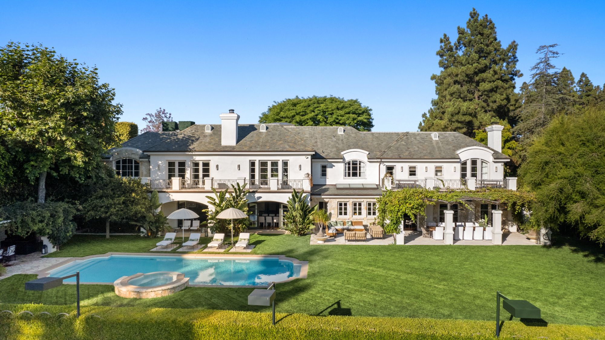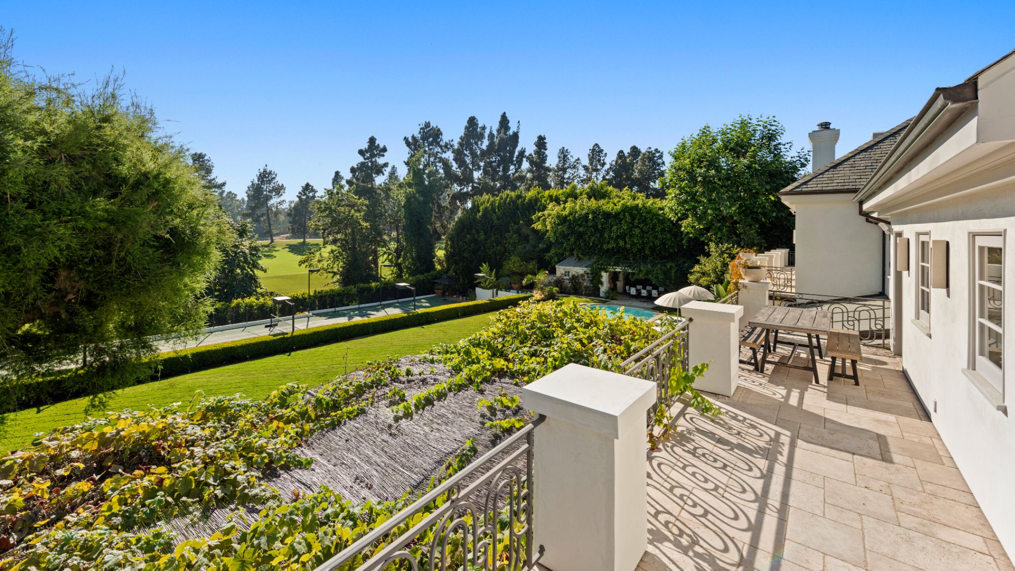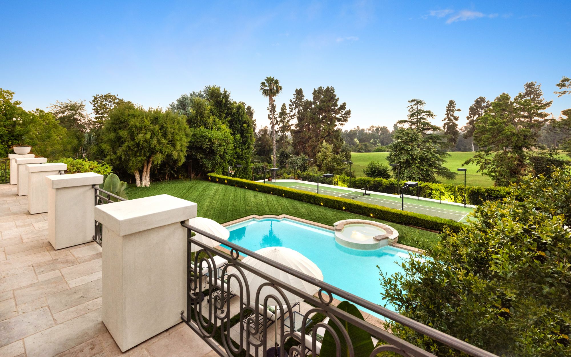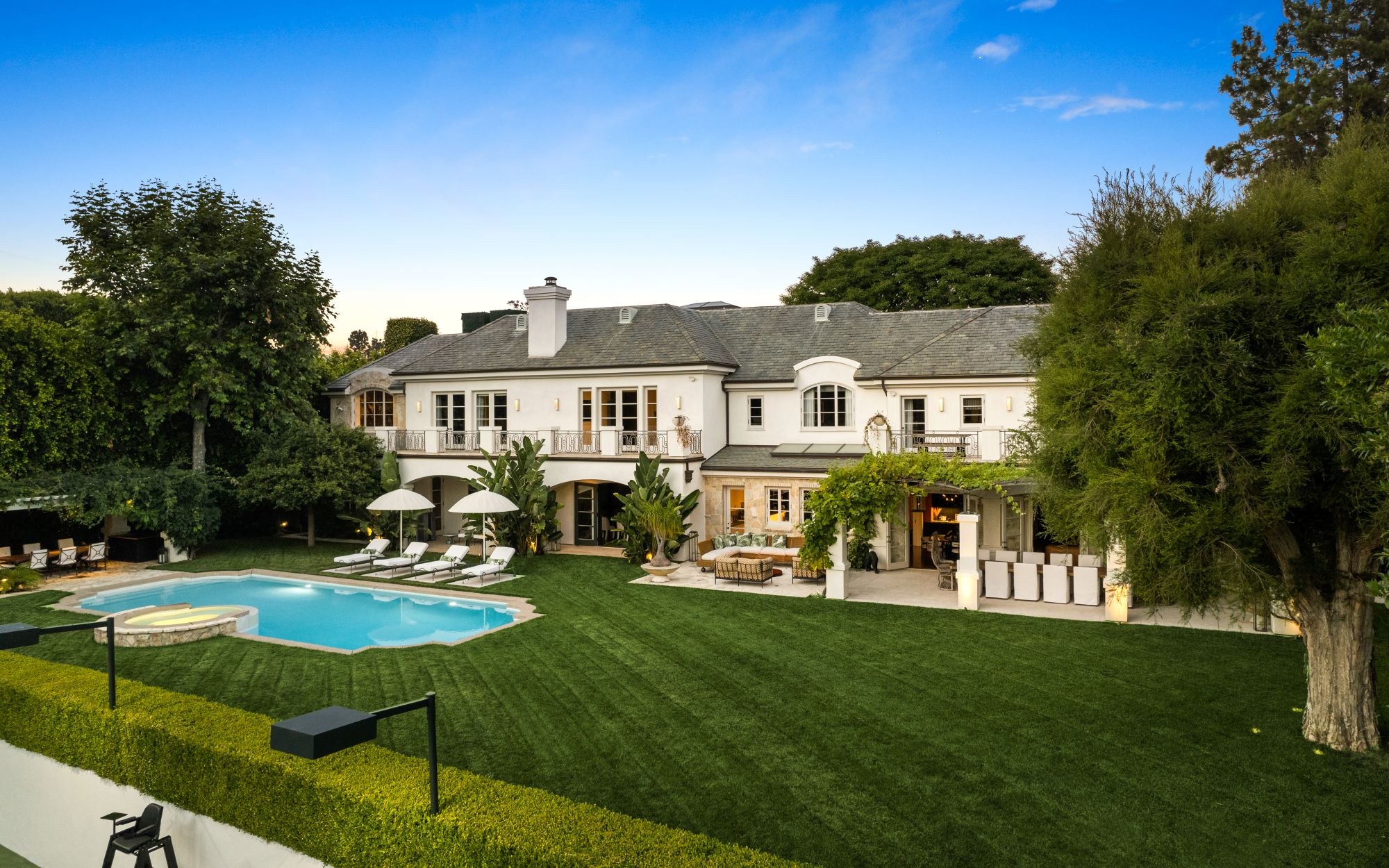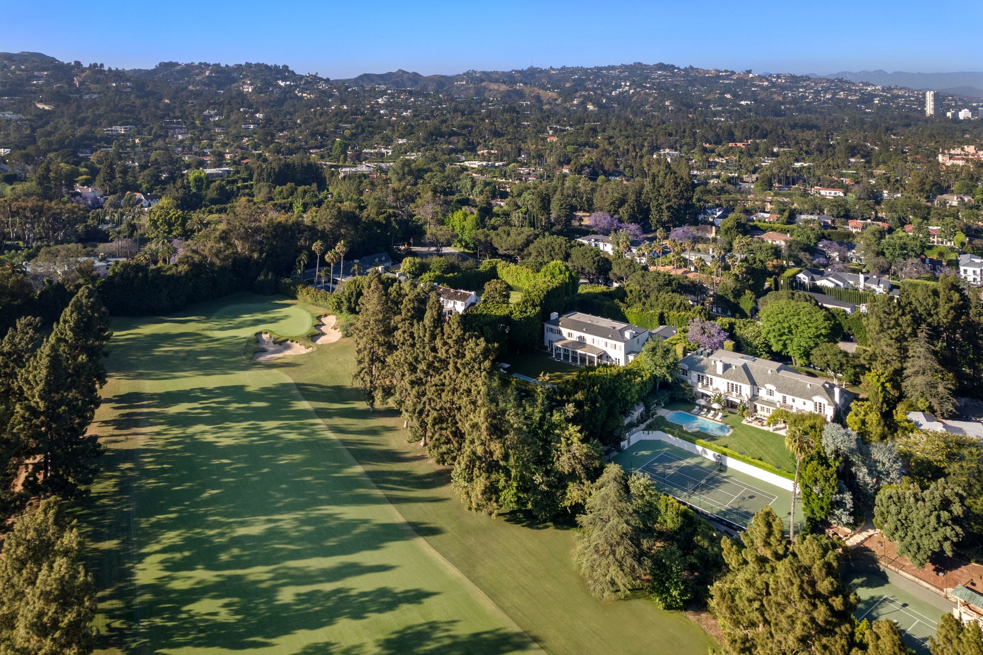 Set beside the exclusive LA Country Club, this expansive 1-acre gated estate has been meticulously remodeled to blend old-world glamour with modern elegance. Set back behind a grand, gated motor court, the property ensures unparalleled security and privacy. A grand two-story foyer with warm tones, natural light, and graceful curved lines creates an inviting and sophisticated atmosphere. To the right, a formal living room with a fireplace sets the stage for elegant entertaining, while an office with a bar and coffered ceiling adds timeless charm. Multiple gathering spaces, including a dining room overlooking the manicured grounds, flow seamlessly throughout. The opposite wing features a gourmet kitchen with dual islands and top-of-the-line appliances, a breakfast nook, and a cozy family room that opens to an outdoor dining area shaded by mature grapevines. Upstairs, the expansive primary suite features a fireplace, dual walk-in closets and bathrooms, and a private balcony overlooking the backyard and golf course. Five additional bedroom suites offer ample space for family and guests. Outside, a private oasis awaits. Lush landscaping surrounds a large patio for dining al fresco, firepit, flat grassy lawn, resort-like pool with spa, pool house with additional patio space, tennis court with lights, and an additional deck area that overlooks the impeccably landscaped fifth fairway. Offering a seamless blend of luxurious living and resort-style amenities, this estate provides an unparalleled opportunity to experience the epitome of refined elegance in one of Los Angeles’ most coveted locations.