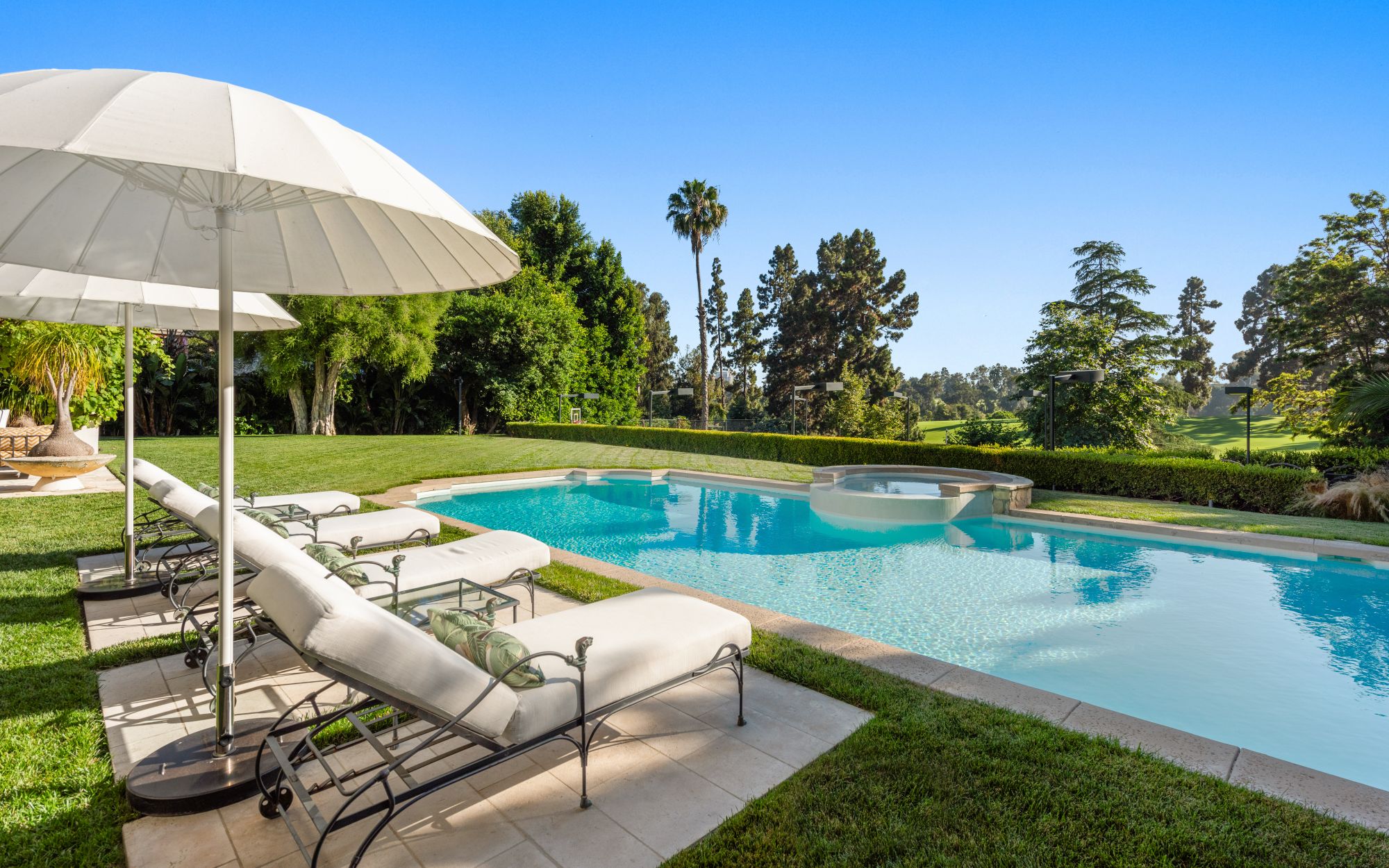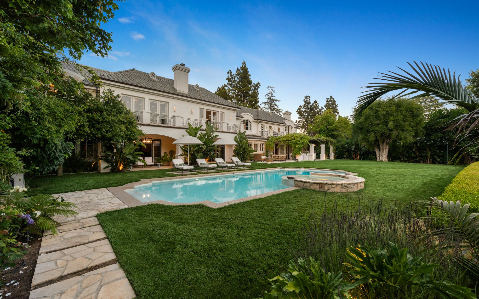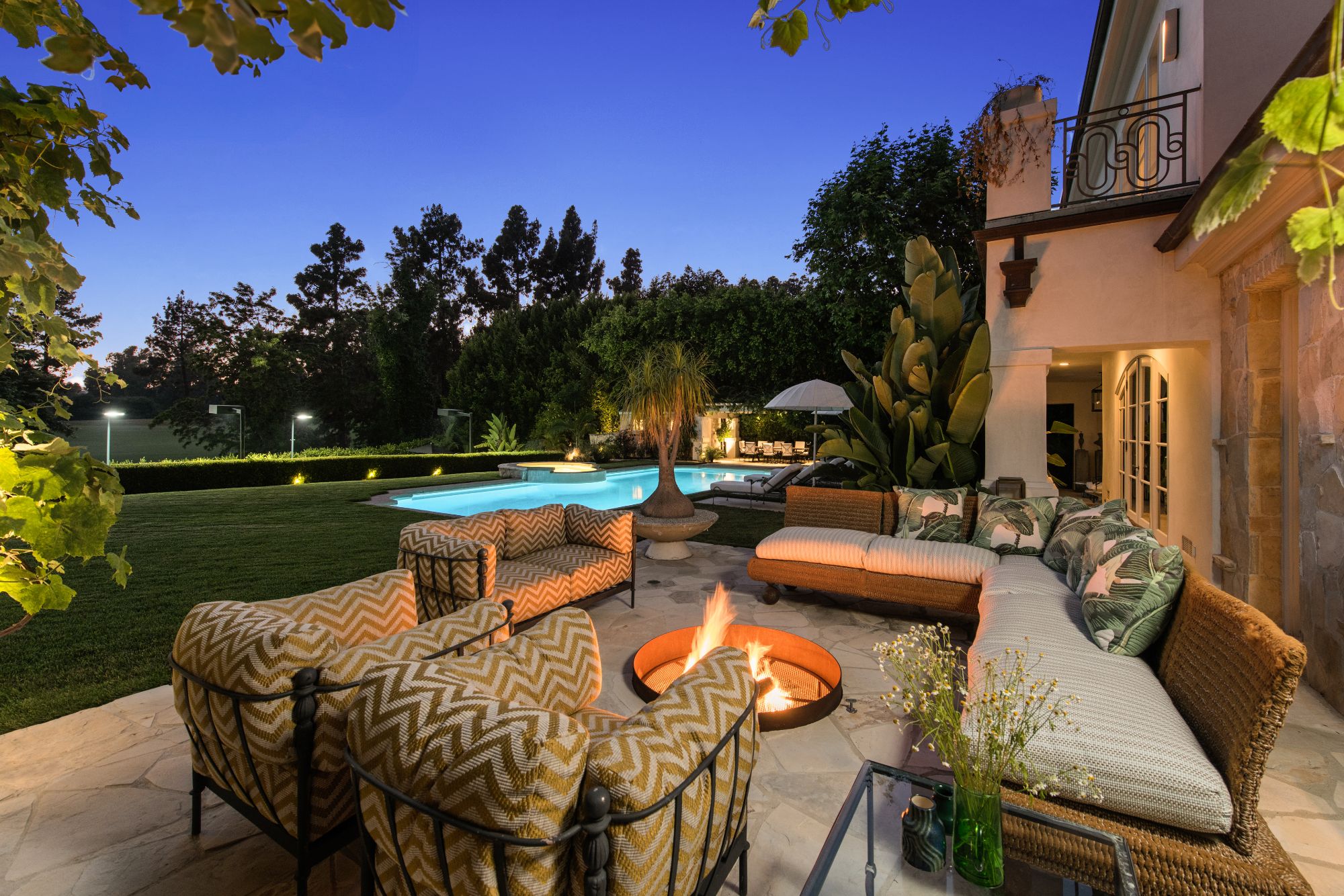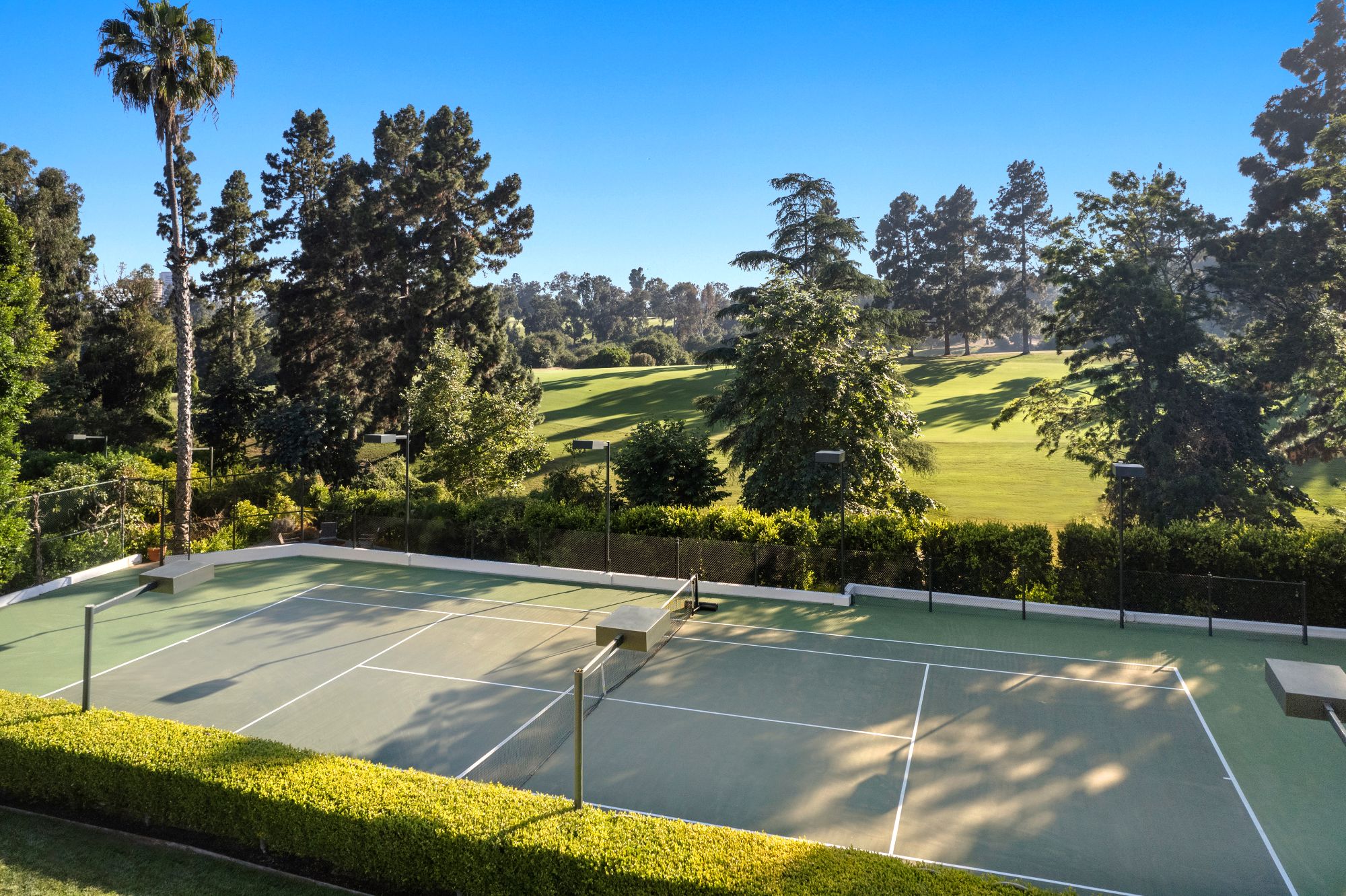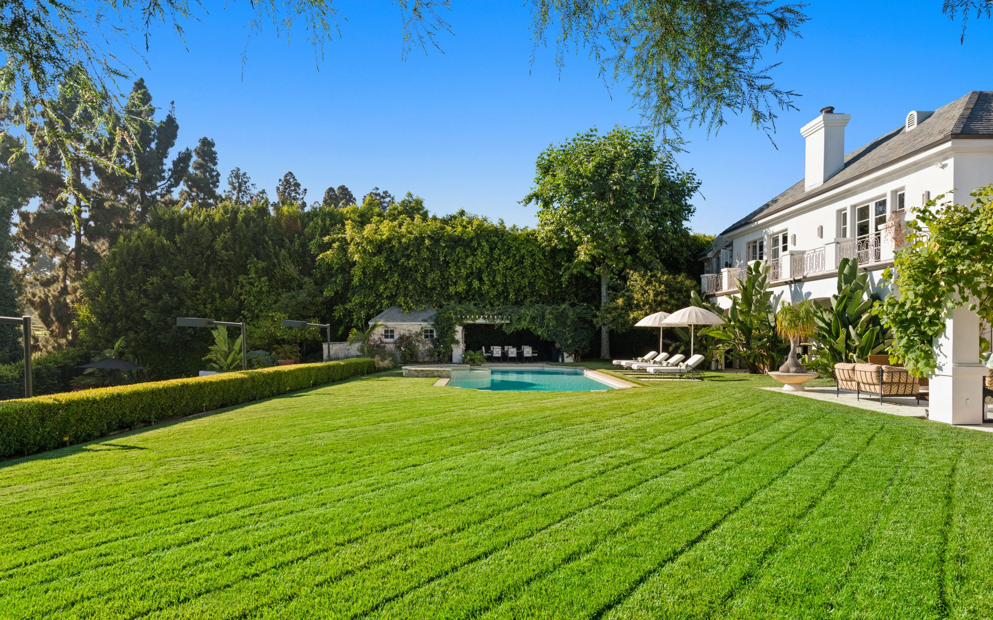 Set beside the exclusive LA Country Club, this expansive 1-acre gated estate has been meticulously remodeled to blend old-world glamour with modern elegance. Set back behind a grand, gated motor court, the property ensures unparalleled security and privacy. A grand two-story foyer with warm tones, natural light, and graceful curved lines creates an inviting and sophisticated atmosphere. To the right, a formal living room with a fireplace sets the stage for elegant entertaining, while an office with a bar and coffered ceiling adds timeless charm. Multiple gathering spaces, including a dining room overlooking the manicured grounds, flow seamlessly throughout. The opposite wing features a gourmet kitchen with dual islands and top-of-the-line appliances, a breakfast nook, and a cozy family room that opens to an outdoor dining area shaded by mature grapevines. Upstairs, the expansive primary suite features a fireplace, dual walk-in closets and bathrooms, and a private balcony overlooking the backyard and golf course. Five additional bedroom suites offer ample space for family and guests. Outside, a private oasis awaits. Lush landscaping surrounds a large patio for dining al fresco, firepit, flat grassy lawn, resort-like pool with spa, pool house with additional patio space, tennis court with lights, and an additional deck area that overlooks the impeccably landscaped fifth fairway. Offering a seamless blend of luxurious living and resort-style amenities, this estate provides an unparalleled opportunity to experience the epitome of refined elegance in one of Los Angeles’ most coveted locations.