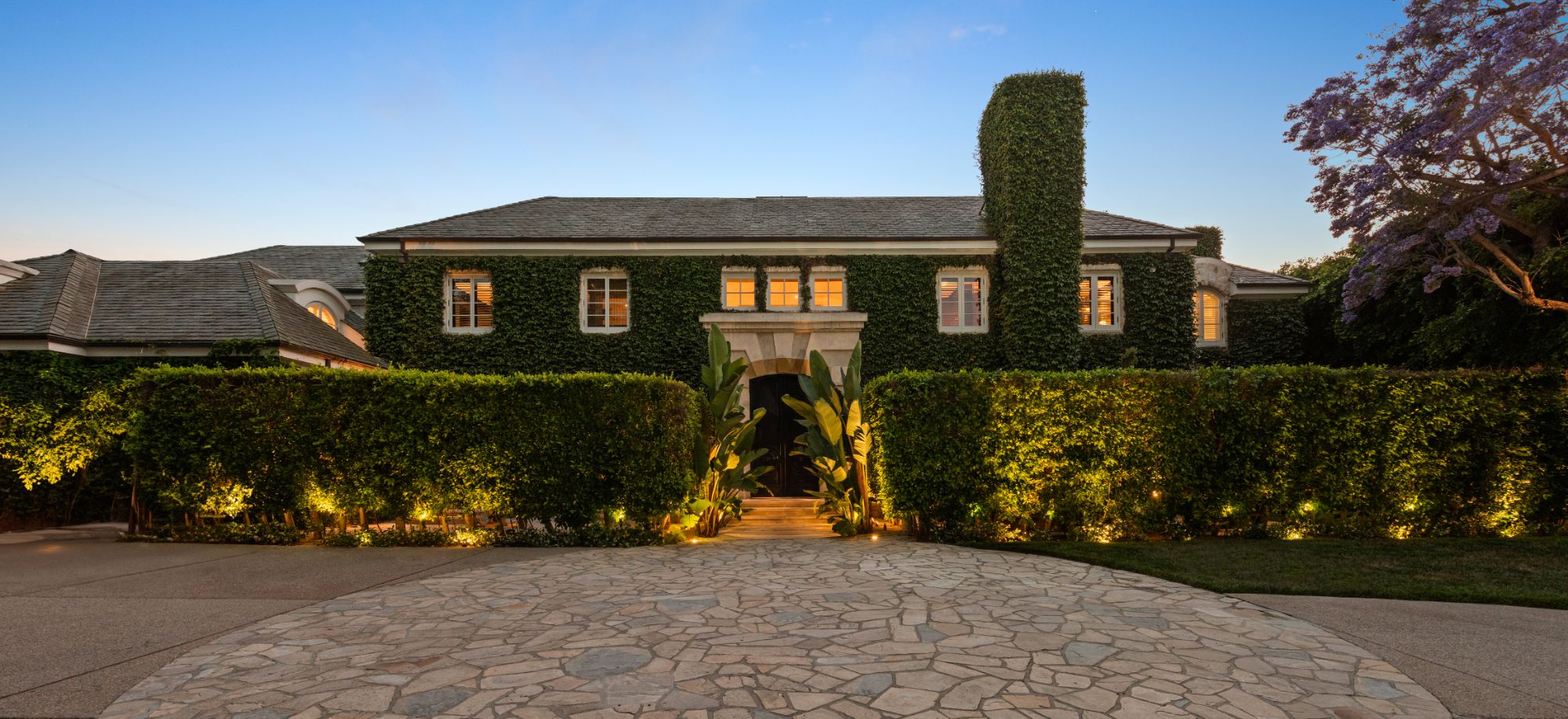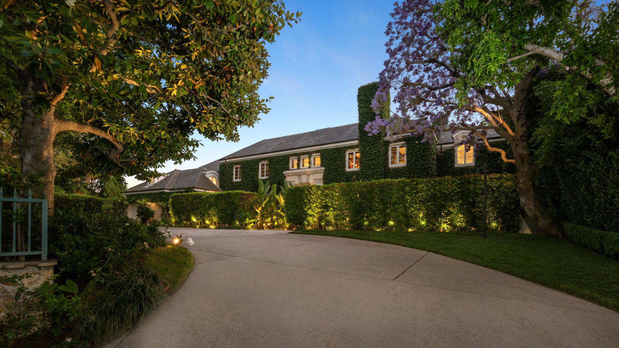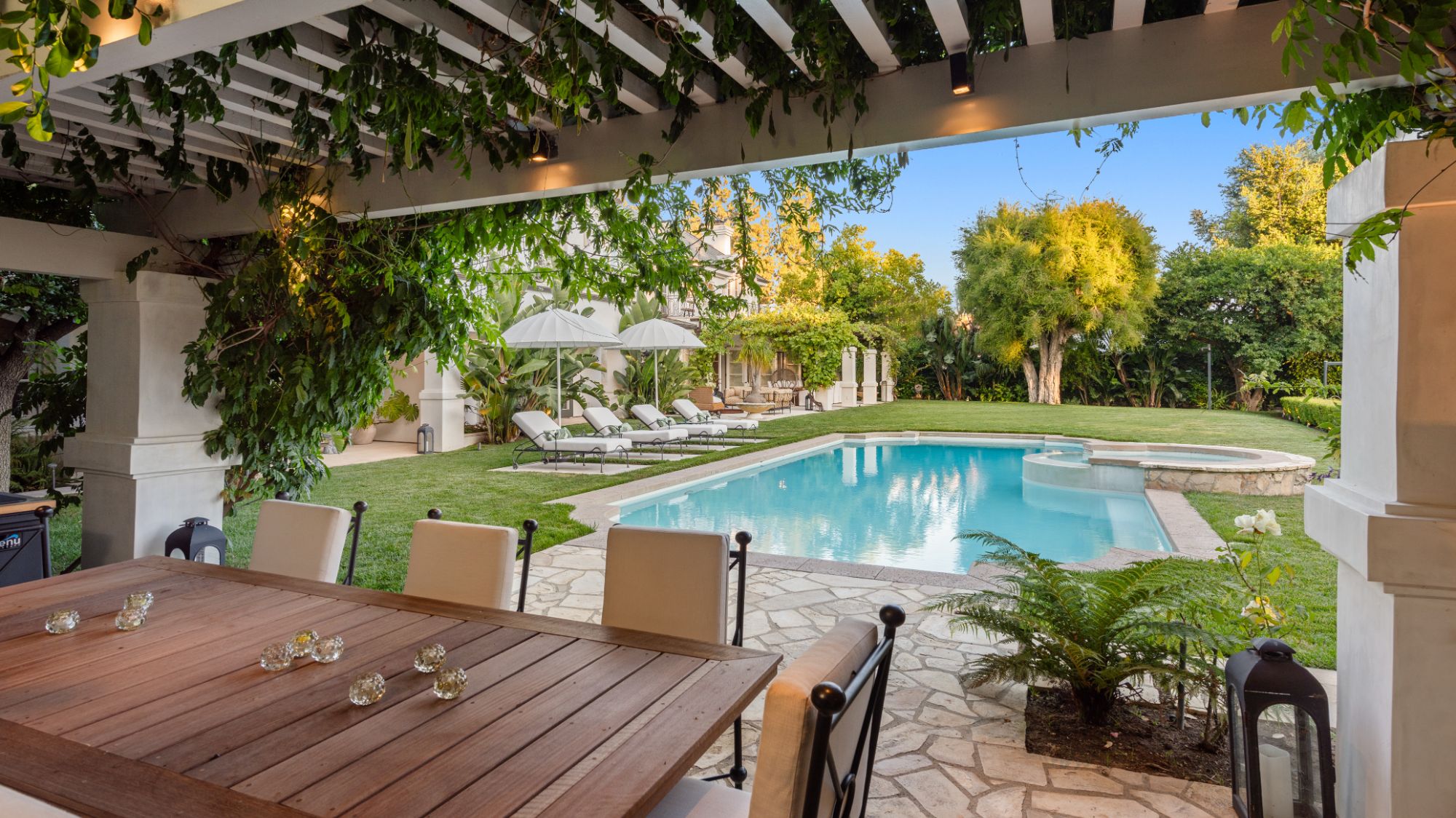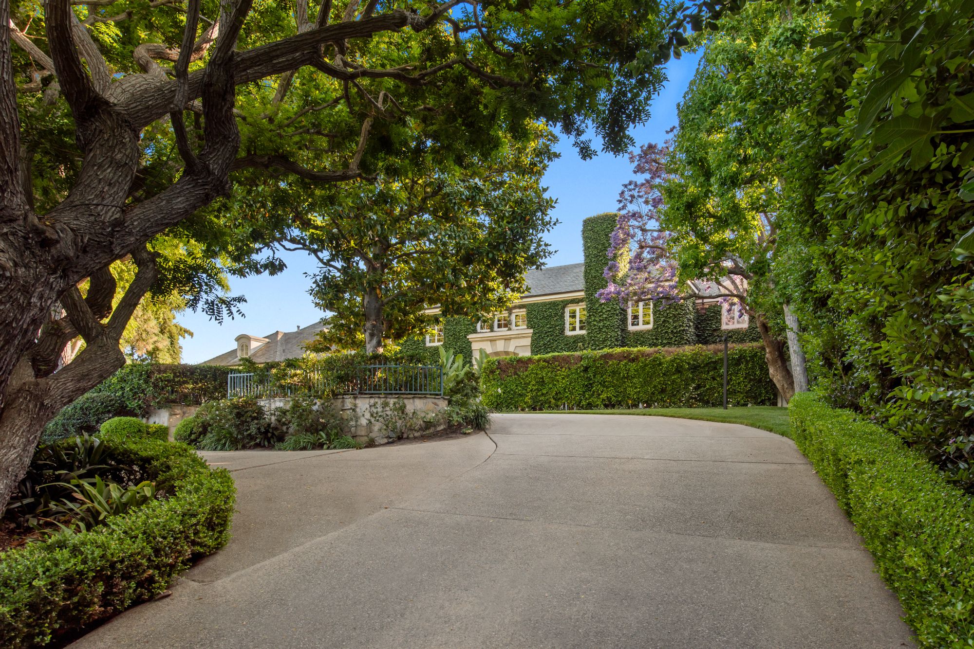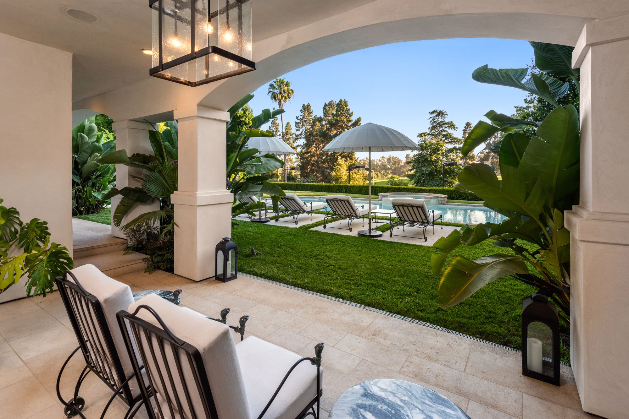 Set beside the exclusive LA Country Club, this expansive 1-acre gated estate has been meticulously remodeled to blend old-world glamour with modern elegance. Set back behind a grand, gated motor court, the property ensures unparalleled security and privacy. A grand two-story foyer with warm tones, natural light, and graceful curved lines creates an inviting and sophisticated atmosphere. To the right, a formal living room with a fireplace sets the stage for elegant entertaining, while an office with a bar and coffered ceiling adds timeless charm. Multiple gathering spaces, including a dining room overlooking the manicured grounds, flow seamlessly throughout. The opposite wing features a gourmet kitchen with dual islands and top-of-the-line appliances, a breakfast nook, and a cozy family room that opens to an outdoor dining area shaded by mature grapevines. Upstairs, the expansive primary suite features a fireplace, dual walk-in closets and bathrooms, and a private balcony overlooking the backyard and golf course. Five additional bedroom suites offer ample space for family and guests. Outside, a private oasis awaits. Lush landscaping surrounds a large patio for dining al fresco, firepit, flat grassy lawn, resort-like pool with spa, pool house with additional patio space, tennis court with lights, and an additional deck area that overlooks the impeccably landscaped fifth fairway. Offering a seamless blend of luxurious living and resort-style amenities, this estate provides an unparalleled opportunity to experience the epitome of refined elegance in one of Los Angeles’ most coveted locations.