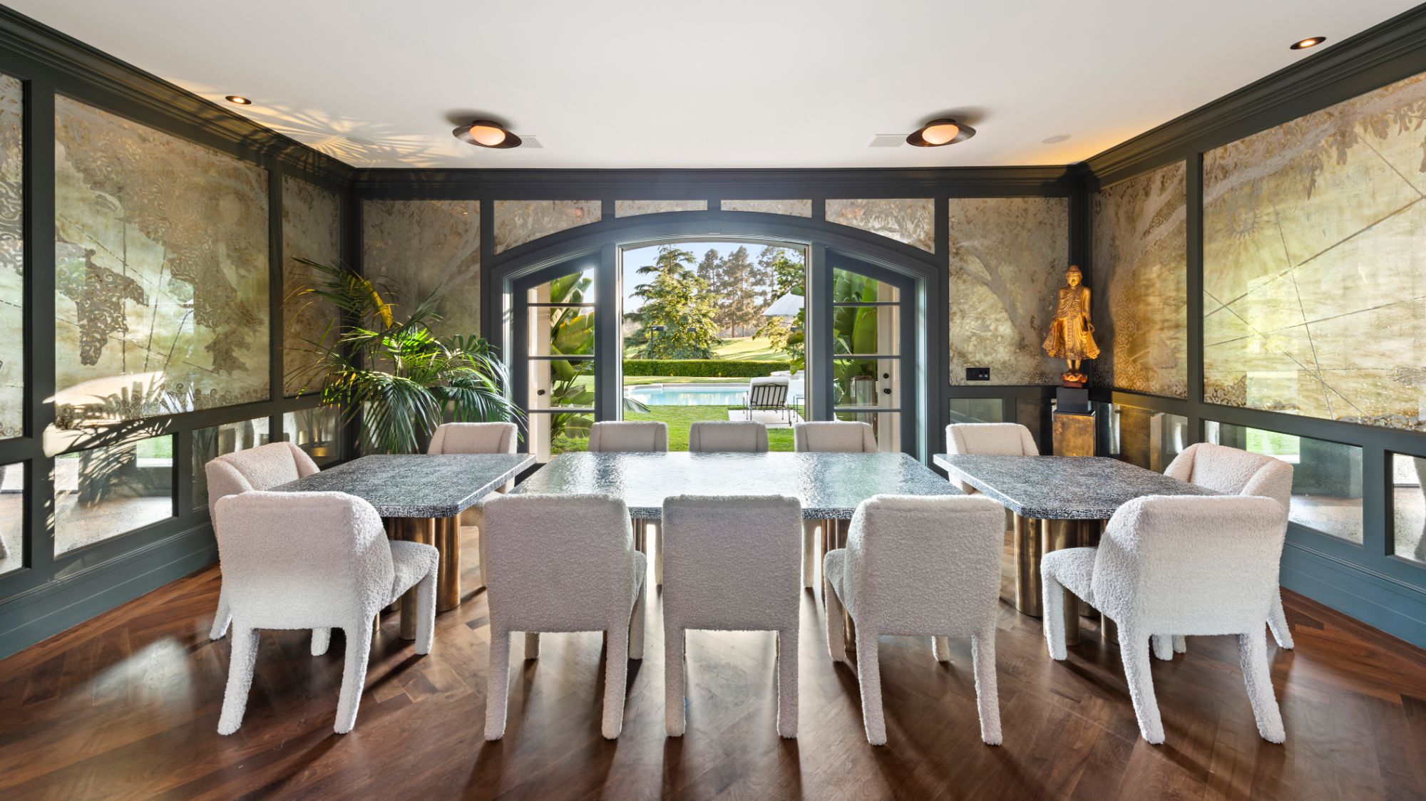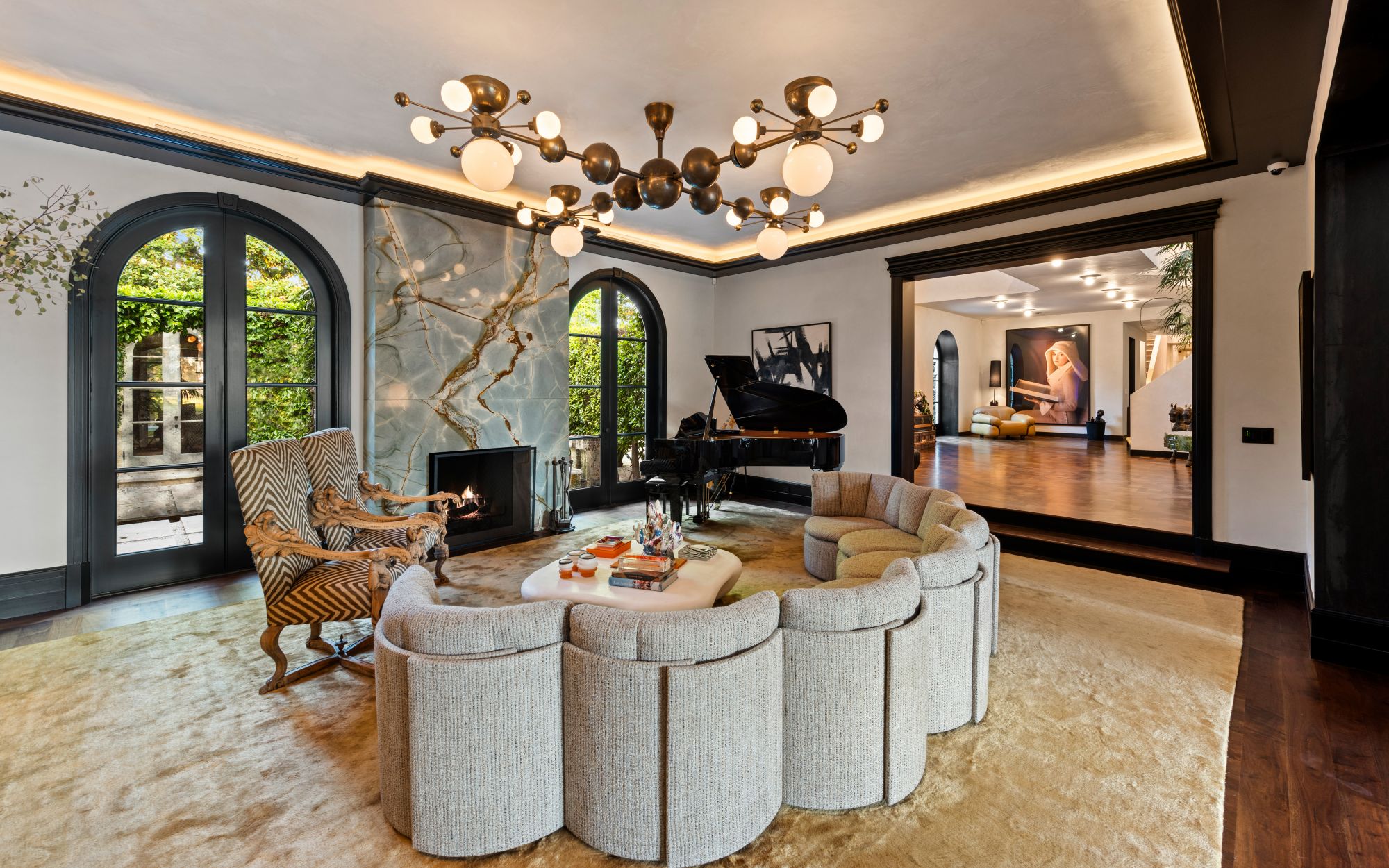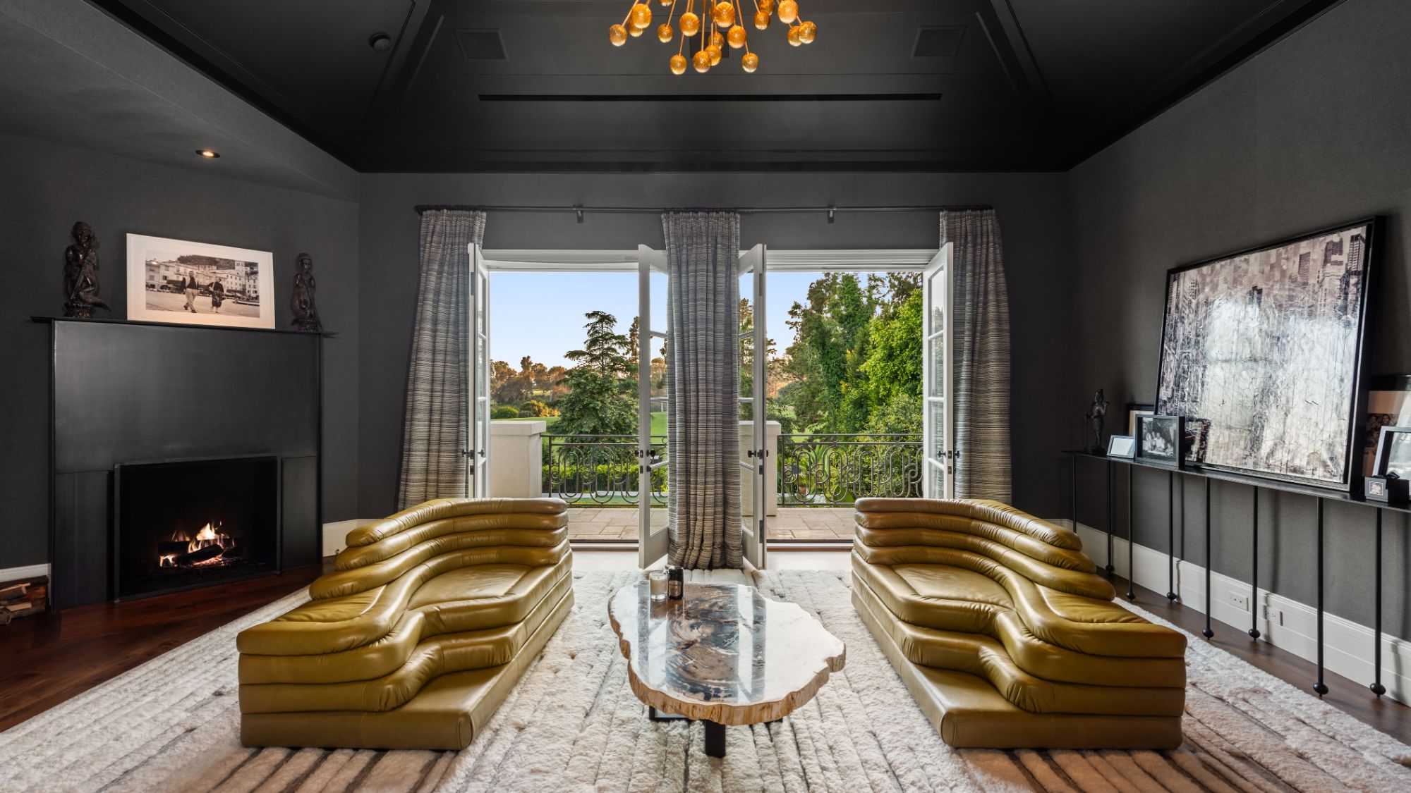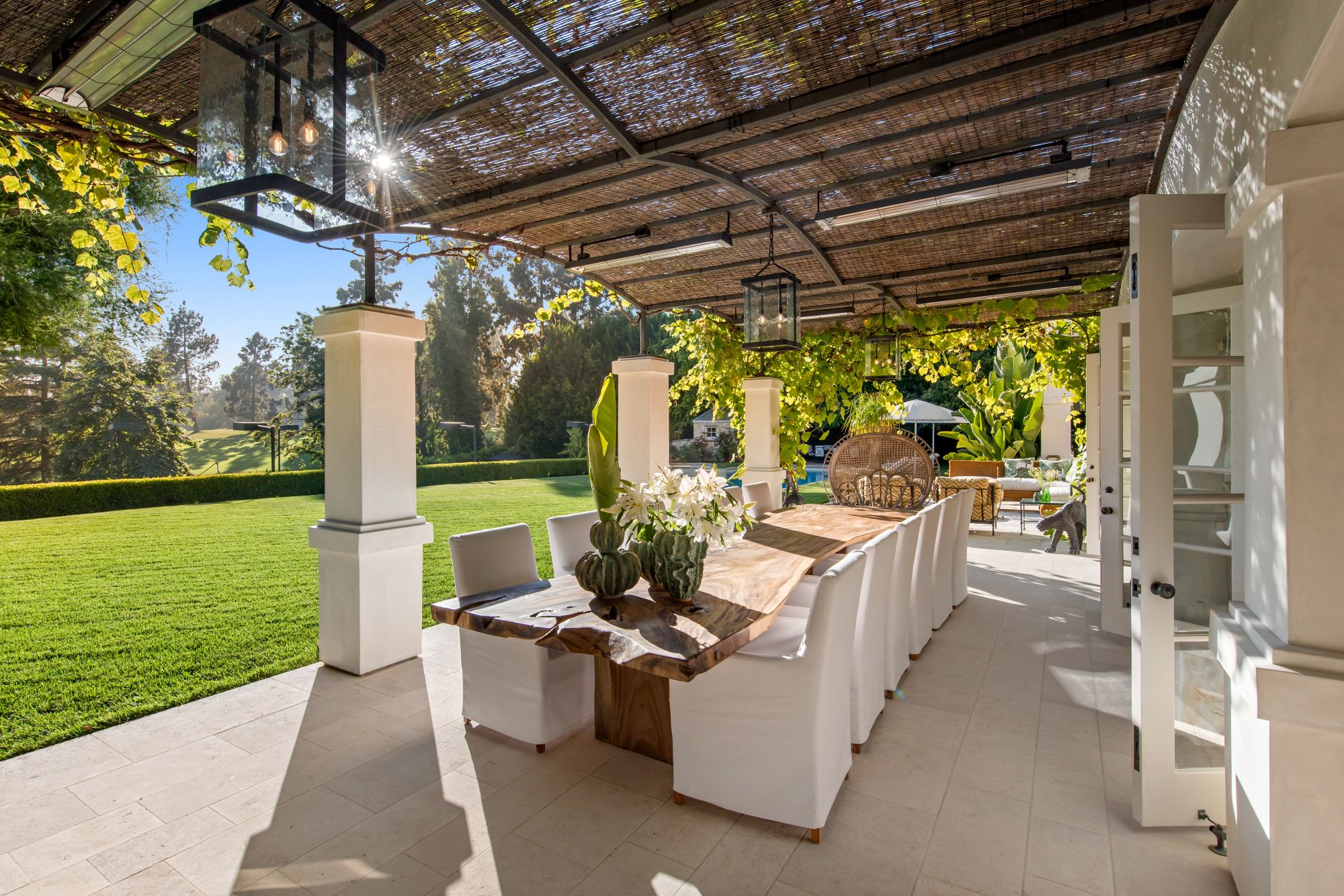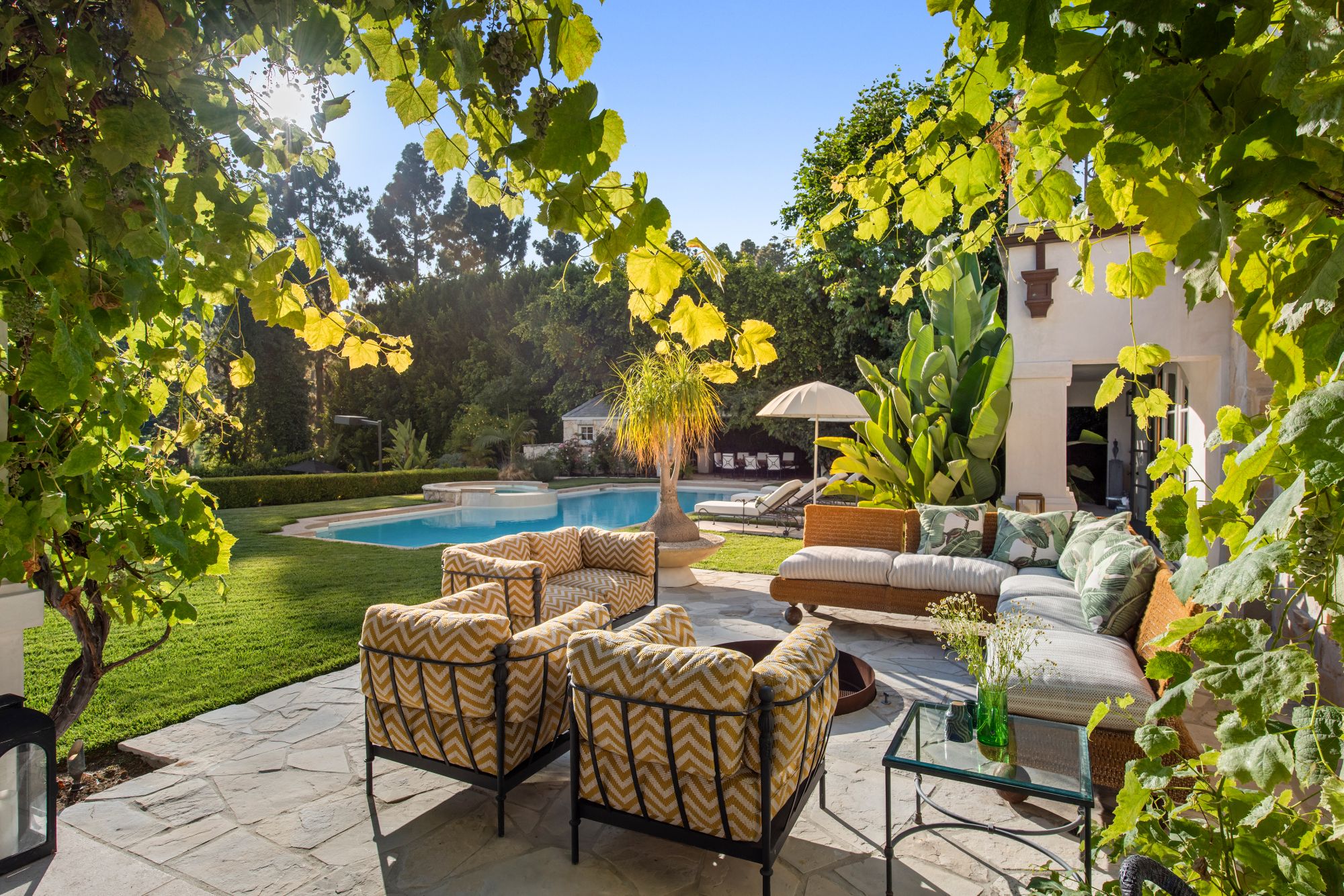 Set beside the exclusive LA Country Club, this expansive 1-acre gated estate has been meticulously remodeled to blend old-world glamour with modern elegance. Set back behind a grand, gated motor court, the property ensures unparalleled security and privacy. A grand two-story foyer with warm tones, natural light, and graceful curved lines creates an inviting and sophisticated atmosphere. To the right, a formal living room with a fireplace sets the stage for elegant entertaining, while an office with a bar and coffered ceiling adds timeless charm. Multiple gathering spaces, including a dining room overlooking the manicured grounds, flow seamlessly throughout. The opposite wing features a gourmet kitchen with dual islands and top-of-the-line appliances, a breakfast nook, and a cozy family room that opens to an outdoor dining area shaded by mature grapevines. Upstairs, the expansive primary suite features a fireplace, dual walk-in closets and bathrooms, and a private balcony overlooking the backyard and golf course. Five additional bedroom suites offer ample space for family and guests. Outside, a private oasis awaits. Lush landscaping surrounds a large patio for dining al fresco, firepit, flat grassy lawn, resort-like pool with spa, pool house with additional patio space, tennis court with lights, and an additional deck area that overlooks the impeccably landscaped fifth fairway. Offering a seamless blend of luxurious living and resort-style amenities, this estate provides an unparalleled opportunity to experience the epitome of refined elegance in one of Los Angeles’ most coveted locations.