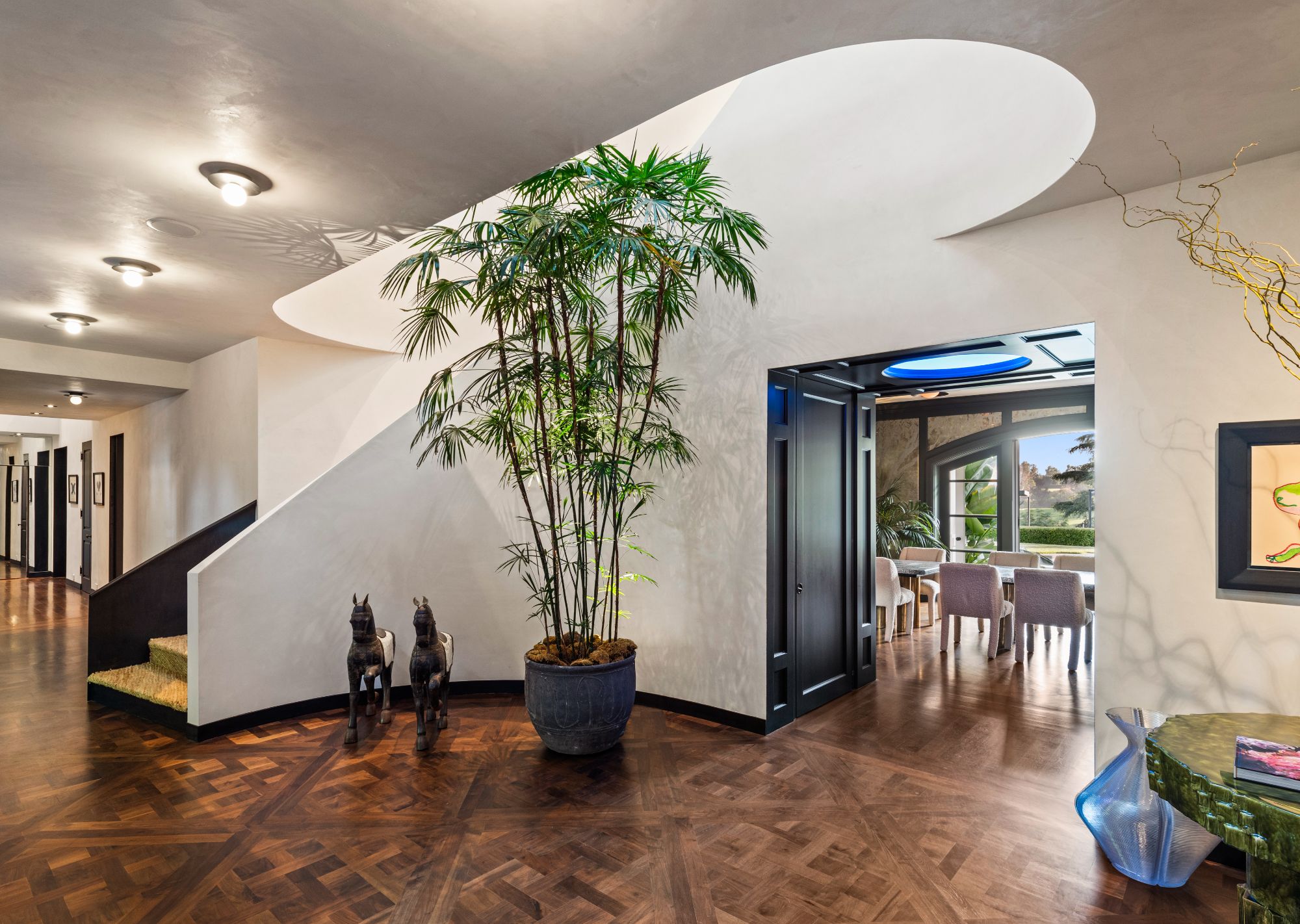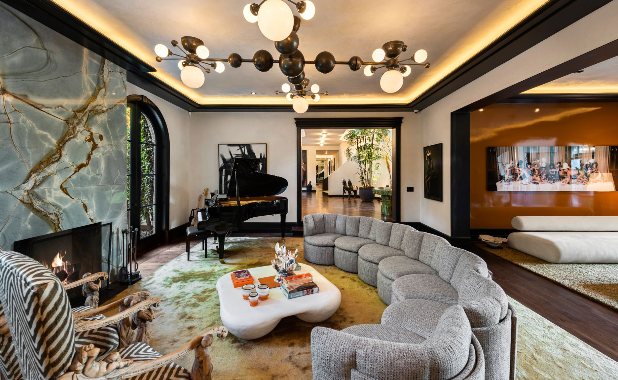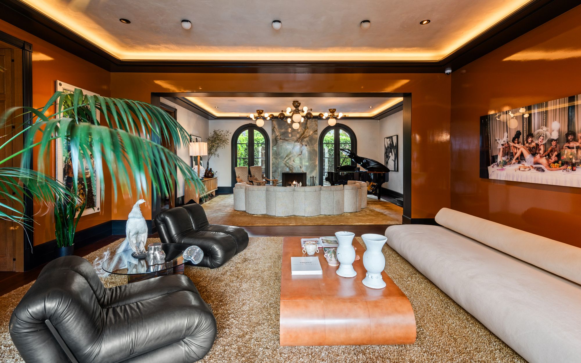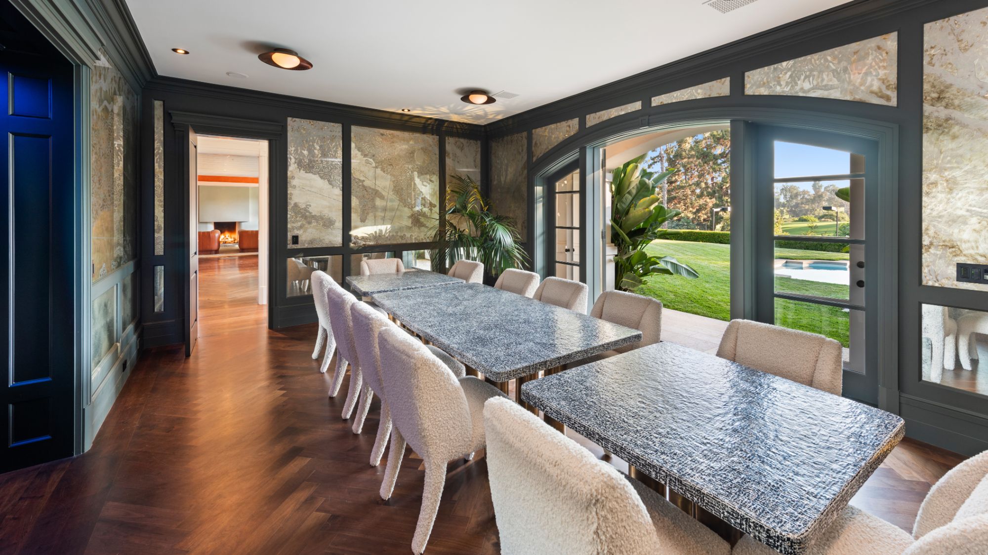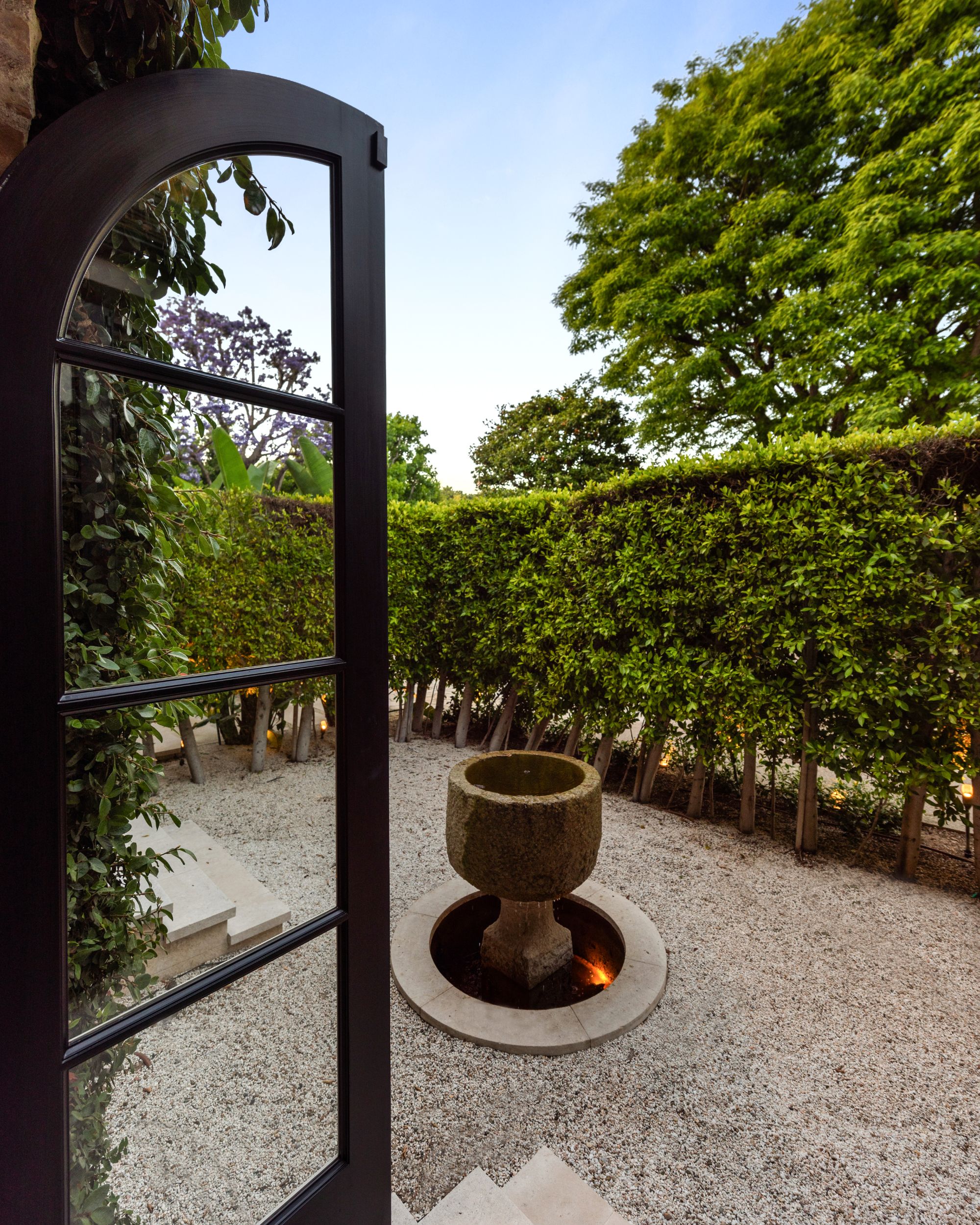 Set beside the exclusive LA Country Club, this expansive 1-acre gated estate has been meticulously remodeled to blend old-world glamour with modern elegance. Set back behind a grand, gated motor court, the property ensures unparalleled security and privacy. A grand two-story foyer with warm tones, natural light, and graceful curved lines creates an inviting and sophisticated atmosphere. To the right, a formal living room with a fireplace sets the stage for elegant entertaining, while an office with a bar and coffered ceiling adds timeless charm. Multiple gathering spaces, including a dining room overlooking the manicured grounds, flow seamlessly throughout. The opposite wing features a gourmet kitchen with dual islands and top-of-the-line appliances, a breakfast nook, and a cozy family room that opens to an outdoor dining area shaded by mature grapevines. Upstairs, the expansive primary suite features a fireplace, dual walk-in closets and bathrooms, and a private balcony overlooking the backyard and golf course. Five additional bedroom suites offer ample space for family and guests. Outside, a private oasis awaits. Lush landscaping surrounds a large patio for dining al fresco, firepit, flat grassy lawn, resort-like pool with spa, pool house with additional patio space, tennis court with lights, and an additional deck area that overlooks the impeccably landscaped fifth fairway. Offering a seamless blend of luxurious living and resort-style amenities, this estate provides an unparalleled opportunity to experience the epitome of refined elegance in one of Los Angeles’ most coveted locations.